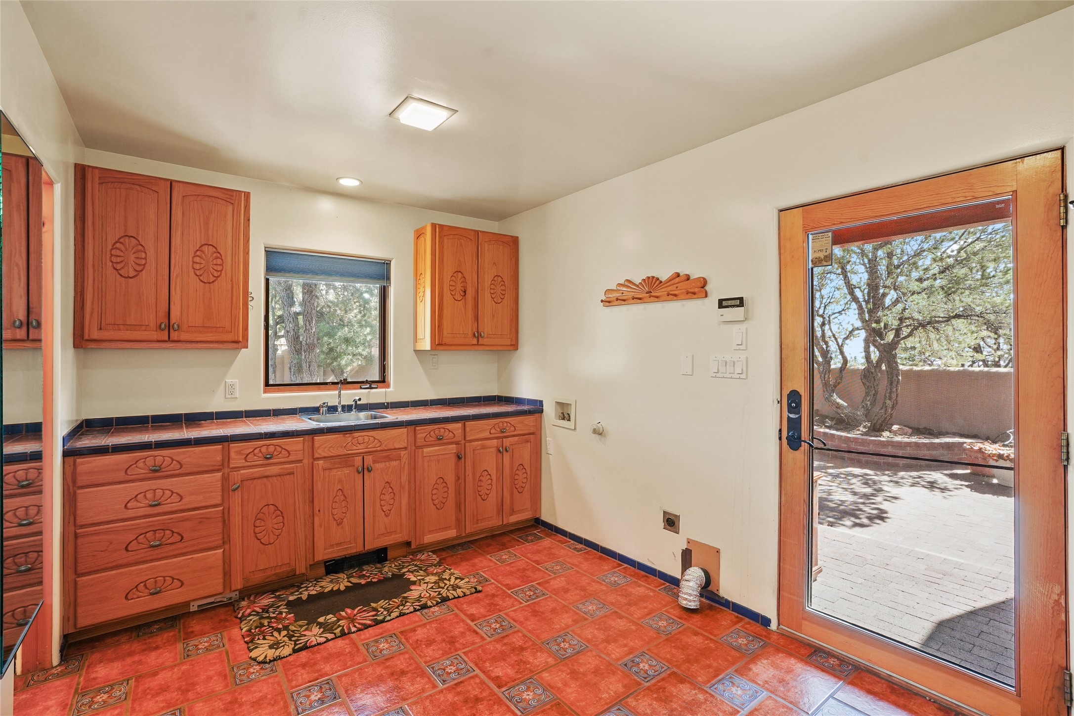 A very special estate offering approximately 1.5 miles to the Historic Santa Fe Plaza. Convenient to Highway 285, Tesuque Village, Ski Santa Fe and The Santa Fe Opera. The single level main house commands exquisite views of Downtown Santa Fe, the Jemez Mountains and a gorgeous, nestled view of the Sangre de Cristo Mountains. The gorgeous Kitchen is well designed and equipped. The guest casita has two fireplaces and also has a great view to Downtown from the large south facing veranda. The beautiful art studio is a perfect workspace with a kitchenette (partial kitchen: Sink, counter, cabinets. No appliances) and 1/2 bath. A 3- car garage is a great addition to this estate compound. There is also a tennis court included with this offering. The tennis court needs work, though it is thoughtfully located on the property with views of Downtown. The Great Room has 14' high ceilings with hand carved beams. The ceiling also has viga and cedar latillas. A wet bar is also located in the Great Room. This is an extremely well-designed home as well as are the additional structures. This property is coyote fenced and gated with many security features.