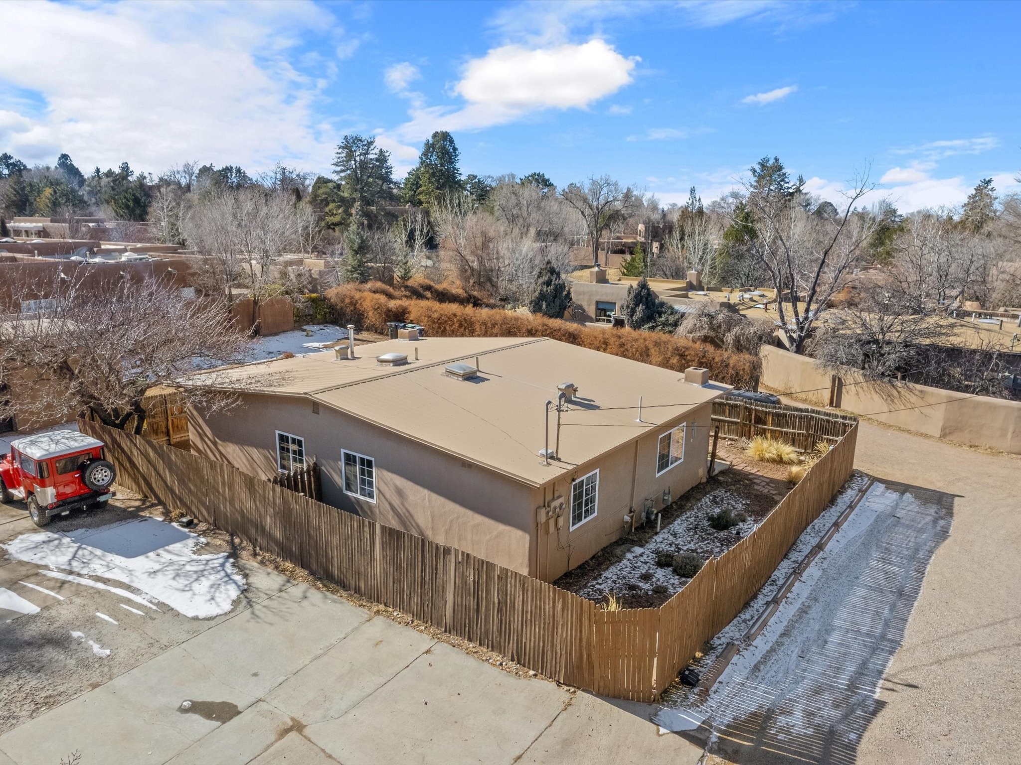 A unique duplex offering a fantastic opportunity for both homeowners and investors. This property features two mirroring apartments, each thoughtfully designed with 2 bedrooms, 1 bath, a laundry closet with hookups, and an open-concept living, dining, and kitchen area. The cozy kiva fireplaces add a touch of Southwestern charm, while the front portals and enclosed yards provide inviting outdoor spaces for relaxation or entertainment.Each kitchen is equipped with essential appliances, making the units move-in ready or perfect for rental opportunities. Live in one unit and rent out the other to generate income while enjoying the convenience of having tenants close by.Adding to the property's value is an oversized garage with stunning vigas, offering ample room for storage, workspace, or potential expansion. The expansive lot provides parking for over a dozen vehicles, making it ideal for those who need extra space or have plans for future development.Located in the heart of Santa Fe, this duplex combines comfort, functionality, and investment potential in one incredible package. Don't miss out on this rare opportunity--schedule your private showing today!