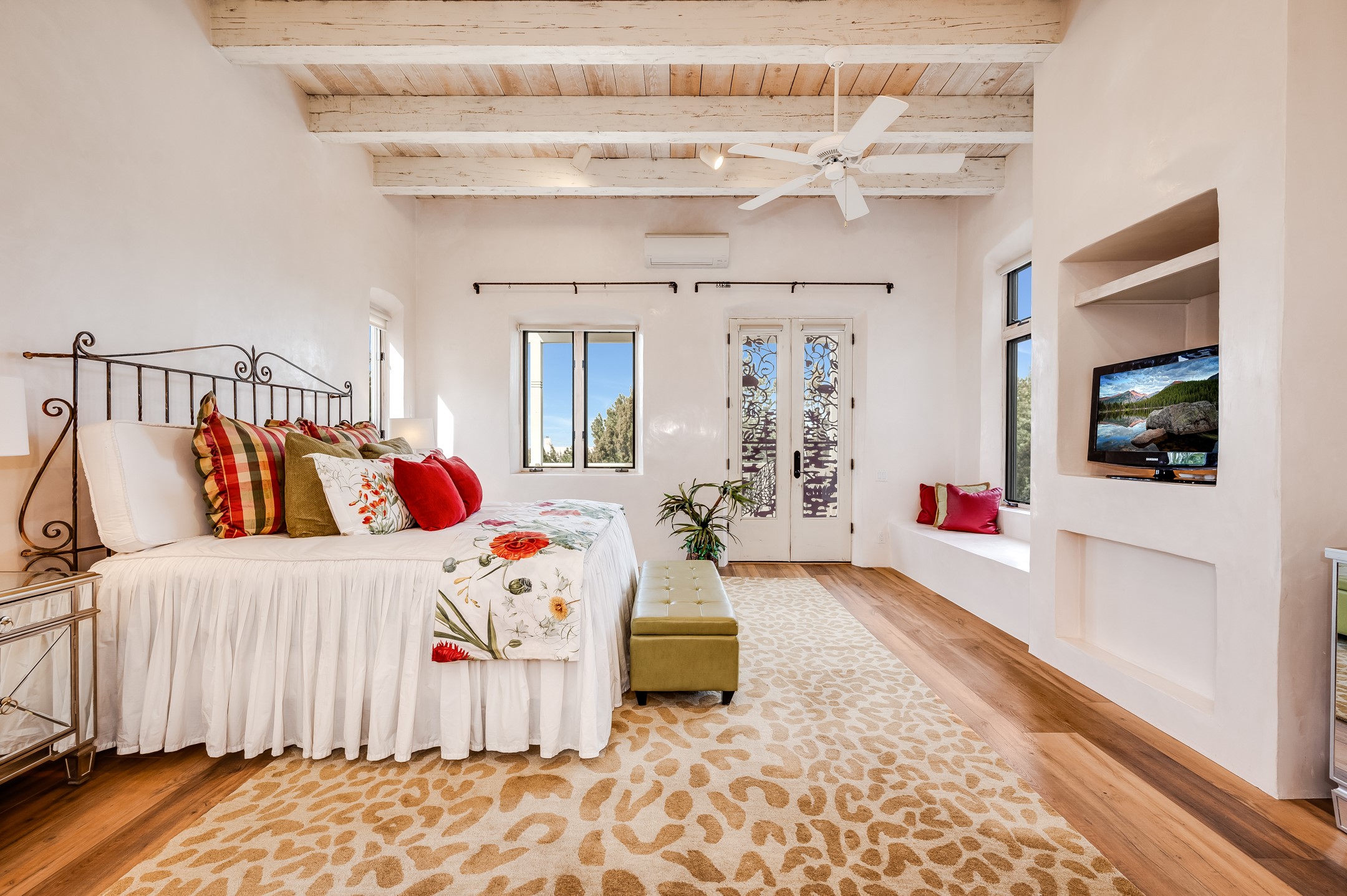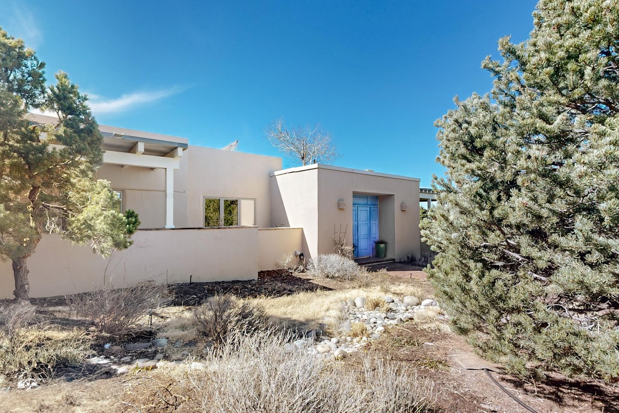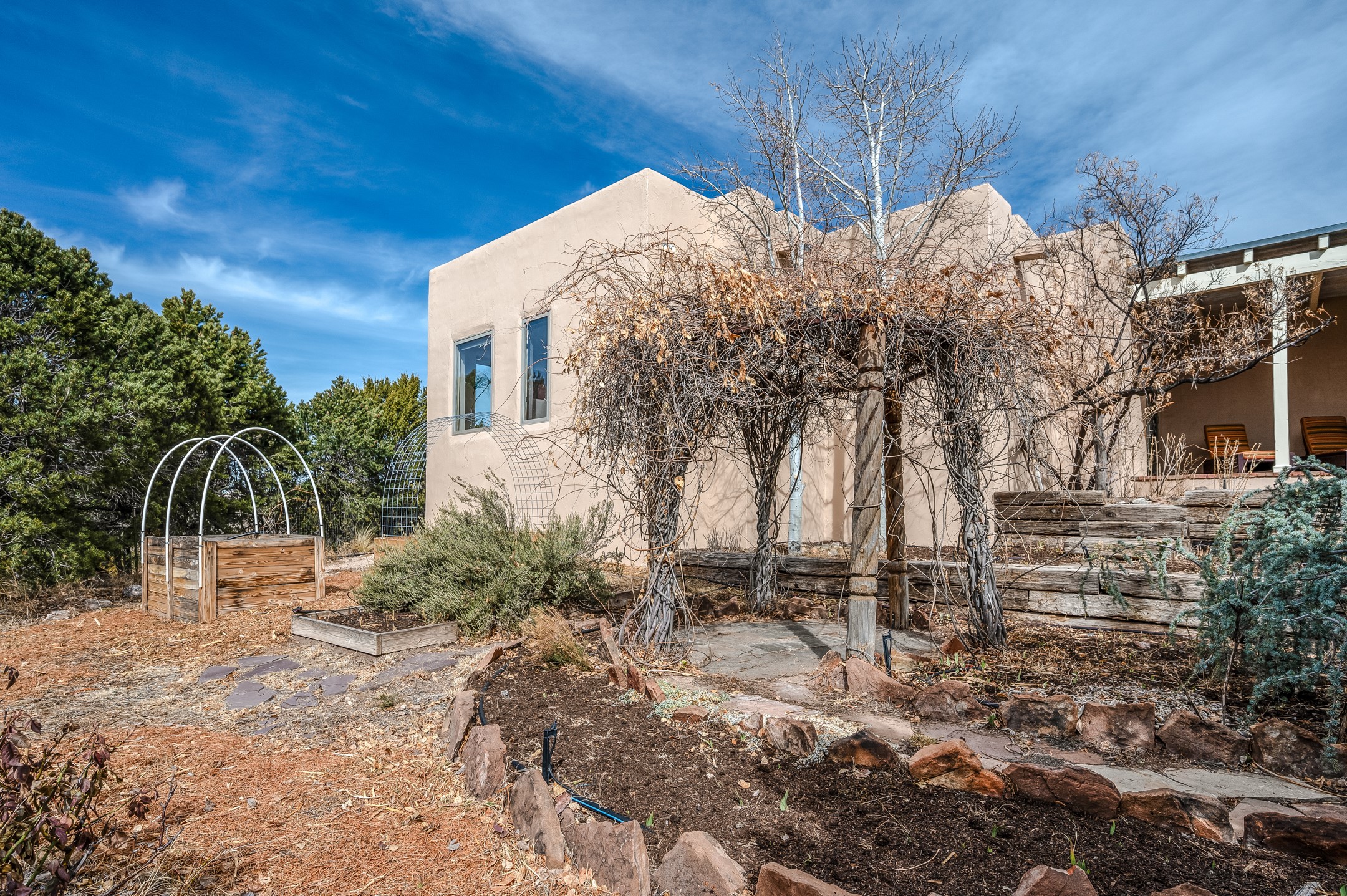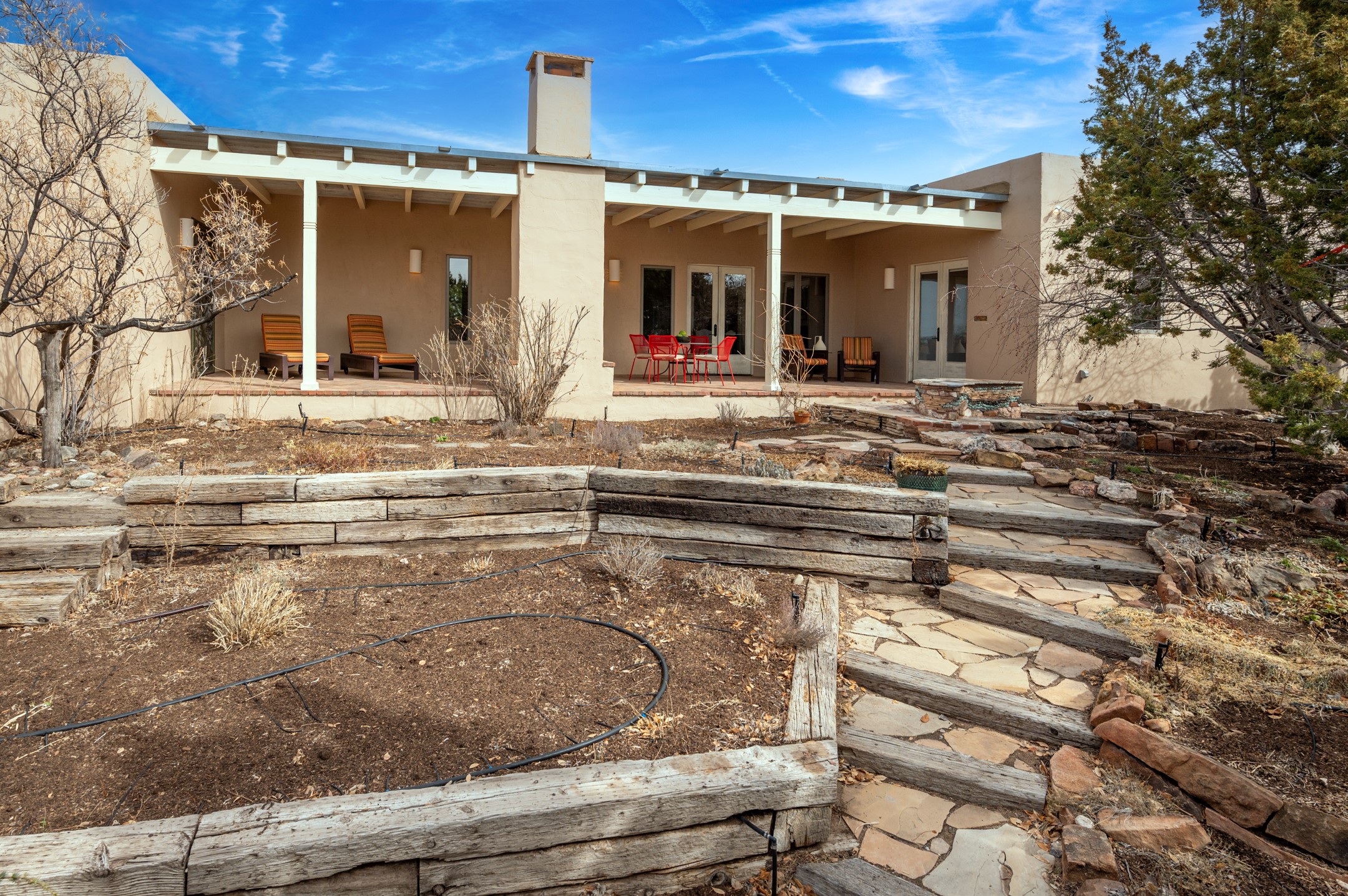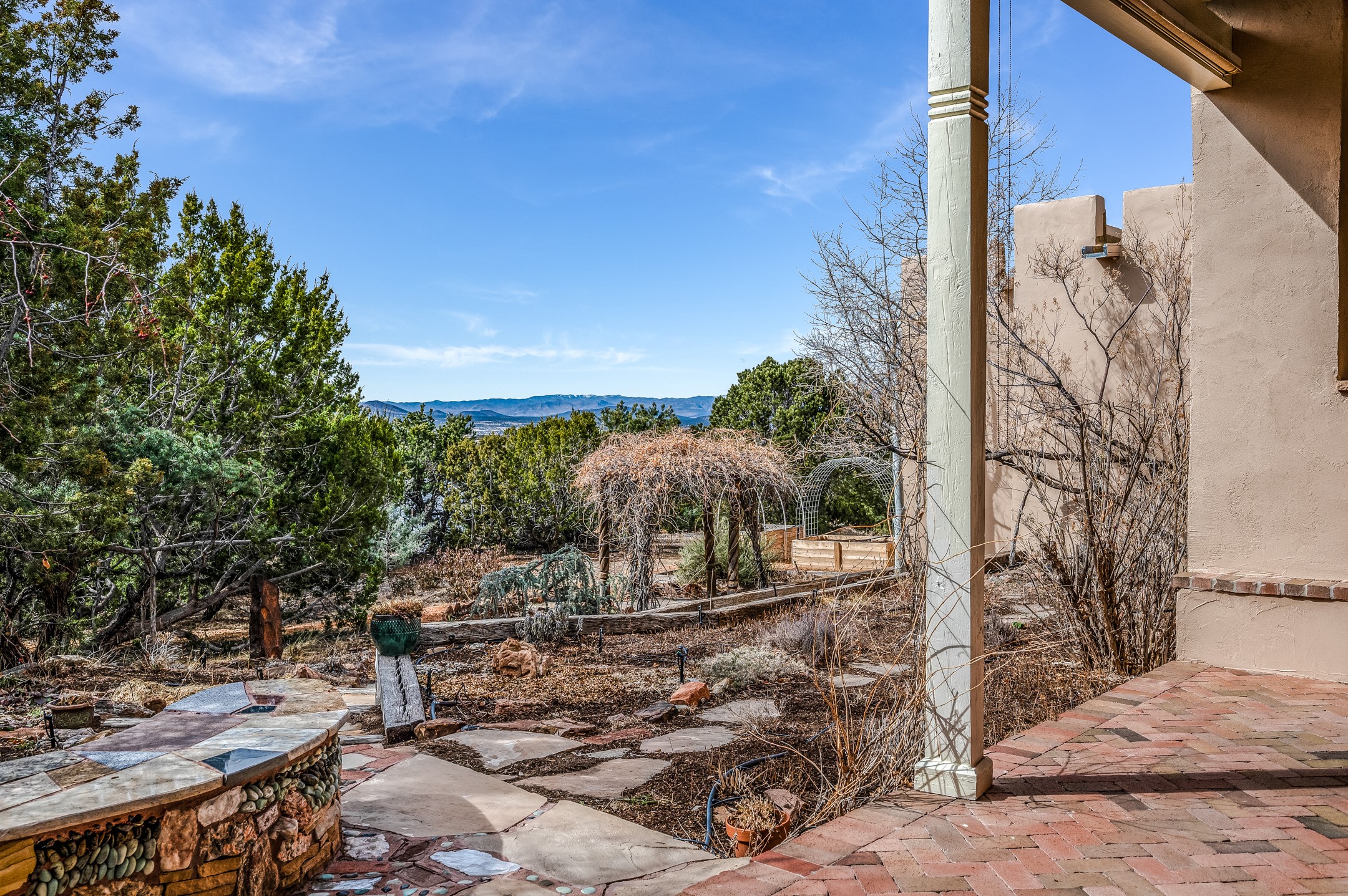 Rastra built beauty by award-winning Paragon Builder and winner of four awards in the Hacienda Parade of Homes! Own a slice of paradise where peace, privacy, and panoramic views exist. Located on a paved dead end cul-de-sac, this 2.5 acre lot is a perfectly sited single level solar equipped, and owned, with new battery back-ups which equals zero negative bills! All utilities are underground for unobstructed 320 degree views of three mountain ranges. One enters through a walled courtyard replete with fountain into a spacious sanctuary with higher than high beamed ceilings. Hand troweled plaster walls, tumbled herringbone brick floors, wide plank wood floors and vaulted ceilings. Normanesque archways, custom solid wood doors with deep set scalloped archways. Bathed in light, the Living Room's French doors flank the Vermont Casting wood stove and lead out to a secluded sheltered patio. Split bedroom floor plan. Ensuite Grand Master with fireplace, office and sitting areas and private pergola covered patio. The large luxurious bathroom has heated bancos, jetted tub, separate shower and a ginormous walk-in closet. Eat-in Kitchen is a cook's delight & is absolutely perfect for entertaining a multitude of guests. Oversized slab granite island with prep sink, fireplace, walk-in pantry, office area and a private, pergola covered patio for breakfast or bbq-ing. Two guest bedrooms share a Jack 'n' Jill bathroom and have access to the portal. Powder room, huge utility room with sink, cabinetry and folding area, central vacuum, built-in sounds speaker and 34 skylights. 1,200 sq. ft. of covered portals for al fresco dining and Margarita sunsets. Three fabulous fireplaces, central vac, closets and storage galore, non-toxic, low VOC, wherever possible, and a shared well maintained by the HOA. Water-wise organic regenerative gardens with mature trees, vegetation & a pet-friendly enclosed back yard. Last, but not least, A three car heated garage. This property is not to be missed!