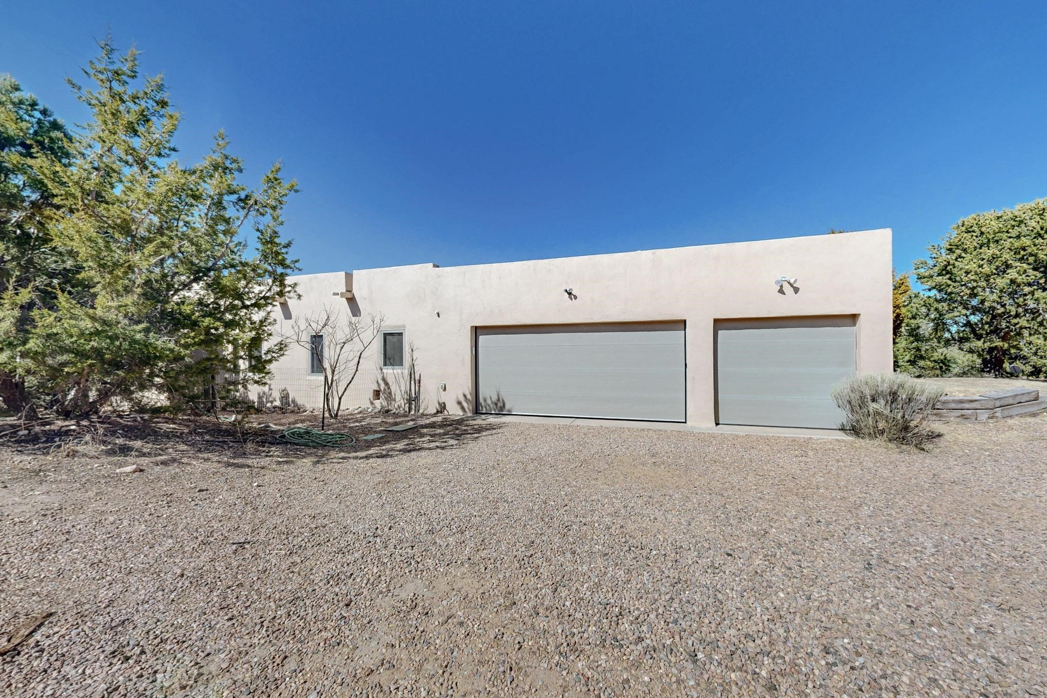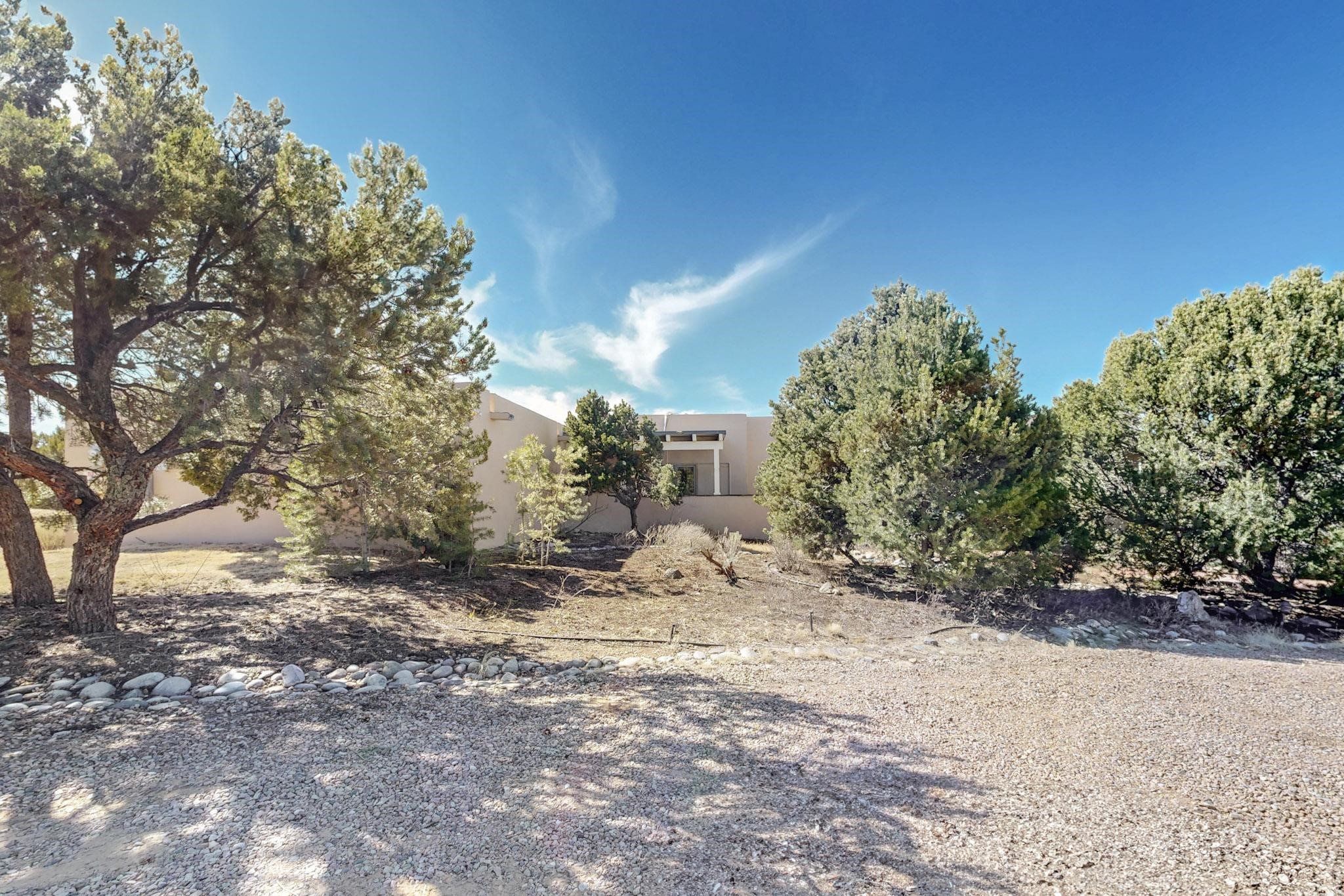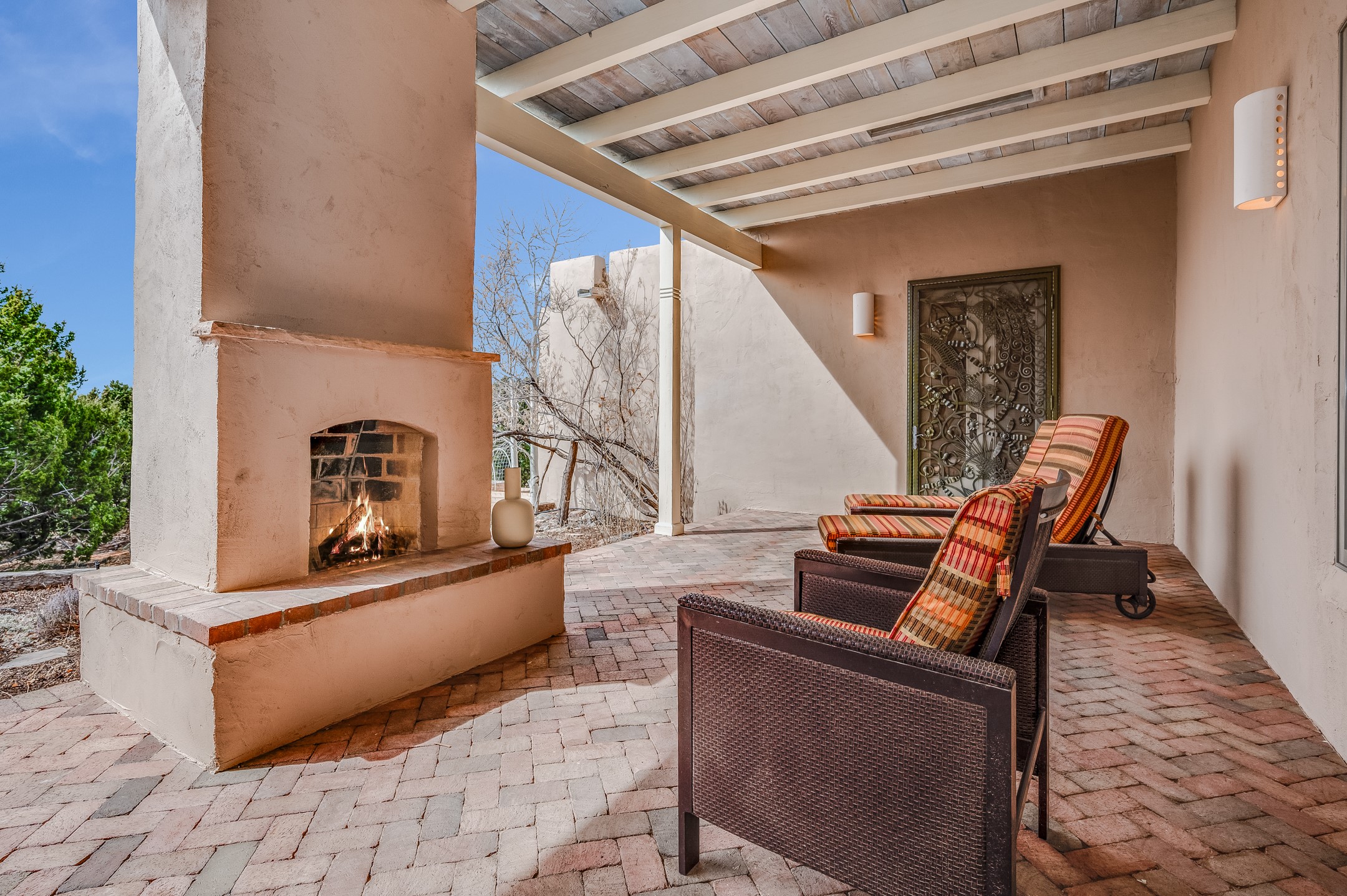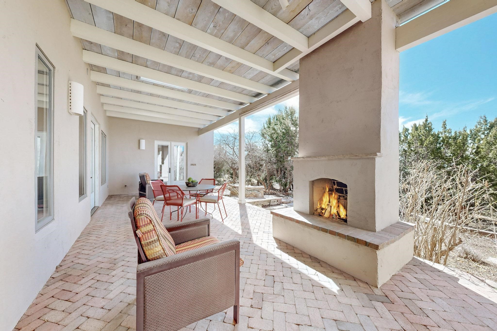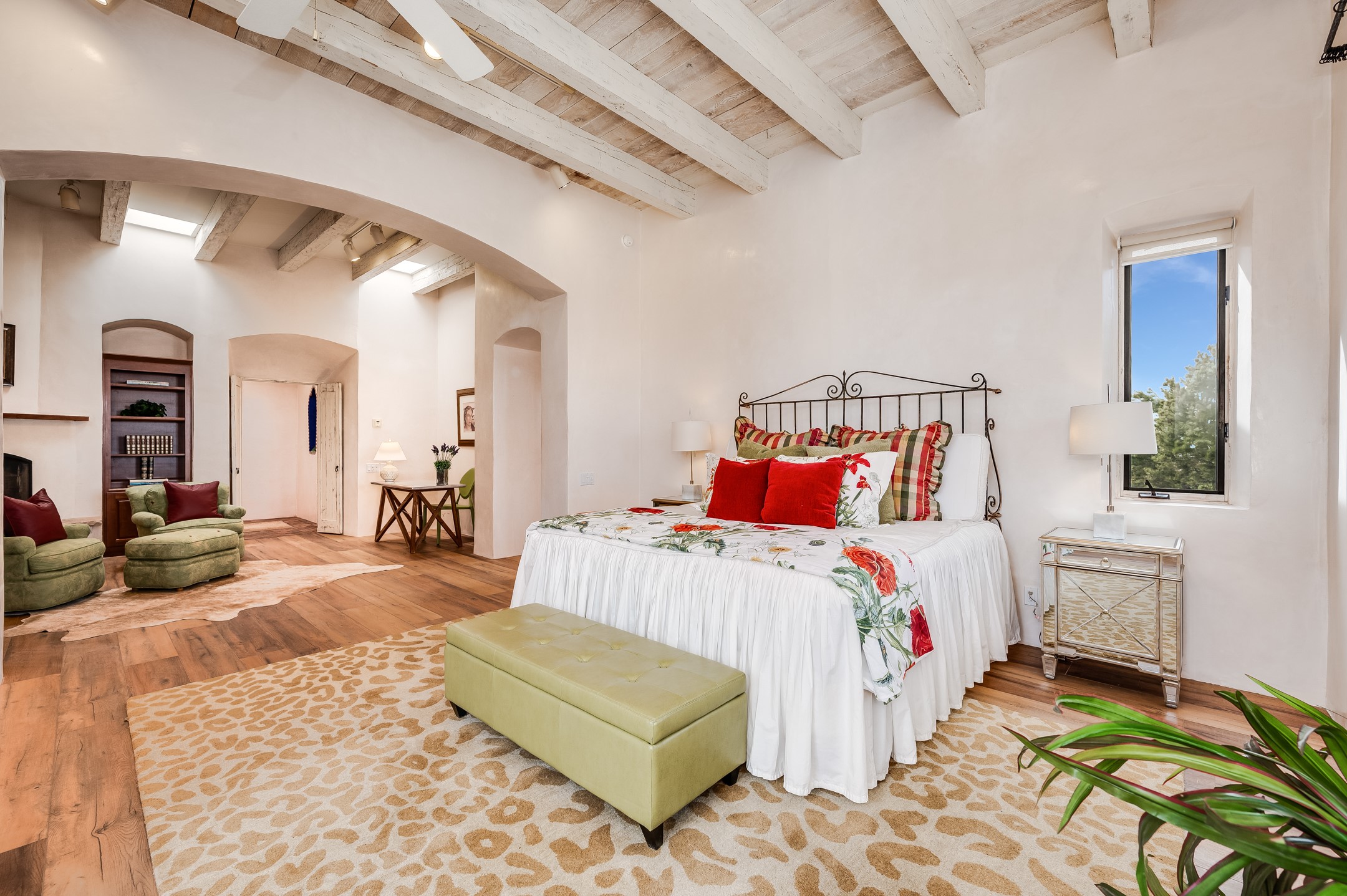 Rastra built beauty by award-winning Paragon Builder and winner of four awards in the Hacienda Parade of Homes! Own a slice of paradise where peace, privacy, and panoramic views exist. Located on a paved dead end cul-de-sac, this 2.5 acre lot is a perfectly sited single level solar equipped, and owned, with new battery back-ups which equals zero negative bills! All utilities are underground for unobstructed 320 degree views of three mountain ranges. One enters through a walled courtyard replete with fountain into a spacious sanctuary with higher than high beamed ceilings. Hand troweled plaster walls, tumbled herringbone brick floors, wide plank wood floors and vaulted ceilings. Normanesque archways, custom solid wood doors with deep set scalloped archways. Bathed in light, the Living Room's French doors flank the Vermont Casting wood stove and lead out to a secluded sheltered patio. Split bedroom floor plan. Ensuite Grand Master with fireplace, office and sitting areas and private pergola covered patio. The large luxurious bathroom has heated bancos, jetted tub, separate shower and a ginormous walk-in closet. Eat-in Kitchen is a cook's delight & is absolutely perfect for entertaining a multitude of guests. Oversized slab granite island with prep sink, fireplace, walk-in pantry, office area and a private, pergola covered patio for breakfast or bbq-ing. Two guest bedrooms share a Jack 'n' Jill bathroom and have access to the portal. Powder room, huge utility room with sink, cabinetry and folding area, central vacuum, built-in sounds speaker and 34 skylights. 1,200 sq. ft. of covered portals for al fresco dining and Margarita sunsets. Three fabulous fireplaces, central vac, closets and storage galore, non-toxic, low VOC, wherever possible, and a shared well maintained by the HOA. Water-wise organic regenerative gardens with mature trees, vegetation & a pet-friendly enclosed back yard. Last, but not least, A three car heated garage. This property is not to be missed!