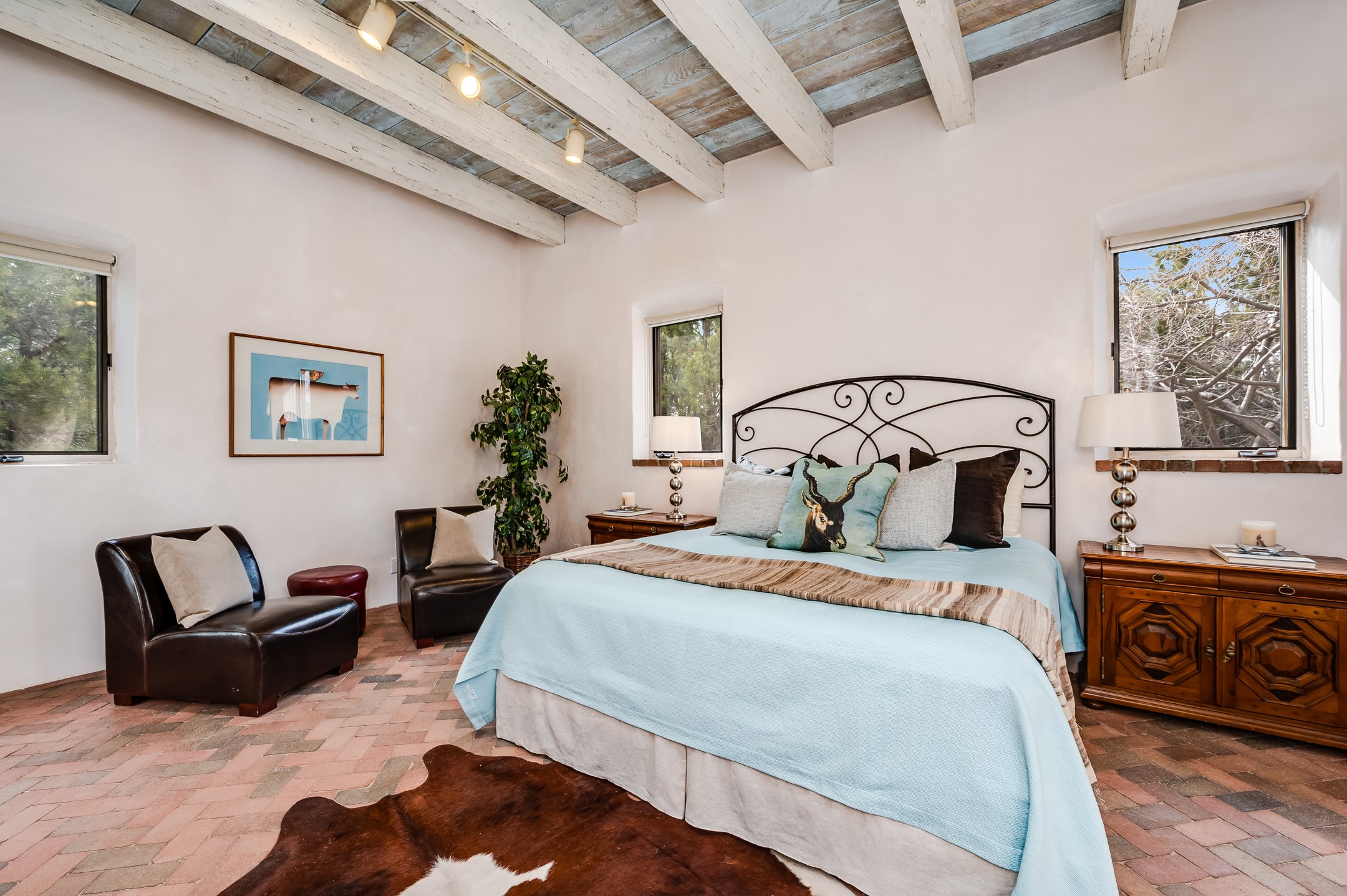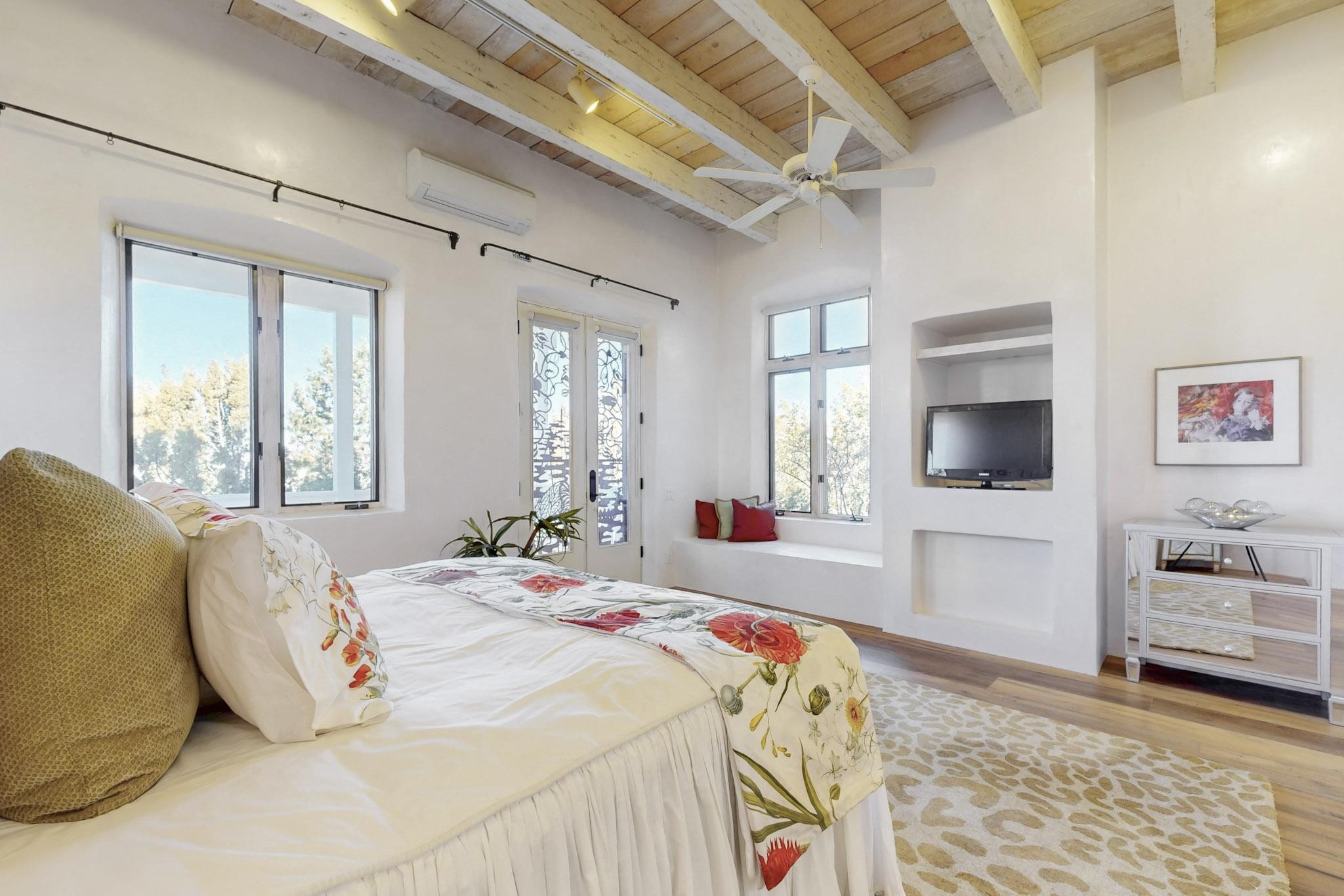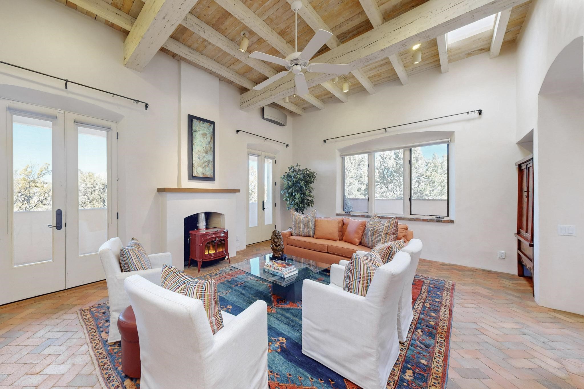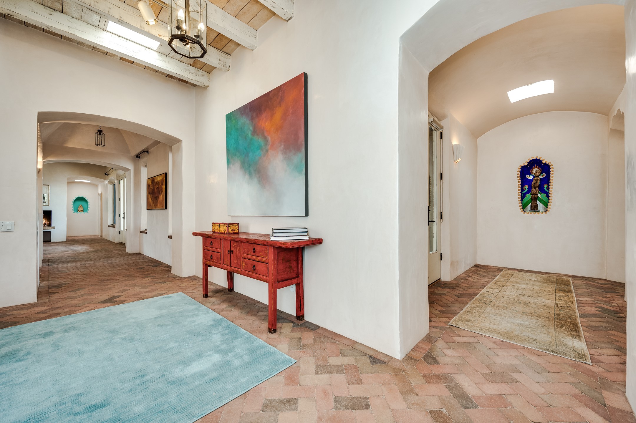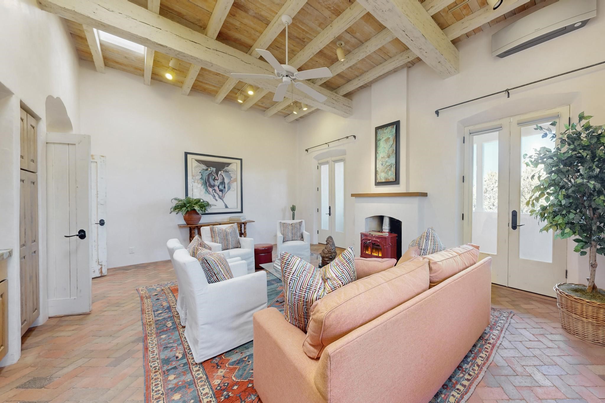 Rastra built beauty by award-winning Paragon Builder and winner of four awards in the Hacienda Parade of Homes! Own a slice of paradise where peace, privacy, and panoramic views exist. Located on a paved dead end cul-de-sac, this 2.5 acre lot is a perfectly sited single level solar equipped, and owned, with new battery back-ups which equals zero negative bills! All utilities are underground for unobstructed 320 degree views of three mountain ranges. One enters through a walled courtyard replete with fountain into a spacious sanctuary with higher than high beamed ceilings. Hand troweled plaster walls, tumbled herringbone brick floors, wide plank wood floors and vaulted ceilings. Normanesque archways, custom solid wood doors with deep set scalloped archways. Bathed in light, the Living Room's French doors flank the Vermont Casting wood stove and lead out to a secluded sheltered patio. Split bedroom floor plan. Ensuite Grand Master with fireplace, office and sitting areas and private pergola covered patio. The large luxurious bathroom has heated bancos, jetted tub, separate shower and a ginormous walk-in closet. Eat-in Kitchen is a cook's delight & is absolutely perfect for entertaining a multitude of guests. Oversized slab granite island with prep sink, fireplace, walk-in pantry, office area and a private, pergola covered patio for breakfast or bbq-ing. Two guest bedrooms share a Jack 'n' Jill bathroom and have access to the portal. Powder room, huge utility room with sink, cabinetry and folding area, central vacuum, built-in sounds speaker and 34 skylights. 1,200 sq. ft. of covered portals for al fresco dining and Margarita sunsets. Three fabulous fireplaces, central vac, closets and storage galore, non-toxic, low VOC, wherever possible, and a shared well maintained by the HOA. Water-wise organic regenerative gardens with mature trees, vegetation & a pet-friendly enclosed back yard. Last, but not least, A three car heated garage. This property is not to be missed!