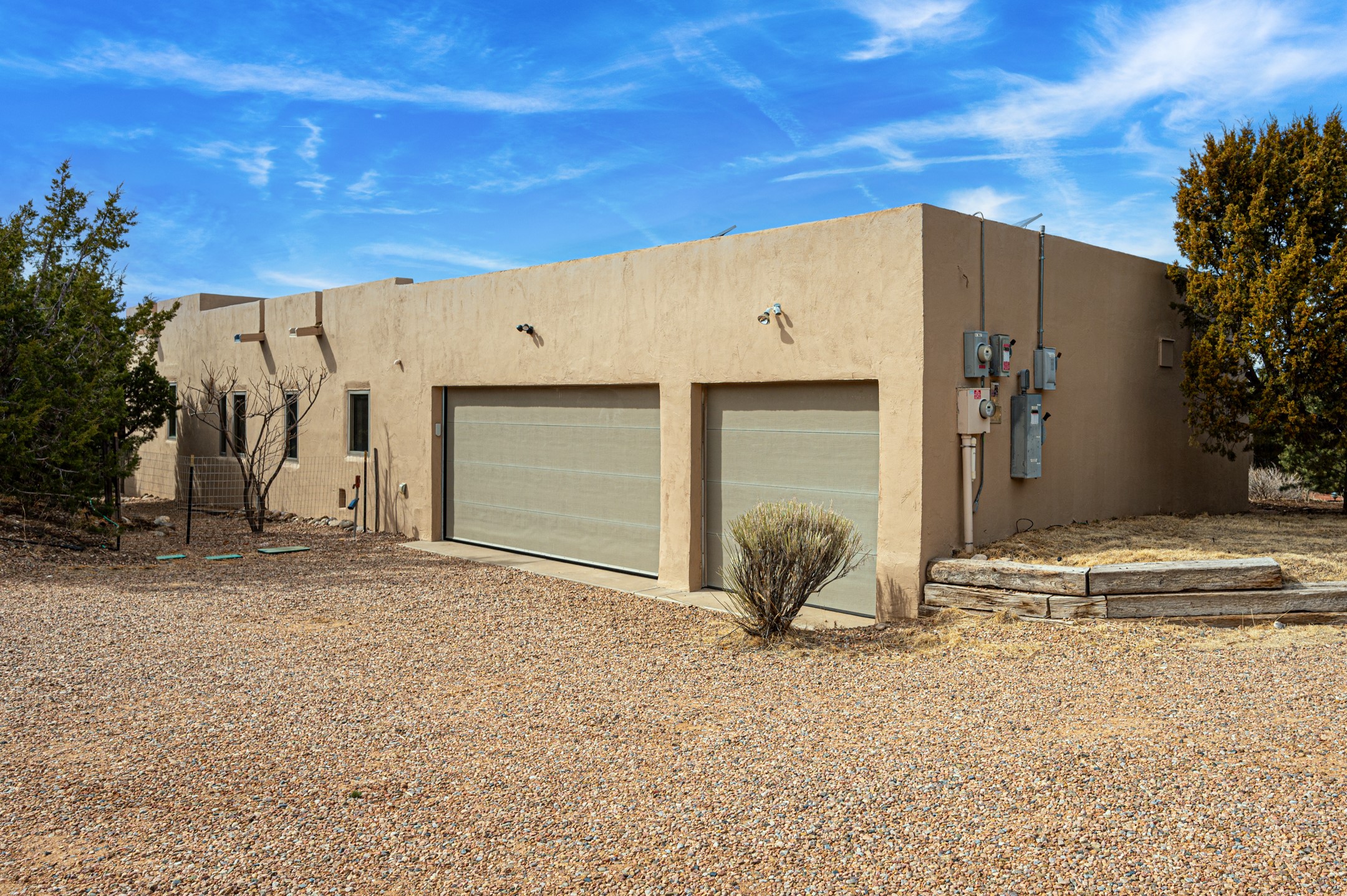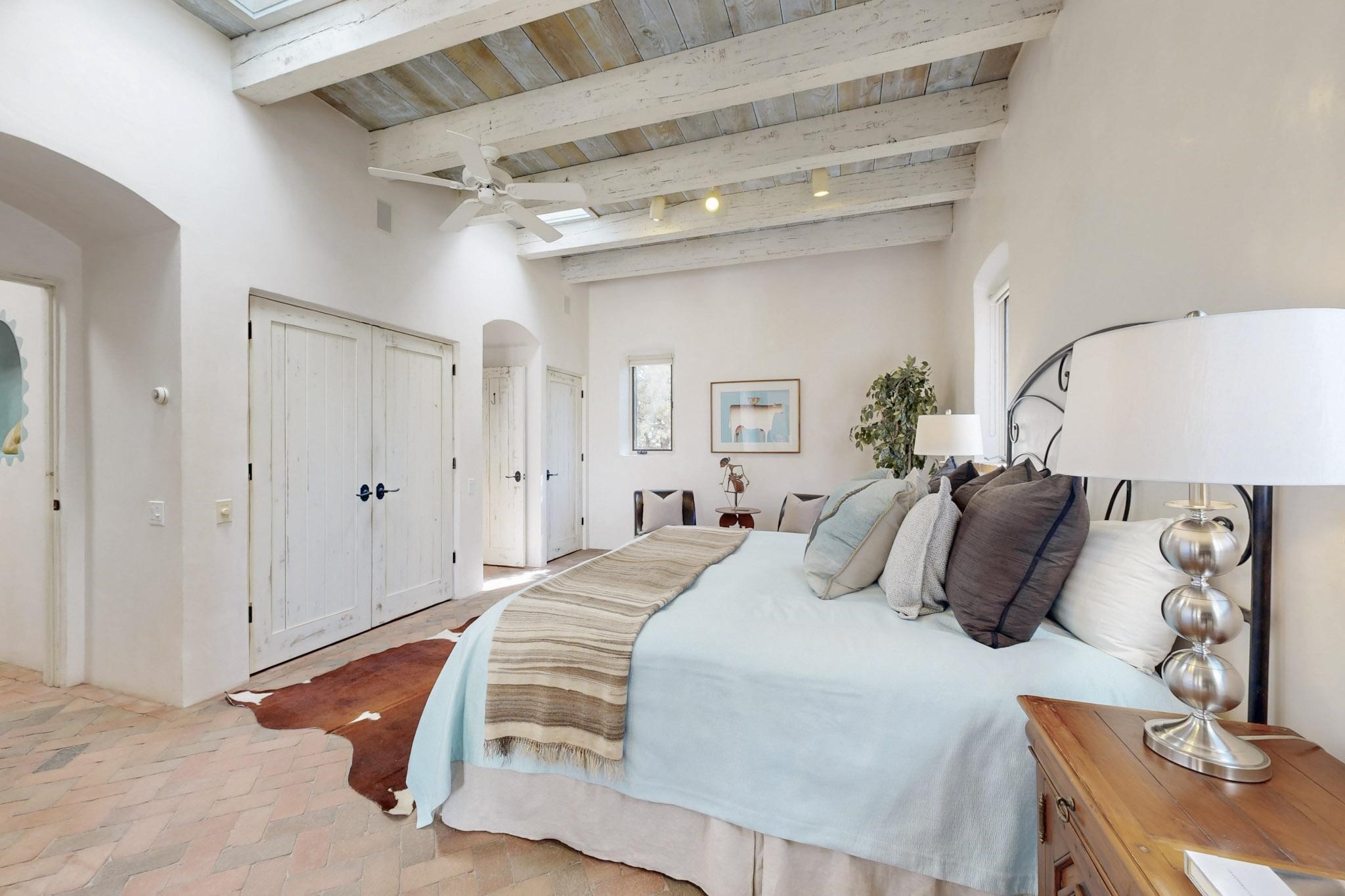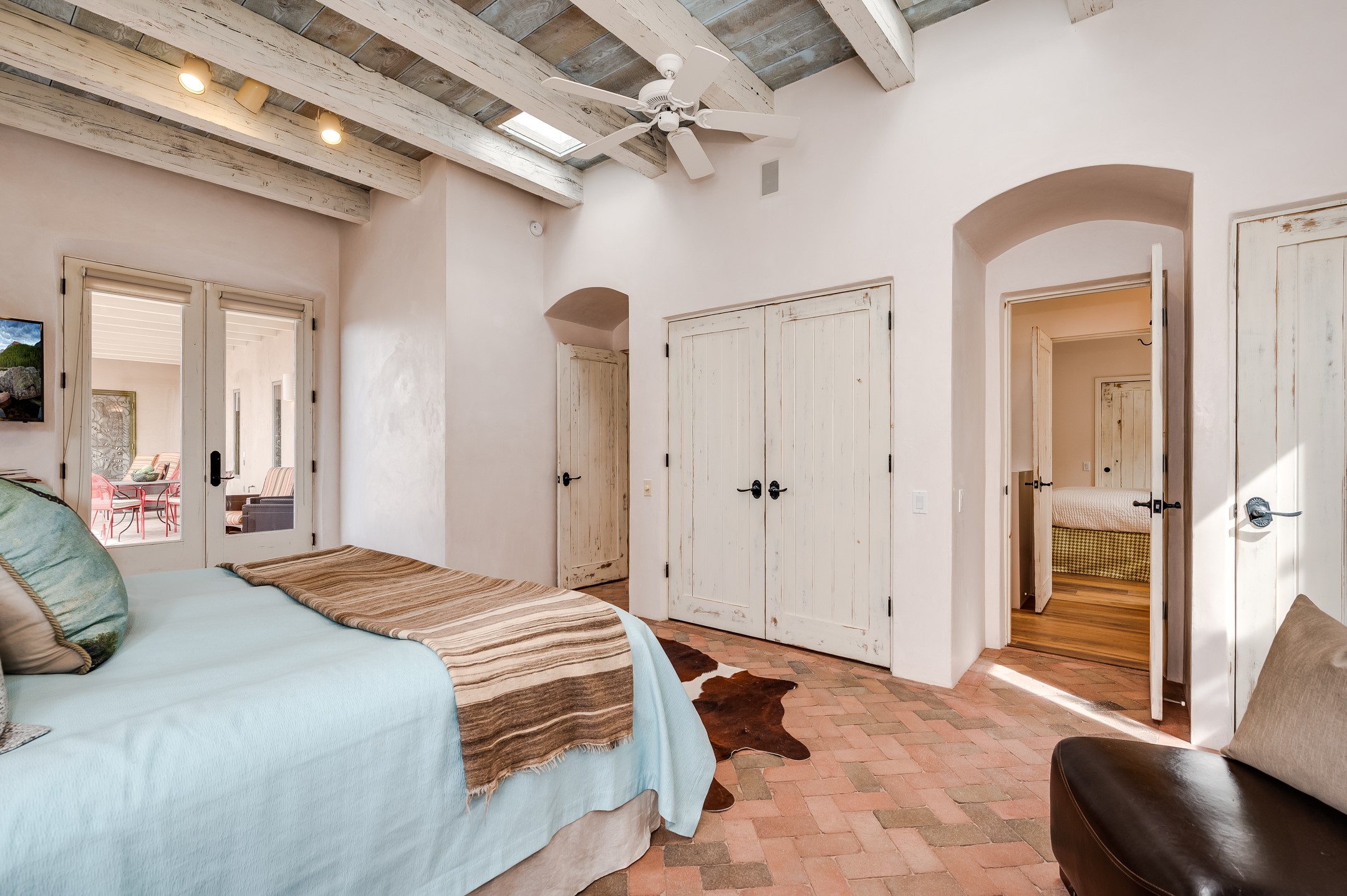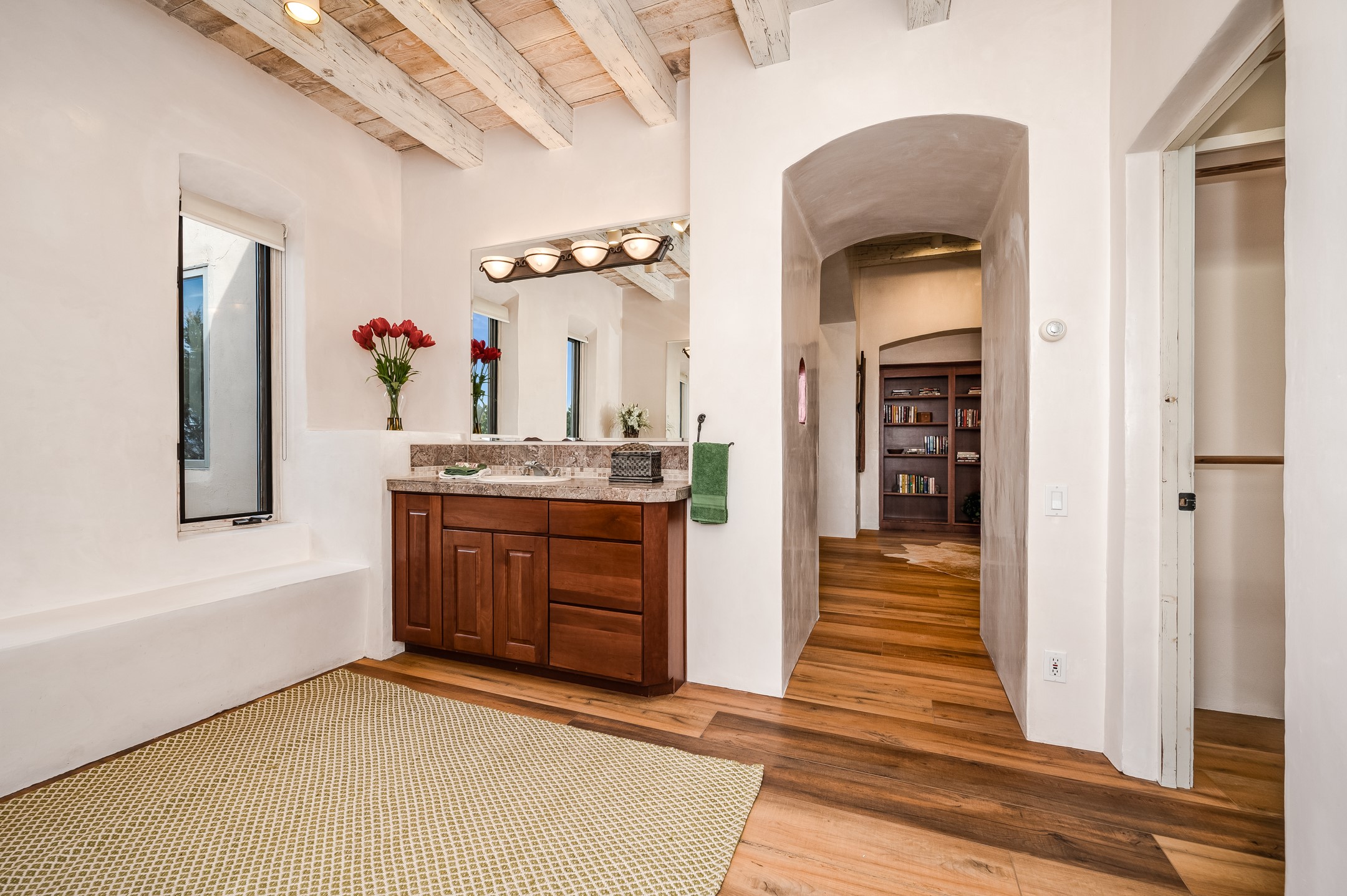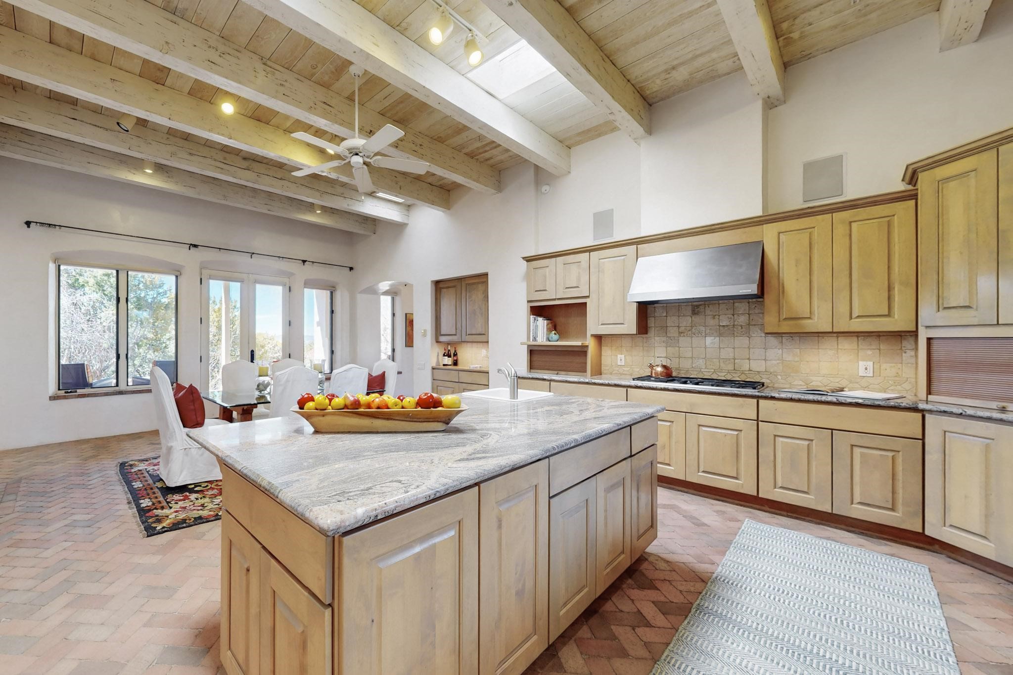 Rastra built beauty by award-winning Paragon Builder and winner of four awards in the Hacienda Parade of Homes! Own a slice of paradise where peace, privacy, and panoramic views exist. Located on a paved dead end cul-de-sac, this 2.5 acre lot is a perfectly sited single level solar equipped, and owned, with new battery back-ups which equals zero negative bills! All utilities are underground for unobstructed 320 degree views of three mountain ranges. One enters through a walled courtyard replete with fountain into a spacious sanctuary with higher than high beamed ceilings. Hand troweled plaster walls, tumbled herringbone brick floors, wide plank wood floors and vaulted ceilings. Normanesque archways, custom solid wood doors with deep set scalloped archways. Bathed in light, the Living Room's French doors flank the Vermont Casting wood stove and lead out to a secluded sheltered patio. Split bedroom floor plan. Ensuite Grand Master with fireplace, office and sitting areas and private pergola covered patio. The large luxurious bathroom has heated bancos, jetted tub, separate shower and a ginormous walk-in closet. Eat-in Kitchen is a cook's delight & is absolutely perfect for entertaining a multitude of guests. Oversized slab granite island with prep sink, fireplace, walk-in pantry, office area and a private, pergola covered patio for breakfast or bbq-ing. Two guest bedrooms share a Jack 'n' Jill bathroom and have access to the portal. Powder room, huge utility room with sink, cabinetry and folding area, central vacuum, built-in sounds speaker and 34 skylights. 1,200 sq. ft. of covered portals for al fresco dining and Margarita sunsets. Three fabulous fireplaces, central vac, closets and storage galore, non-toxic, low VOC, wherever possible, and a shared well maintained by the HOA. Water-wise organic regenerative gardens with mature trees, vegetation & a pet-friendly enclosed back yard. Last, but not least, A three car heated garage. This property is not to be missed!