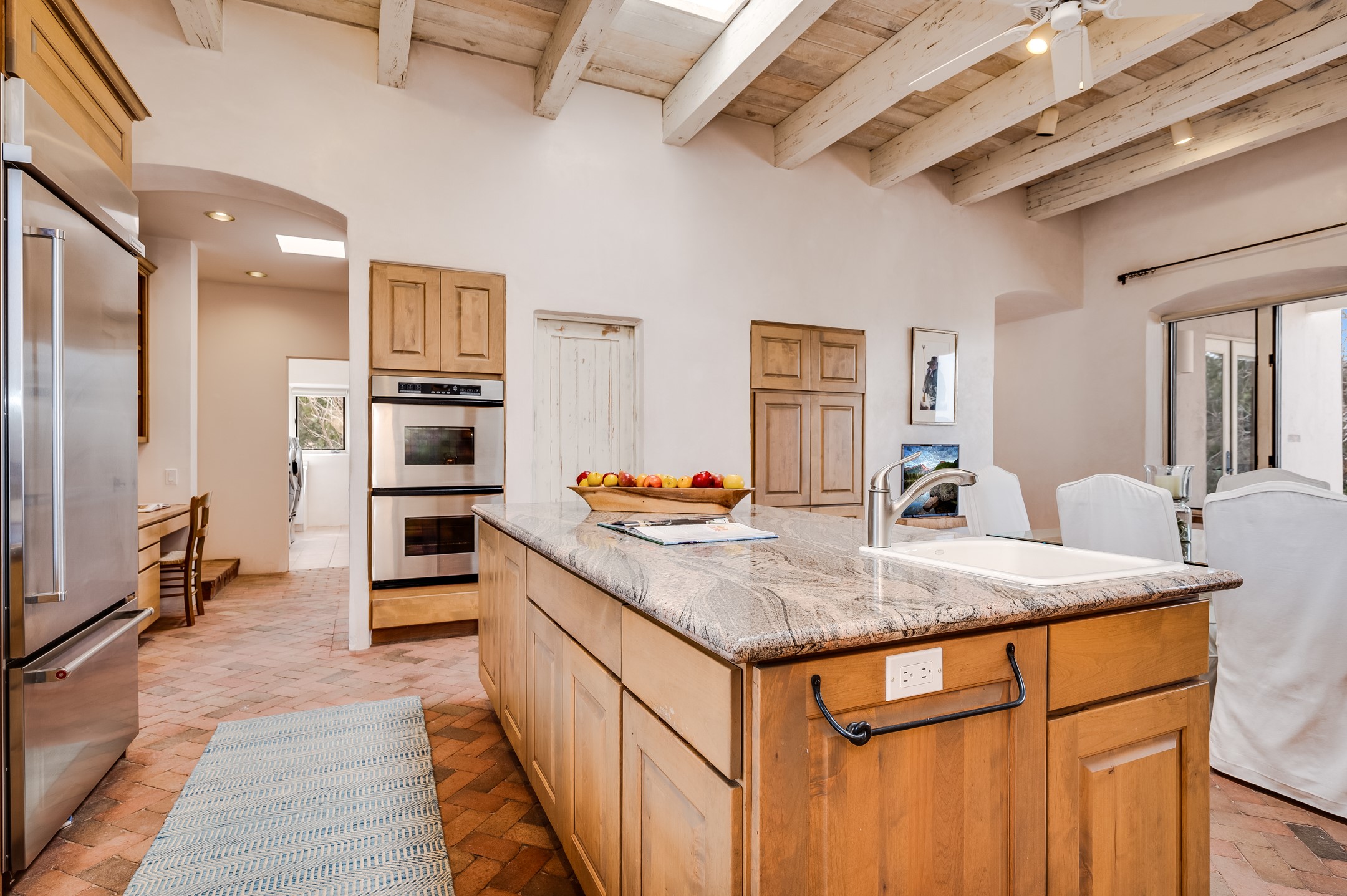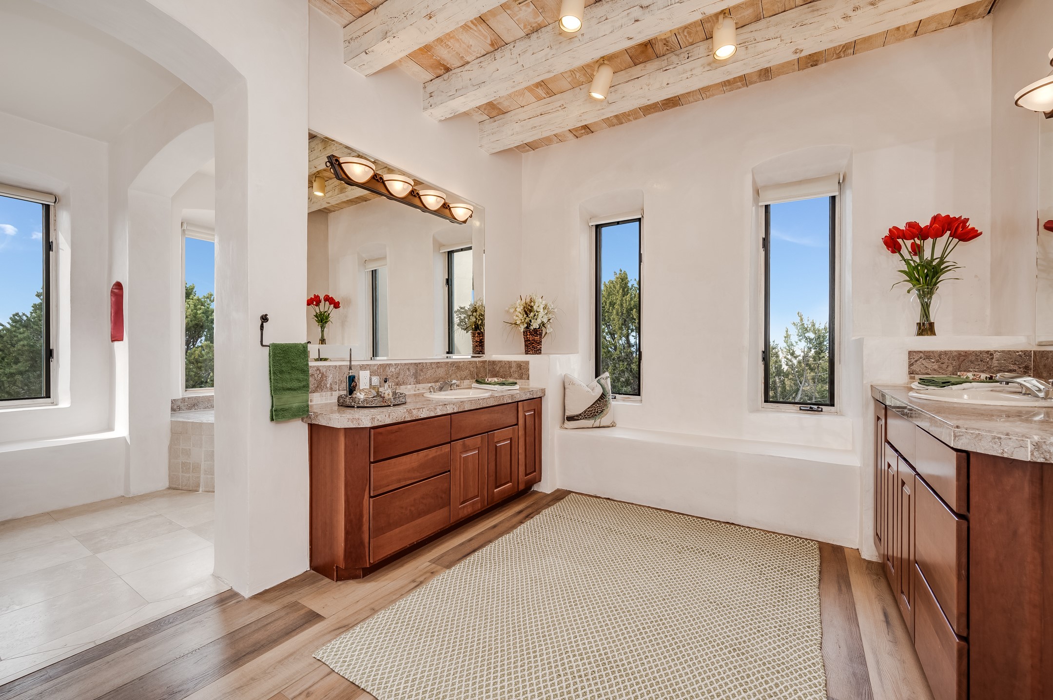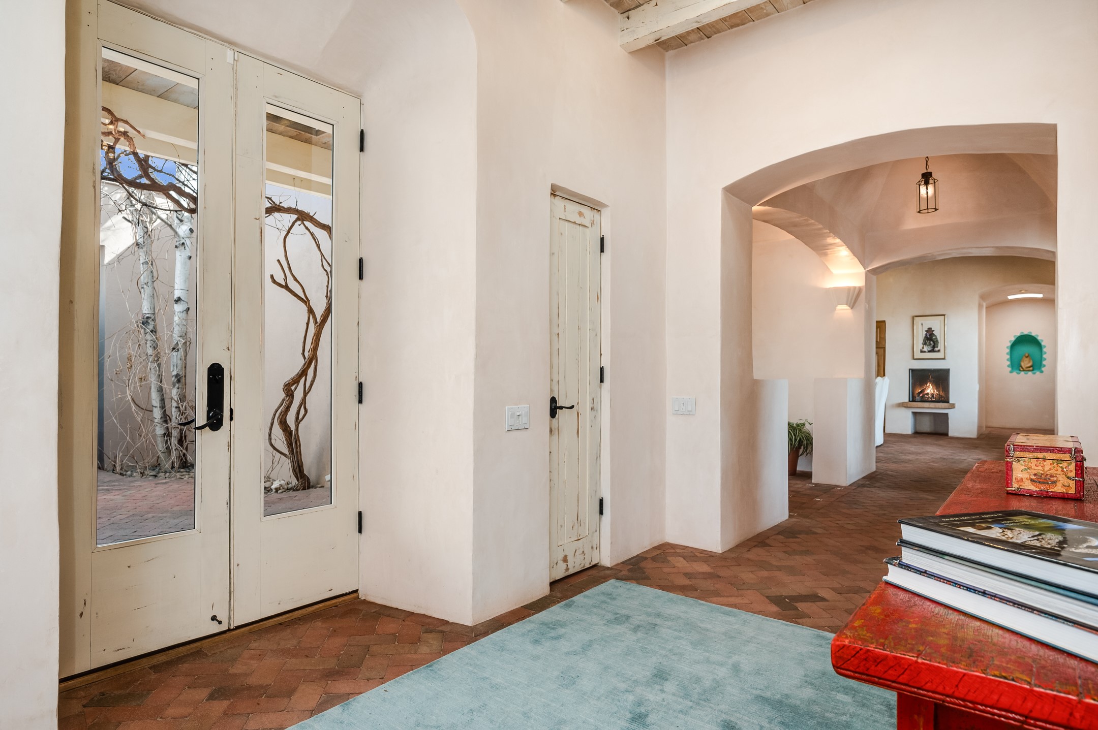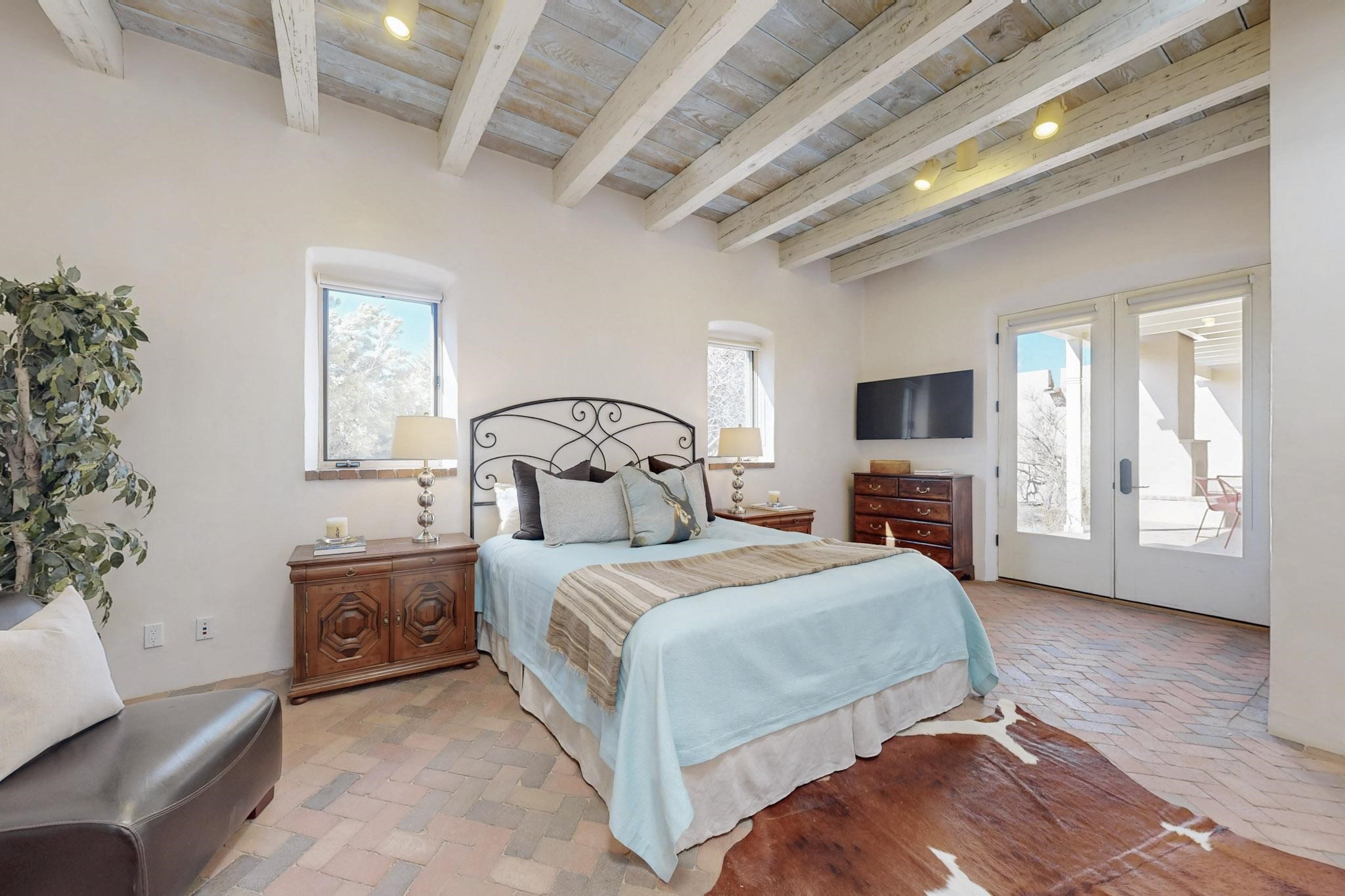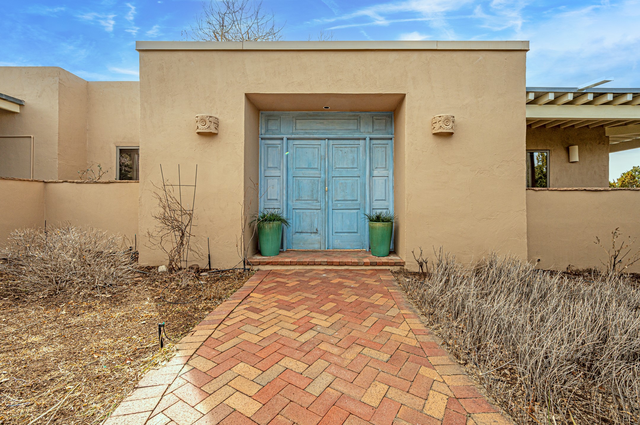 Rastra built beauty by award-winning Paragon Builder and winner of four awards in the Hacienda Parade of Homes! Own a slice of paradise where peace, privacy, and panoramic views exist. Located on a paved dead end cul-de-sac, this 2.5 acre lot is a perfectly sited single level solar equipped, and owned, with new battery back-ups which equals zero negative bills! All utilities are underground for unobstructed 320 degree views of three mountain ranges. One enters through a walled courtyard replete with fountain into a spacious sanctuary with higher than high beamed ceilings. Hand troweled plaster walls, tumbled herringbone brick floors, wide plank wood floors and vaulted ceilings. Normanesque archways, custom solid wood doors with deep set scalloped archways. Bathed in light, the Living Room's French doors flank the Vermont Casting wood stove and lead out to a secluded sheltered patio. Split bedroom floor plan. Ensuite Grand Master with fireplace, office and sitting areas and private pergola covered patio. The large luxurious bathroom has heated bancos, jetted tub, separate shower and a ginormous walk-in closet. Eat-in Kitchen is a cook's delight & is absolutely perfect for entertaining a multitude of guests. Oversized slab granite island with prep sink, fireplace, walk-in pantry, office area and a private, pergola covered patio for breakfast or bbq-ing. Two guest bedrooms share a Jack 'n' Jill bathroom and have access to the portal. Powder room, huge utility room with sink, cabinetry and folding area, central vacuum, built-in sounds speaker and 34 skylights. 1,200 sq. ft. of covered portals for al fresco dining and Margarita sunsets. Three fabulous fireplaces, central vac, closets and storage galore, non-toxic, low VOC, wherever possible, and a shared well maintained by the HOA. Water-wise organic regenerative gardens with mature trees, vegetation & a pet-friendly enclosed back yard. Last, but not least, A three car heated garage. This property is not to be missed!