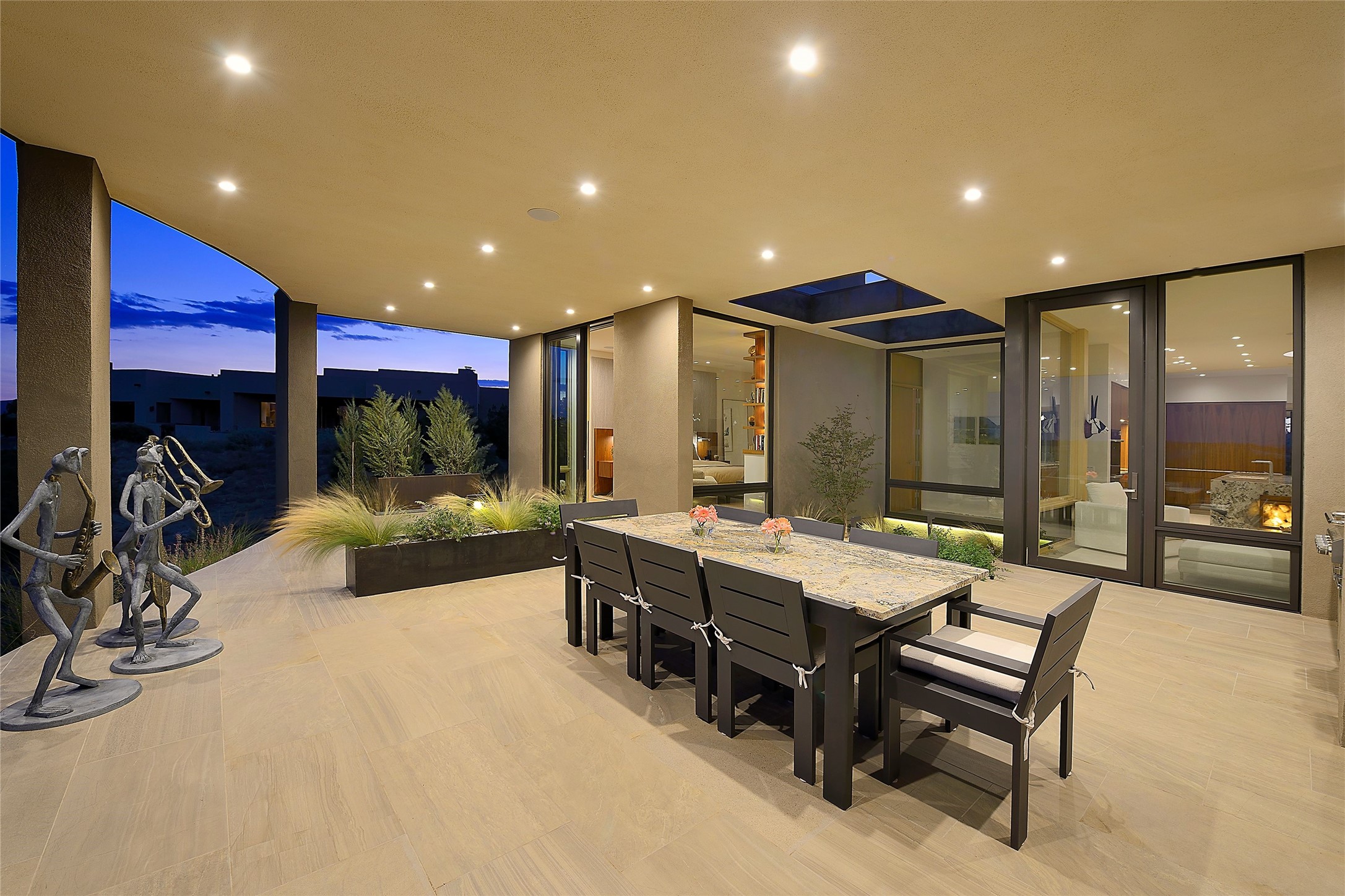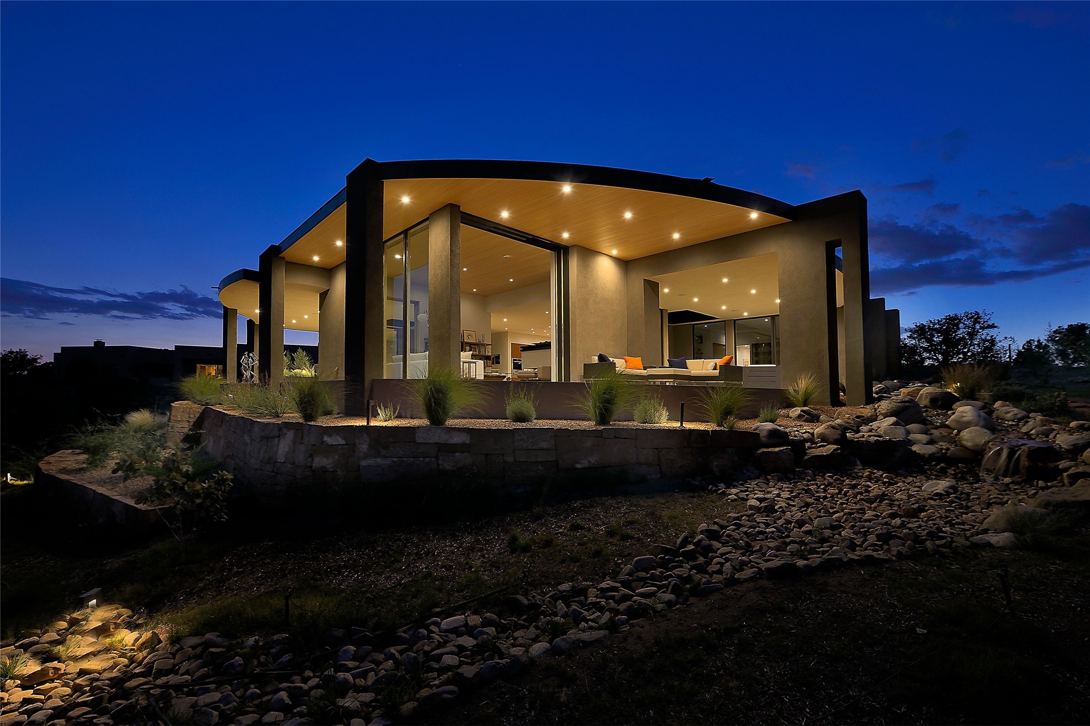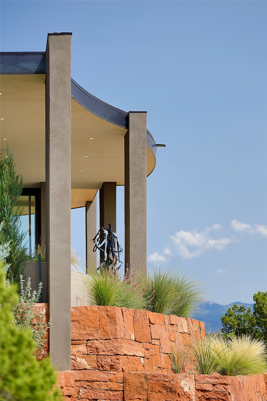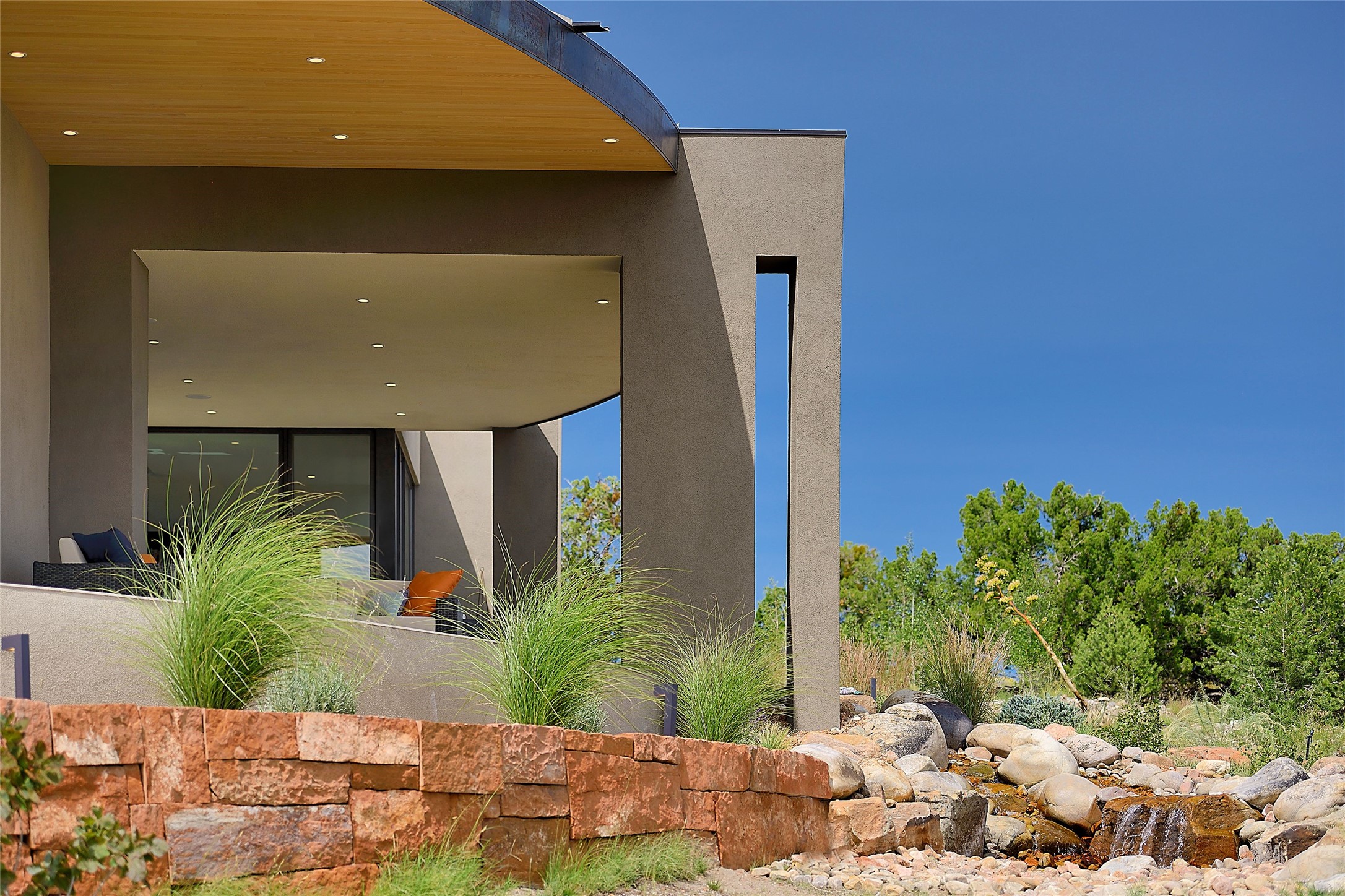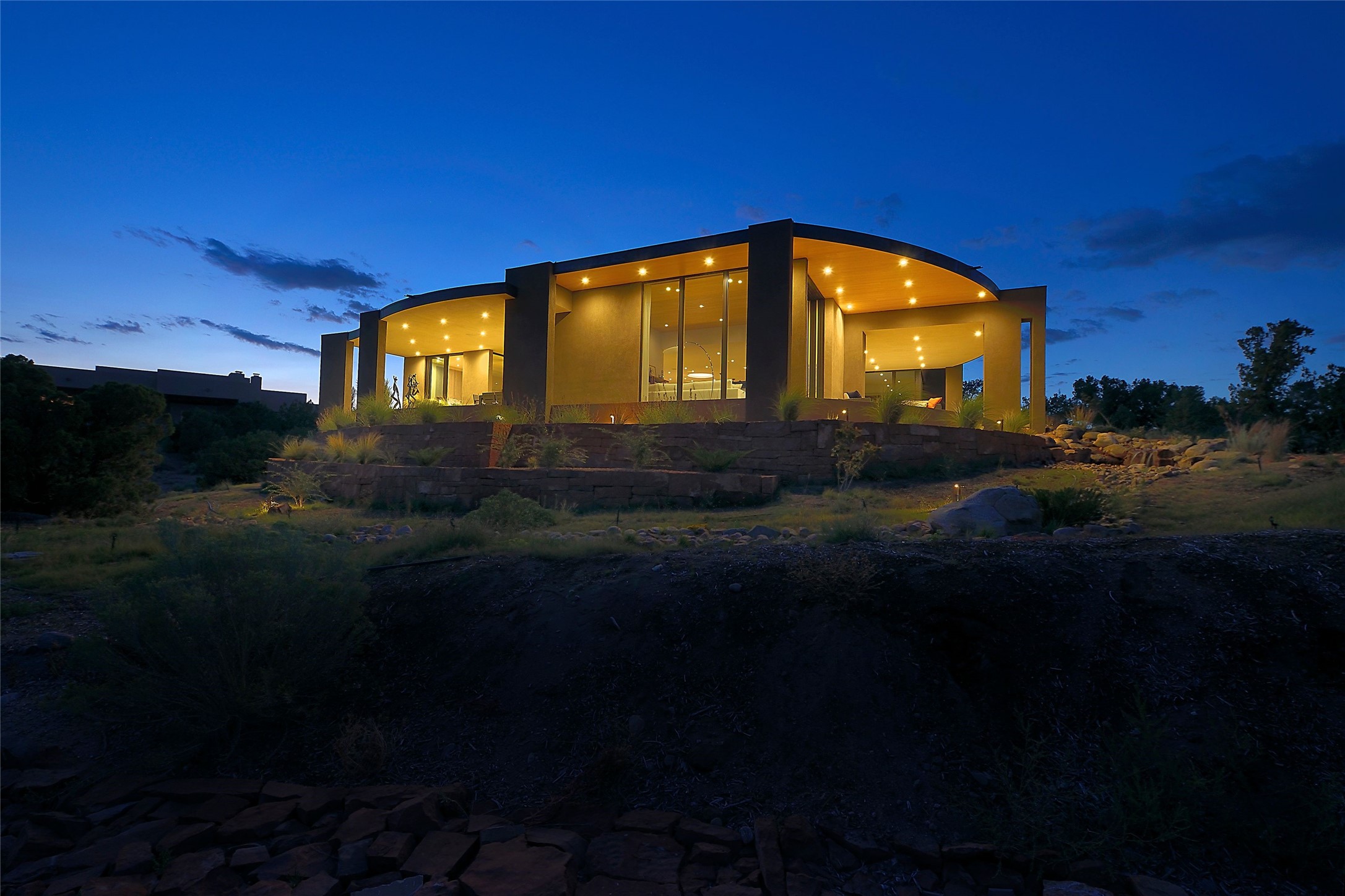Elegant 2020 Haciendas Parade of Homes Winner, by Tierra Concepts and architect Craig Hoopes, offers a captivating blend of creative comfort and architectural surprises at every turn. This 3-bedroom 3 bath masterpiece commands magnificent views of the Sangre de Cristo, Jemez, and Ortiz mountains. The interplay between intimacy and expansiveness is beautifully executed, with numerous strategically placed windows for breathtaking view corridors. Enter through the custom-crafted steel and glass pivot doors into 12-foot-high living room which opens to a voluminous wrap-around portal overlooking seven holes of the Las Campanas golf courses. The kitchen is a culinary delight with backlit, waterfall Alpine granite countertops, solid walnut cabinetry with soft-touch drawers, Miele appliances, and Subzero refrigerator. Celestial skylights overhead add a touch of wonder. Luxury primary suite with fireplace, asymmetrical backlit bookshelves, linen-covered wall panels, silk padded headboard, bathroom with dual-headed shower, soaking tub, and towel heating bar. Second suite, divided by walnut sliding pocket doors, offers flexibility as either a two-room guest suite or a guest room and studio. In addition, there is a third bedroom/office. Miniature gardens and a four-season bubbling brook. Landscaping by Serquis + Associates. Solar and 240-volt wiring in the oversized garage. Designed for the discerning homebuyer, this home is in the heart of the desirable Park Estates in Las Campanas.