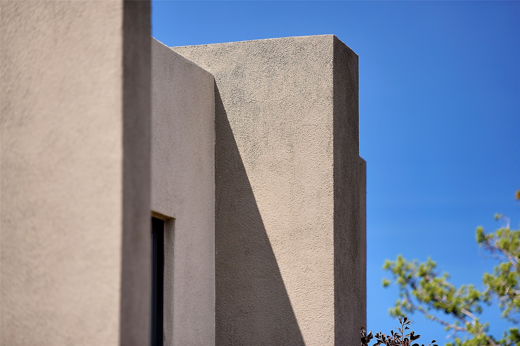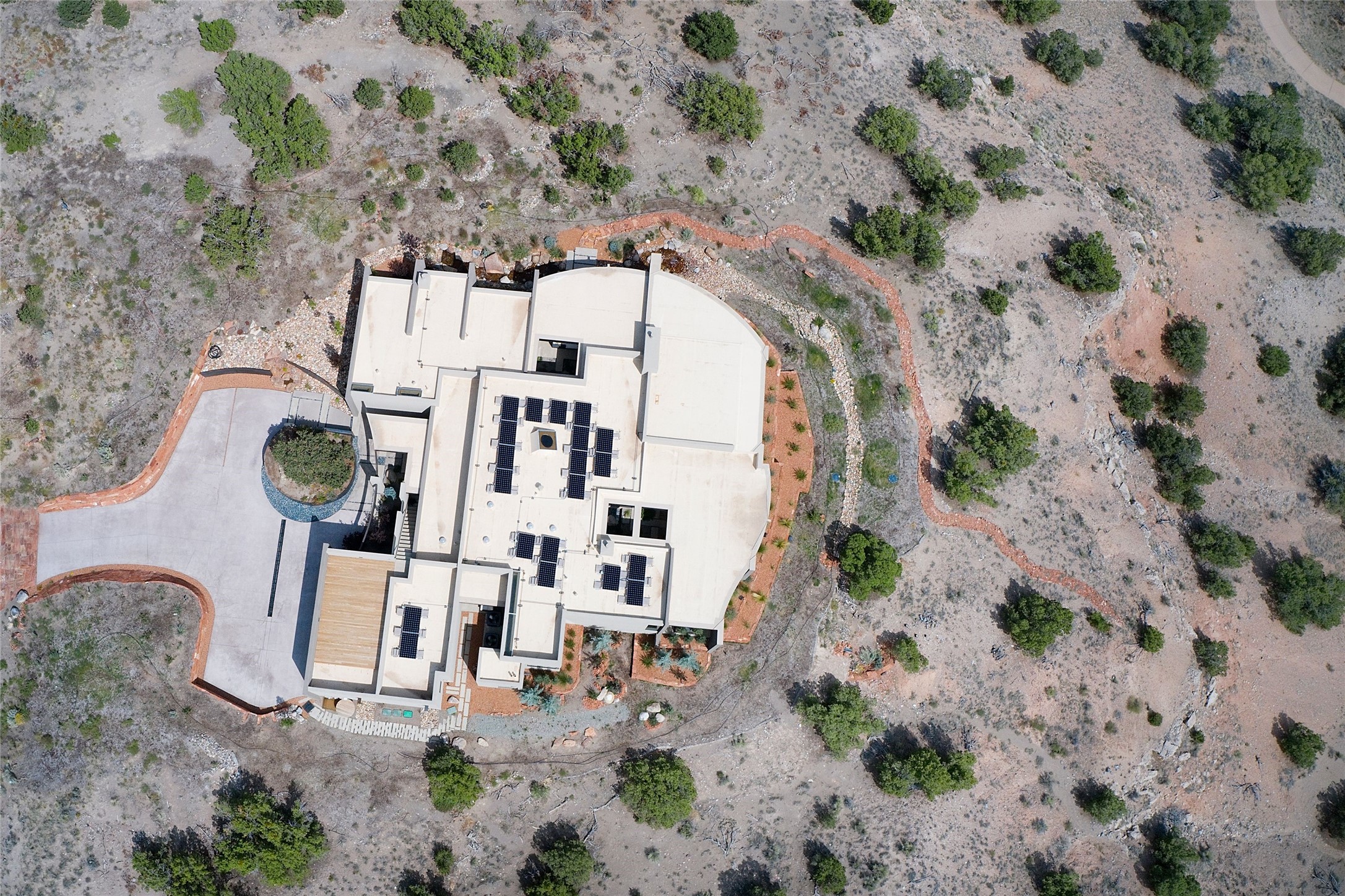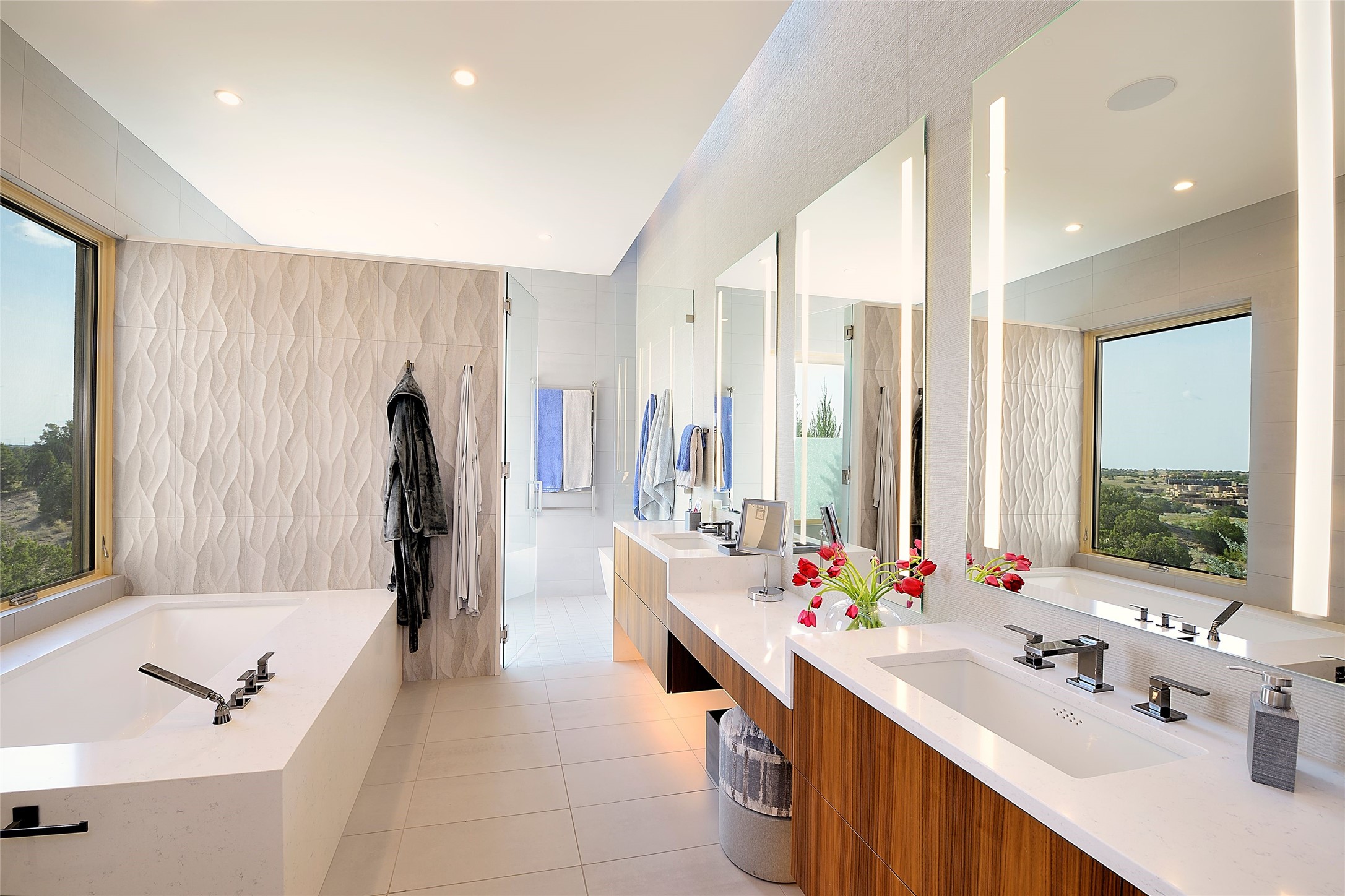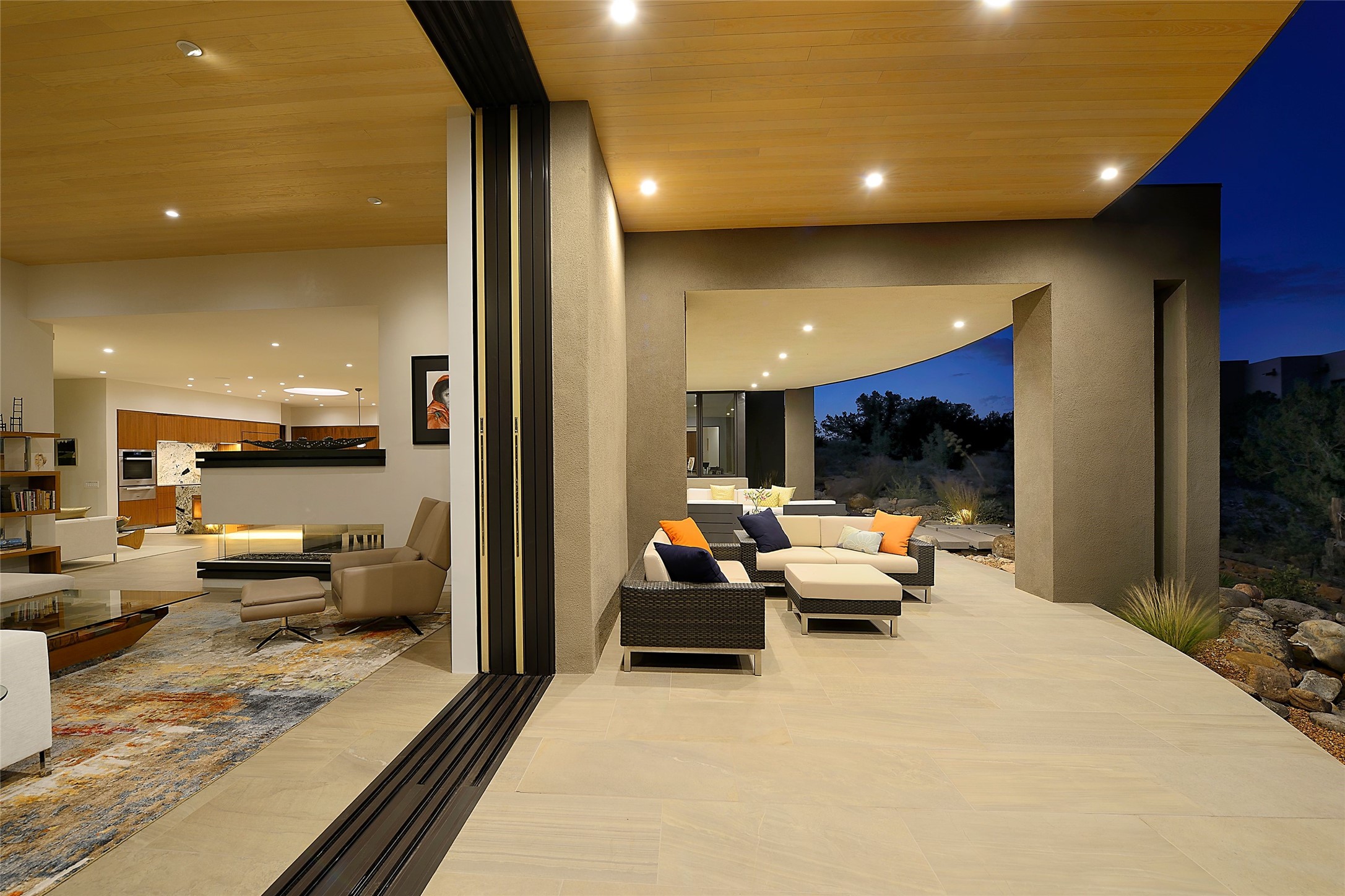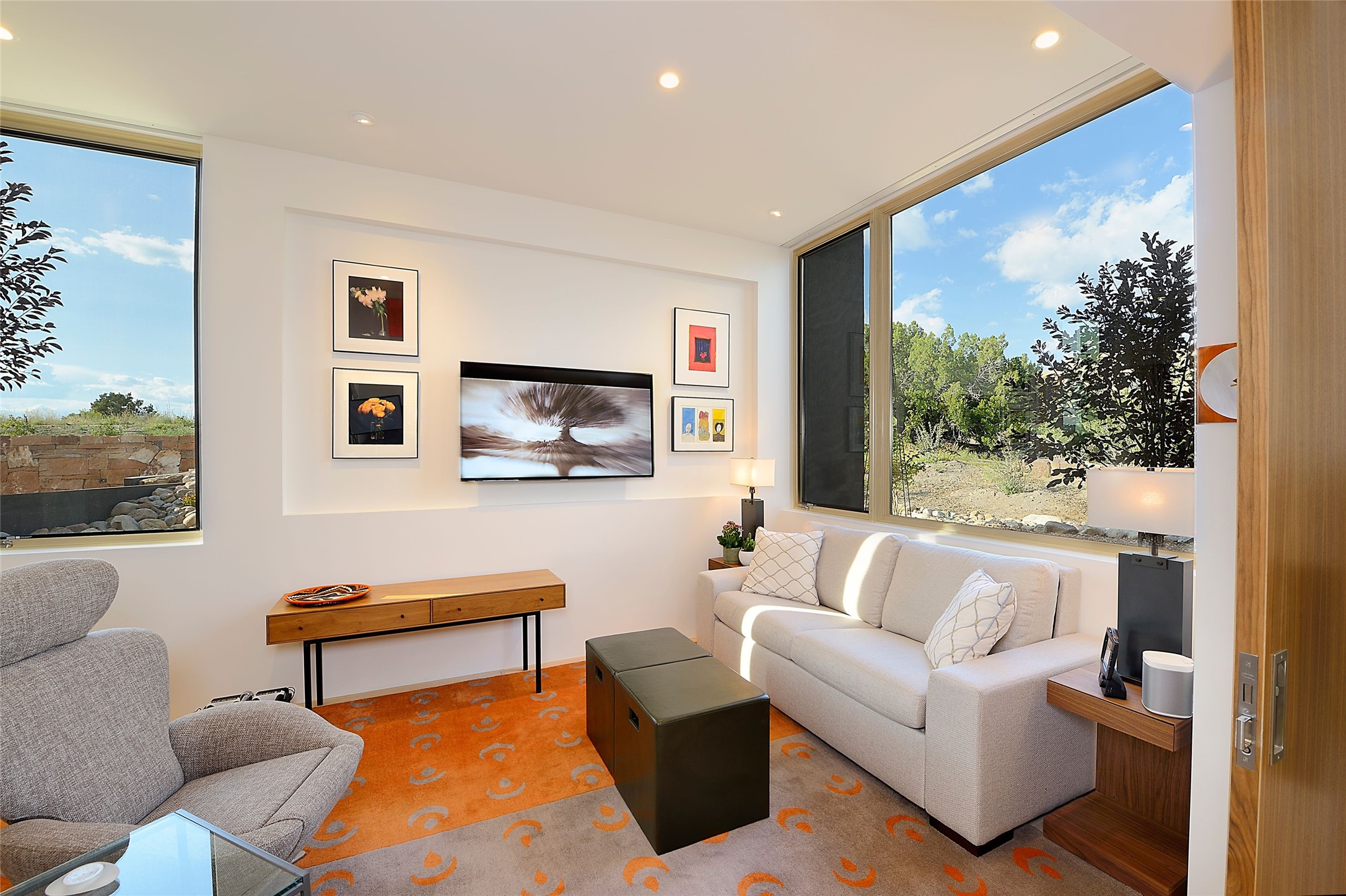 Elegant 2020 Haciendas Parade of Homes Winner, by Tierra Concepts and architect Craig Hoopes, offers a captivating blend of creative comfort and architectural surprises at every turn. This 3-bedroom 3 bath masterpiece commands magnificent views of the Sangre de Cristo, Jemez, and Ortiz mountains. The interplay between intimacy and expansiveness is beautifully executed, with numerous strategically placed windows for breathtaking view corridors. Enter through the custom-crafted steel and glass pivot doors into 12-foot-high living room which opens to a voluminous wrap-around portal overlooking seven holes of the Las Campanas golf courses. The kitchen is a culinary delight with backlit, waterfall Alpine granite countertops, solid walnut cabinetry with soft-touch drawers, Miele appliances, and Subzero refrigerator. Celestial skylights overhead add a touch of wonder. Luxury primary suite with fireplace, asymmetrical backlit bookshelves, linen-covered wall panels, silk padded headboard, bathroom with dual-headed shower, soaking tub, and towel heating bar. Second suite, divided by walnut sliding pocket doors, offers flexibility as either a two-room guest suite or a guest room and studio. In addition, there is a third bedroom/office. Miniature gardens and a four-season bubbling brook. Landscaping by Serquis + Associates. Solar and 240-volt wiring in the oversized garage. Designed for the discerning homebuyer, this home is in the heart of the desirable Park Estates in Las Campanas.