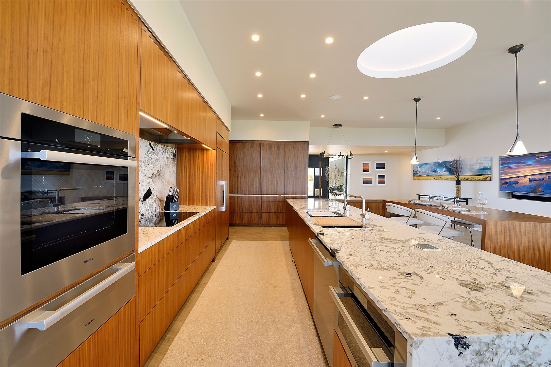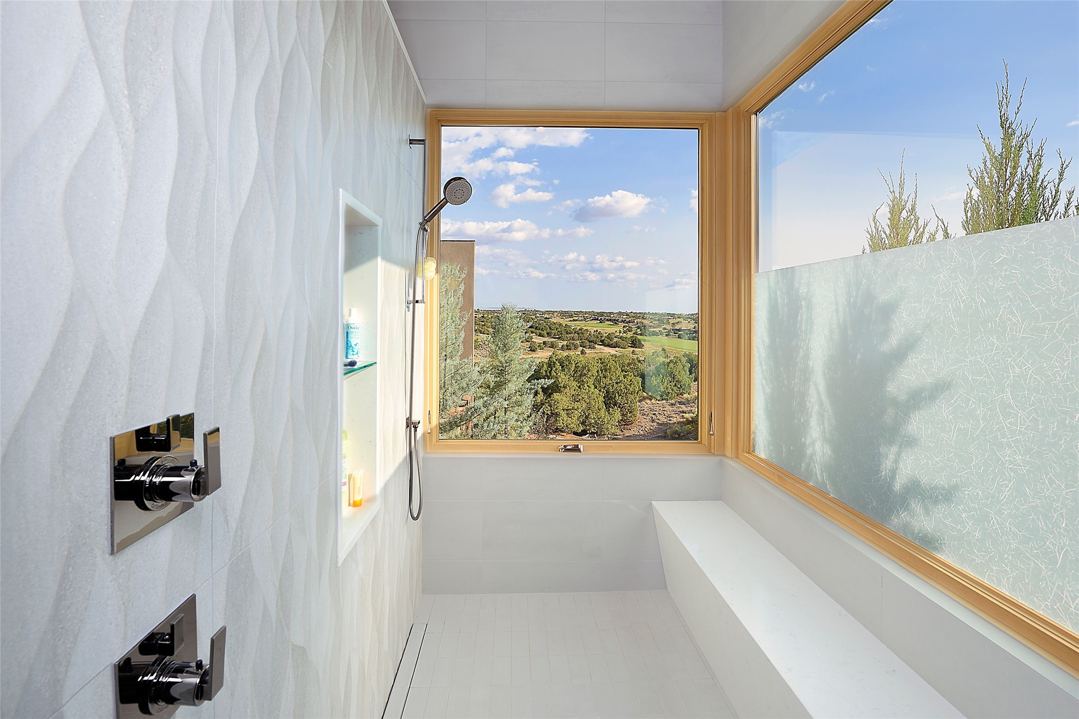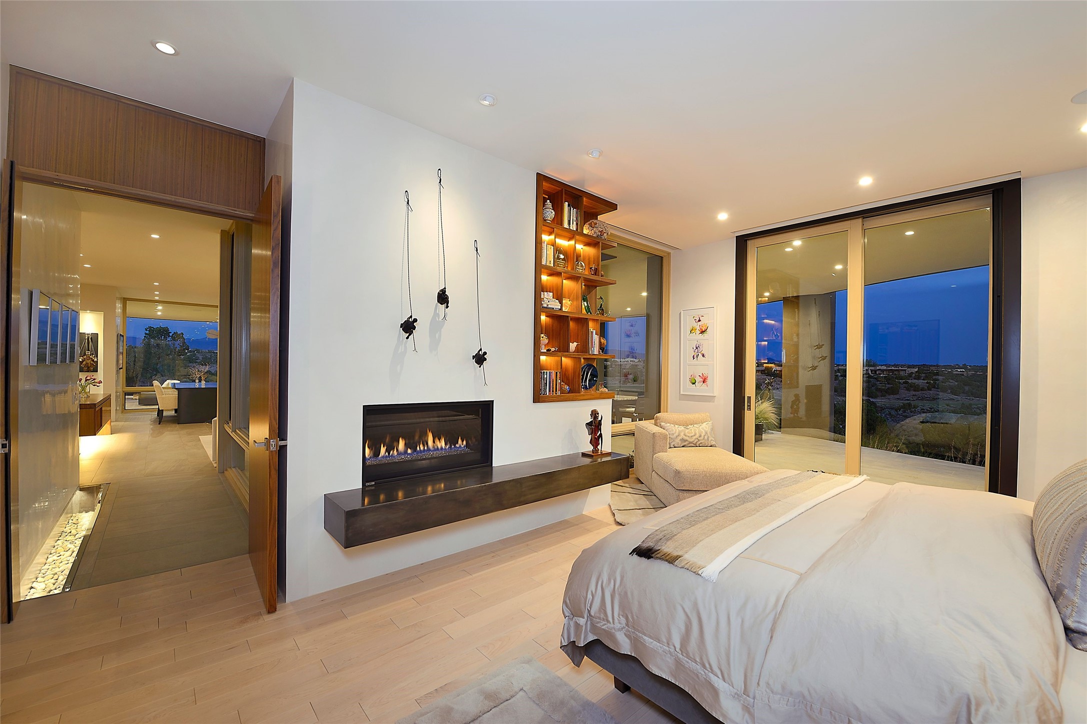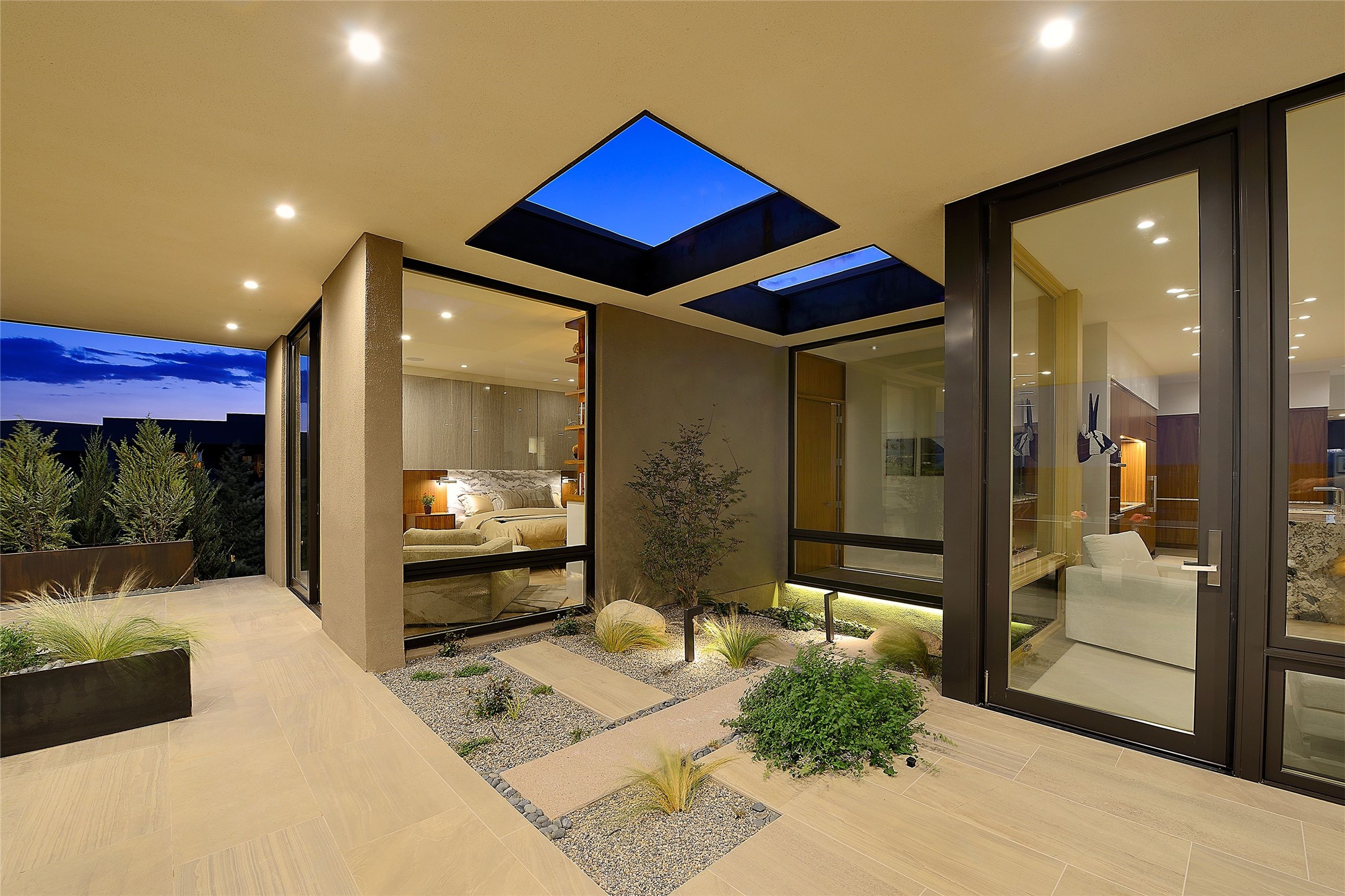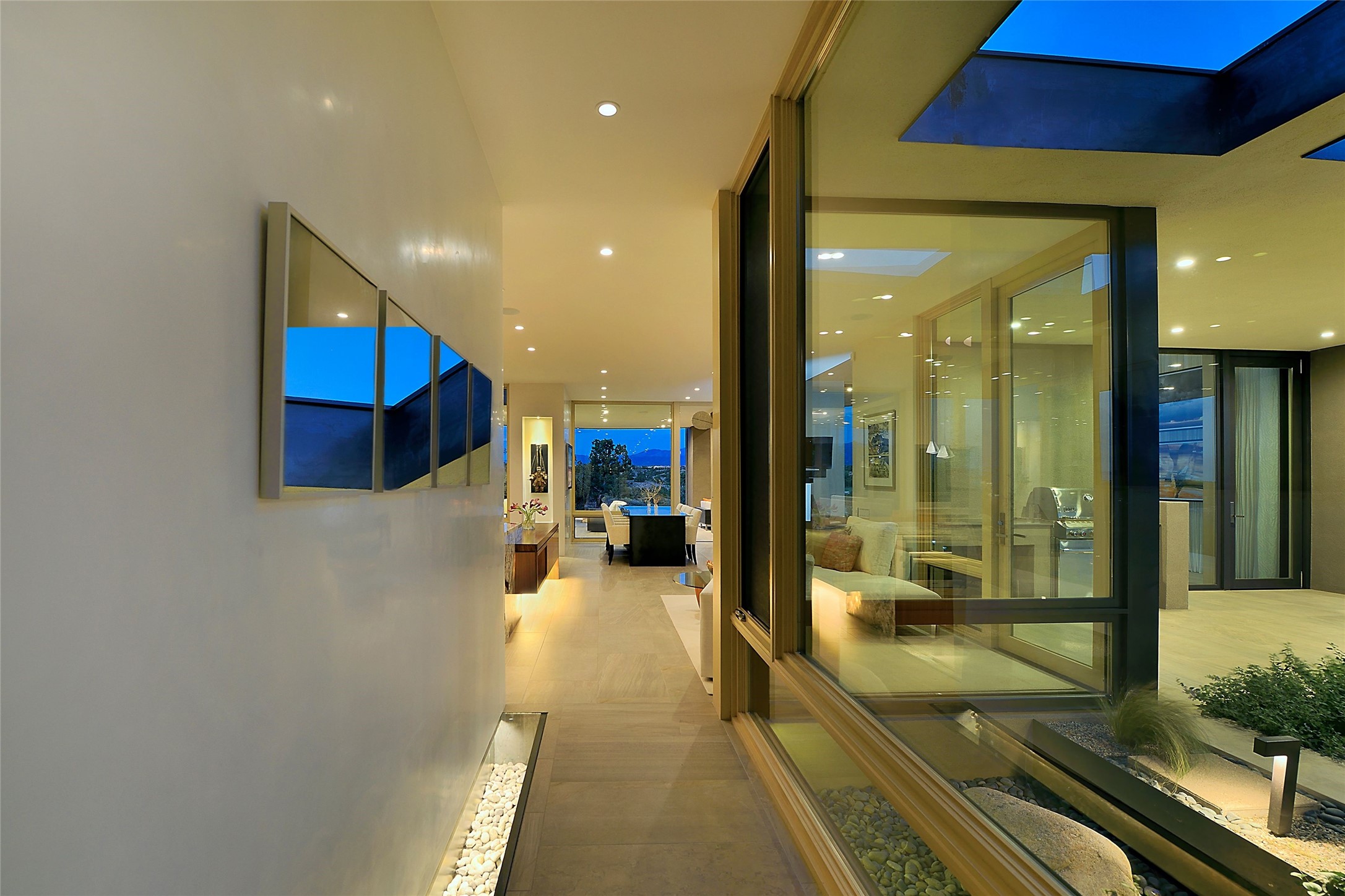 Elegant 2020 Haciendas Parade of Homes Winner, by Tierra Concepts and architect Craig Hoopes, offers a captivating blend of creative comfort and architectural surprises at every turn. This 3-bedroom 3 bath masterpiece commands magnificent views of the Sangre de Cristo, Jemez, and Ortiz mountains. The interplay between intimacy and expansiveness is beautifully executed, with numerous strategically placed windows for breathtaking view corridors. Enter through the custom-crafted steel and glass pivot doors into 12-foot-high living room which opens to a voluminous wrap-around portal overlooking seven holes of the Las Campanas golf courses. The kitchen is a culinary delight with backlit, waterfall Alpine granite countertops, solid walnut cabinetry with soft-touch drawers, Miele appliances, and Subzero refrigerator. Celestial skylights overhead add a touch of wonder. Luxury primary suite with fireplace, asymmetrical backlit bookshelves, linen-covered wall panels, silk padded headboard, bathroom with dual-headed shower, soaking tub, and towel heating bar. Second suite, divided by walnut sliding pocket doors, offers flexibility as either a two-room guest suite or a guest room and studio. In addition, there is a third bedroom/office. Miniature gardens and a four-season bubbling brook. Landscaping by Serquis + Associates. Solar and 240-volt wiring in the oversized garage. Designed for the discerning homebuyer, this home is in the heart of the desirable Park Estates in Las Campanas.