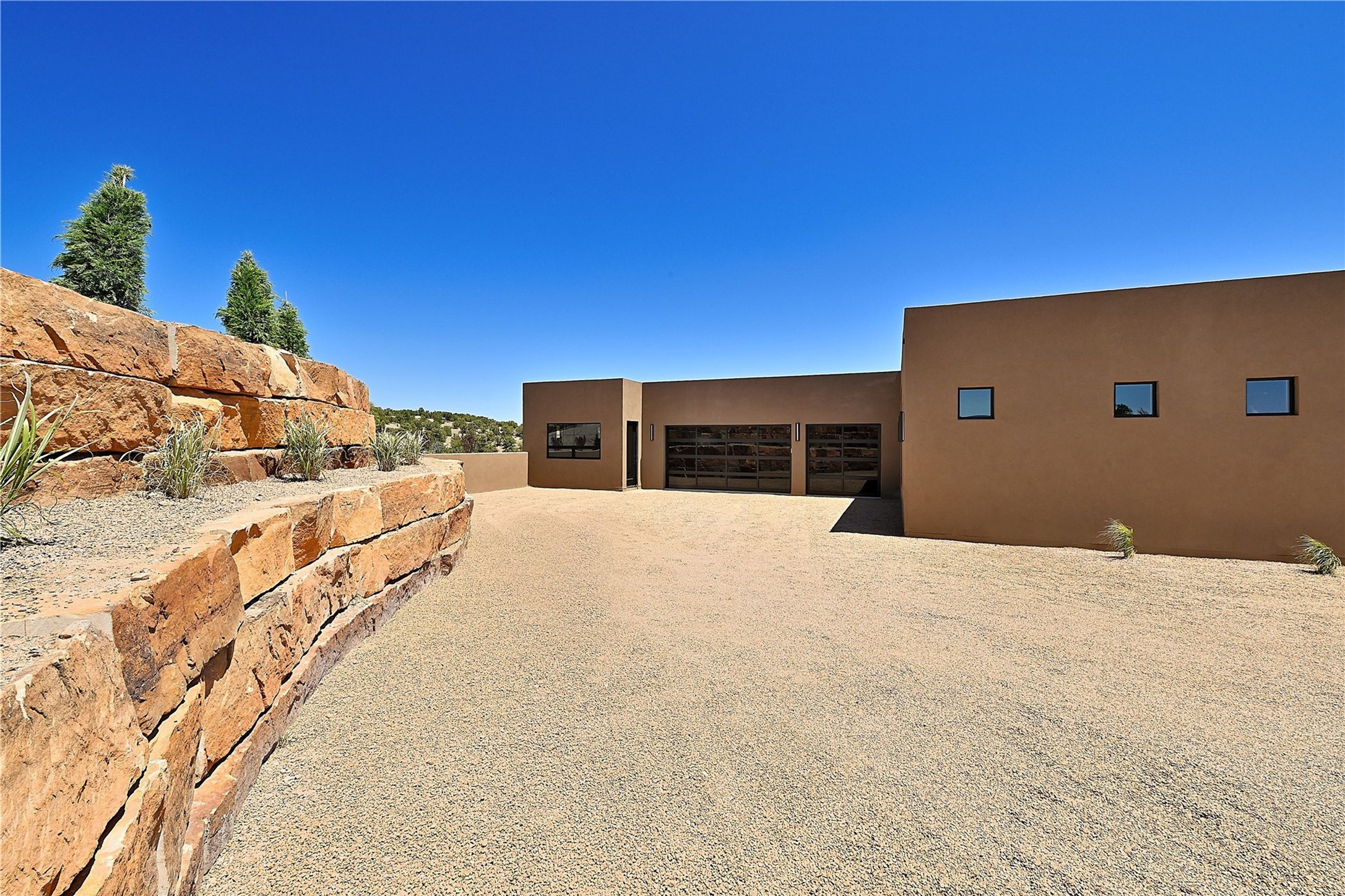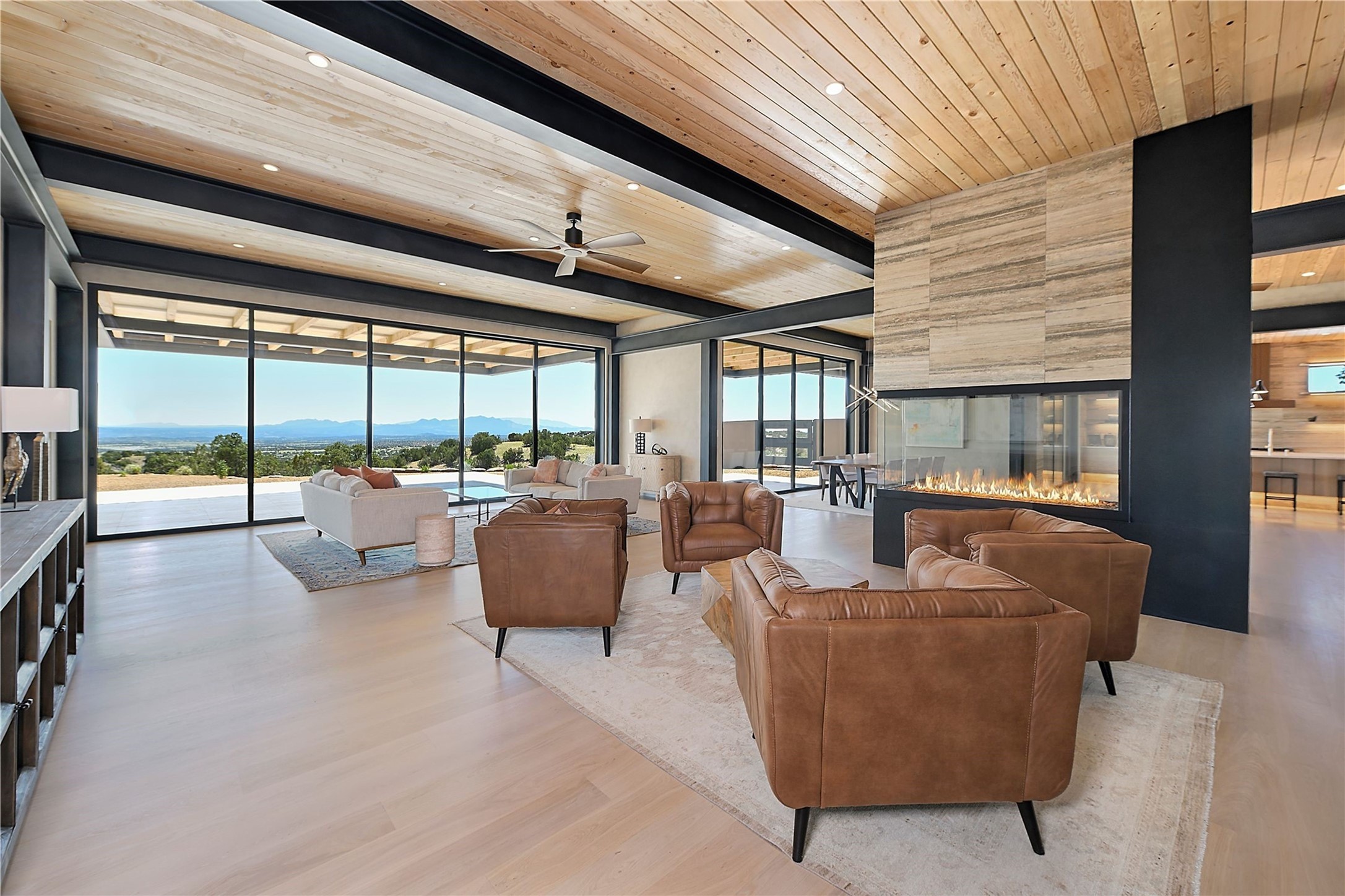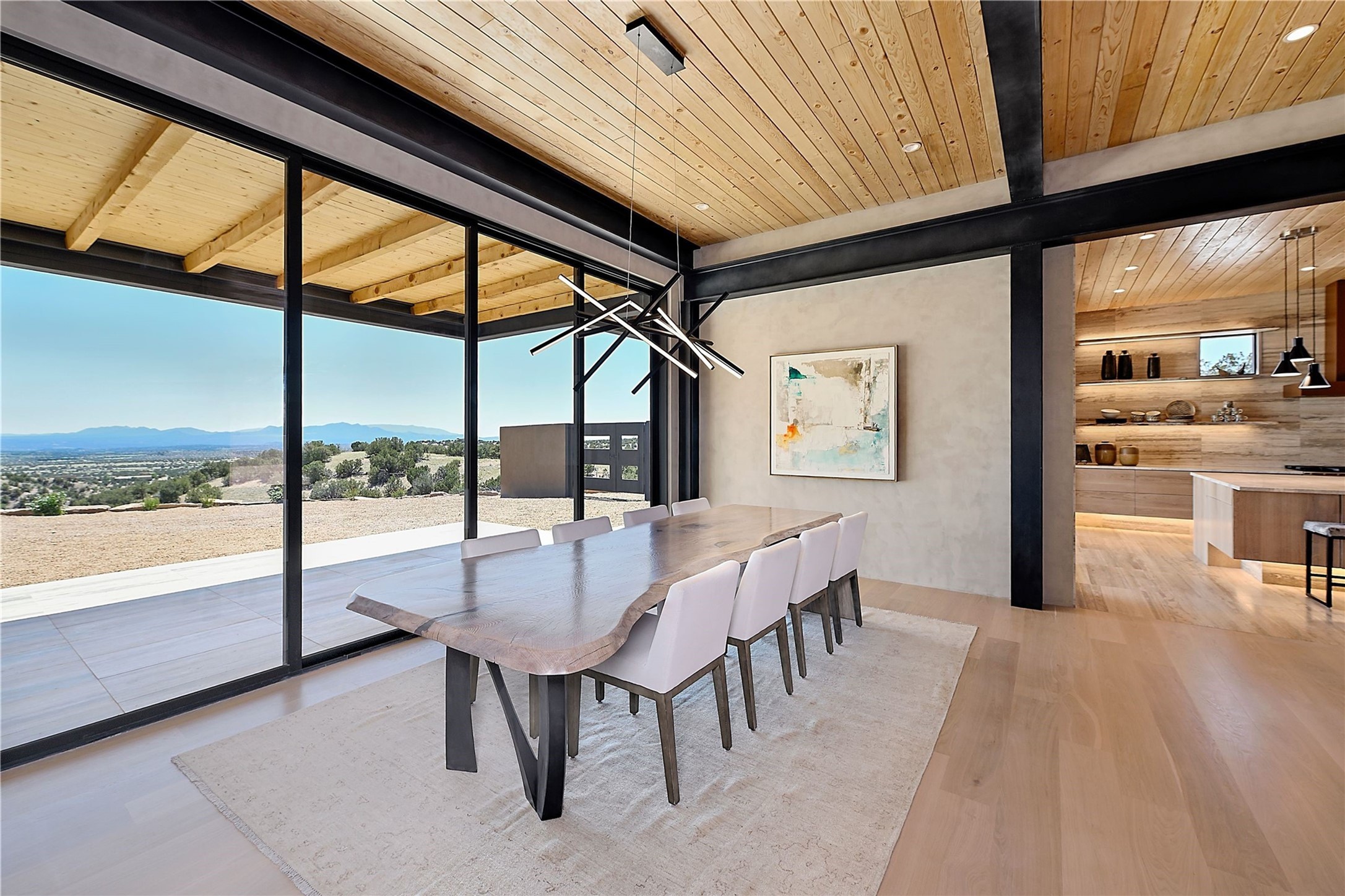 ** 2025 Grand Hacienda Winner!17 Vista Bella will be the #1 Property on the Haciendas 2025 Parade of Homes Tour 8/8-8/10 and 8/15-8/17. Breathtaking views and stellar night skies- this new build is move in ready! Boasting (approx.) 4,400 sq. ft. & nestled on 12.68 acres, this home offers unparalleled views of the Galisteo Basin and mountains. Designed by Mark Schwebel of Big Art Builders, 2024 Parade of Homes for Natural Materials winner, this masterpiece blends cantilevered steel beams, glass, natural wood, and stone to harmonize with its high-desert surroundings. A contemporary design brings the outdoors in, with expansive windows, a stunning outdoor kitchen, and spaces perfect for entertaining. Each element has been meticulously crafted to highlight the surrounding beauty while creating a warm, luxurious environment. The kitchen's stunning centerpiece is crafted from white oak slabs, complemented by Italian stone floors and walls. Counters are custom-milled Brazilian stone, with BlueStar appliances and True refrigeration. Each bathroom is a work of art, clad in exotic stones sourced from Mexico, Turkey, and Italy. Vanities are crafted from exotic hardwoods like West African Padauk and Black Limba, paired with countertops of Persian travertine, Brazilian Taj Mahal, and Namibian granite. The powder room features Italian stone and a unique concrete sink. Refined details include: 7" French white oak floors, Lake Tahoe white fir ceilings, and two showpiece gas fireplaces: a modern shepherd's design in the primary suite and a black granite-clad peninsula in the living room. Take advantage of the unrivaled comfort this home offers with High-efficiency Carrier forced air heating and cooling, radiant heating throughout, and superior insulation with closed-cell spray foam (R60 ceilings, R30 walls). This home is a celebration of luxury, nature, and artistry, a truly one-of-a-kind property that must be experienced.
