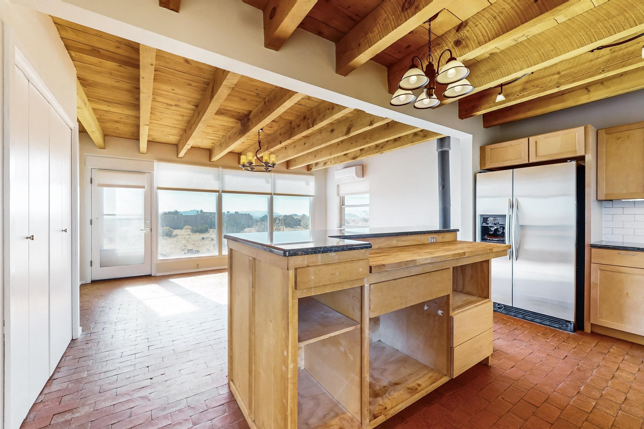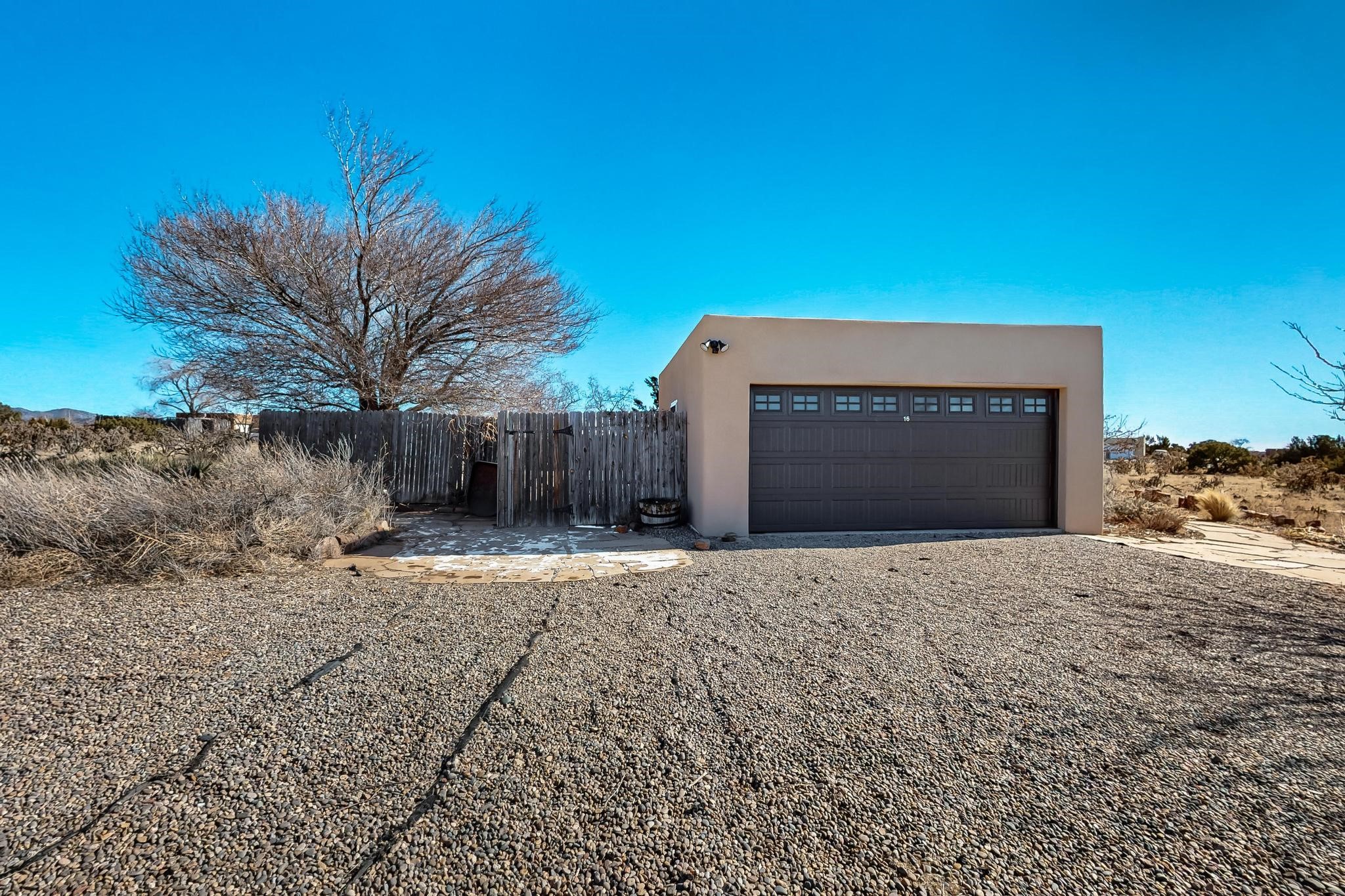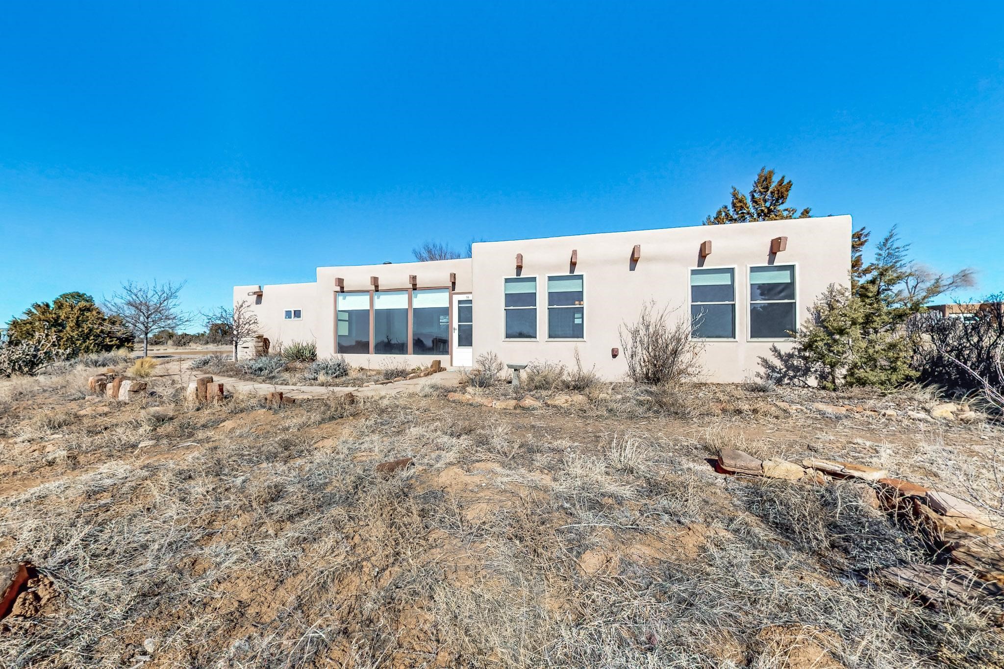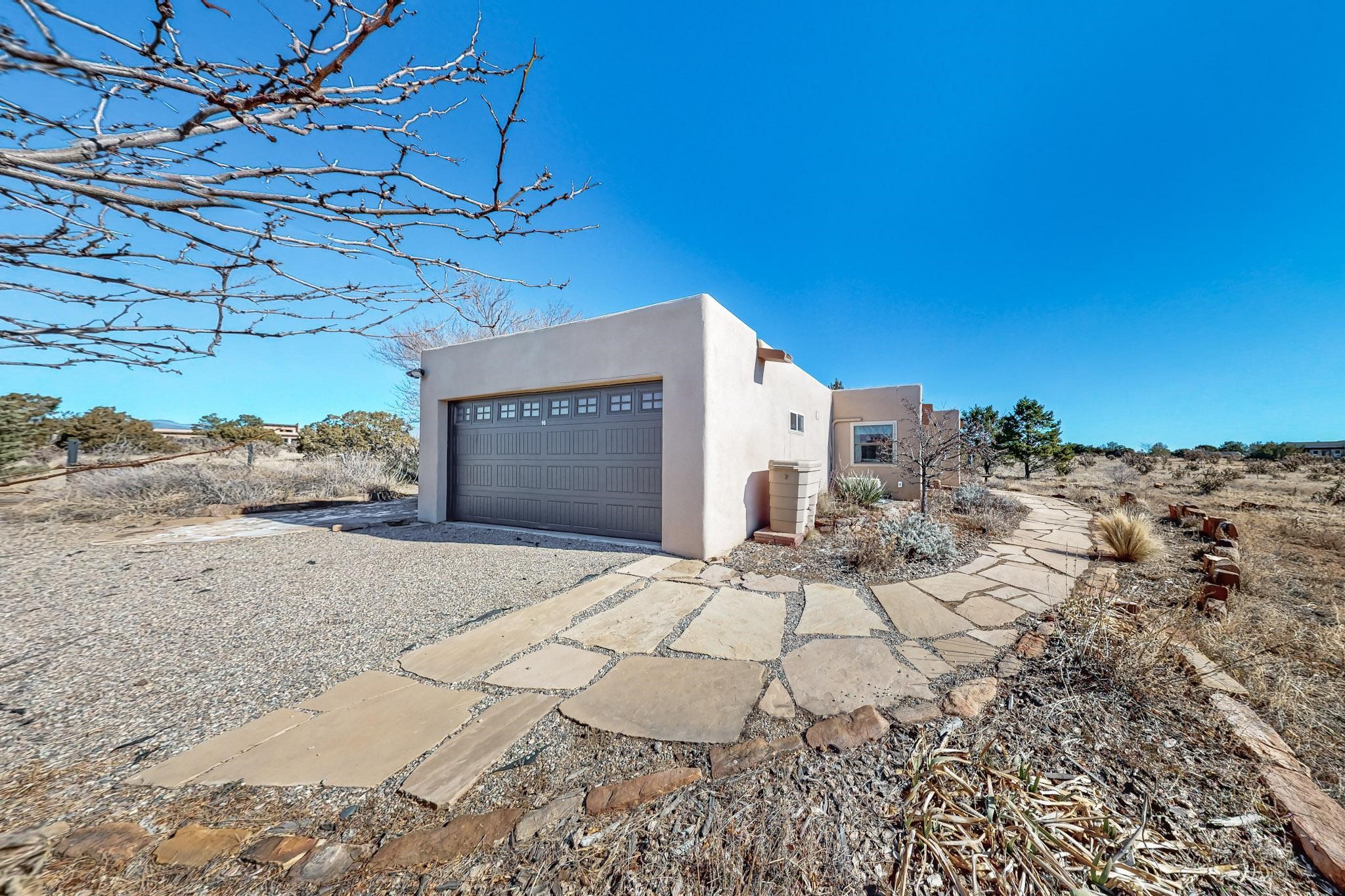 Priced to Sell! Lovely popular passive solar open plan design, move in ready. Totally refreshed sparkling interior including new carpets and paint.The main and guest baths were both remodeled in 2023, the kitchen updated with maple cabinetry, quartz and butcher block countertops, new appliances including natural gas cooktop with electric oven, and under cabinet lighting. Besides the wood stove, a minisplit was added about 5 years ago, and gas wall heaters in each bedroom. All windows except the living room were replaced in 2021. The home was restuccoed in 2021 and the garage door replaced the year before. A polyurethane membrane roof covering and insulation was installed approximately 10 years ago. There is a 3 share well and a well share agreement approximately $80.00 per year. Fruit trees including a productive apricot and apple in lovely fully fenced private backyard. Sunset views and a quiet 1.3 acre surround yet quick paved access to Eldorado amenities, local shopping and services plus only minutes into Santa Fe.