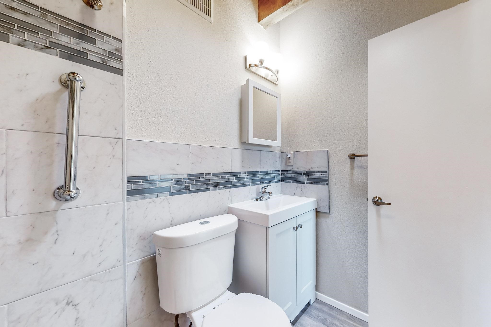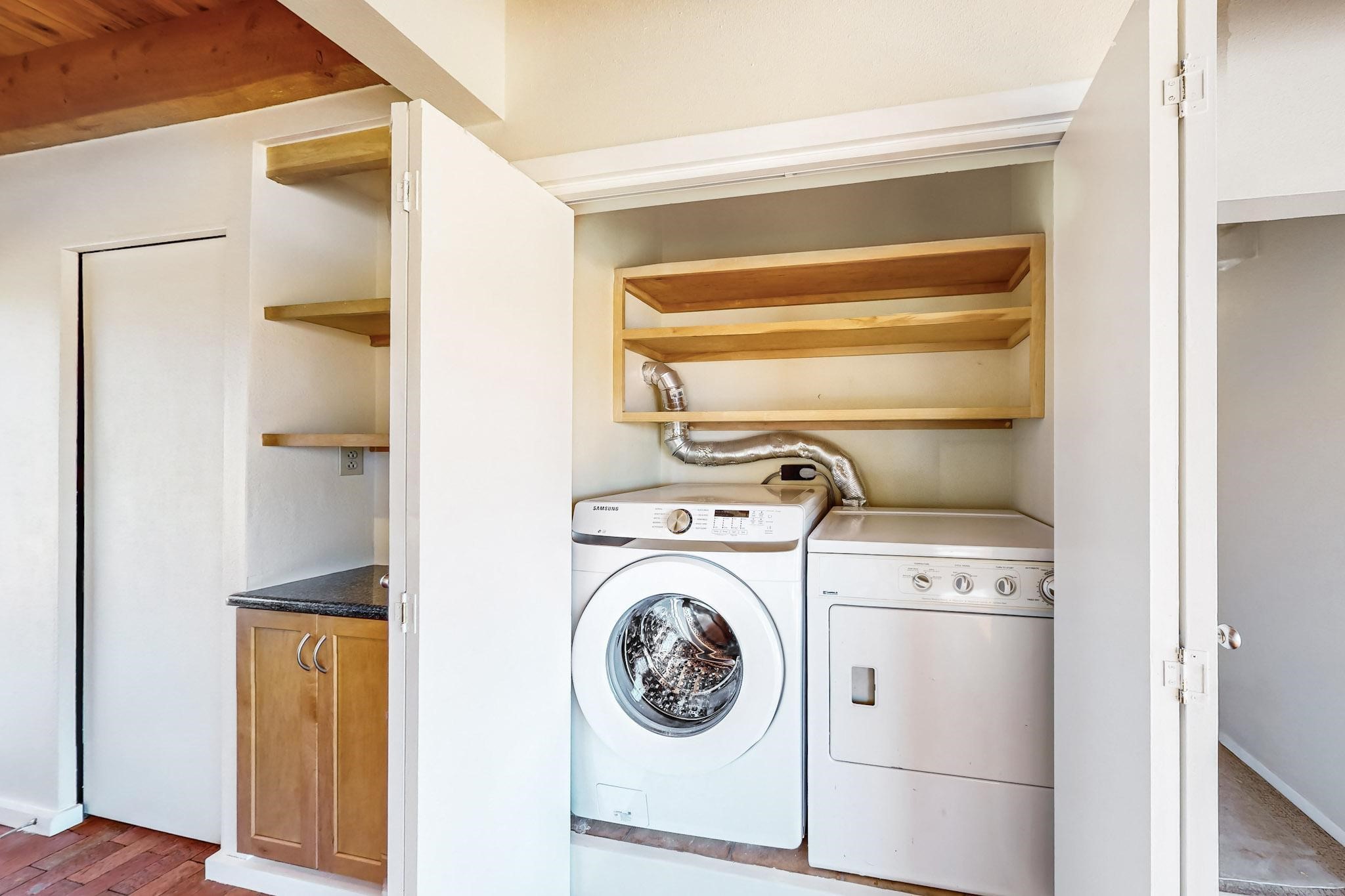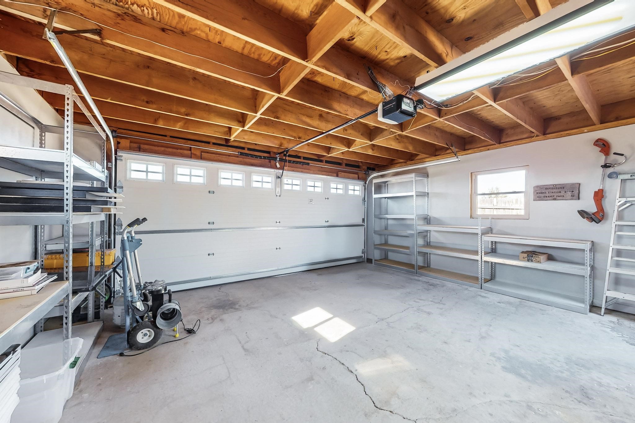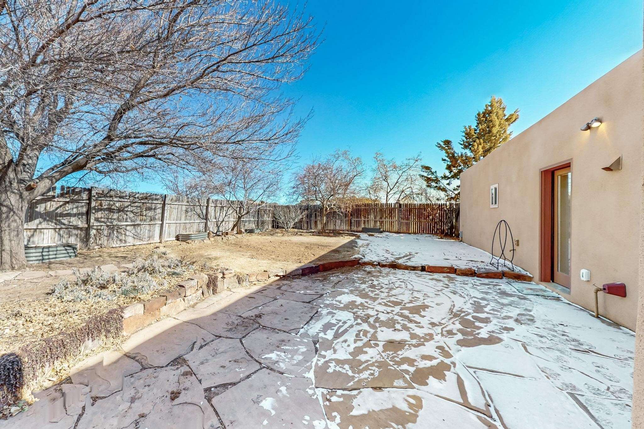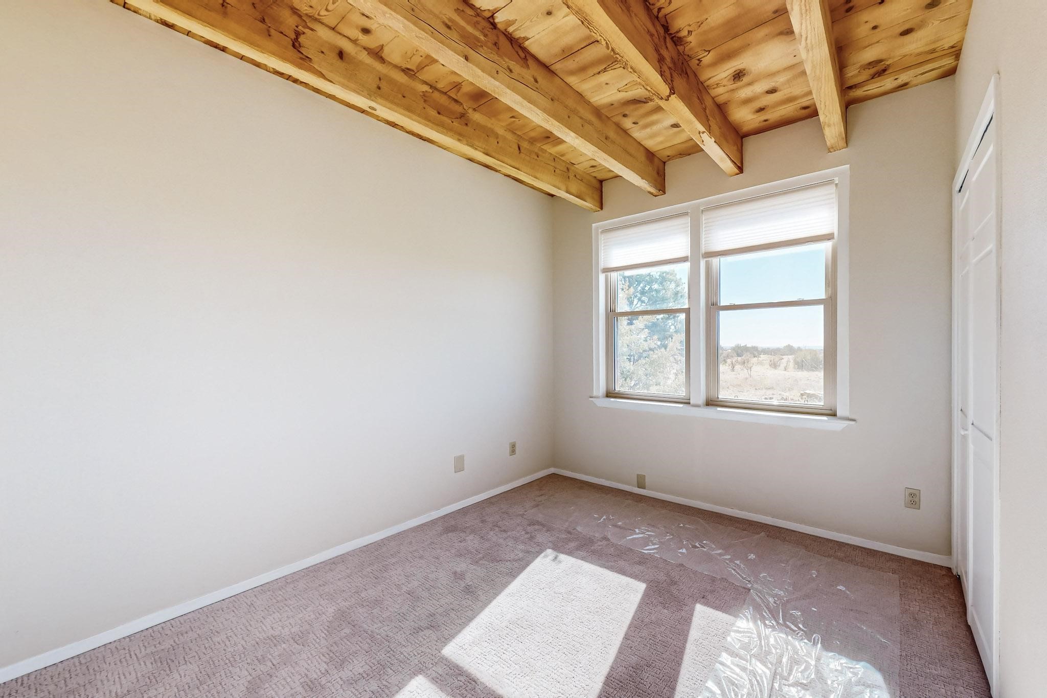 Priced to Sell! Lovely popular passive solar open plan design, move in ready. Totally refreshed sparkling interior including new carpets and paint.The main and guest baths were both remodeled in 2023, the kitchen updated with maple cabinetry, quartz and butcher block countertops, new appliances including natural gas cooktop with electric oven, and under cabinet lighting. Besides the wood stove, a minisplit was added about 5 years ago, and gas wall heaters in each bedroom. All windows except the living room were replaced in 2021. The home was restuccoed in 2021 and the garage door replaced the year before. A polyurethane membrane roof covering and insulation was installed approximately 10 years ago. There is a 3 share well and a well share agreement approximately $80.00 per year. Fruit trees including a productive apricot and apple in lovely fully fenced private backyard. Sunset views and a quiet 1.3 acre surround yet quick paved access to Eldorado amenities, local shopping and services plus only minutes into Santa Fe.