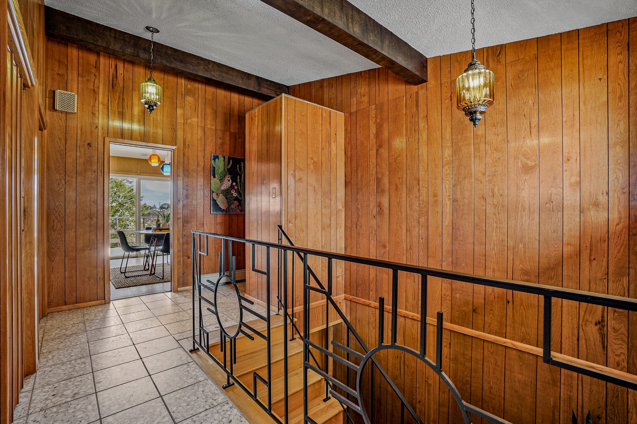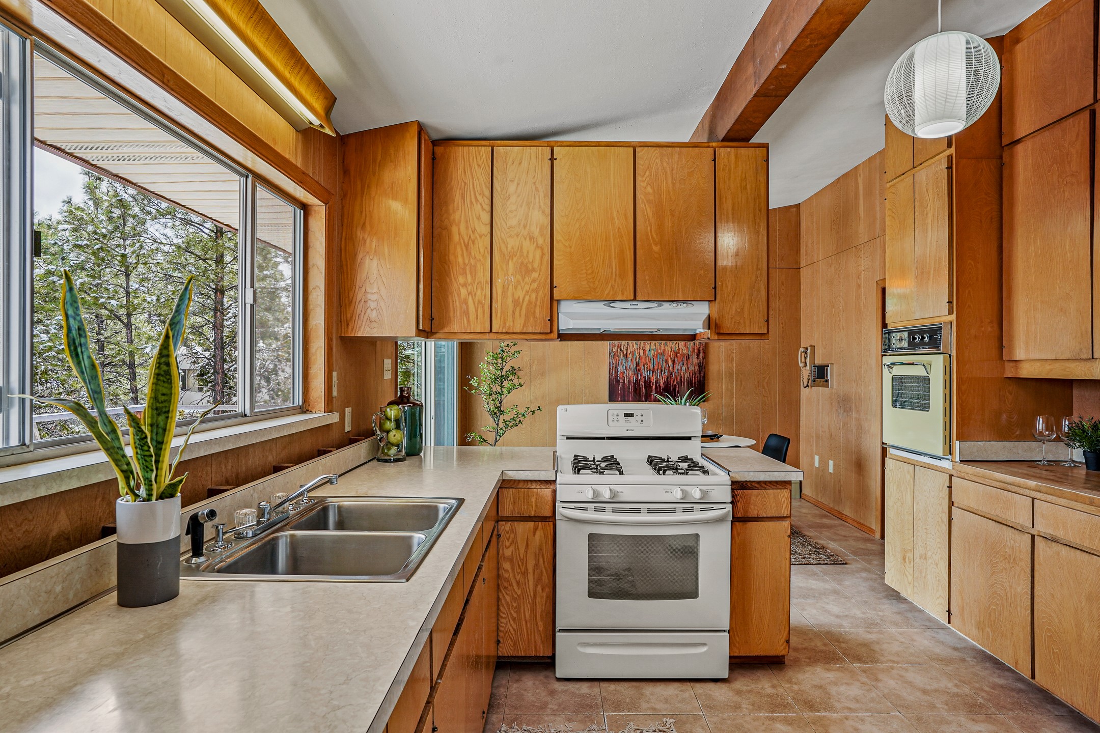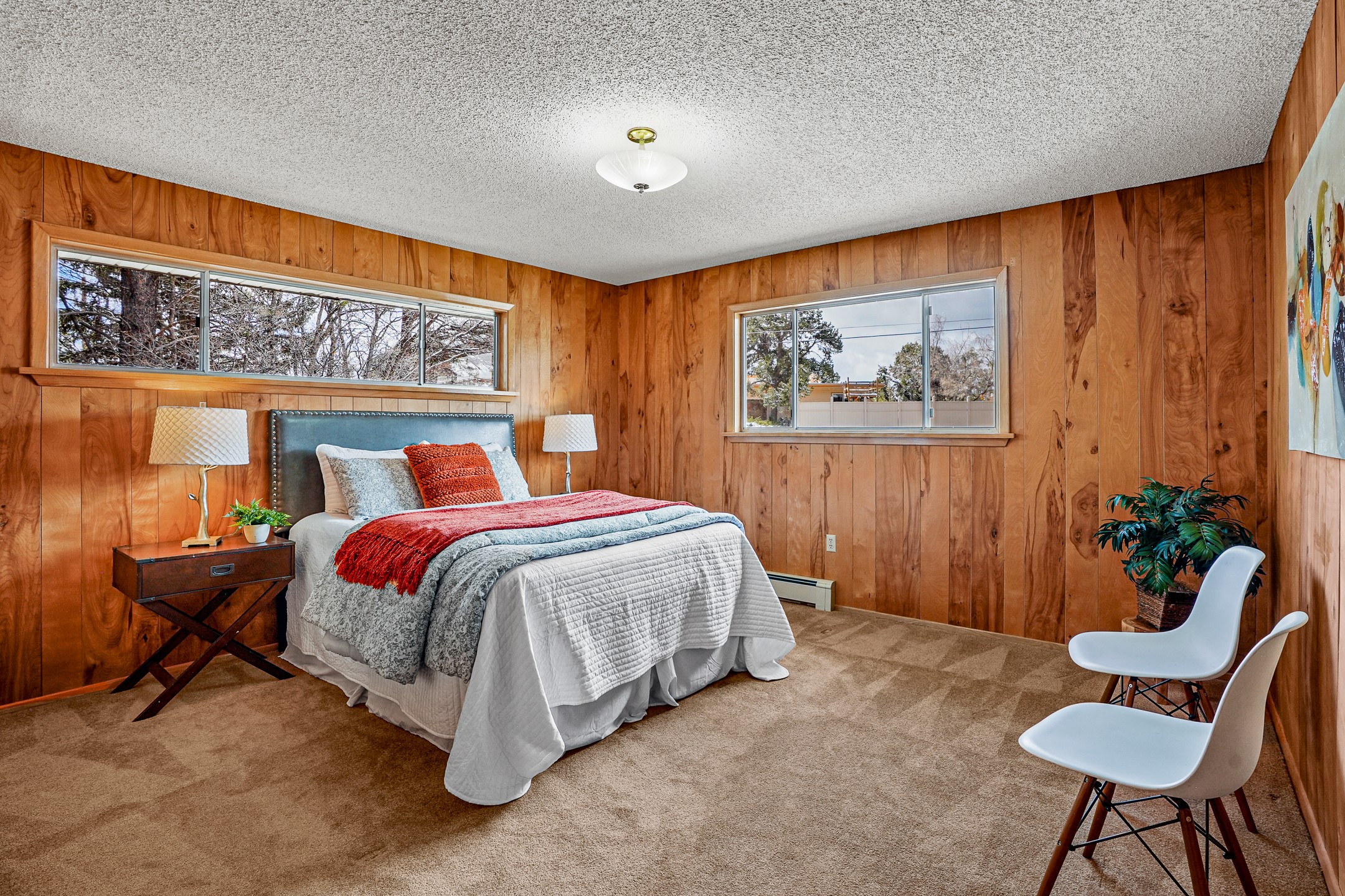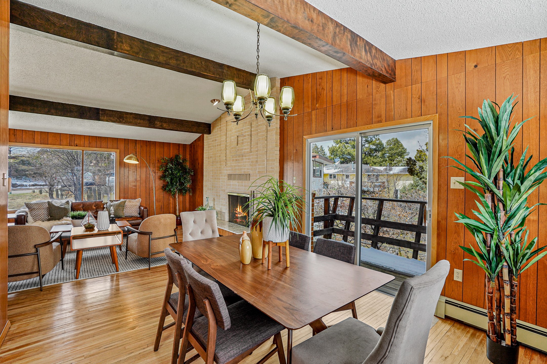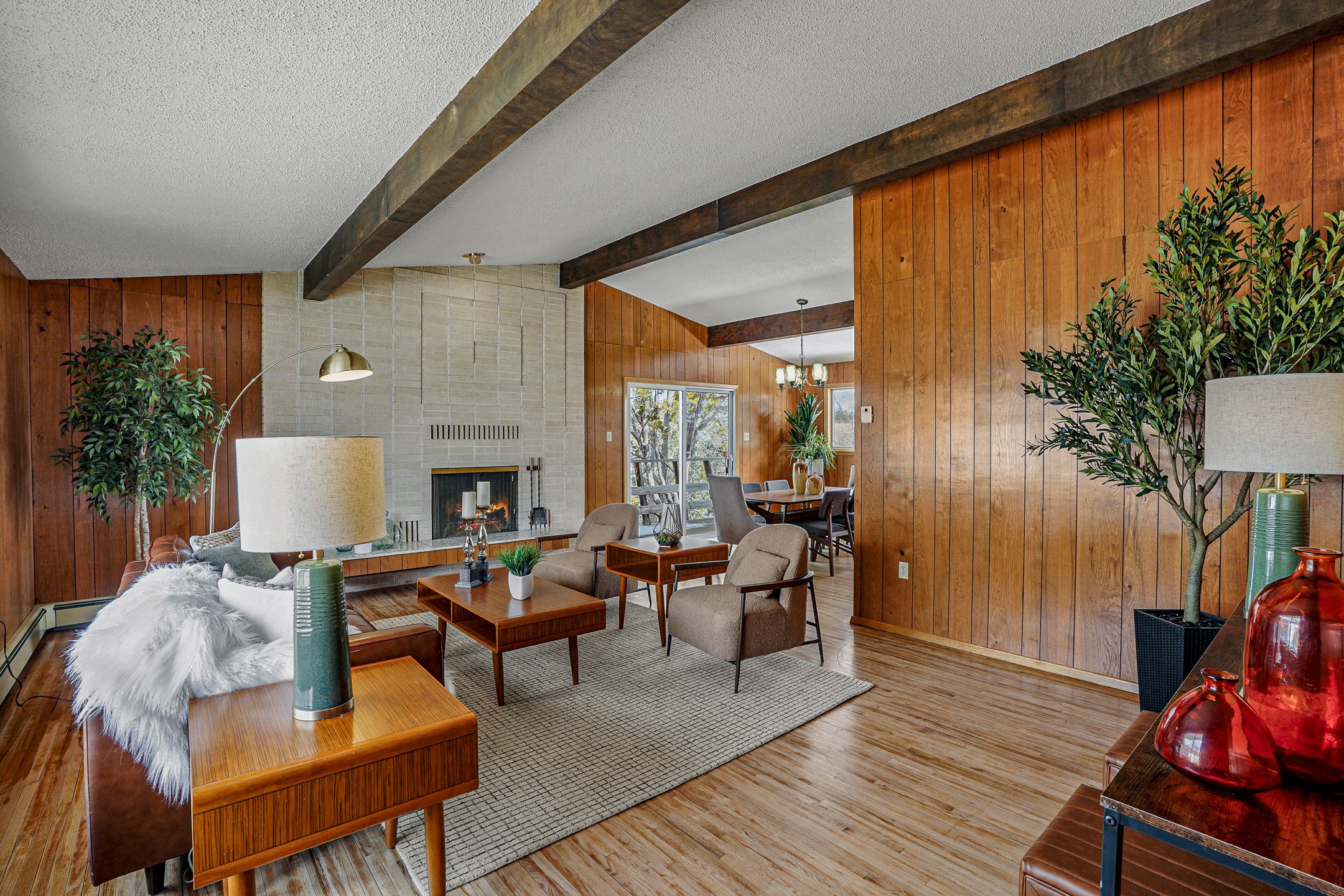 Brimming with vintage appeal and thoughtful details, this spacious 5-bedroom, 3-bathroom home strikes the perfect balance between retro charm and move-in-ready comfort. From the rich wood paneling to the stunning mid-century modern white brick fireplace, every corner tells a story. Vaulted ceilings with exposed beams create an airy sense of space, while large windows flood the home with natural light. Unique retro light fixtures add a fun, stylish flair, and the impeccably maintained interior offers a perfect canvas for your personal touch. Upstairs, you'll find three generously sized bedrooms and two full bathrooms, designed with functionality in mind. Downstairs, the walk-out basement expands your living space with two additional large bedrooms, a second cozy living area with its own fireplace, and a spacious laundry/utility room with ample storage--ideal for a workshop, craft space, or simply keeping things organized. Out back, enjoy the tranquility of open space with direct access to nearby trails and schools just minutes away. The yard boasts multiple fruit trees including apple, apricot and pear. Whether you're a mid-century enthusiast or simply looking for a solid, spacious home in a prime location, this one has the bones, the vibe, and the potential to make it truly yours.