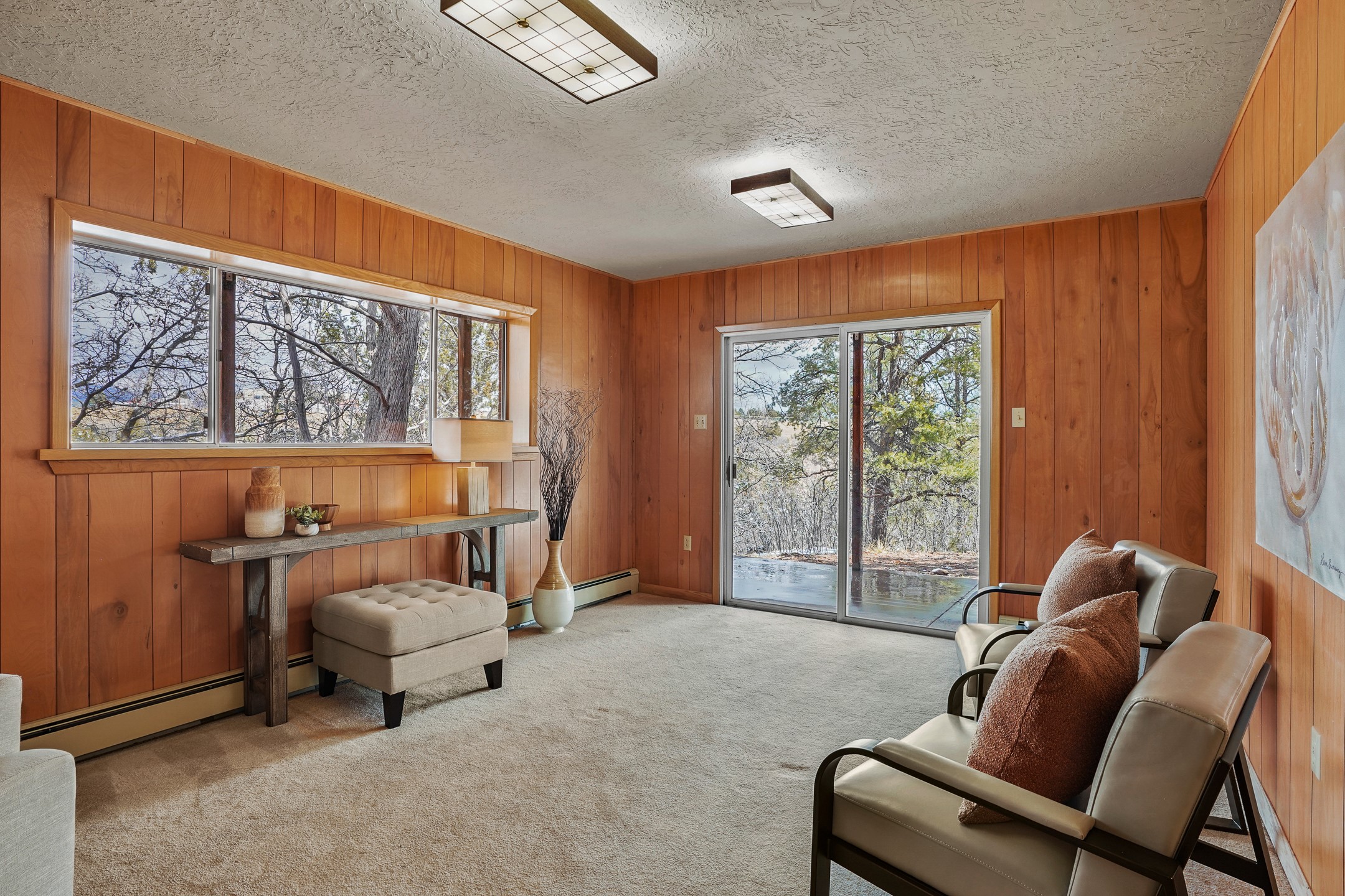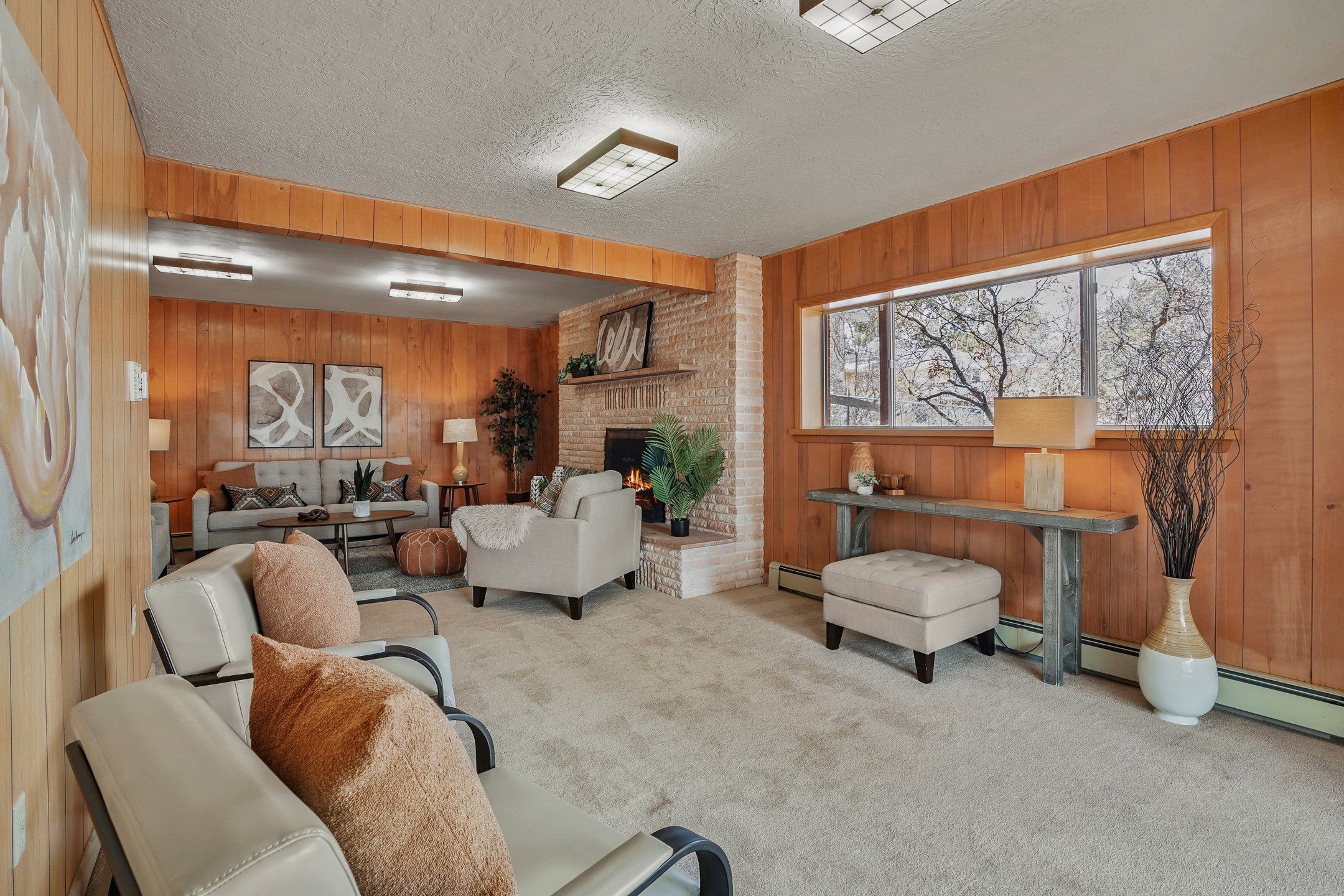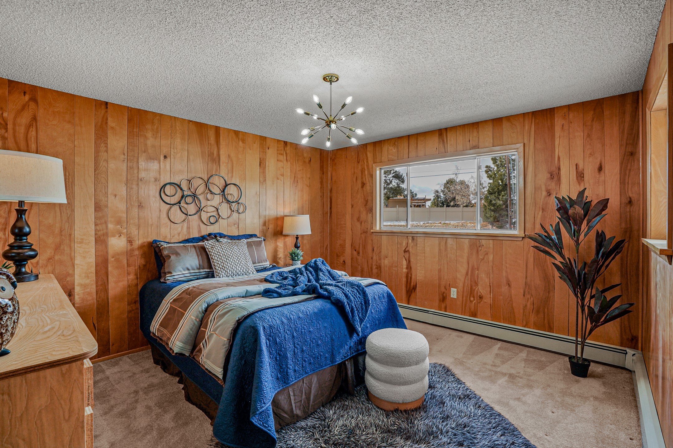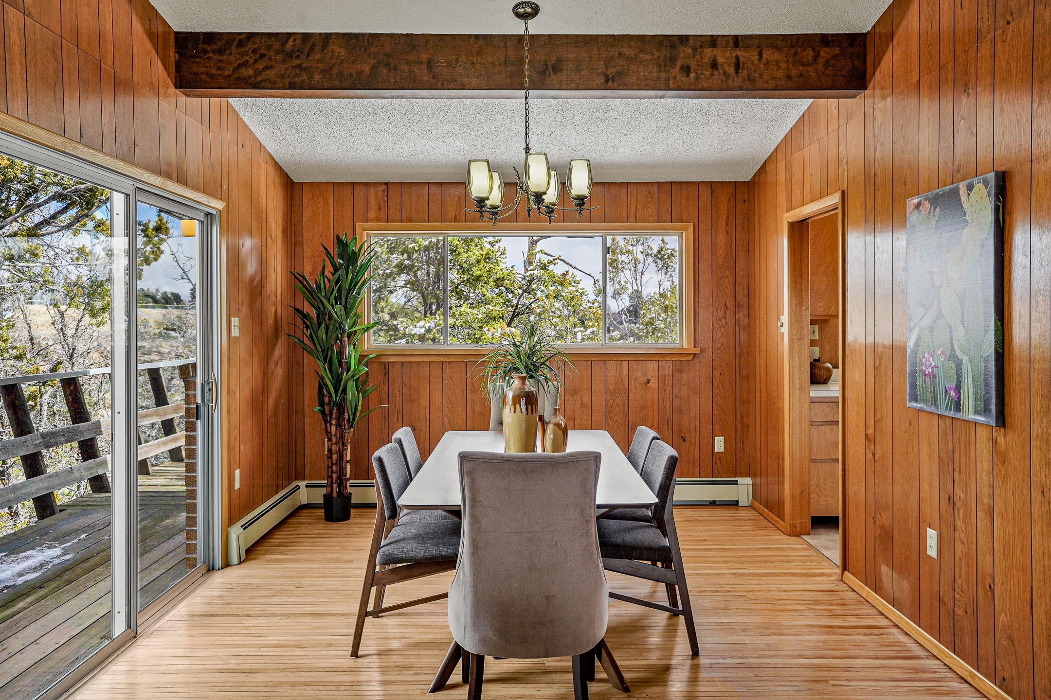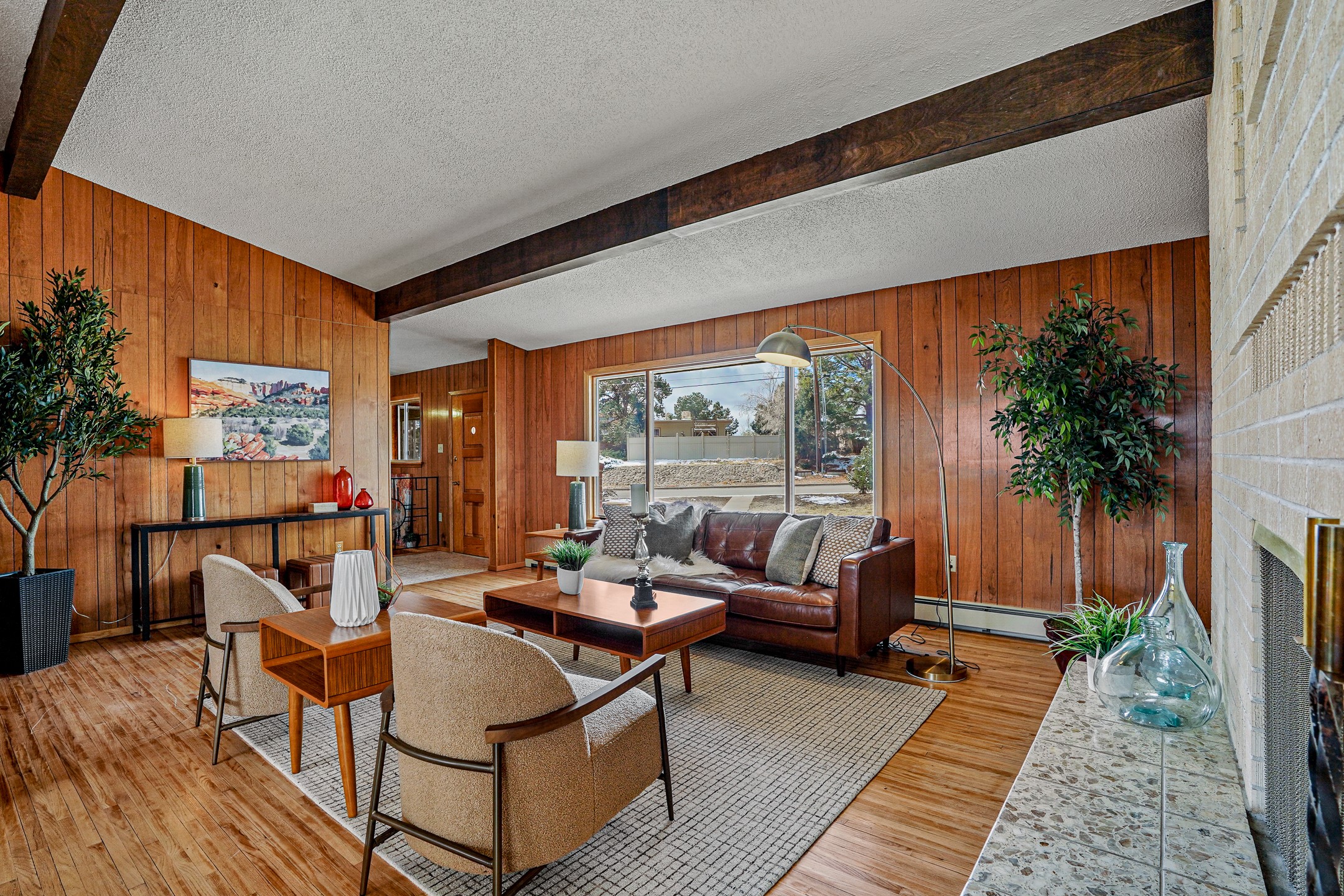 Brimming with vintage appeal and thoughtful details, this spacious 5-bedroom, 3-bathroom home strikes the perfect balance between retro charm and move-in-ready comfort. From the rich wood paneling to the stunning mid-century modern white brick fireplace, every corner tells a story. Vaulted ceilings with exposed beams create an airy sense of space, while large windows flood the home with natural light. Unique retro light fixtures add a fun, stylish flair, and the impeccably maintained interior offers a perfect canvas for your personal touch. Upstairs, you'll find three generously sized bedrooms and two full bathrooms, designed with functionality in mind. Downstairs, the walk-out basement expands your living space with two additional large bedrooms, a second cozy living area with its own fireplace, and a spacious laundry/utility room with ample storage--ideal for a workshop, craft space, or simply keeping things organized. Out back, enjoy the tranquility of open space with direct access to nearby trails and schools just minutes away. The yard boasts multiple fruit trees including apple, apricot and pear. Whether you're a mid-century enthusiast or simply looking for a solid, spacious home in a prime location, this one has the bones, the vibe, and the potential to make it truly yours.