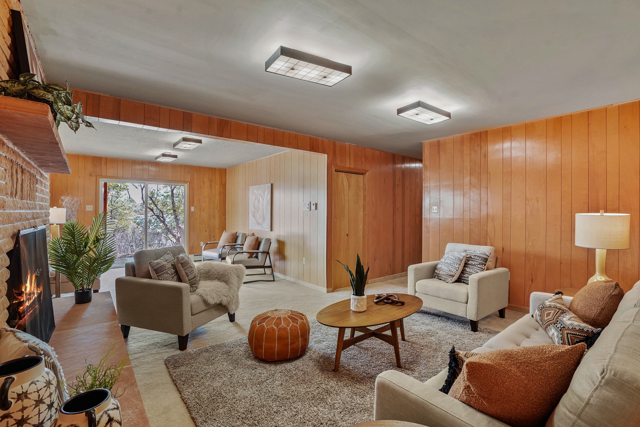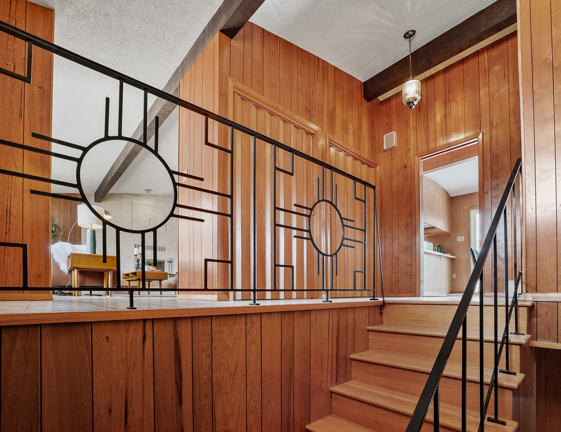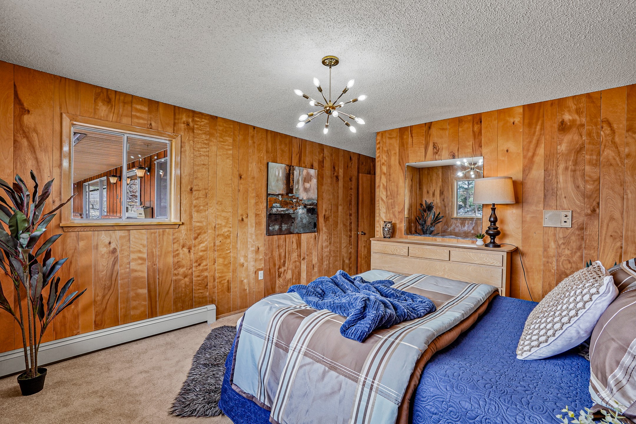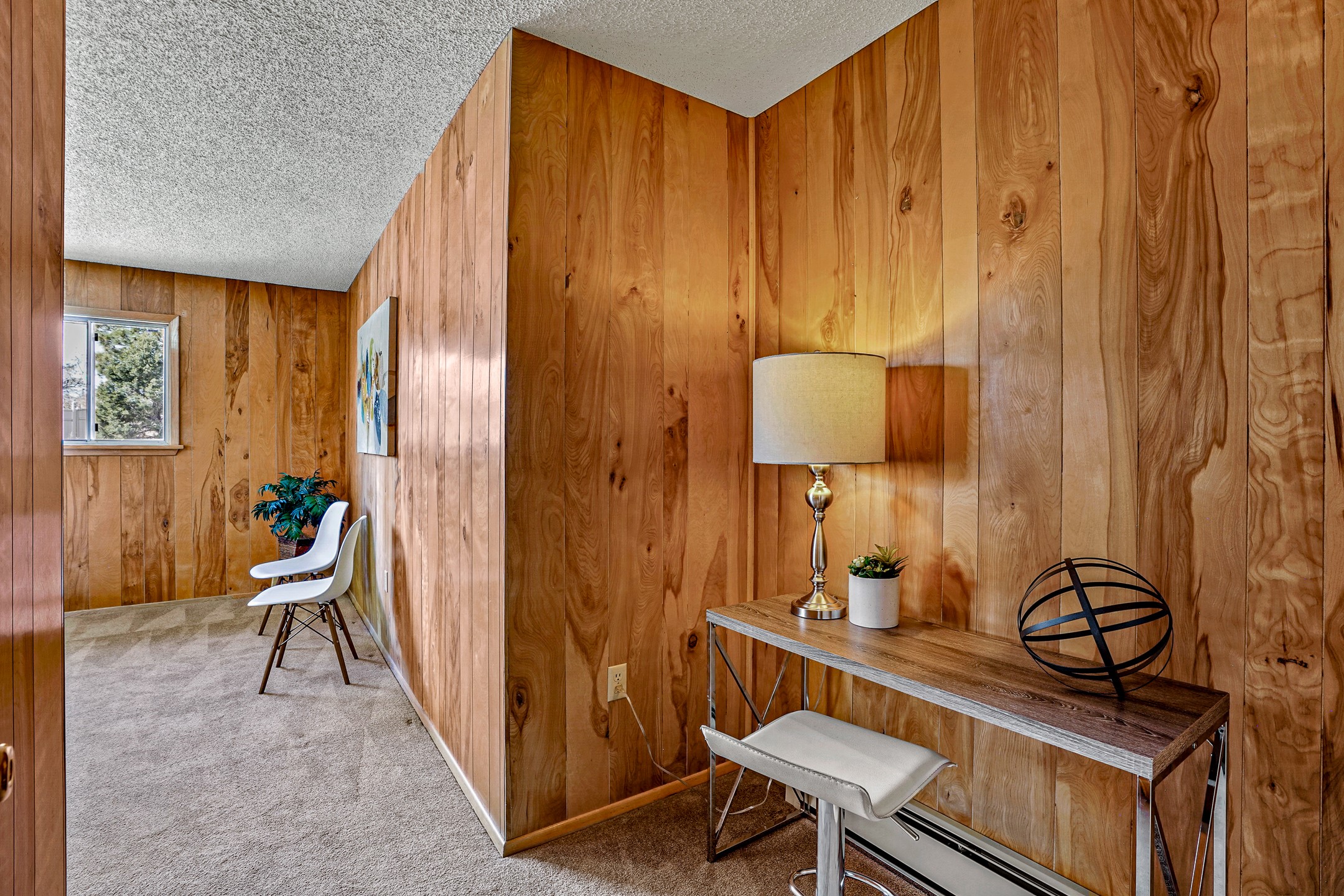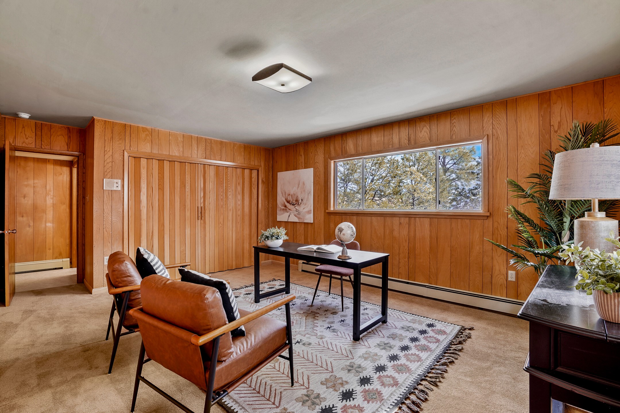 Brimming with vintage appeal and thoughtful details, this spacious 5-bedroom, 3-bathroom home strikes the perfect balance between retro charm and move-in-ready comfort. From the rich wood paneling to the stunning mid-century modern white brick fireplace, every corner tells a story. Vaulted ceilings with exposed beams create an airy sense of space, while large windows flood the home with natural light. Unique retro light fixtures add a fun, stylish flair, and the impeccably maintained interior offers a perfect canvas for your personal touch. Upstairs, you'll find three generously sized bedrooms and two full bathrooms, designed with functionality in mind. Downstairs, the walk-out basement expands your living space with two additional large bedrooms, a second cozy living area with its own fireplace, and a spacious laundry/utility room with ample storage--ideal for a workshop, craft space, or simply keeping things organized. Out back, enjoy the tranquility of open space with direct access to nearby trails and schools just minutes away. The yard boasts multiple fruit trees including apple, apricot and pear. Whether you're a mid-century enthusiast or simply looking for a solid, spacious home in a prime location, this one has the bones, the vibe, and the potential to make it truly yours.