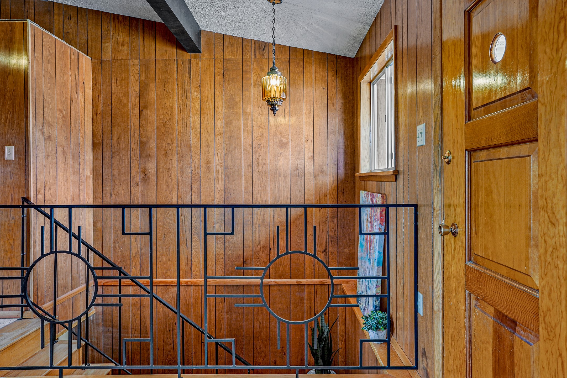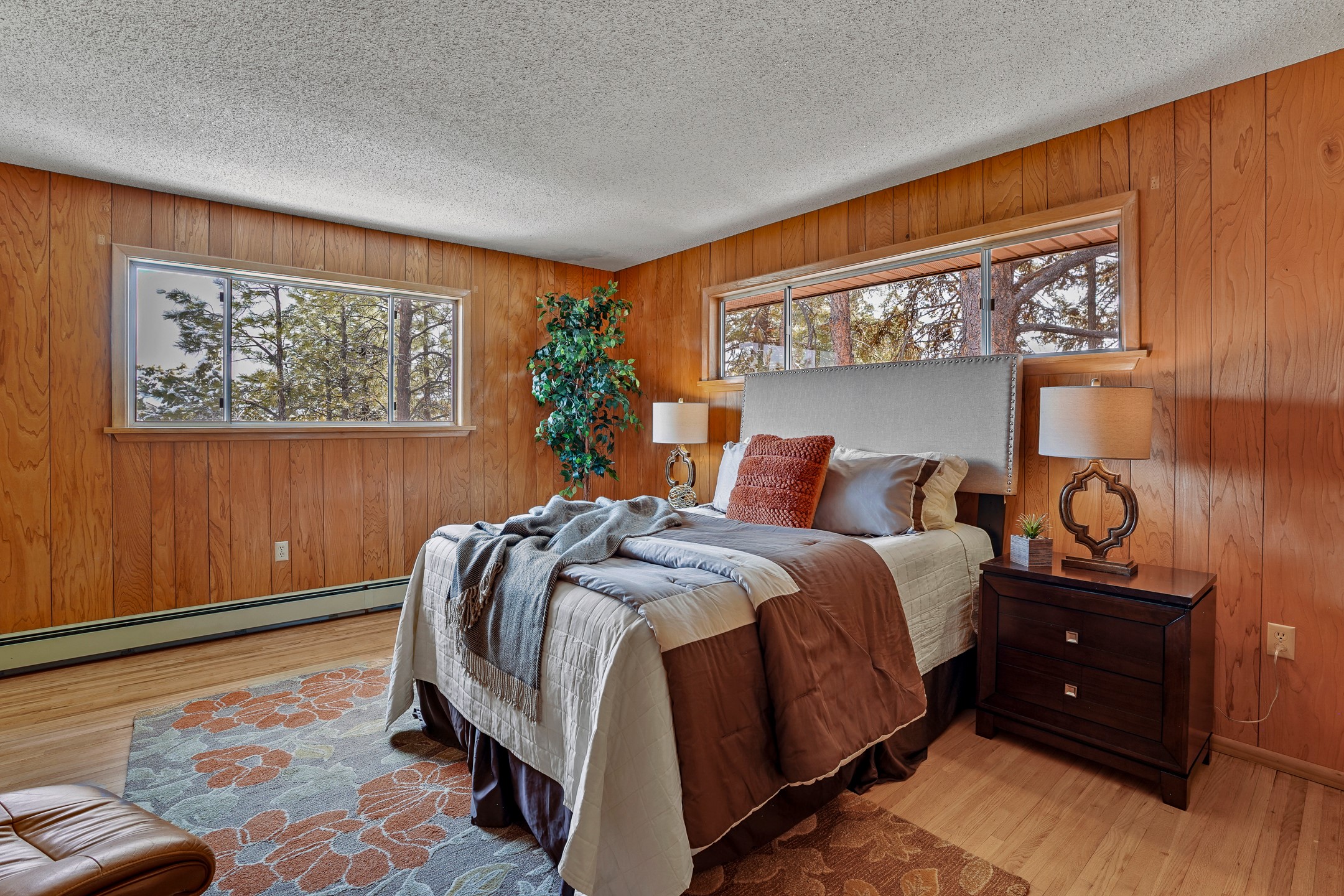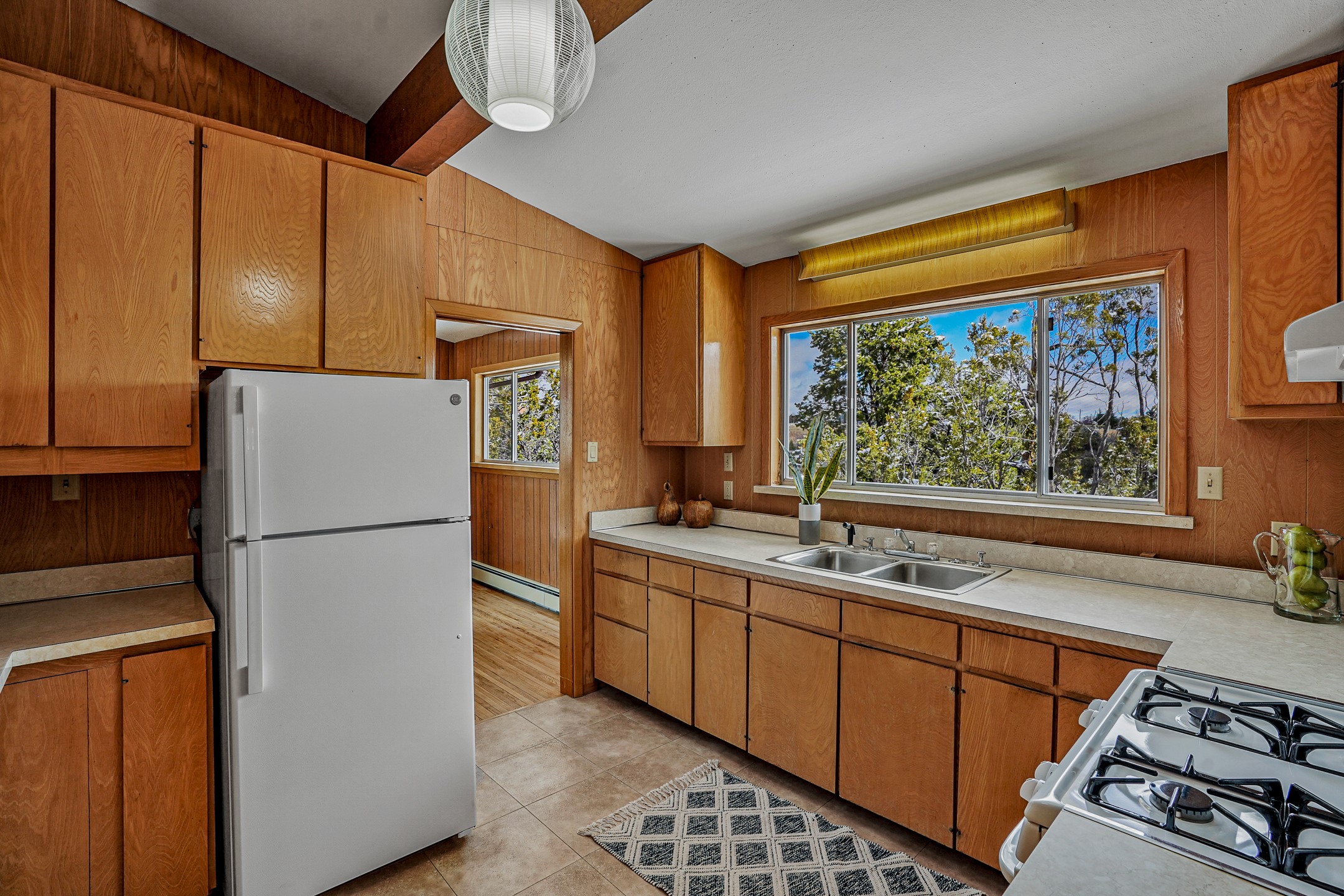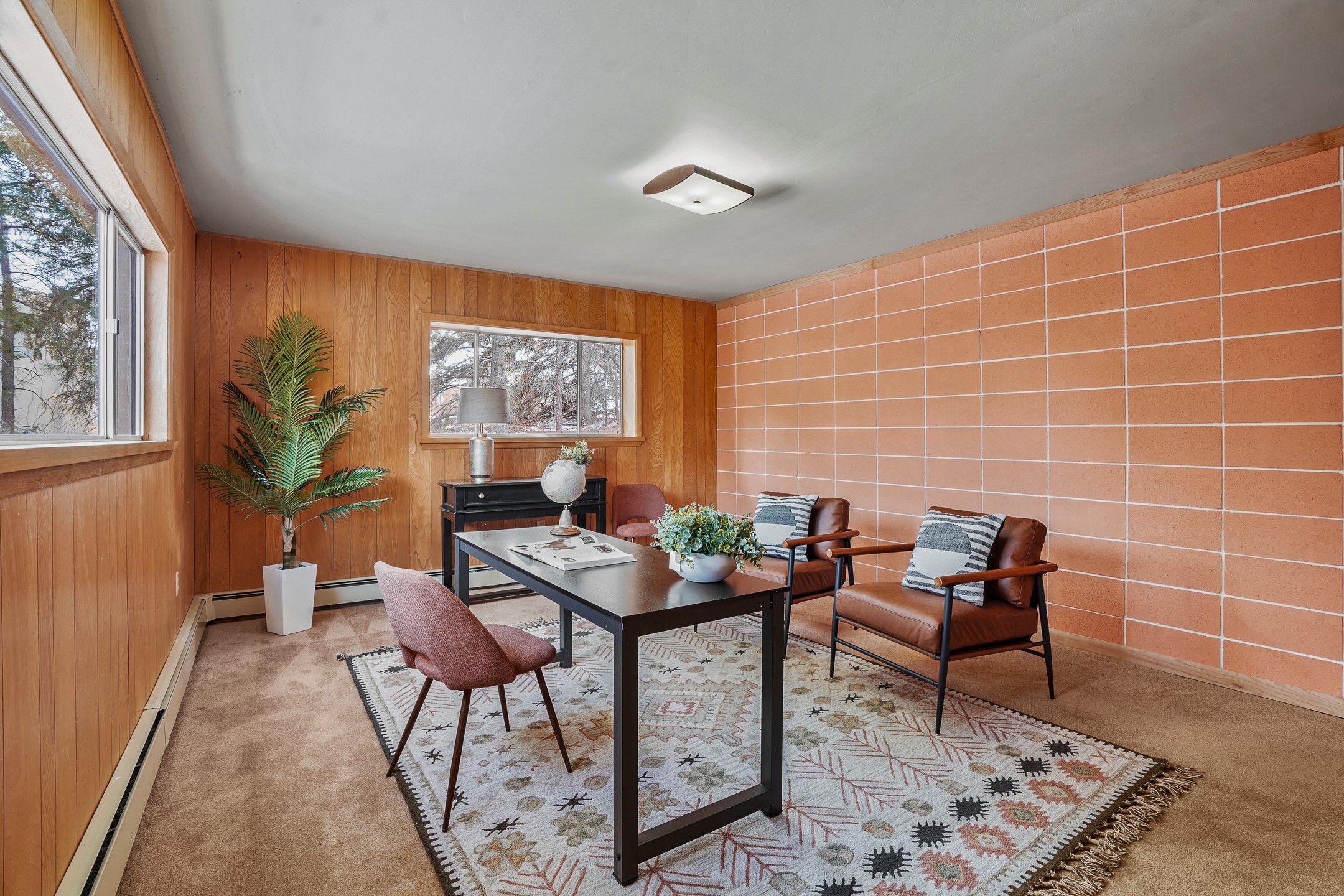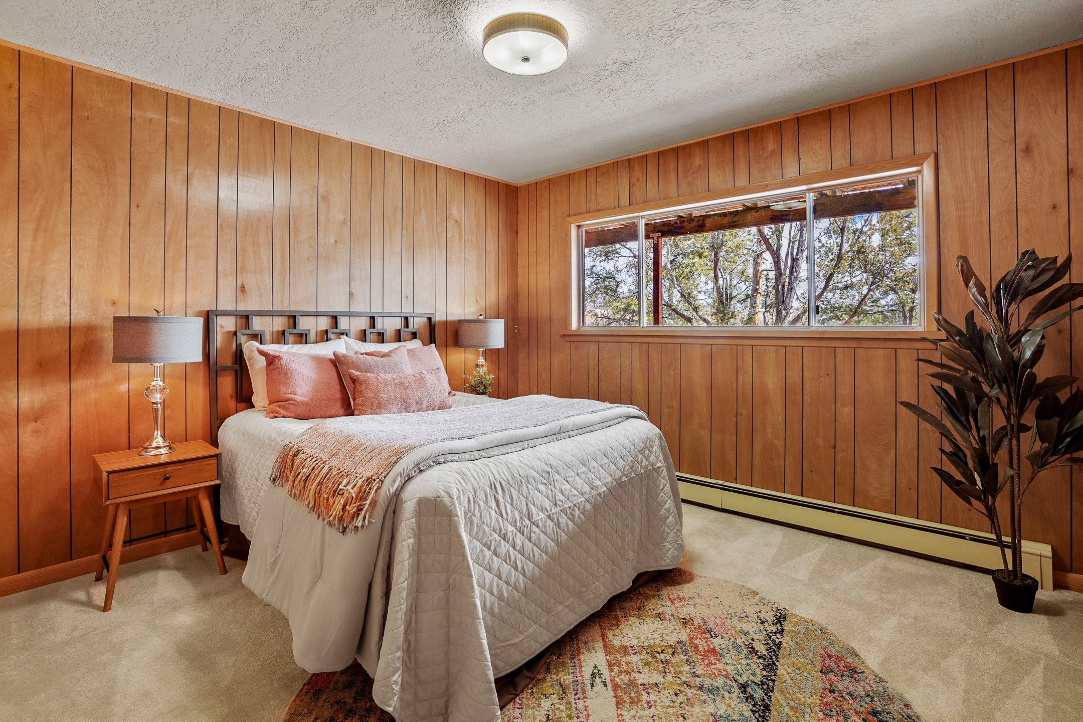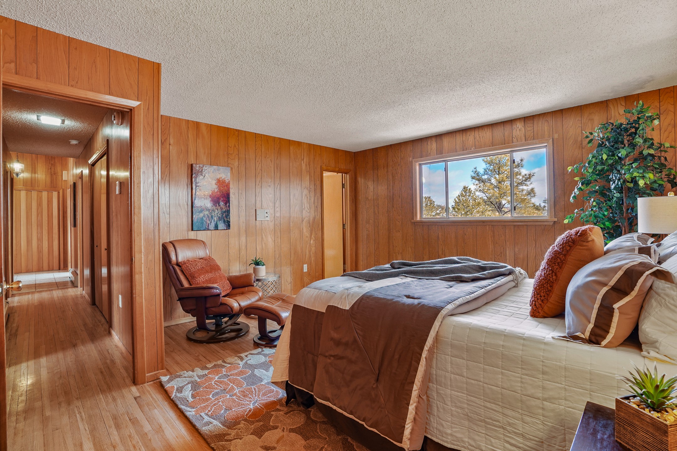Brimming with vintage appeal and thoughtful details, this spacious 5-bedroom, 3-bathroom home strikes the perfect balance between retro charm and move-in-ready comfort. From the rich wood paneling to the stunning mid-century modern white brick fireplace, every corner tells a story. Vaulted ceilings with exposed beams create an airy sense of space, while large windows flood the home with natural light. Unique retro light fixtures add a fun, stylish flair, and the impeccably maintained interior offers a perfect canvas for your personal touch. Upstairs, you'll find three generously sized bedrooms and two full bathrooms, designed with functionality in mind. Downstairs, the walk-out basement expands your living space with two additional large bedrooms, a second cozy living area with its own fireplace, and a spacious laundry/utility room with ample storage--ideal for a workshop, craft space, or simply keeping things organized. Out back, enjoy the tranquility of open space with direct access to nearby trails and schools just minutes away. The yard boasts multiple fruit trees including apple, apricot and pear. Whether you're a mid-century enthusiast or simply looking for a solid, spacious home in a prime location, this one has the bones, the vibe, and the potential to make it truly yours.