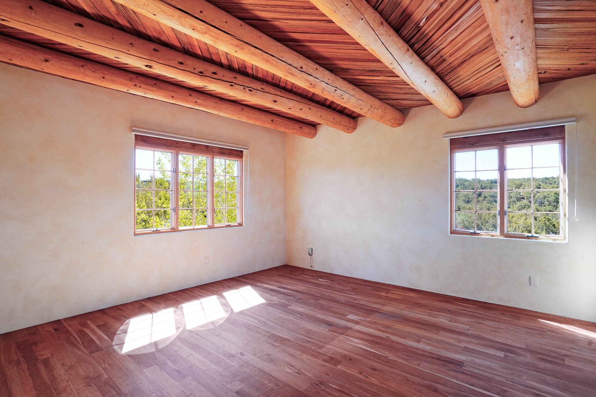 True to its name, 22 Loma Serena--"Serene Hill"--offers a peaceful hilltop retreat with some of the most breathtaking views in Santa Fe. Located in the desirable Tano Road area, this 2,508-square-foot home sits on 4.55 private acres, surrounded by pion trees and big New Mexico skies. You'll enjoy panoramic views of the Sangre de Cristos, Jemez Mountains, Badlands, and beyond all the way to Colorado. Built with classic Southwestern charm, the home features warm wood beams and vigas, colorful Talavera and Saltillo tile, beautiful hardwood floors, and cozy kiva fireplaces. The open floorplan flows easily and is filled with natural light. There are three spacious bedrooms, including two upstairs suites with private decks, and four bathrooms--one full and three baths--giving everyone space and privacy. The welcoming kitchen, bright living and dining areas, and large windows bring the outdoors in, while the Eastside flagstone patio is perfect for soaking up the crisp Santa Fe air. A gated courtyard, sunny stone patio, direct-entry one-car garage, and a private guest suite with its own entrance add even more flexibility and comfort. In addition the property was reroofed in 2019, new HVAC installed 2022 and re-stuccoed in 2023. Whether you're looking for a serene full-time home or a peaceful getaway to gather with family and friends, 22 Loma Serena is the kind of place that just feels good to come home to.