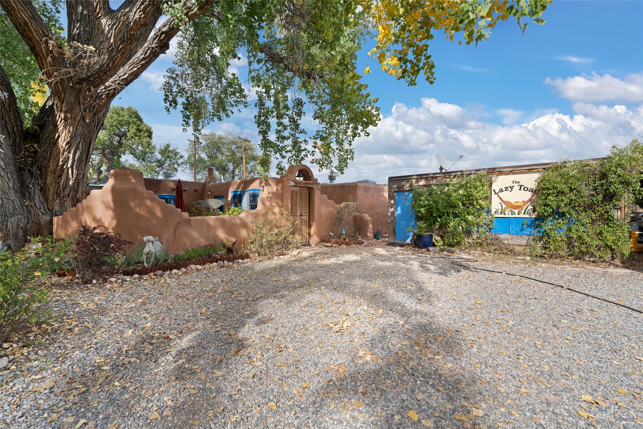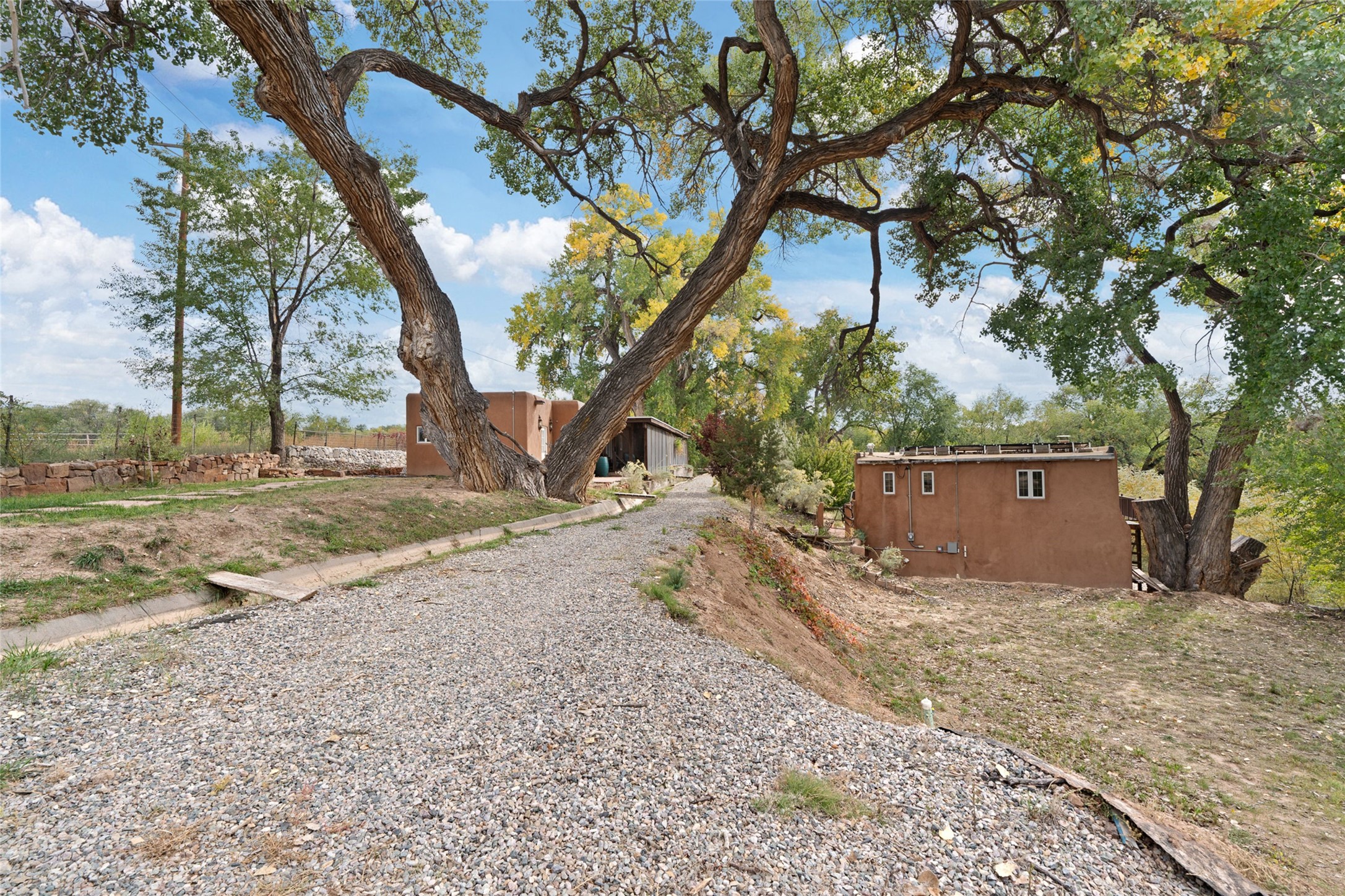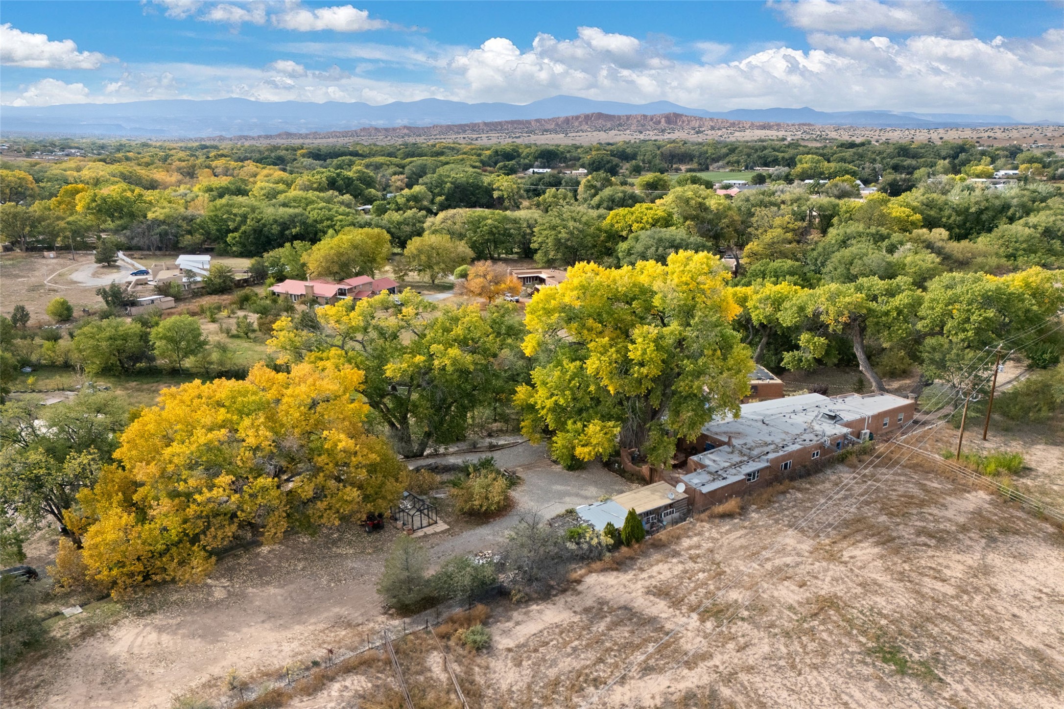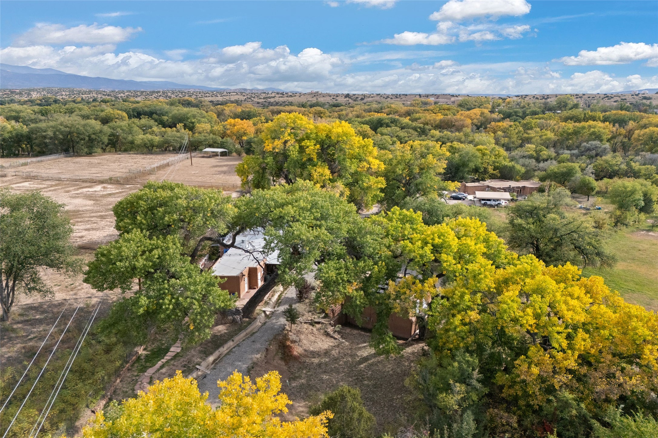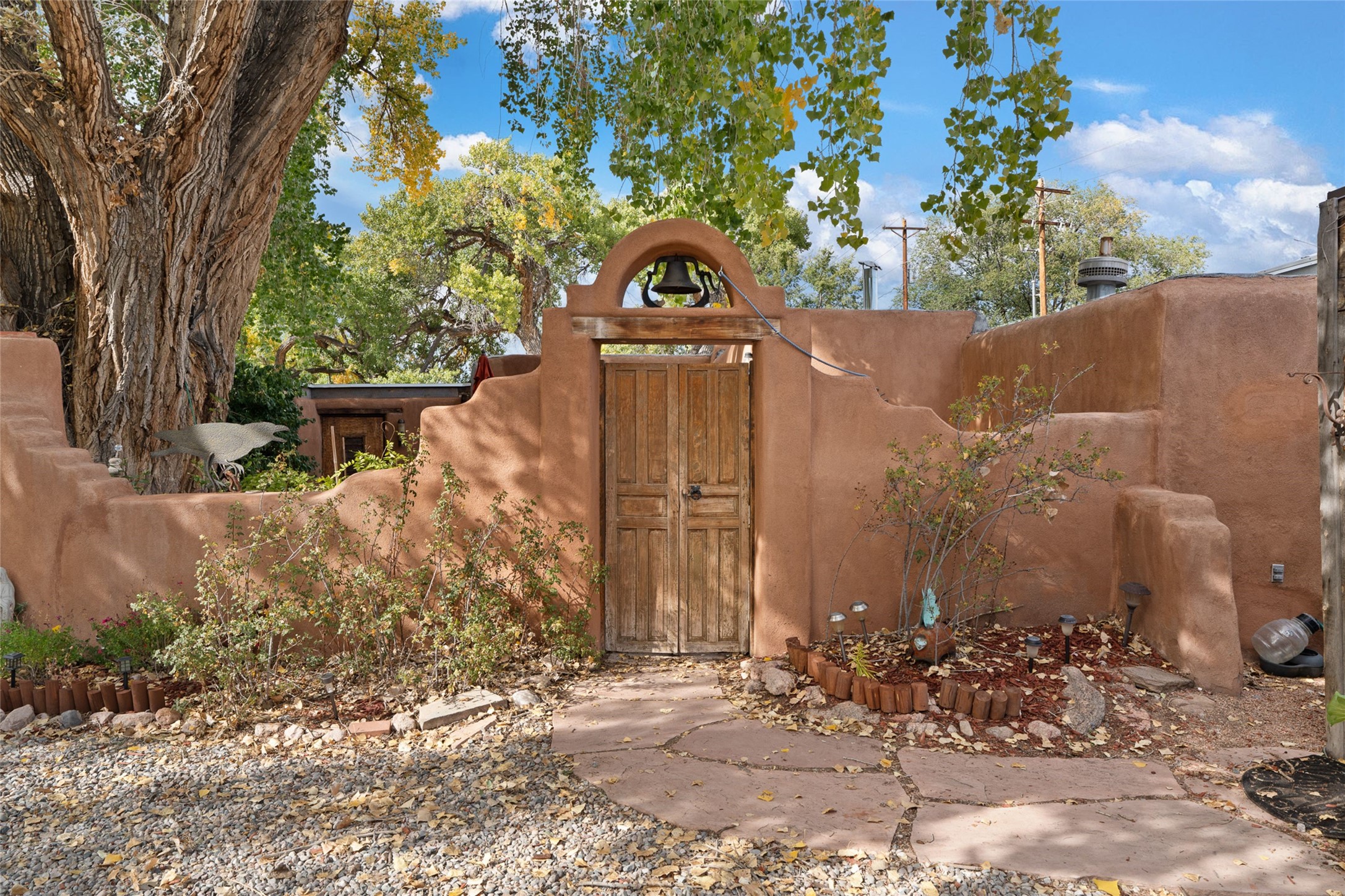 Located in the lush, idyllic area of Nambe, this authentic adobe home that embodies the charm of Santa Fe living. This captivating residence features two bedrooms and two bathrooms, alongside a detached and private one-bedroom, one-bath guest home. The home showcases iconic Santa Fe characteristics, including thick adobe walls that provide both insulation and a sense of warmth. The combination of wood and brick floors adds texture and depth to the interiors, while traditional nichos bring a unique artistic flair. The structure is enhanced by vigas and latillas, elements that reflect the rich architectural heritage of the region. Outdoor spaces abound, offering a variety of areas for relaxation and enjoyment. A walled courtyard serves as a secluded retreat, complete with an outdoor fireplace that sets the stage for cozy gatherings. The main living area opens to a deep view portal, providing sweeping vistas of the surrounding landscape and creating a seamless connection between indoor and outdoor living. The property is adorned with majestic cottonwood trees and lush native grasses, contributing to the serene ambiance. An acequia runs through the grounds, a testament to the area's agricultural roots and enhancing the natural beauty of this remarkable home. The blend of traditional architecture, stunning outdoor spaces, and a tranquil setting creates a unique sanctuary, perfect for those seeking an authentic New Mexico experience.