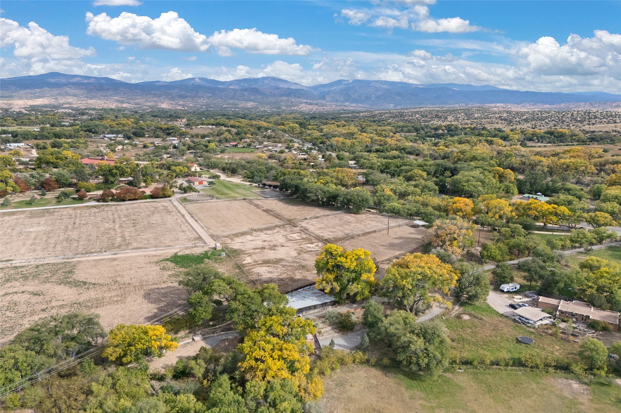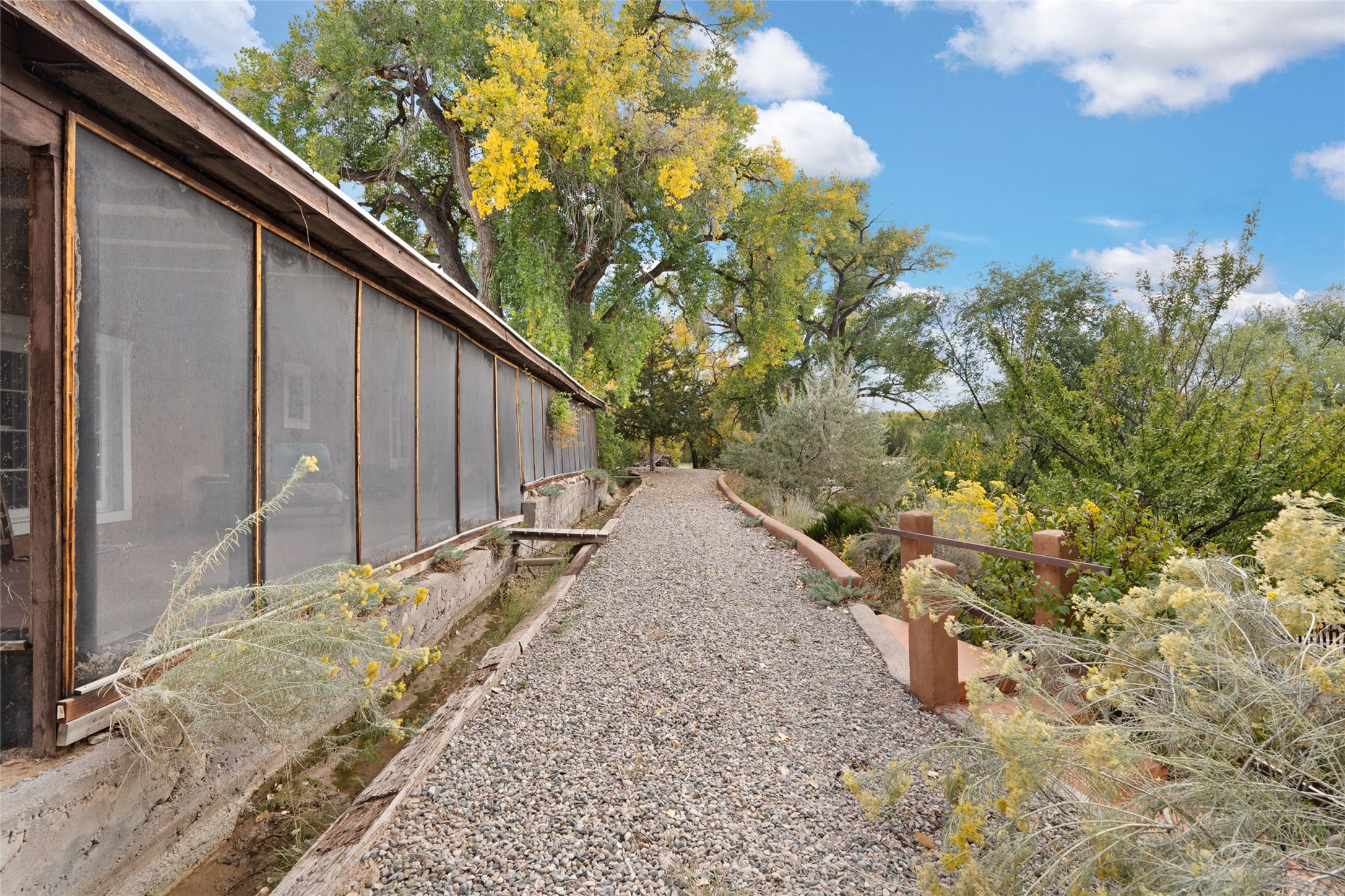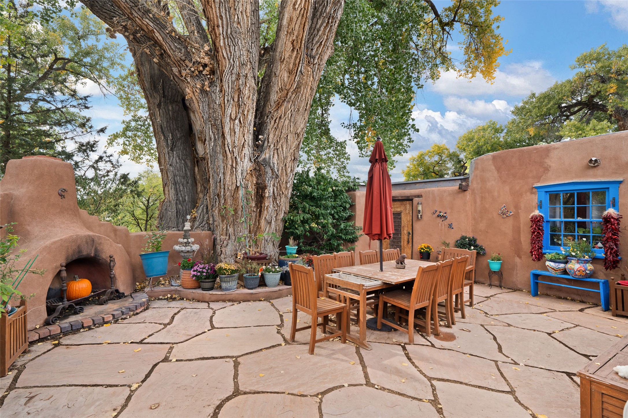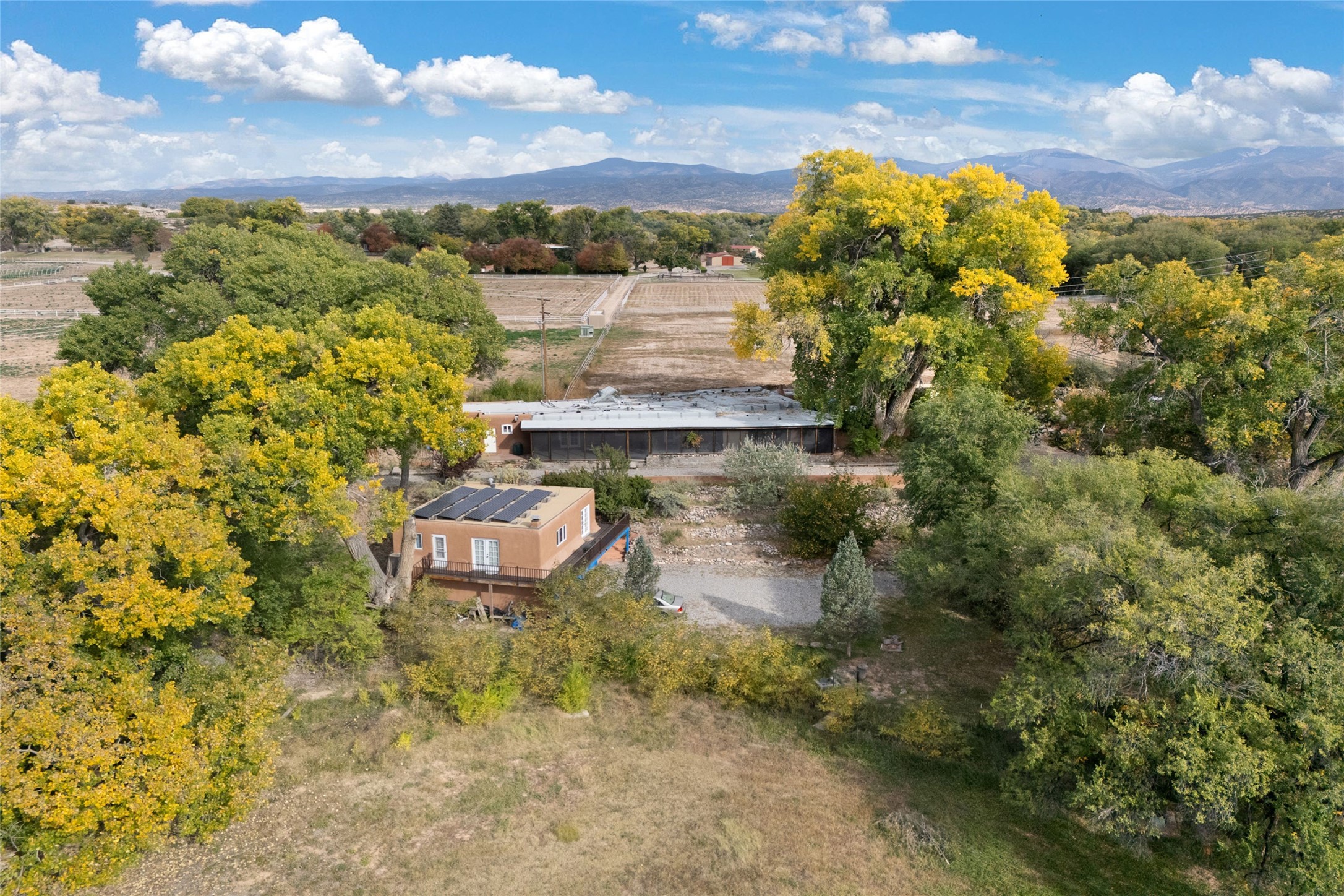 Located in the lush, idyllic area of Nambe, this authentic adobe home that embodies the charm of Santa Fe living. This captivating residence features two bedrooms and two bathrooms, alongside a detached and private one-bedroom, one-bath guest home. The home showcases iconic Santa Fe characteristics, including thick adobe walls that provide both insulation and a sense of warmth. The combination of wood and brick floors adds texture and depth to the interiors, while traditional nichos bring a unique artistic flair. The structure is enhanced by vigas and latillas, elements that reflect the rich architectural heritage of the region. Outdoor spaces abound, offering a variety of areas for relaxation and enjoyment. A walled courtyard serves as a secluded retreat, complete with an outdoor fireplace that sets the stage for cozy gatherings. The main living area opens to a deep view portal, providing sweeping vistas of the surrounding landscape and creating a seamless connection between indoor and outdoor living. The property is adorned with majestic cottonwood trees and lush native grasses, contributing to the serene ambiance. An acequia runs through the grounds, a testament to the area's agricultural roots and enhancing the natural beauty of this remarkable home. The blend of traditional architecture, stunning outdoor spaces, and a tranquil setting creates a unique sanctuary, perfect for those seeking an authentic New Mexico experience.