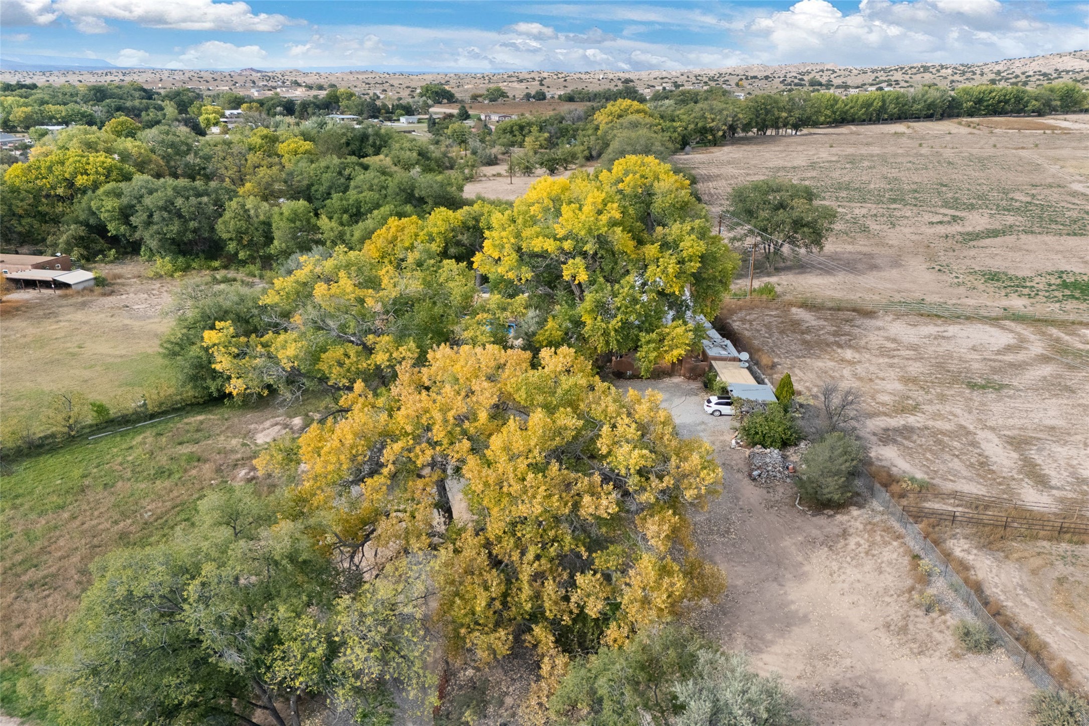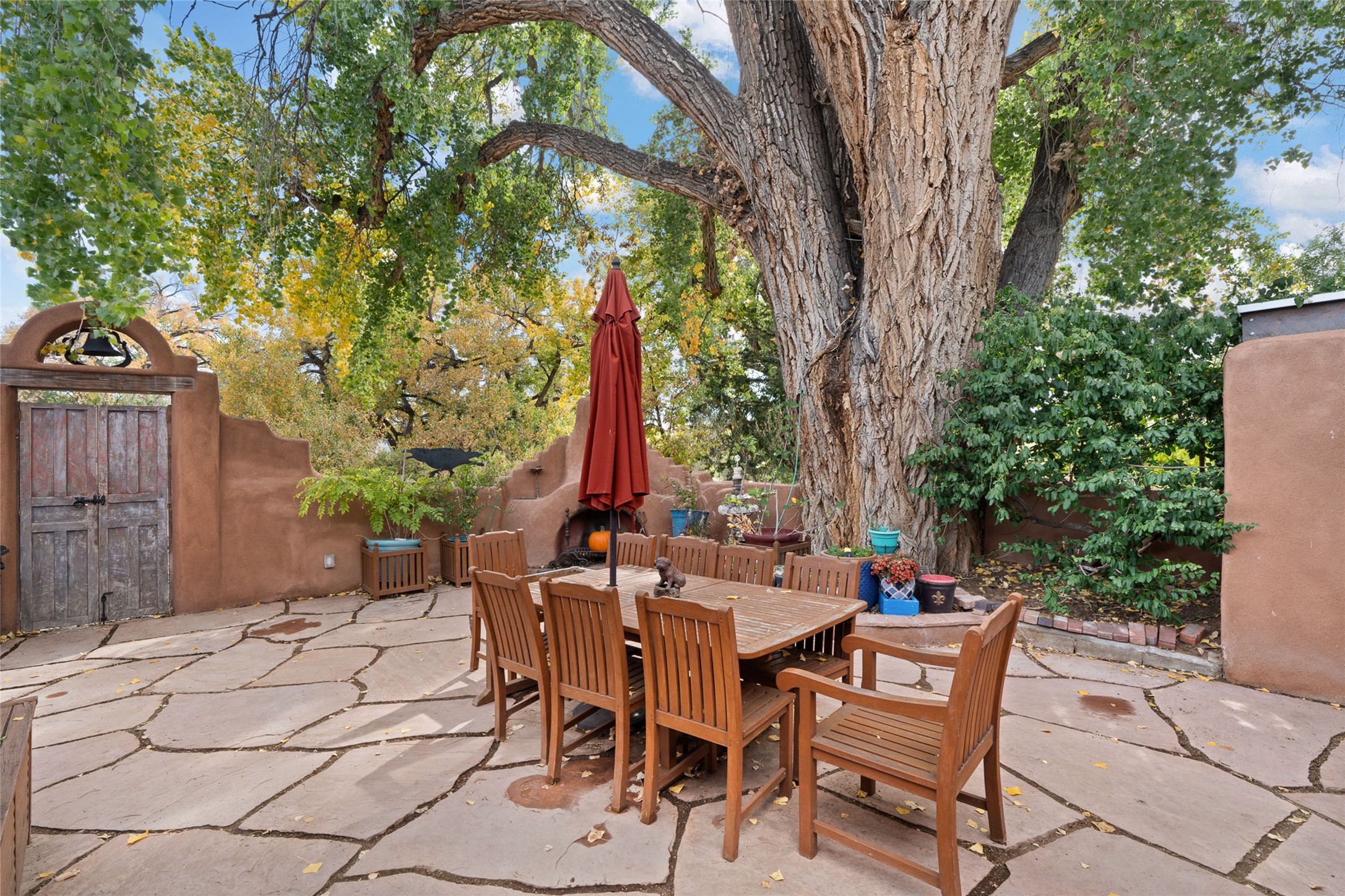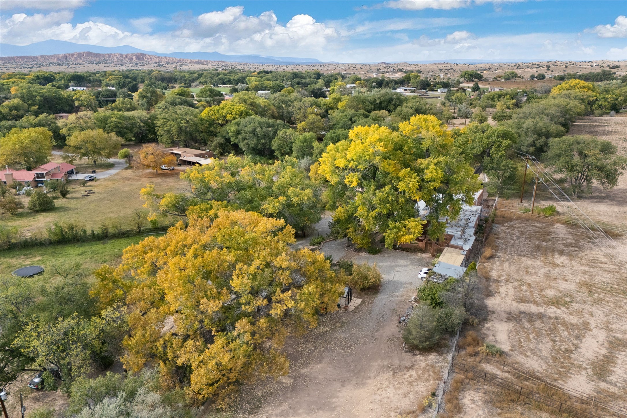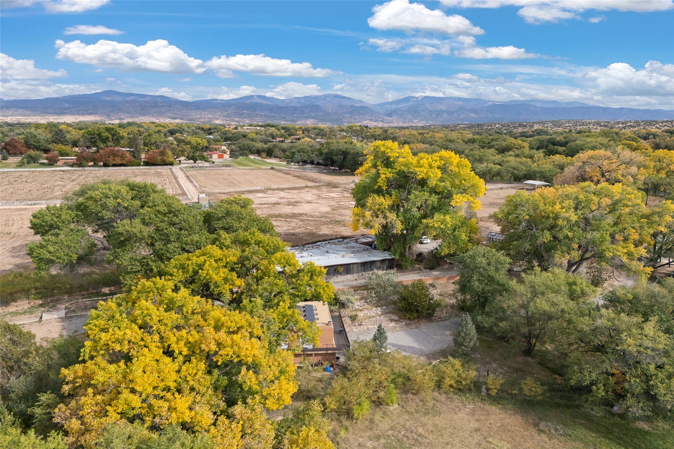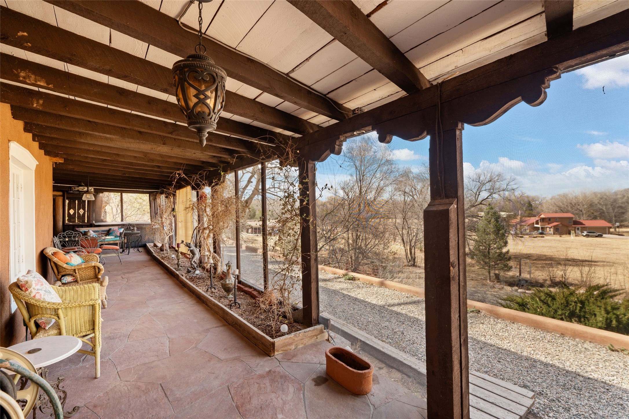 Located in the lush, idyllic area of Nambe, this authentic adobe home that embodies the charm of Santa Fe living. This captivating residence features two bedrooms and two bathrooms, alongside a detached and private one-bedroom, one-bath guest home. The home showcases iconic Santa Fe characteristics, including thick adobe walls that provide both insulation and a sense of warmth. The combination of wood and brick floors adds texture and depth to the interiors, while traditional nichos bring a unique artistic flair. The structure is enhanced by vigas and latillas, elements that reflect the rich architectural heritage of the region. Outdoor spaces abound, offering a variety of areas for relaxation and enjoyment. A walled courtyard serves as a secluded retreat, complete with an outdoor fireplace that sets the stage for cozy gatherings. The main living area opens to a deep view portal, providing sweeping vistas of the surrounding landscape and creating a seamless connection between indoor and outdoor living. The property is adorned with majestic cottonwood trees and lush native grasses, contributing to the serene ambiance. An acequia runs through the grounds, a testament to the area's agricultural roots and enhancing the natural beauty of this remarkable home. The blend of traditional architecture, stunning outdoor spaces, and a tranquil setting creates a unique sanctuary, perfect for those seeking an authentic New Mexico experience.