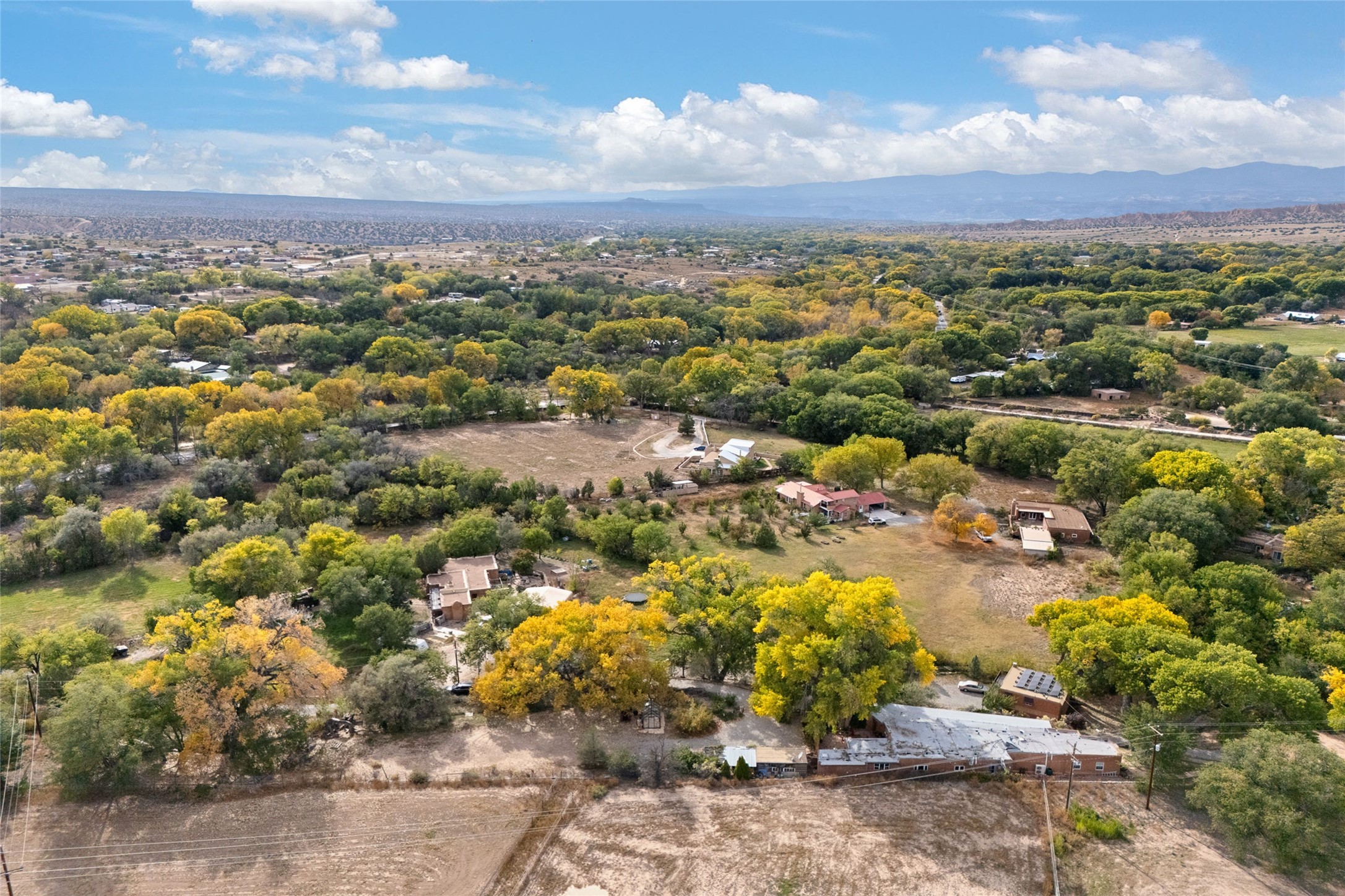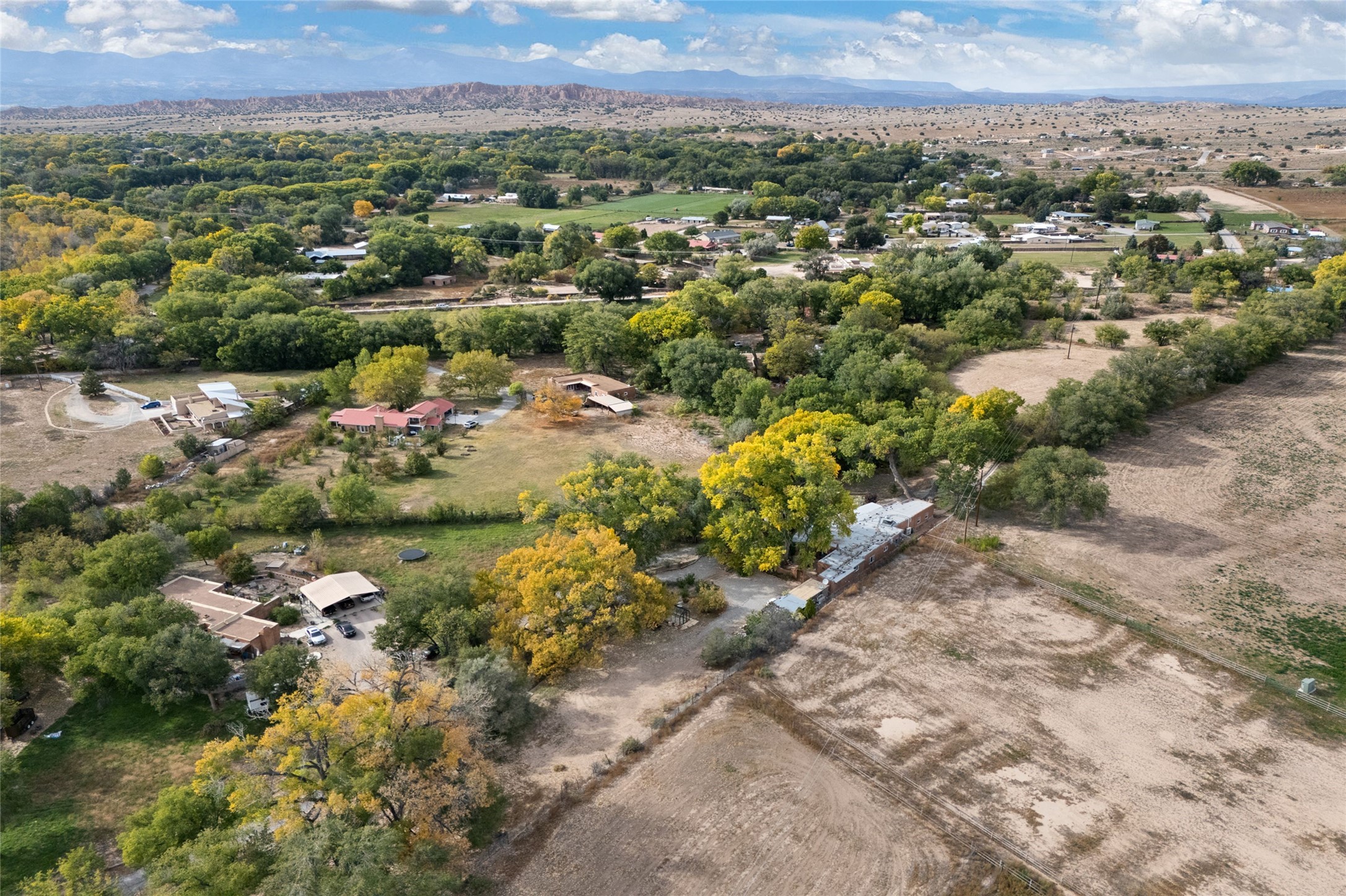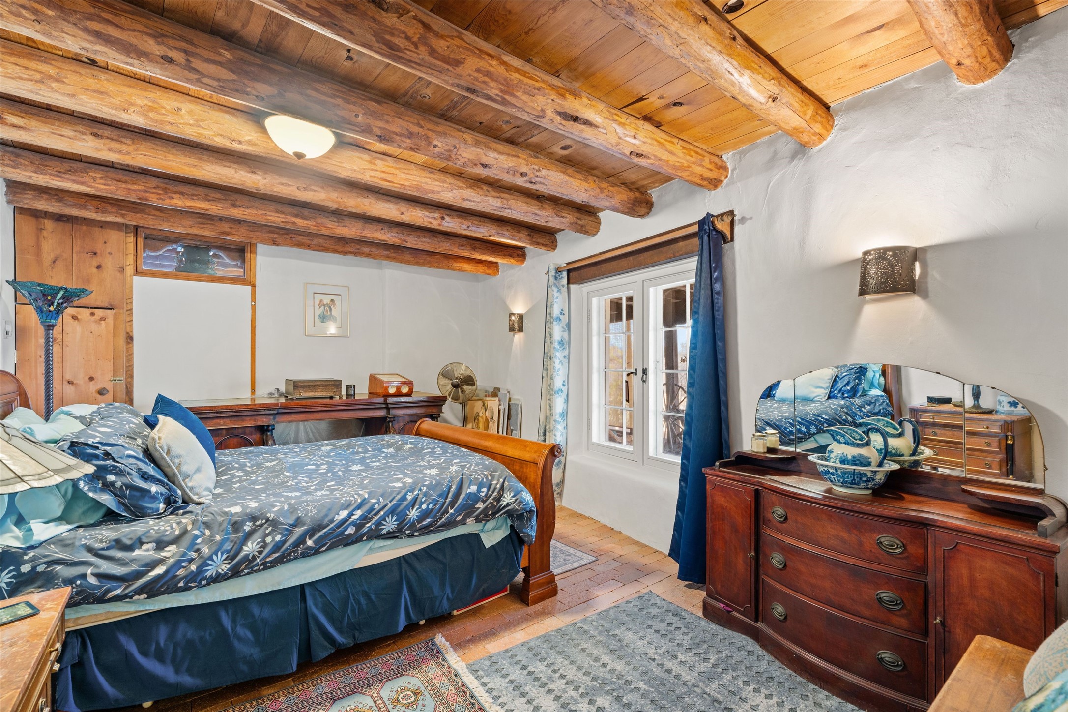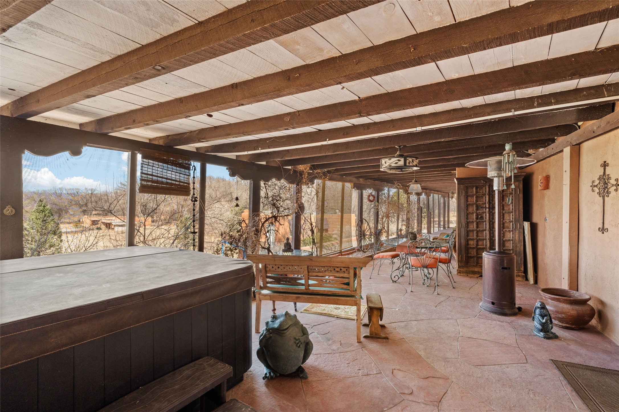 Located in the lush, idyllic area of Nambe, this authentic adobe home that embodies the charm of Santa Fe living. This captivating residence features two bedrooms and two bathrooms, alongside a detached and private one-bedroom, one-bath guest home. The home showcases iconic Santa Fe characteristics, including thick adobe walls that provide both insulation and a sense of warmth. The combination of wood and brick floors adds texture and depth to the interiors, while traditional nichos bring a unique artistic flair. The structure is enhanced by vigas and latillas, elements that reflect the rich architectural heritage of the region. Outdoor spaces abound, offering a variety of areas for relaxation and enjoyment. A walled courtyard serves as a secluded retreat, complete with an outdoor fireplace that sets the stage for cozy gatherings. The main living area opens to a deep view portal, providing sweeping vistas of the surrounding landscape and creating a seamless connection between indoor and outdoor living. The property is adorned with majestic cottonwood trees and lush native grasses, contributing to the serene ambiance. An acequia runs through the grounds, a testament to the area's agricultural roots and enhancing the natural beauty of this remarkable home. The blend of traditional architecture, stunning outdoor spaces, and a tranquil setting creates a unique sanctuary, perfect for those seeking an authentic New Mexico experience.