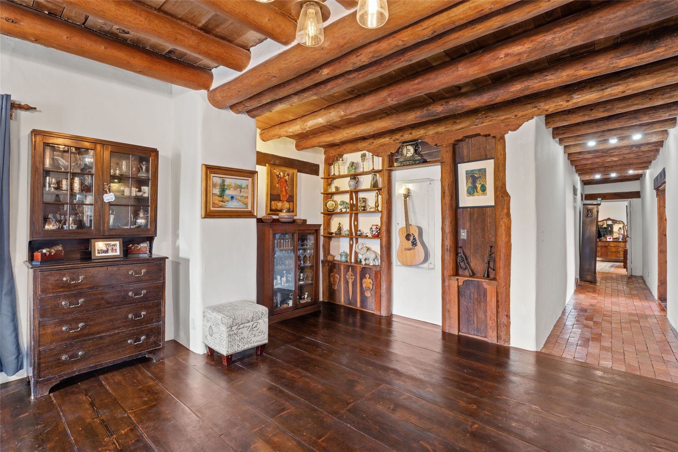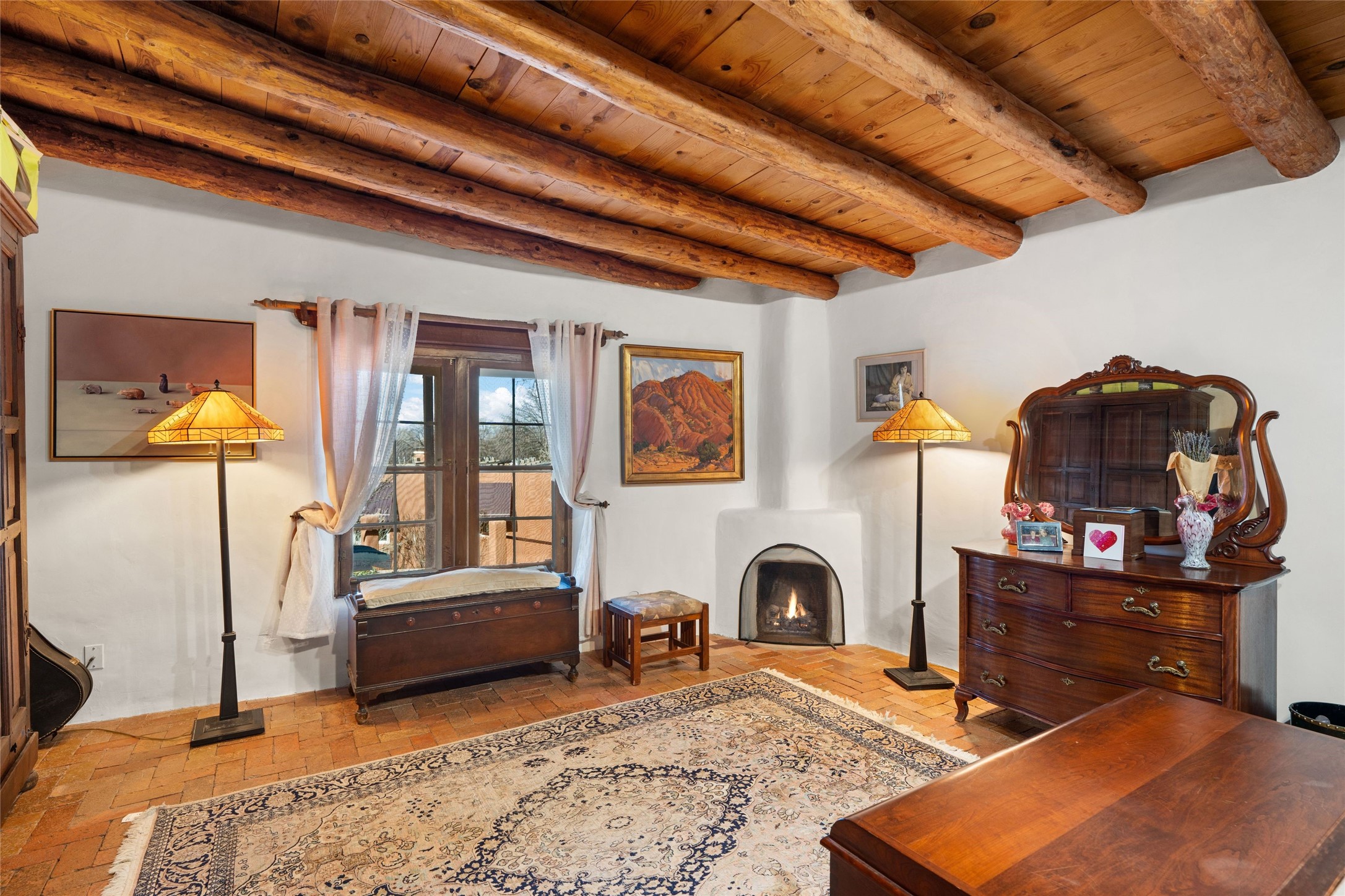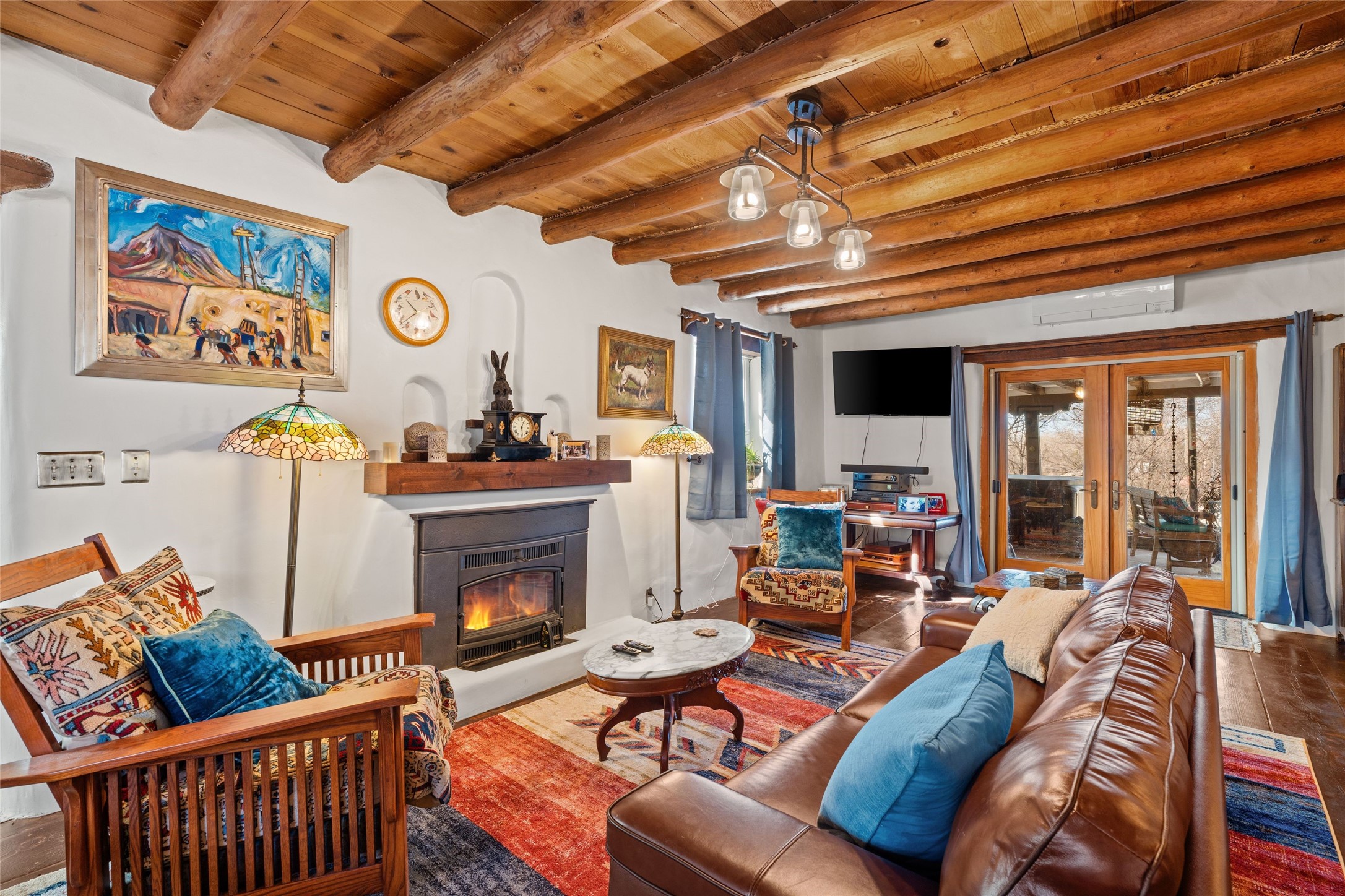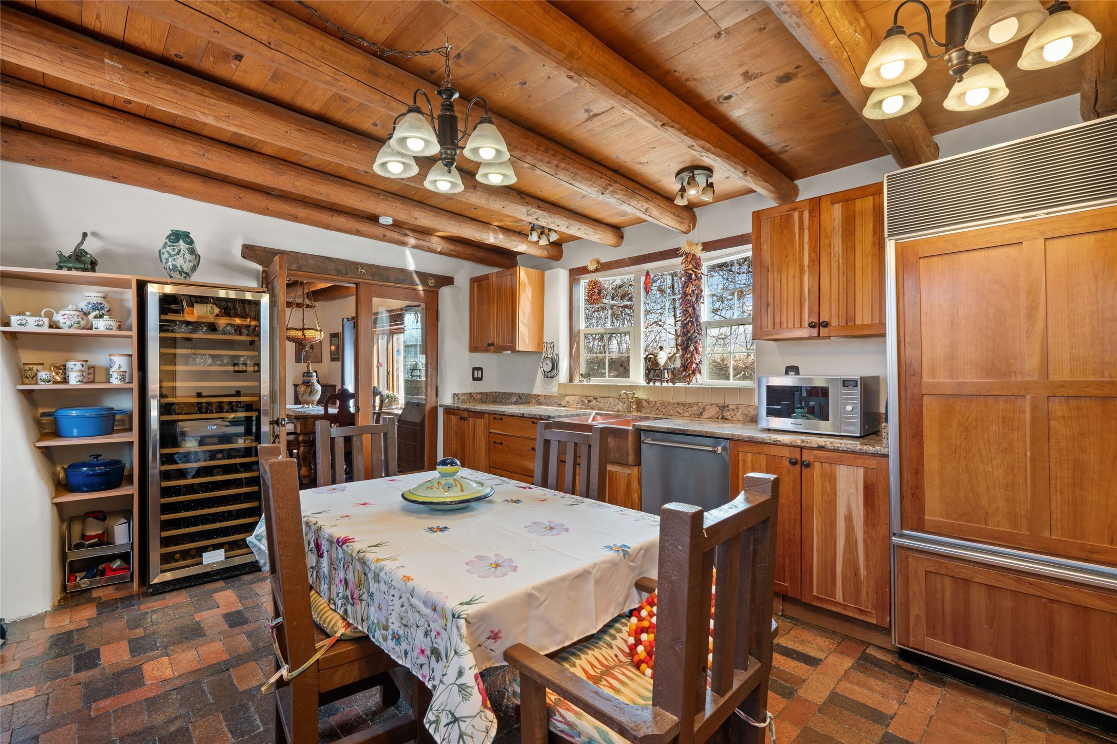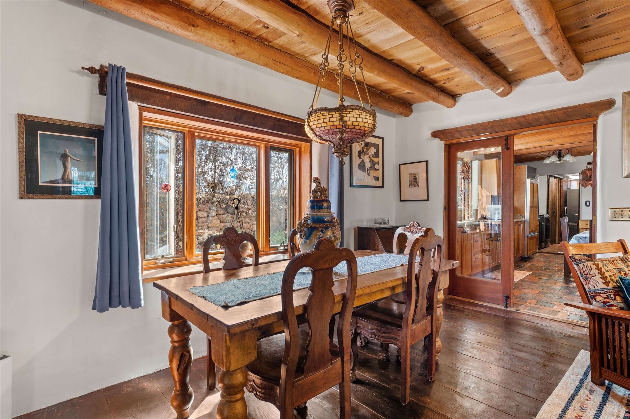 Located in the lush, idyllic area of Nambe, this authentic adobe home that embodies the charm of Santa Fe living. This captivating residence features two bedrooms and two bathrooms, alongside a detached and private one-bedroom, one-bath guest home. The home showcases iconic Santa Fe characteristics, including thick adobe walls that provide both insulation and a sense of warmth. The combination of wood and brick floors adds texture and depth to the interiors, while traditional nichos bring a unique artistic flair. The structure is enhanced by vigas and latillas, elements that reflect the rich architectural heritage of the region. Outdoor spaces abound, offering a variety of areas for relaxation and enjoyment. A walled courtyard serves as a secluded retreat, complete with an outdoor fireplace that sets the stage for cozy gatherings. The main living area opens to a deep view portal, providing sweeping vistas of the surrounding landscape and creating a seamless connection between indoor and outdoor living. The property is adorned with majestic cottonwood trees and lush native grasses, contributing to the serene ambiance. An acequia runs through the grounds, a testament to the area's agricultural roots and enhancing the natural beauty of this remarkable home. The blend of traditional architecture, stunning outdoor spaces, and a tranquil setting creates a unique sanctuary, perfect for those seeking an authentic New Mexico experience.