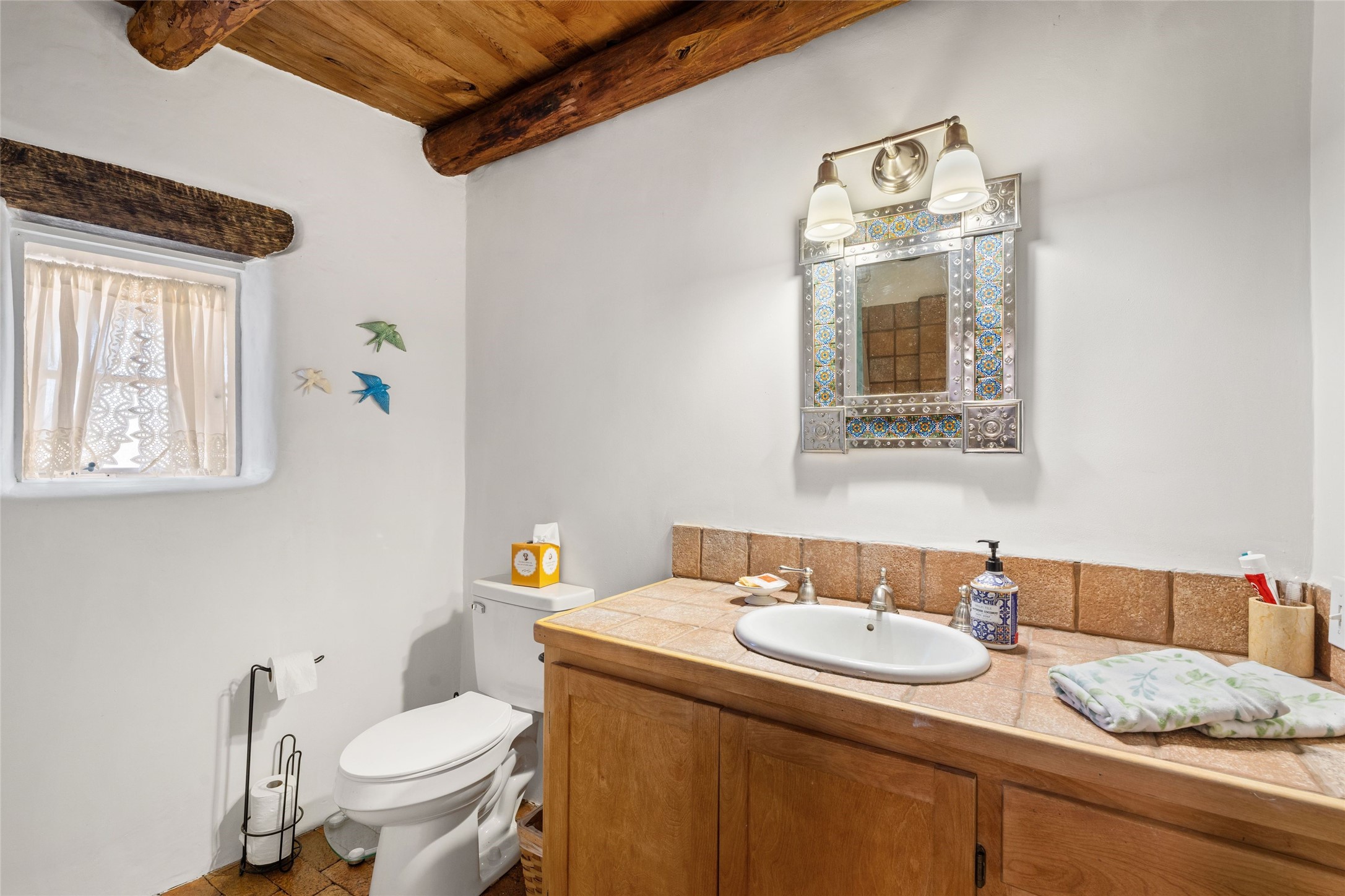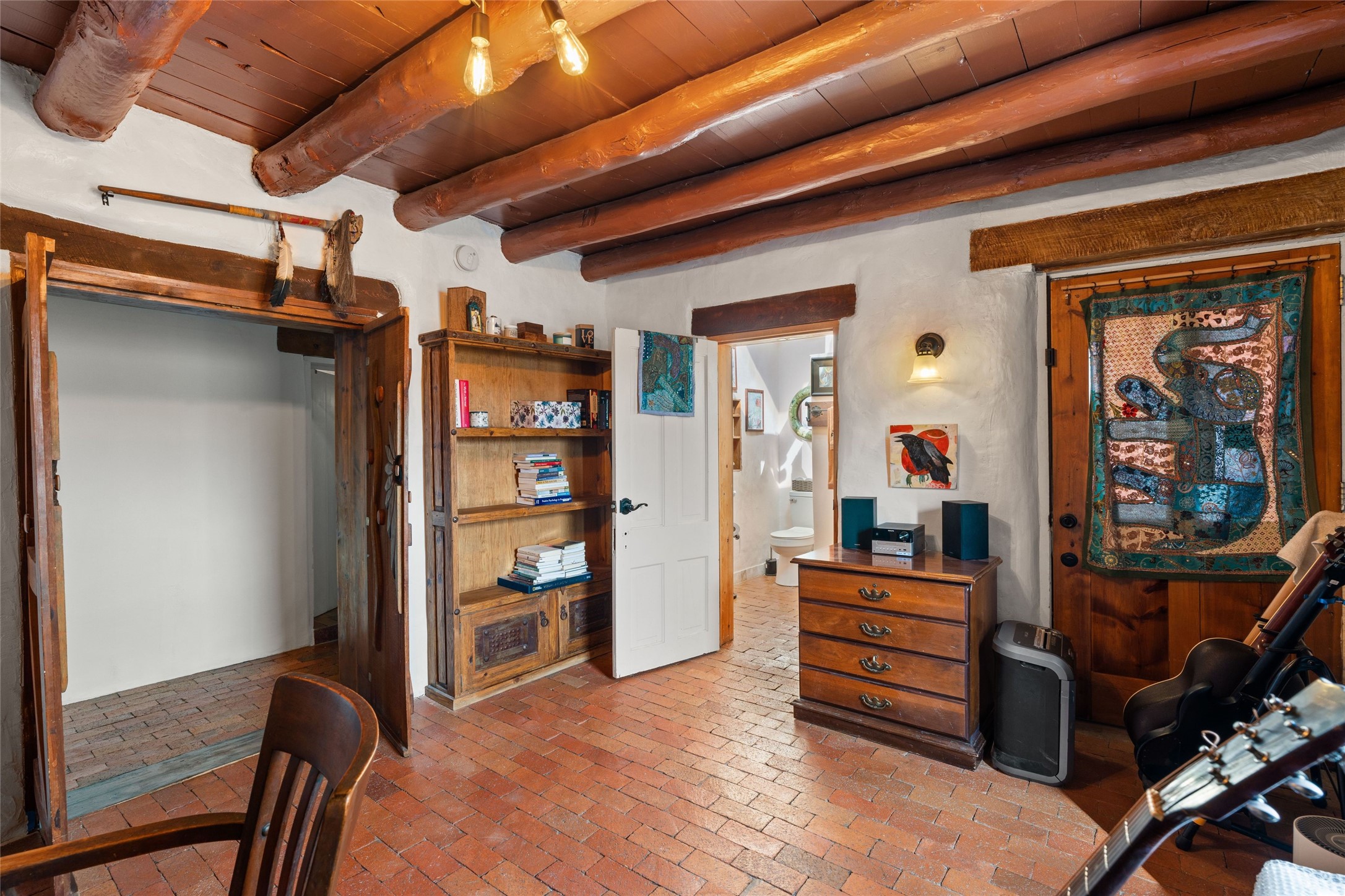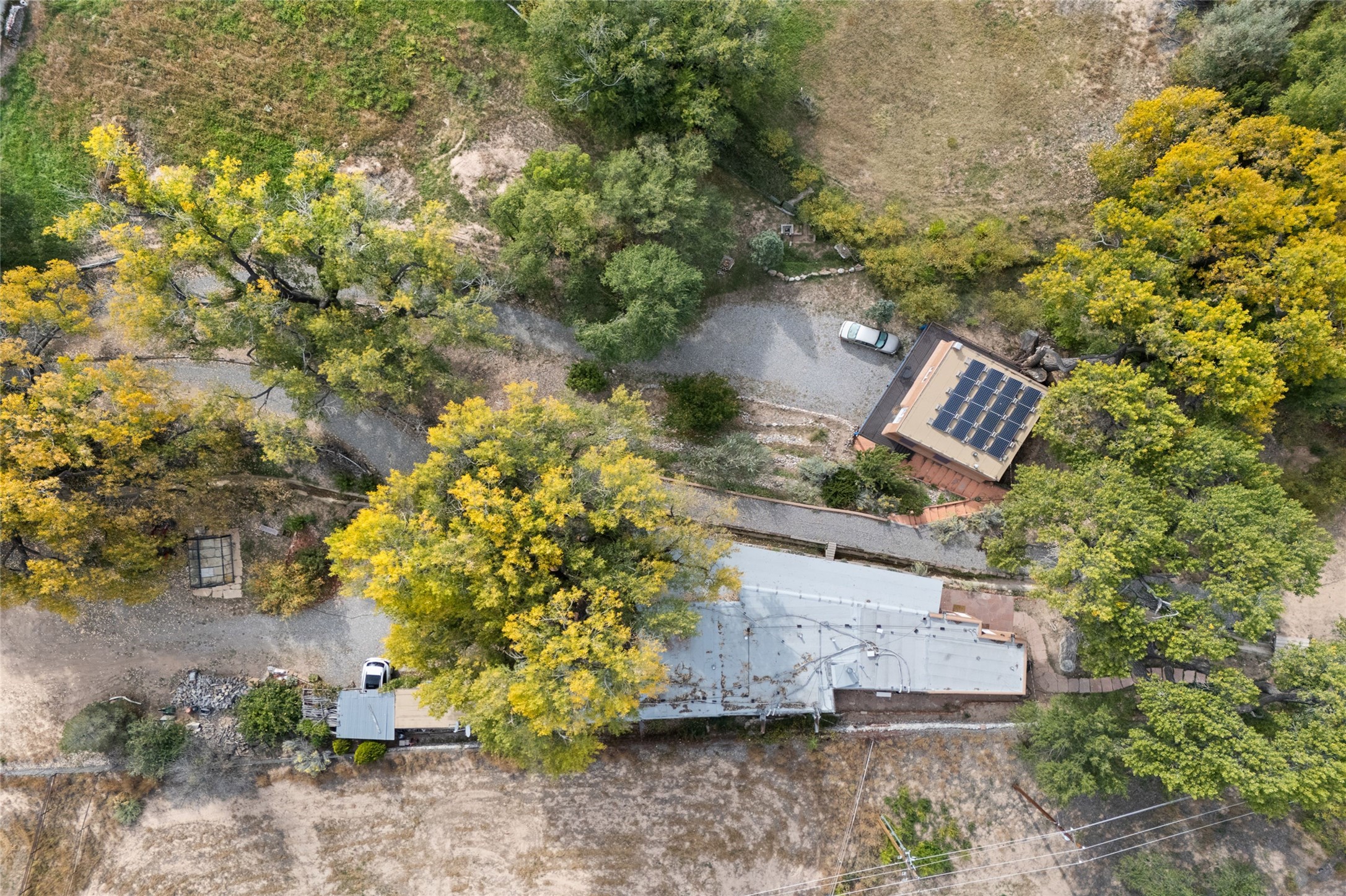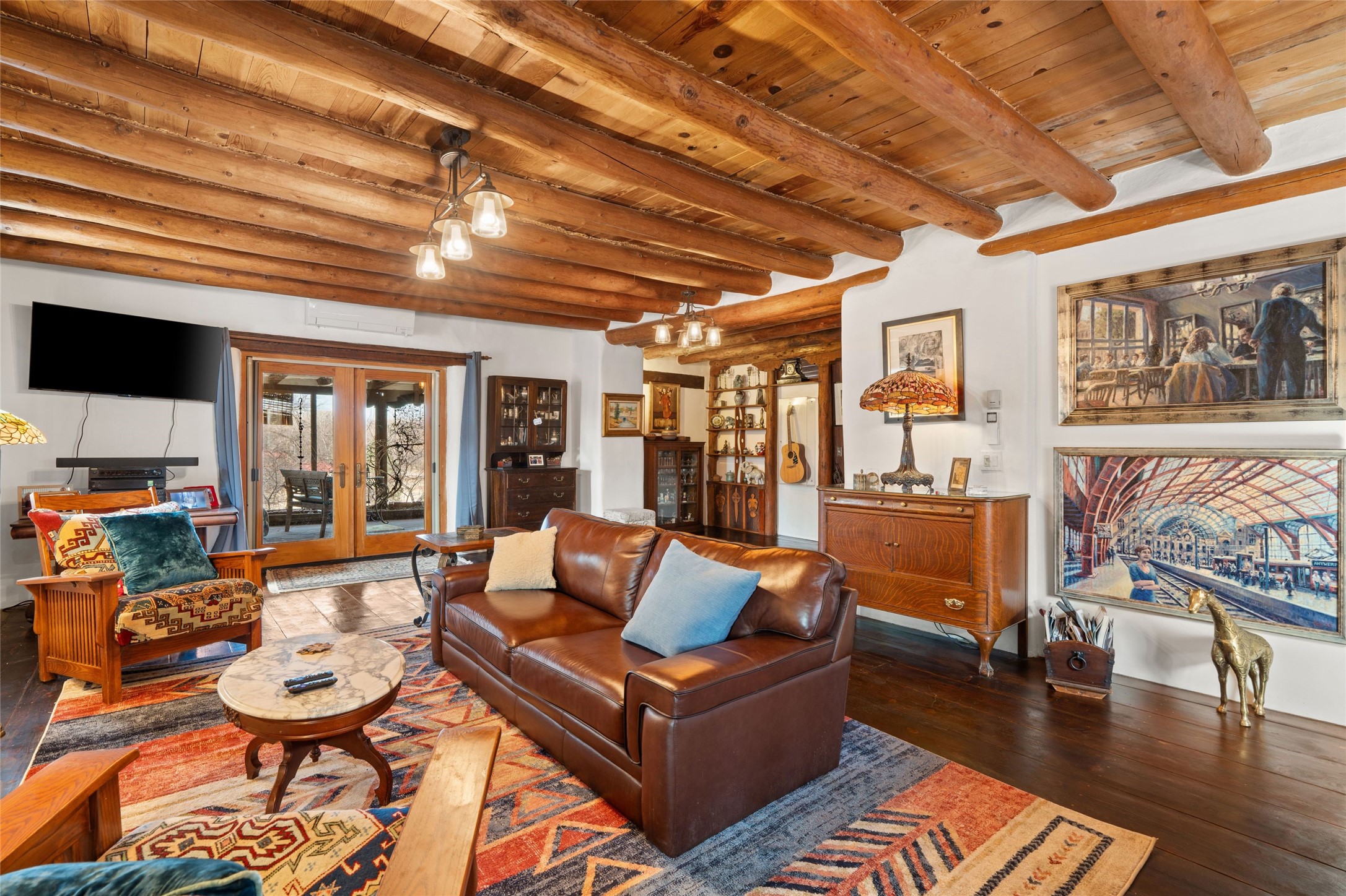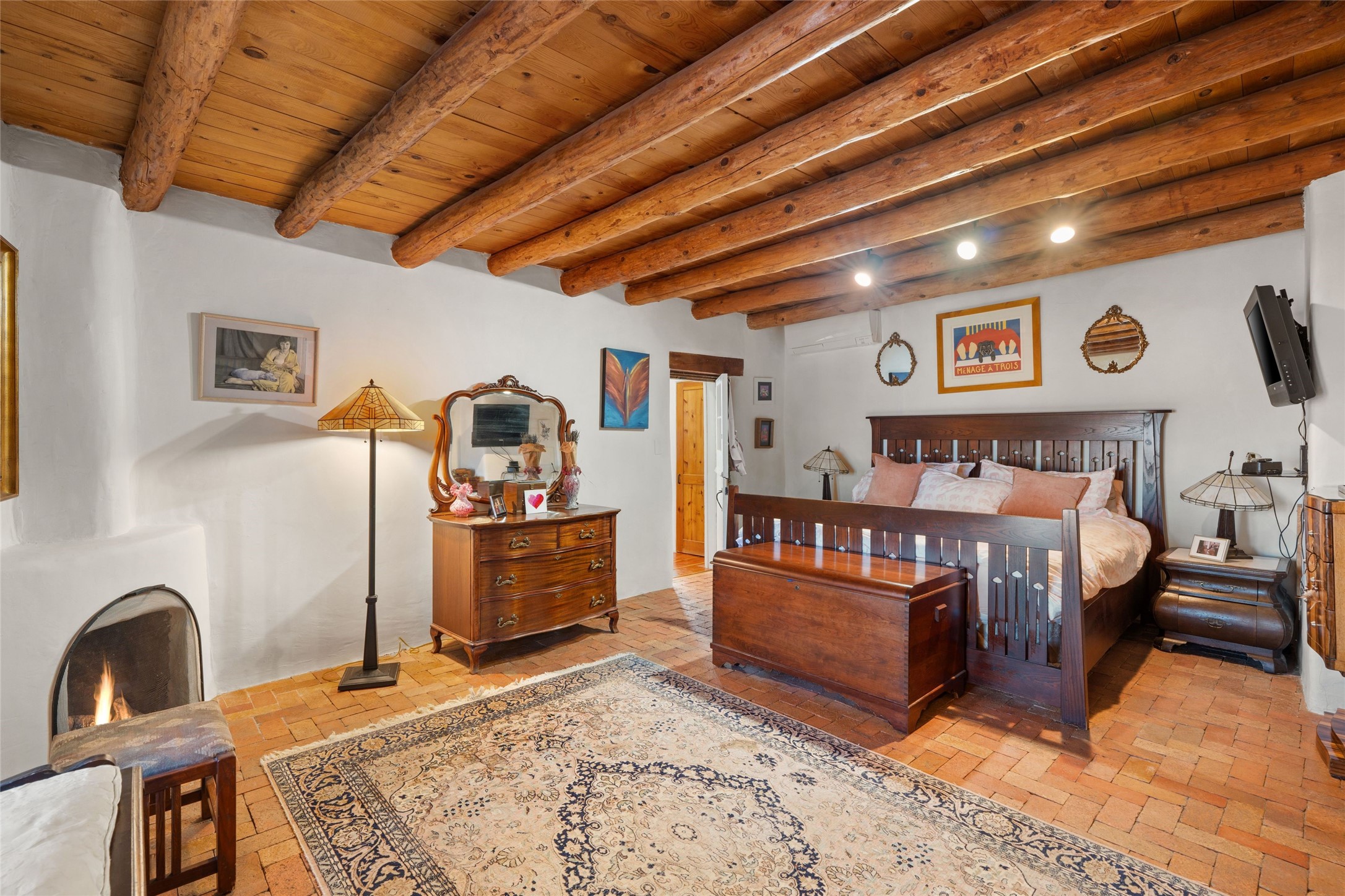 Located in the lush, idyllic area of Nambe, this authentic adobe home that embodies the charm of Santa Fe living. This captivating residence features two bedrooms and two bathrooms, alongside a detached and private one-bedroom, one-bath guest home. The home showcases iconic Santa Fe characteristics, including thick adobe walls that provide both insulation and a sense of warmth. The combination of wood and brick floors adds texture and depth to the interiors, while traditional nichos bring a unique artistic flair. The structure is enhanced by vigas and latillas, elements that reflect the rich architectural heritage of the region. Outdoor spaces abound, offering a variety of areas for relaxation and enjoyment. A walled courtyard serves as a secluded retreat, complete with an outdoor fireplace that sets the stage for cozy gatherings. The main living area opens to a deep view portal, providing sweeping vistas of the surrounding landscape and creating a seamless connection between indoor and outdoor living. The property is adorned with majestic cottonwood trees and lush native grasses, contributing to the serene ambiance. An acequia runs through the grounds, a testament to the area's agricultural roots and enhancing the natural beauty of this remarkable home. The blend of traditional architecture, stunning outdoor spaces, and a tranquil setting creates a unique sanctuary, perfect for those seeking an authentic New Mexico experience.
