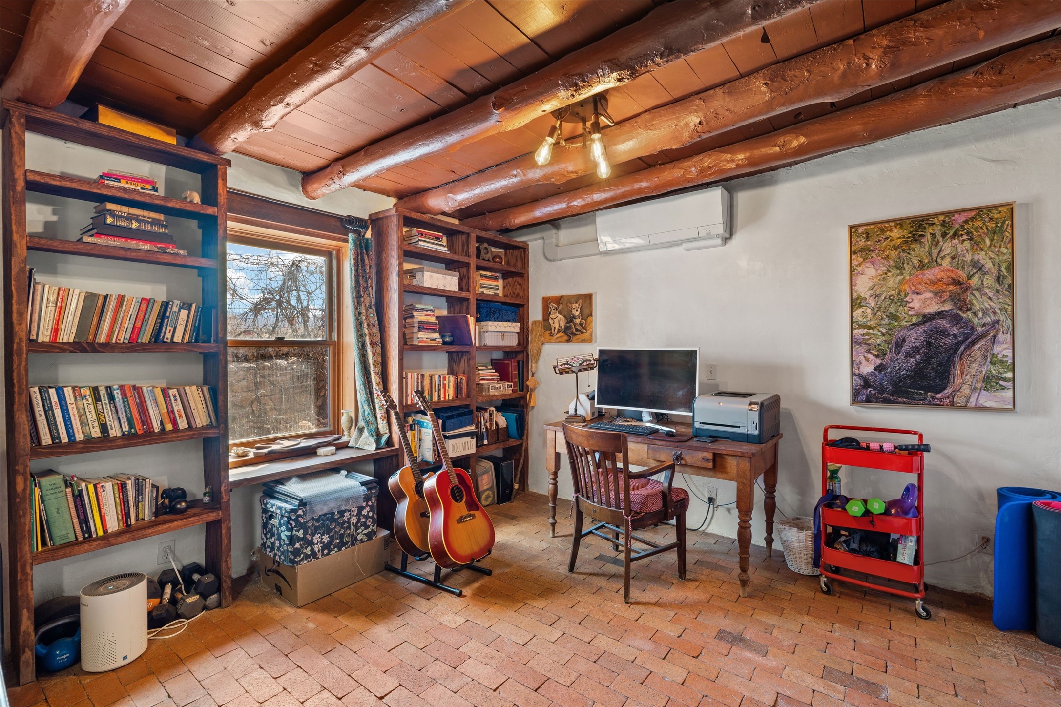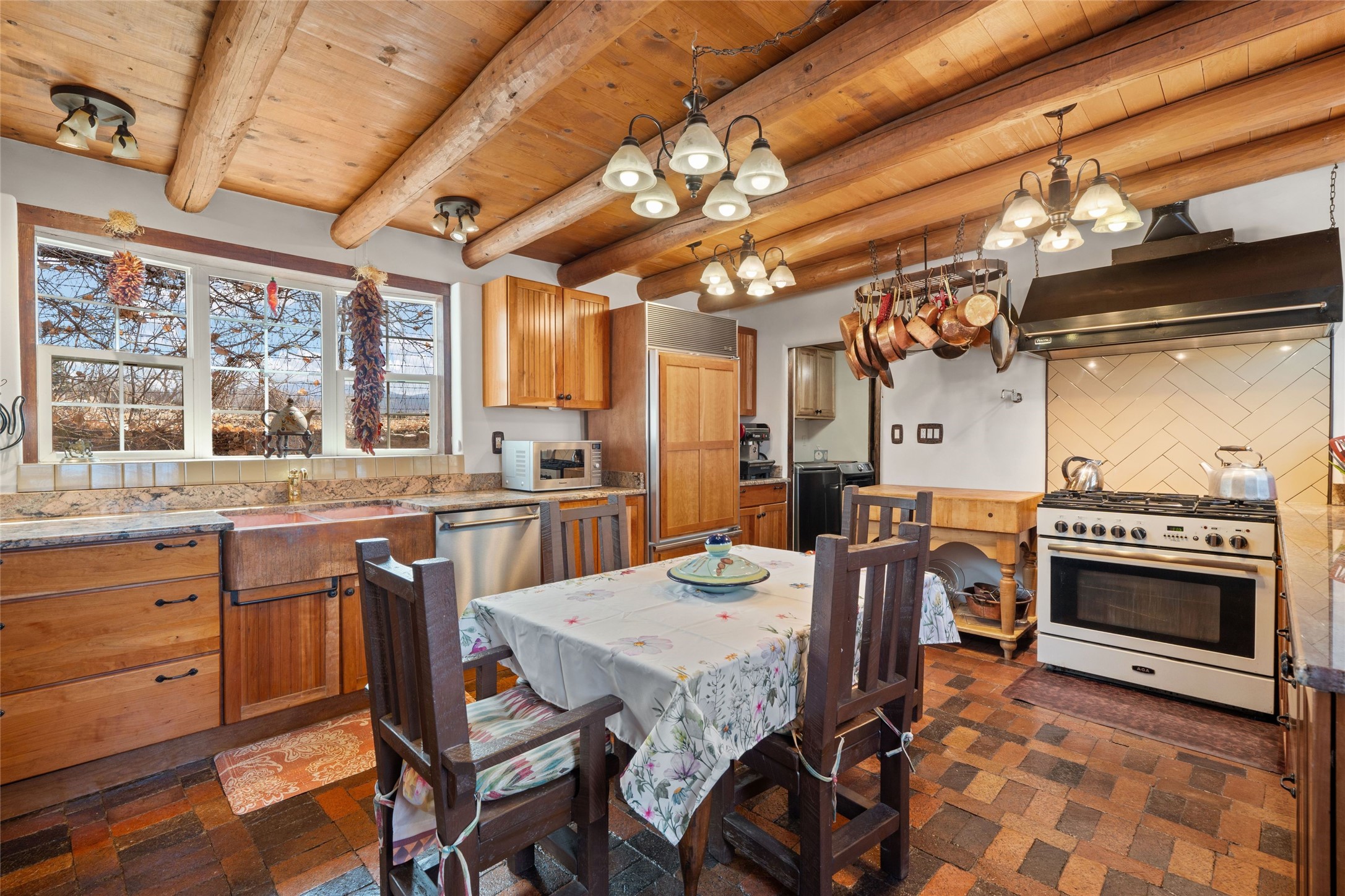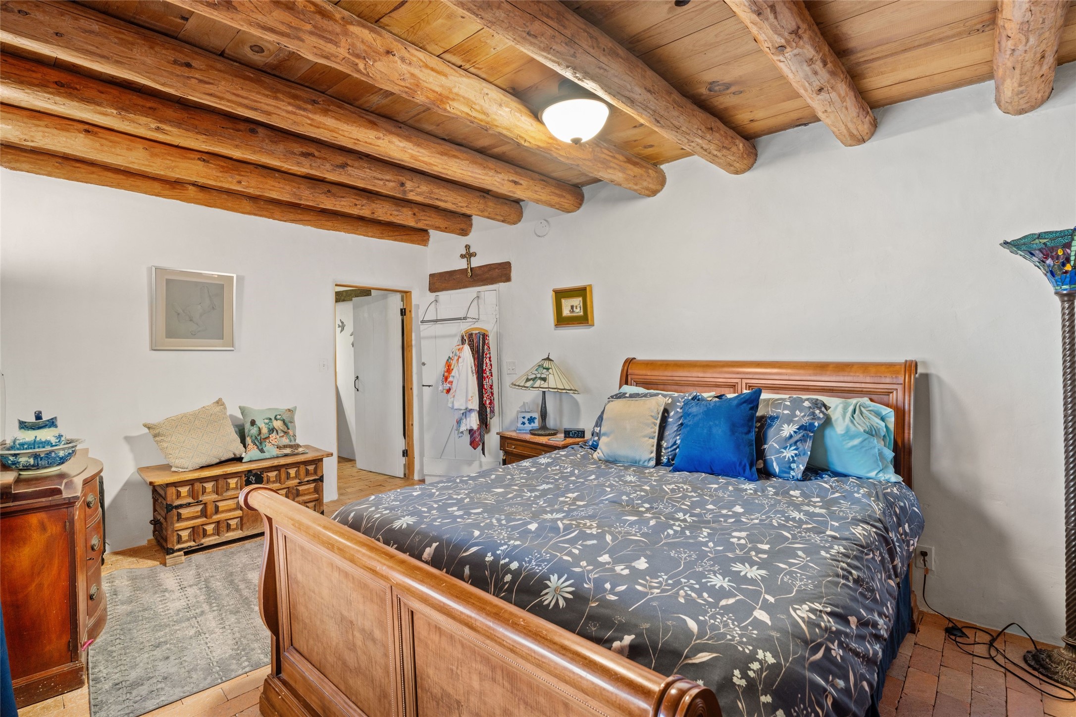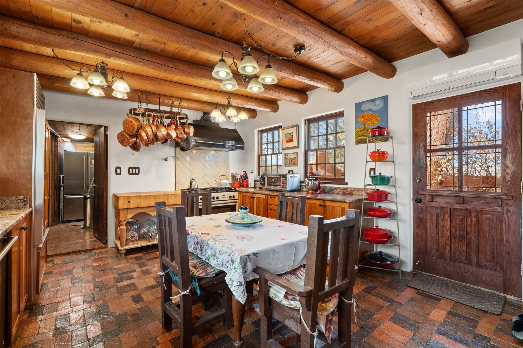 Located in the lush, idyllic area of Nambe, this authentic adobe home that embodies the charm of Santa Fe living. This captivating residence features two bedrooms and two bathrooms, alongside a detached and private one-bedroom, one-bath guest home. The home showcases iconic Santa Fe characteristics, including thick adobe walls that provide both insulation and a sense of warmth. The combination of wood and brick floors adds texture and depth to the interiors, while traditional nichos bring a unique artistic flair. The structure is enhanced by vigas and latillas, elements that reflect the rich architectural heritage of the region. Outdoor spaces abound, offering a variety of areas for relaxation and enjoyment. A walled courtyard serves as a secluded retreat, complete with an outdoor fireplace that sets the stage for cozy gatherings. The main living area opens to a deep view portal, providing sweeping vistas of the surrounding landscape and creating a seamless connection between indoor and outdoor living. The property is adorned with majestic cottonwood trees and lush native grasses, contributing to the serene ambiance. An acequia runs through the grounds, a testament to the area's agricultural roots and enhancing the natural beauty of this remarkable home. The blend of traditional architecture, stunning outdoor spaces, and a tranquil setting creates a unique sanctuary, perfect for those seeking an authentic New Mexico experience.