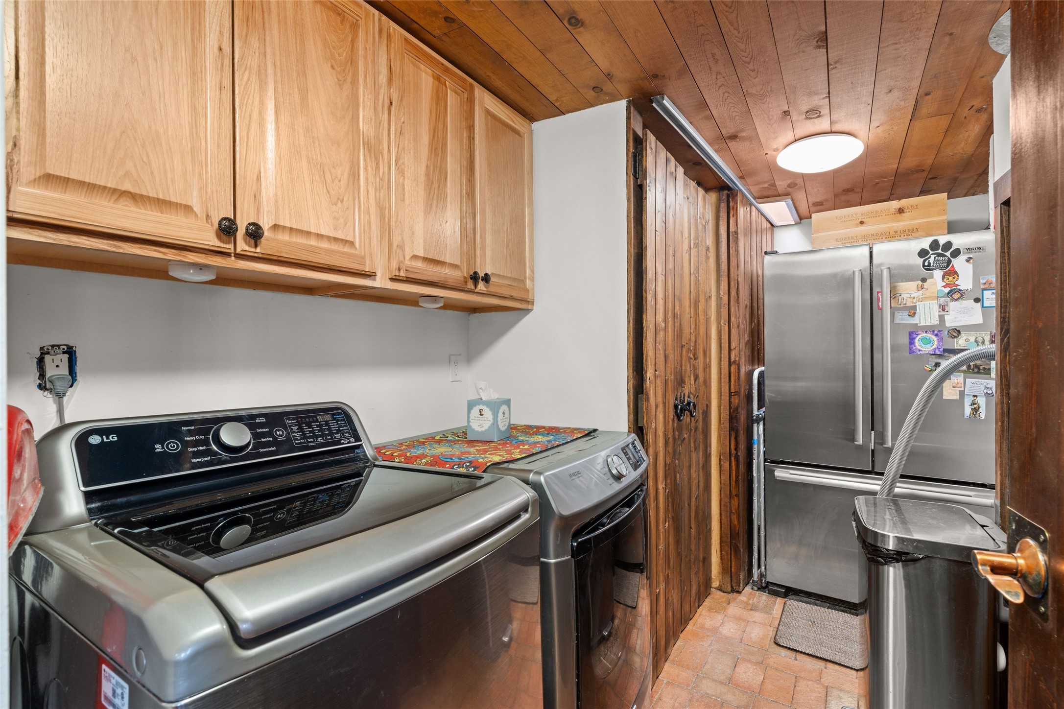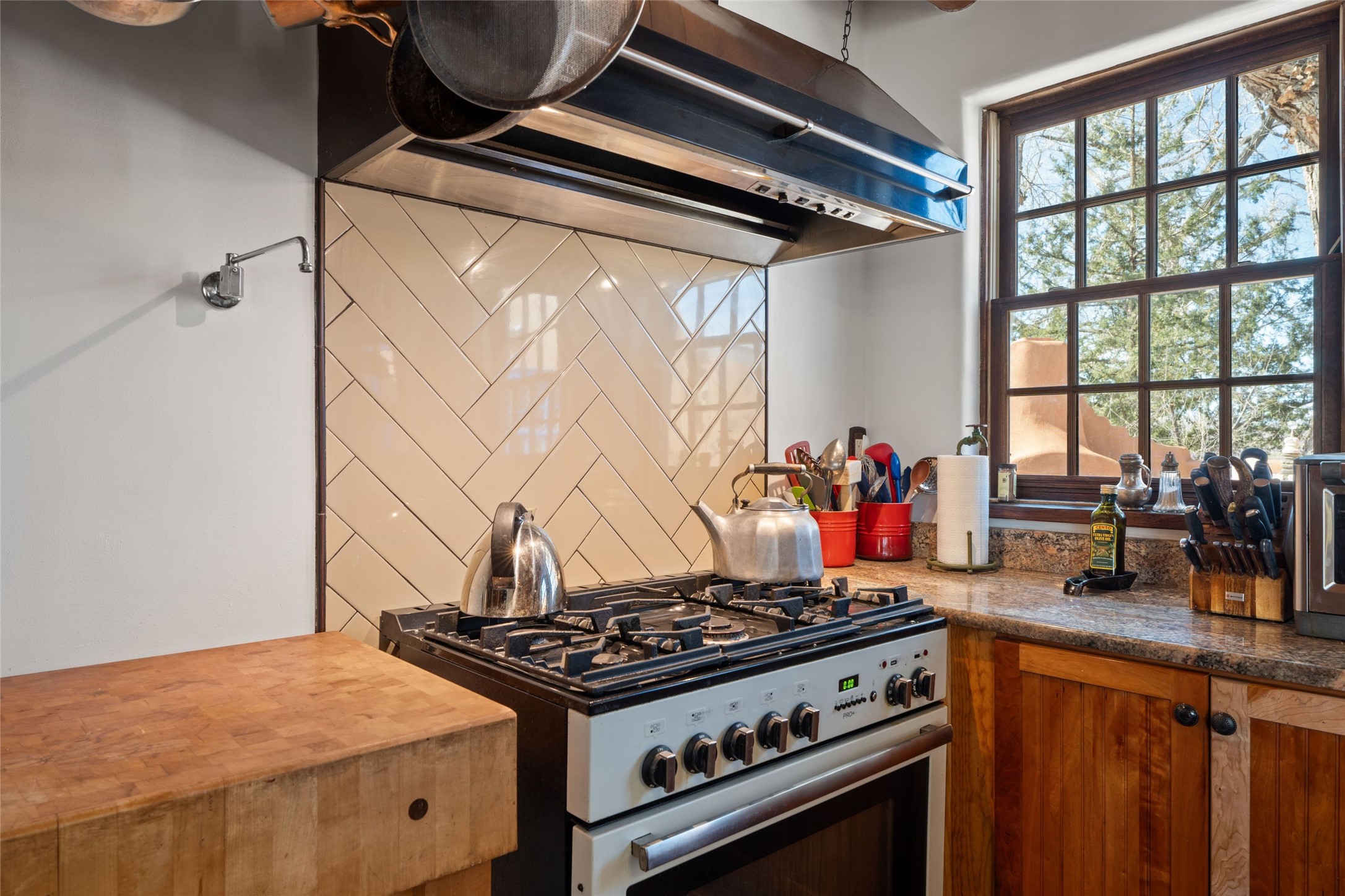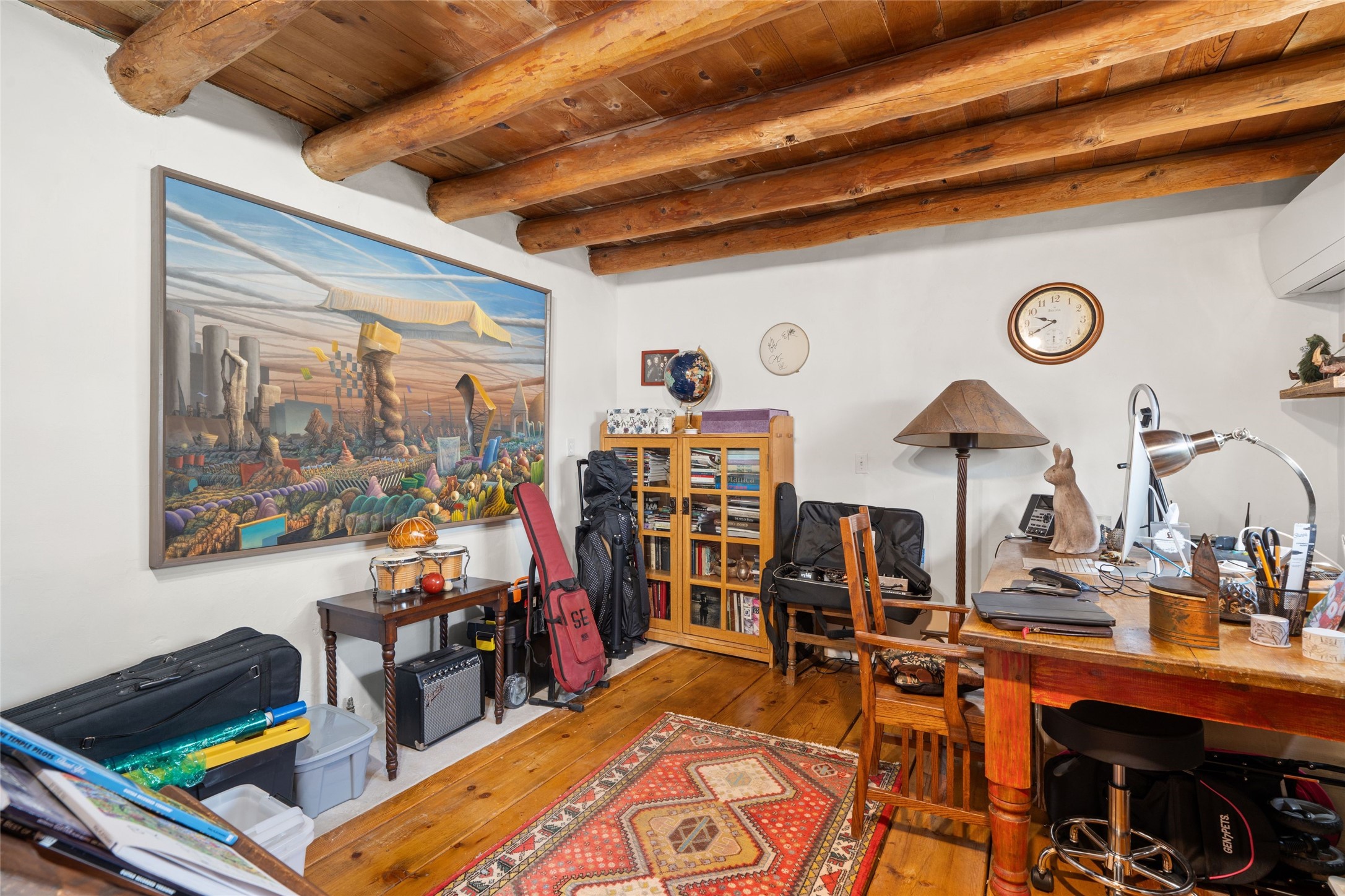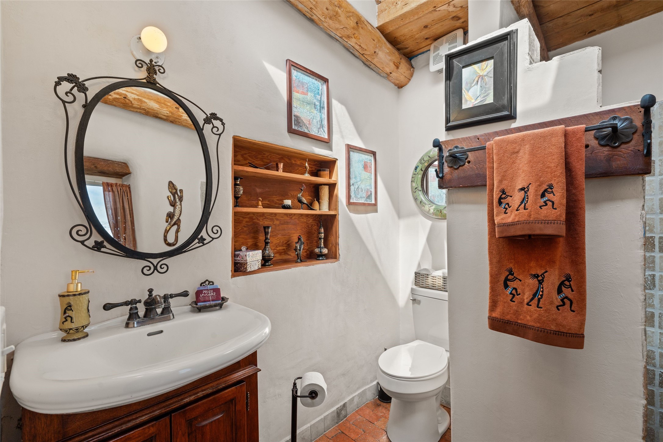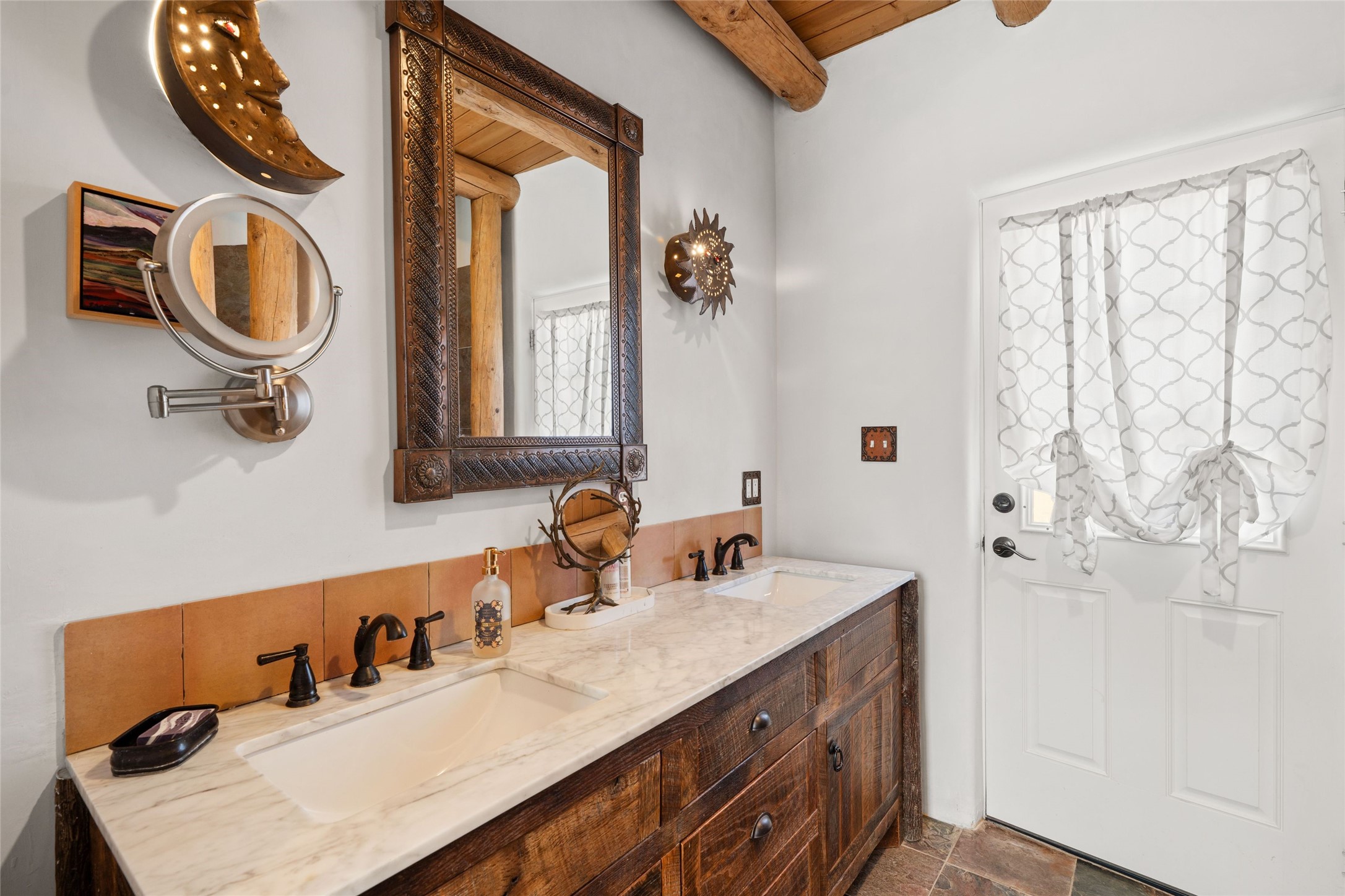 Located in the lush, idyllic area of Nambe, this authentic adobe home that embodies the charm of Santa Fe living. This captivating residence features two bedrooms and two bathrooms, alongside a detached and private one-bedroom, one-bath guest home. The home showcases iconic Santa Fe characteristics, including thick adobe walls that provide both insulation and a sense of warmth. The combination of wood and brick floors adds texture and depth to the interiors, while traditional nichos bring a unique artistic flair. The structure is enhanced by vigas and latillas, elements that reflect the rich architectural heritage of the region. Outdoor spaces abound, offering a variety of areas for relaxation and enjoyment. A walled courtyard serves as a secluded retreat, complete with an outdoor fireplace that sets the stage for cozy gatherings. The main living area opens to a deep view portal, providing sweeping vistas of the surrounding landscape and creating a seamless connection between indoor and outdoor living. The property is adorned with majestic cottonwood trees and lush native grasses, contributing to the serene ambiance. An acequia runs through the grounds, a testament to the area's agricultural roots and enhancing the natural beauty of this remarkable home. The blend of traditional architecture, stunning outdoor spaces, and a tranquil setting creates a unique sanctuary, perfect for those seeking an authentic New Mexico experience.