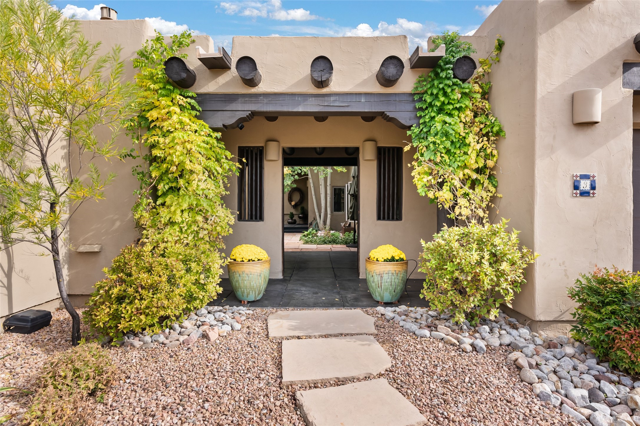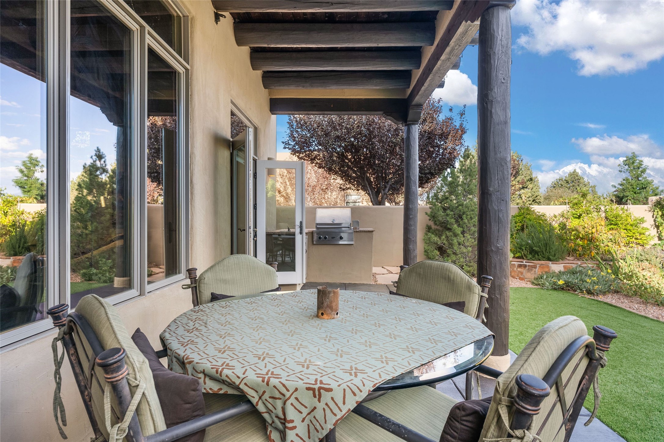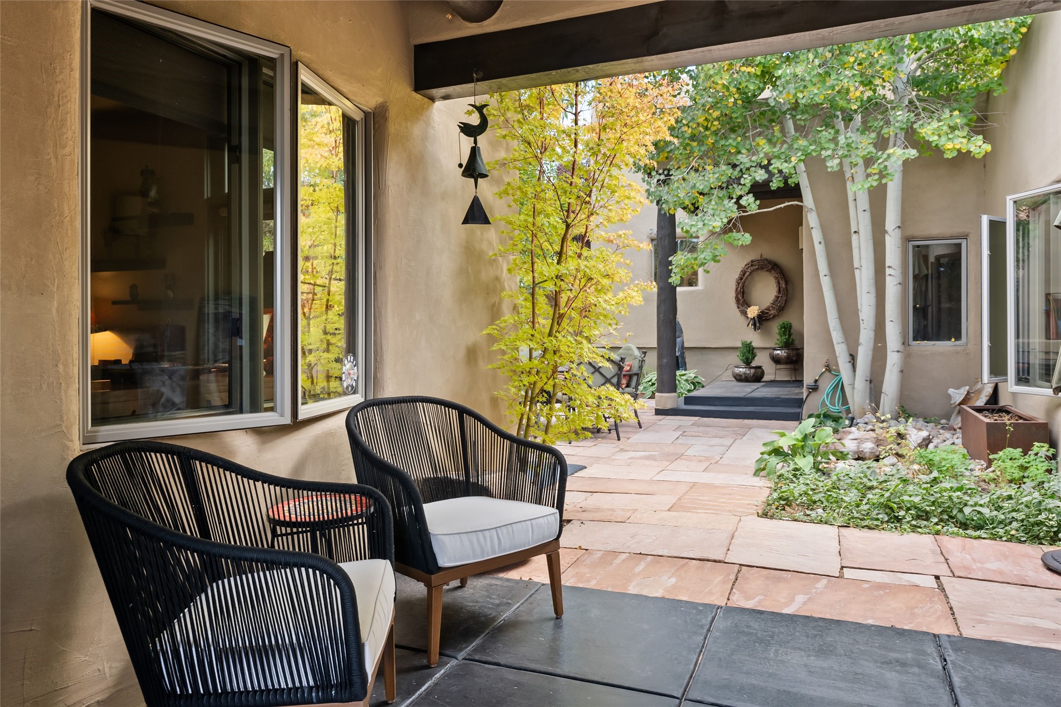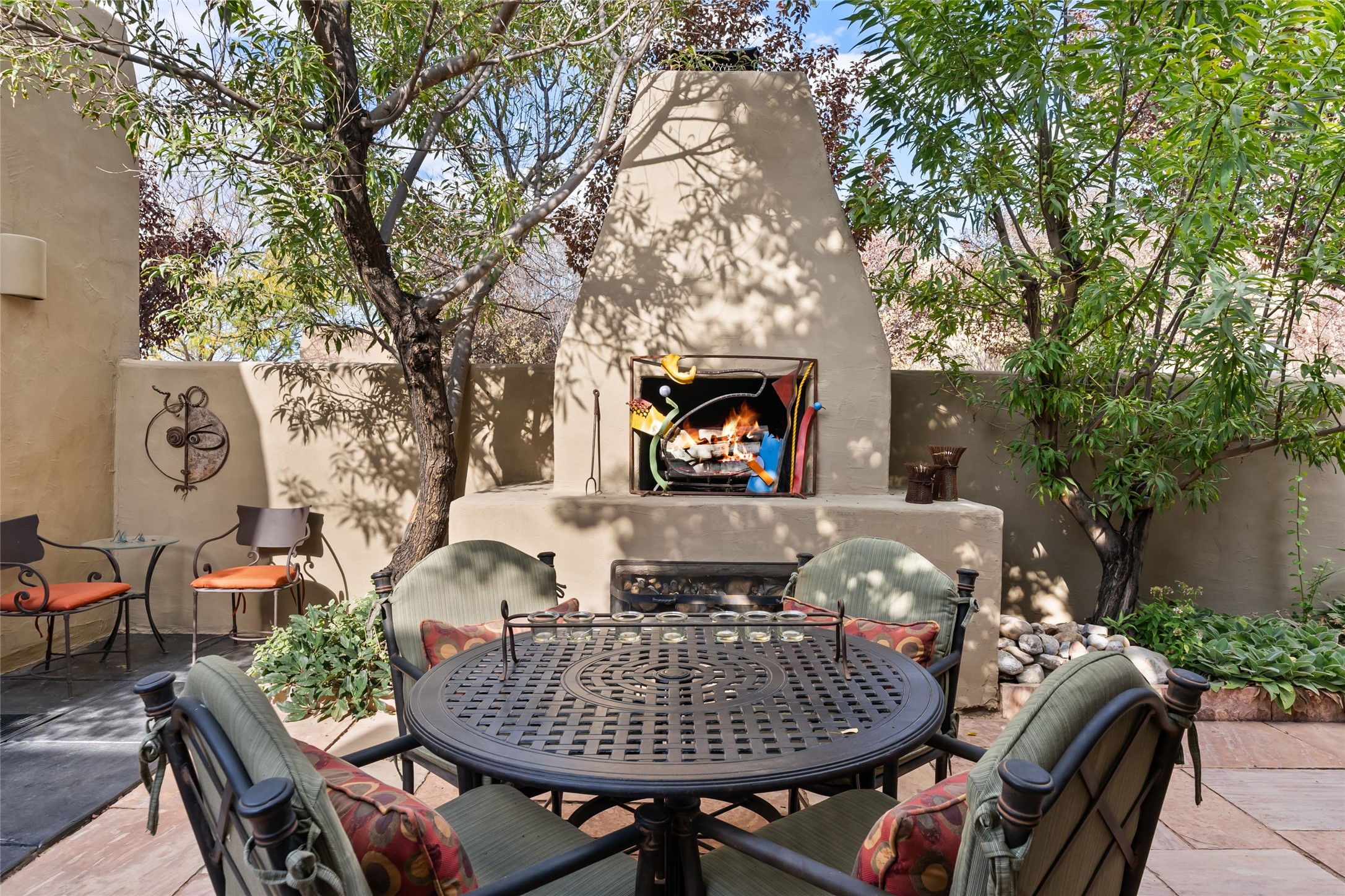 This inviting, Soft Contemporary 2-Bed + Den / 3-Bath home in Gated Las Campanas provides easy, "Lock & Leave" convenience with a gorgeous view of the Sangre de Cristo Mountains. Two rustic wood entry gates lead to the private, intimate entry courtyard, which is beautifully landscaped with a water feature & cozy wood-burning fireplace for entertaining guests. The Main house is an open floor plan with an easy flow from the Living & Dining areas to the Gourmet Kitchen with Taj Majal Quartzite countertop and stainless appliances - Sub Zero refrigerator, a 36-inch Frigidaire gas range/oven (installed in January 2025 & never used), Dacor hood, Bosch dishwasher, Sharp microwave drawer and wine cooler. The Elegant Master Bedroom & Bath offers two separate vanities, oval soaking tub, separate shower and a fabulous California Closet. The Media Room could easily be converted to a Bedroom and has an adjacent Bath. The Private, Detached 1-Bed / 1-Bath Guest Casita offers great privacy for visiting friends & family, with enough room for a King-size bed. The back yard is fully landscaped and walled-in for pets, with a water feature, built-in Viking grill and Sangre de Cristo Mountain view. This home has it all - Contemporary style, Detached Casita and a View of the Sangre de Cristo Mountains.