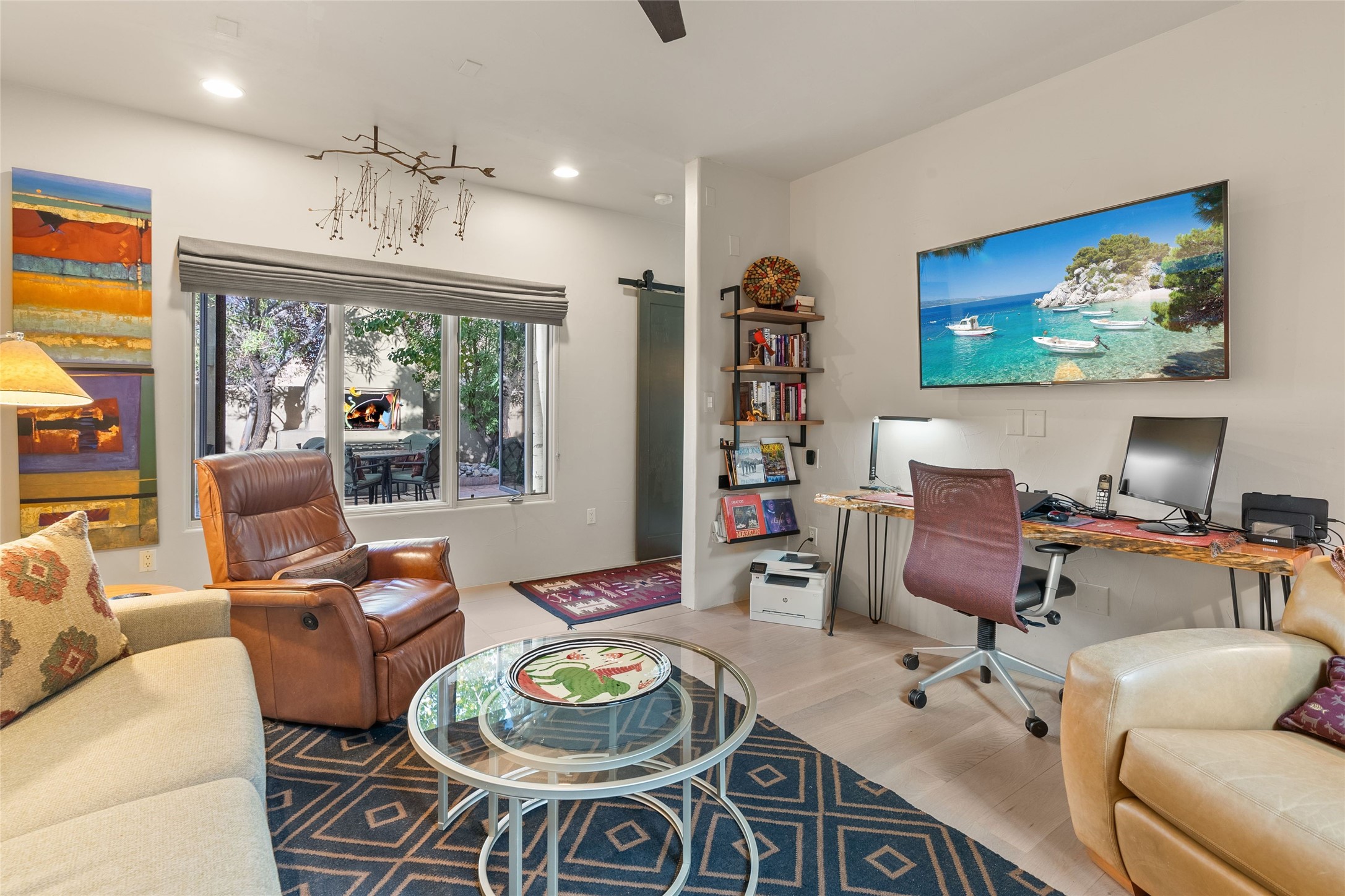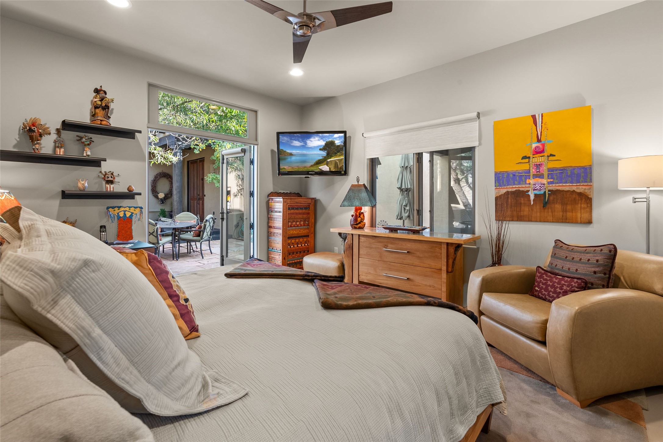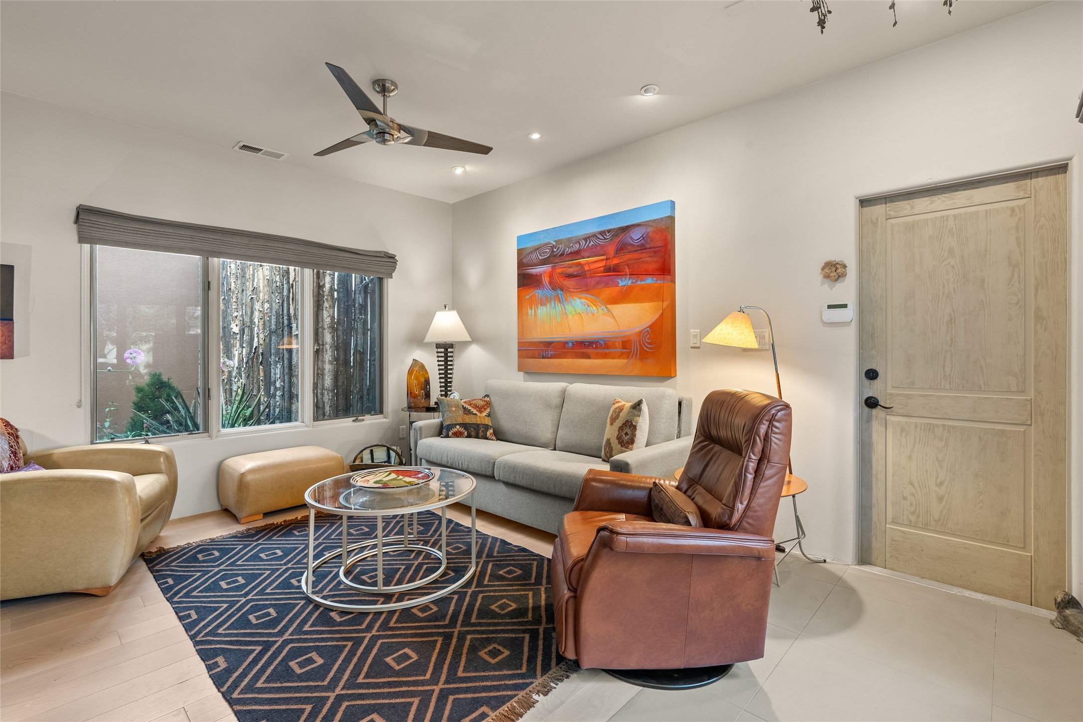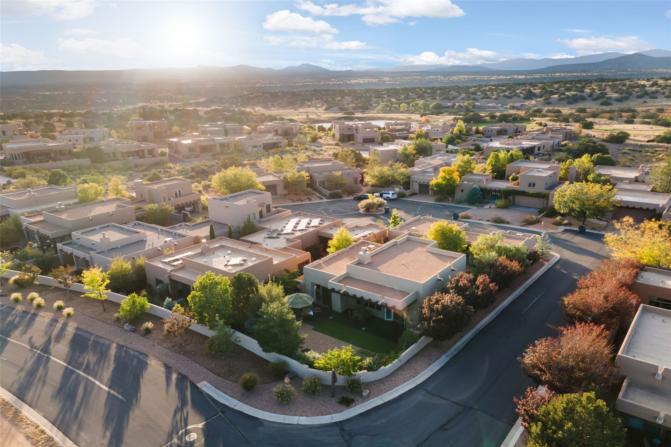 This inviting, Soft Contemporary 2-Bed + Den / 3-Bath home in Gated Las Campanas provides easy, "Lock & Leave" convenience with a gorgeous view of the Sangre de Cristo Mountains. Two rustic wood entry gates lead to the private, intimate entry courtyard, which is beautifully landscaped with a water feature & cozy wood-burning fireplace for entertaining guests. The Main house is an open floor plan with an easy flow from the Living & Dining areas to the Gourmet Kitchen with Taj Majal Quartzite countertop and stainless appliances - Sub Zero refrigerator, a 36-inch Frigidaire gas range/oven (installed in January 2025 & never used), Dacor hood, Bosch dishwasher, Sharp microwave drawer and wine cooler. The Elegant Master Bedroom & Bath offers two separate vanities, oval soaking tub, separate shower and a fabulous California Closet. The Media Room could easily be converted to a Bedroom and has an adjacent Bath. The Private, Detached 1-Bed / 1-Bath Guest Casita offers great privacy for visiting friends & family, with enough room for a King-size bed. The back yard is fully landscaped and walled-in for pets, with a water feature, built-in Viking grill and Sangre de Cristo Mountain view. This home has it all - Contemporary style, Detached Casita and a View of the Sangre de Cristo Mountains.