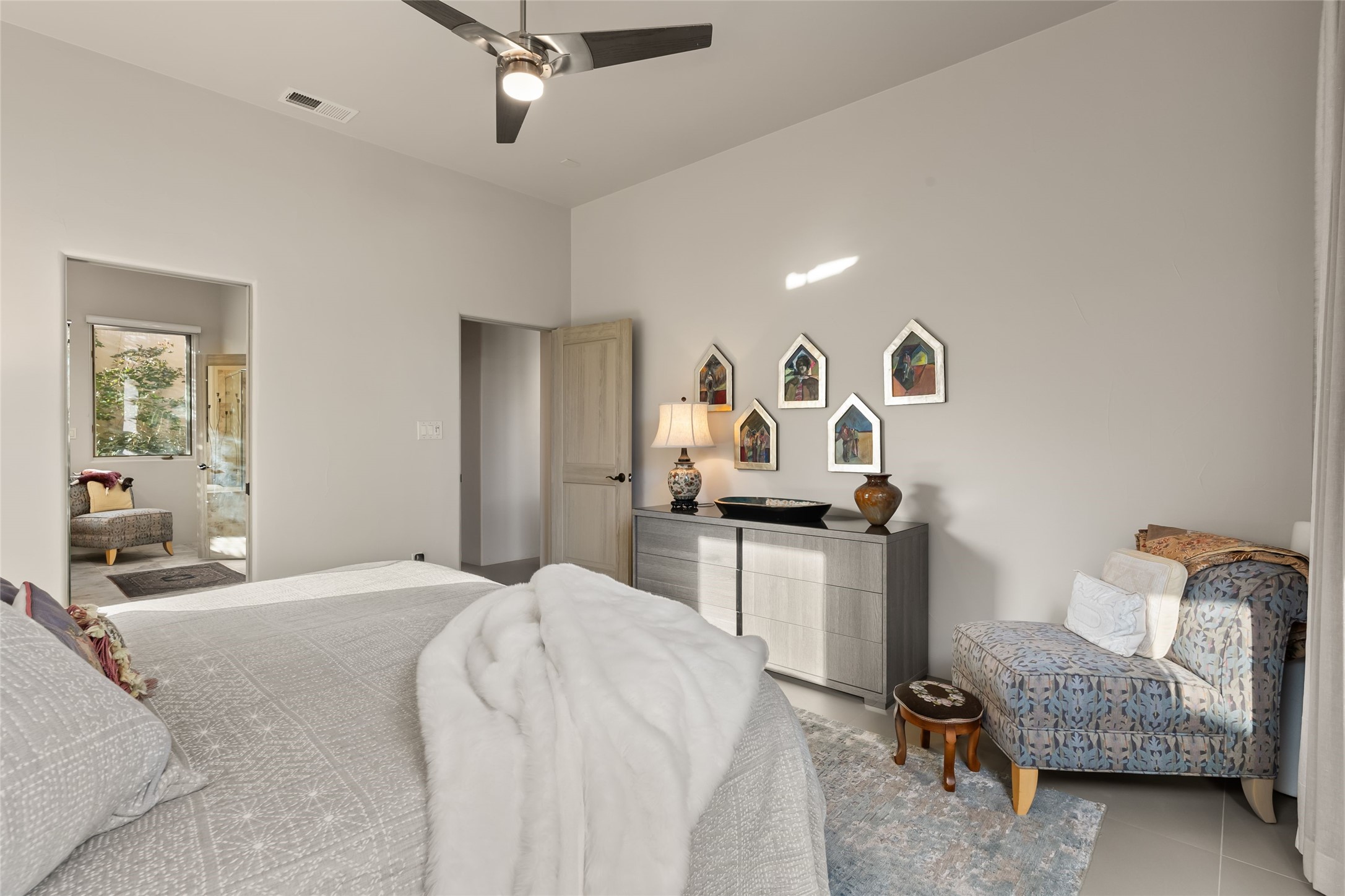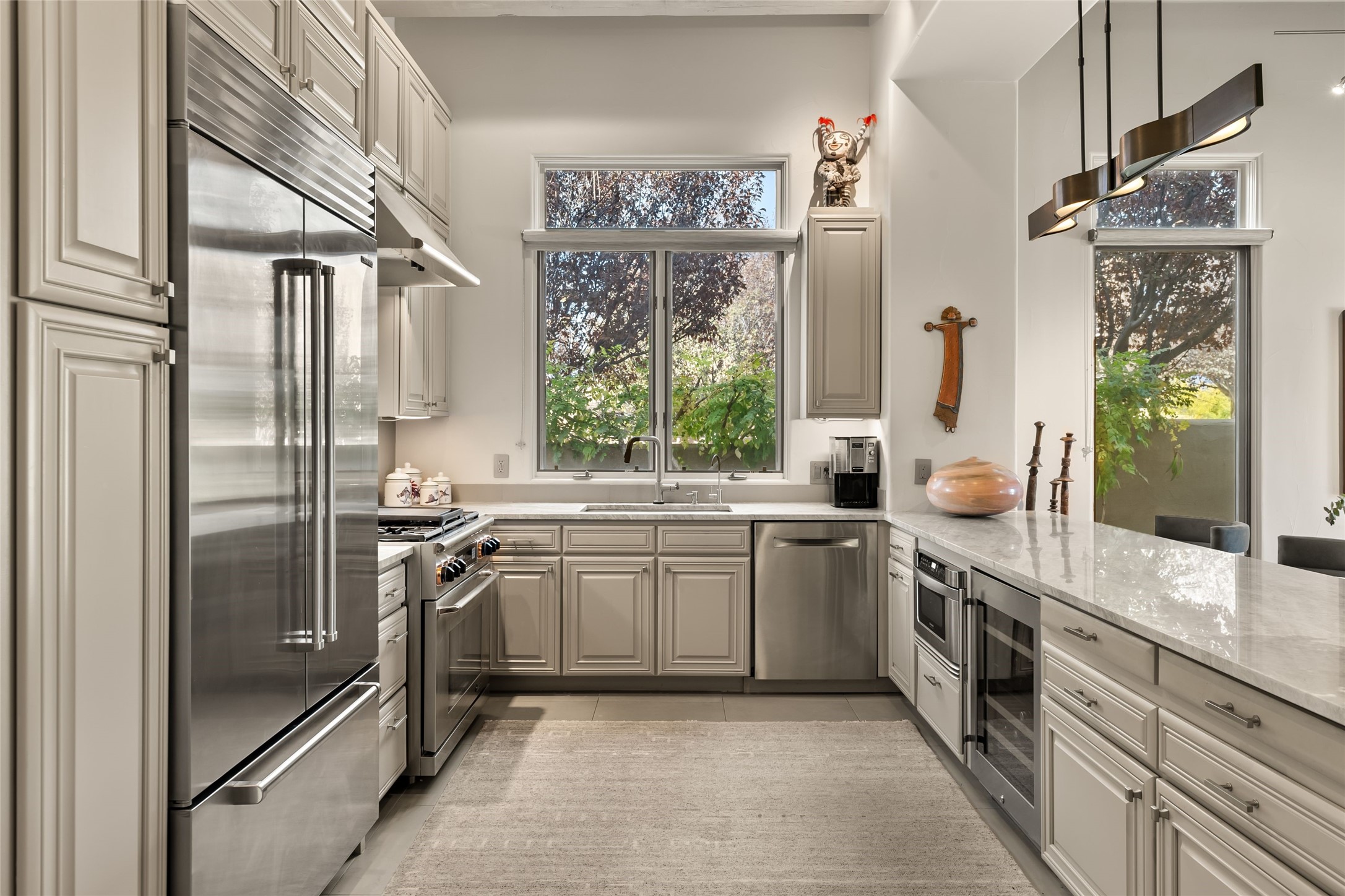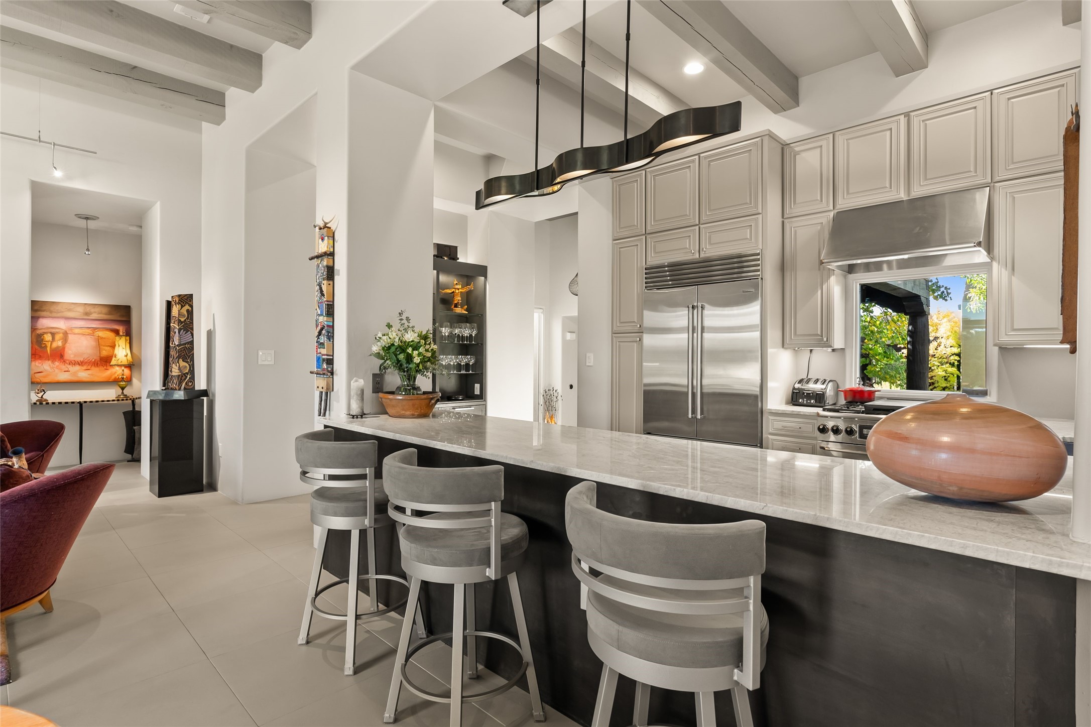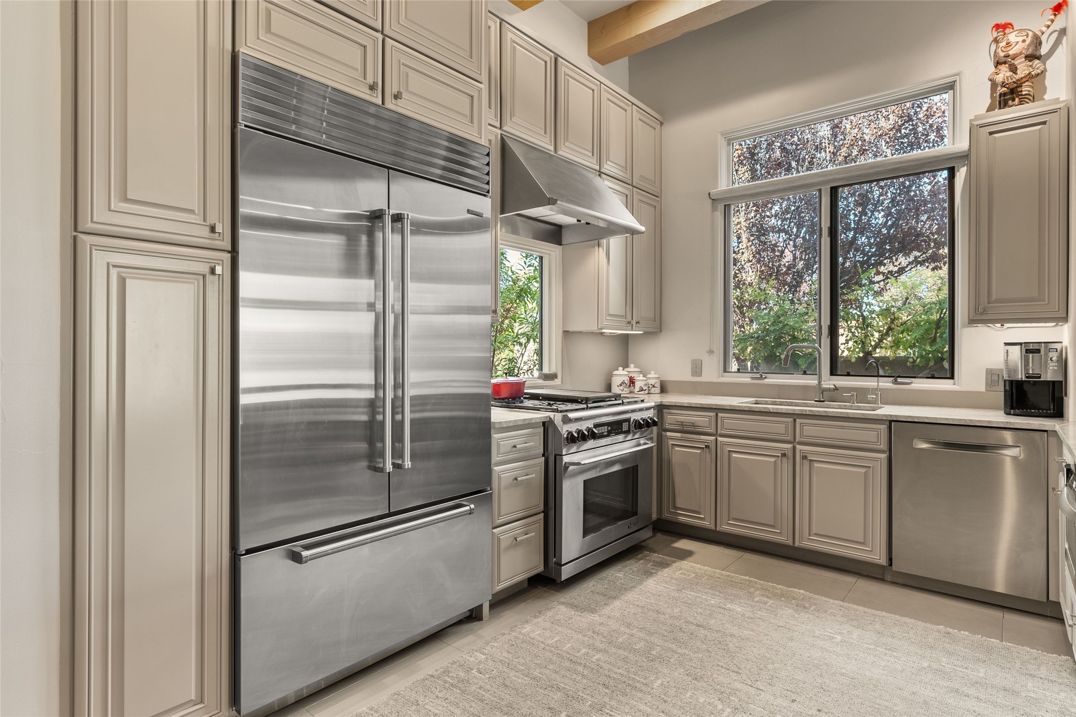 This inviting, Soft Contemporary 2-Bed + Den / 3-Bath home in Gated Las Campanas provides easy, "Lock & Leave" convenience with a gorgeous view of the Sangre de Cristo Mountains. Two rustic wood entry gates lead to the private, intimate entry courtyard, which is beautifully landscaped with a water feature & cozy wood-burning fireplace for entertaining guests. The Main house is an open floor plan with an easy flow from the Living & Dining areas to the Gourmet Kitchen with Taj Majal Quartzite countertop and stainless appliances - Sub Zero refrigerator, a 36-inch Frigidaire gas range/oven (installed in January 2025 & never used), Dacor hood, Bosch dishwasher, Sharp microwave drawer and wine cooler. The Elegant Master Bedroom & Bath offers two separate vanities, oval soaking tub, separate shower and a fabulous California Closet. The Media Room could easily be converted to a Bedroom and has an adjacent Bath. The Private, Detached 1-Bed / 1-Bath Guest Casita offers great privacy for visiting friends & family, with enough room for a King-size bed. The back yard is fully landscaped and walled-in for pets, with a water feature, built-in Viking grill and Sangre de Cristo Mountain view. This home has it all - Contemporary style, Detached Casita and a View of the Sangre de Cristo Mountains.