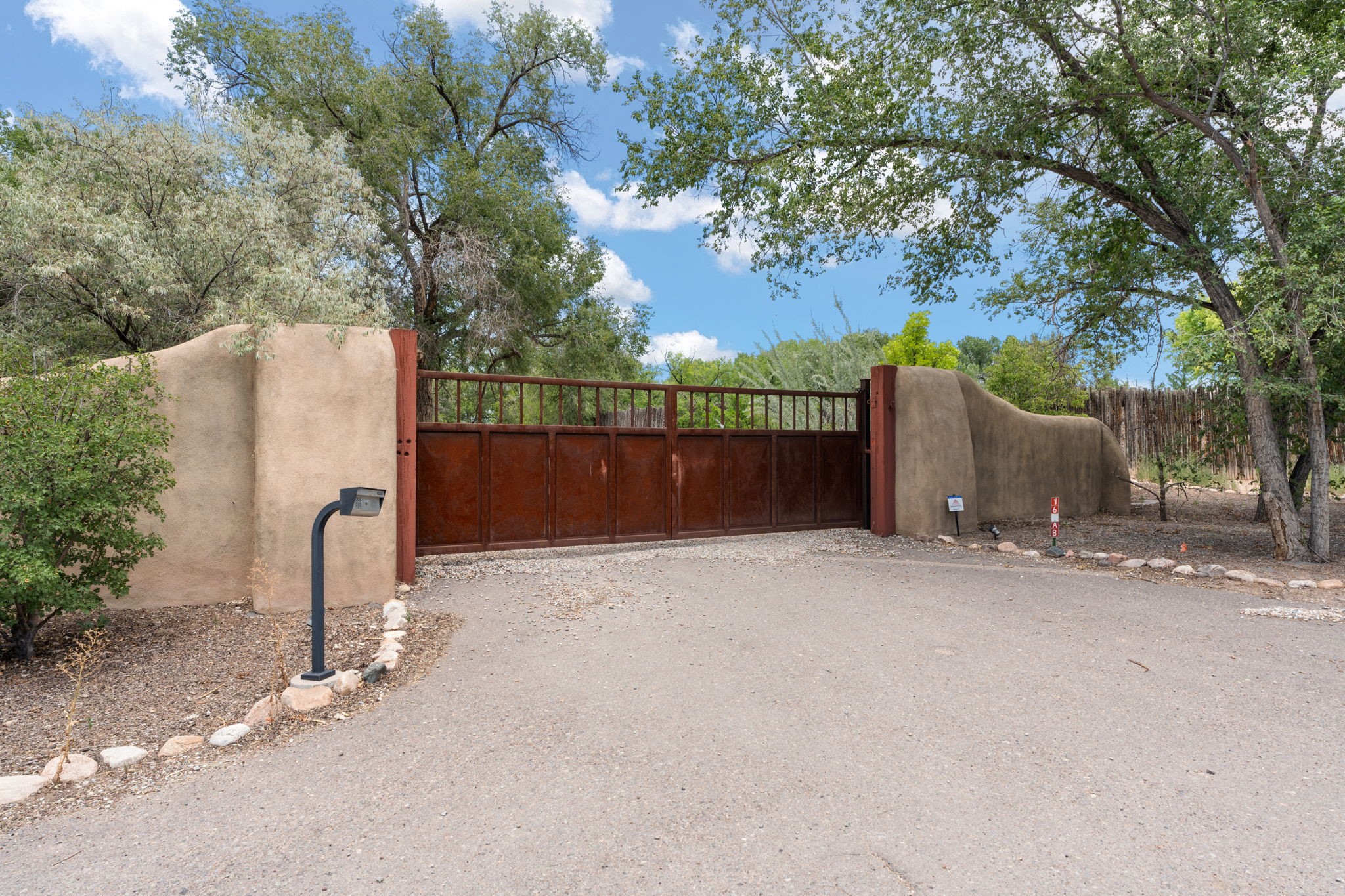 Situated on 2.05 fertile acres in the Nambe Valley lies Casa Alegria. With easy access to both Santa Fe and Los Alamos, this magnificent property boasts authentic Pueblo-style craftsmanship throughout. Surrounding the premiere home on this compound, you'll enjoy courtyards, portals, fireplaces, patios, and landscaped gardens, with mature trees. The interior of this expansive home offers a gourmet kitchen, hardwood and flagstone flooring, viga ceilings, and kiva fireplaces. In its expansive primary bedroom, you'll enjoy a spa bath, walk-in closet, and a spacious patio with its own swimming pool. Additionally, the one-bedroom guesthouse with equally impressive craftsmanship offers a dining area, bathroom, and kitchenette. Adjacent to the oversized 2-car garage is a bonus studio or office space, also with its own bath. Welcome to this spectacular northern New Mexico property.