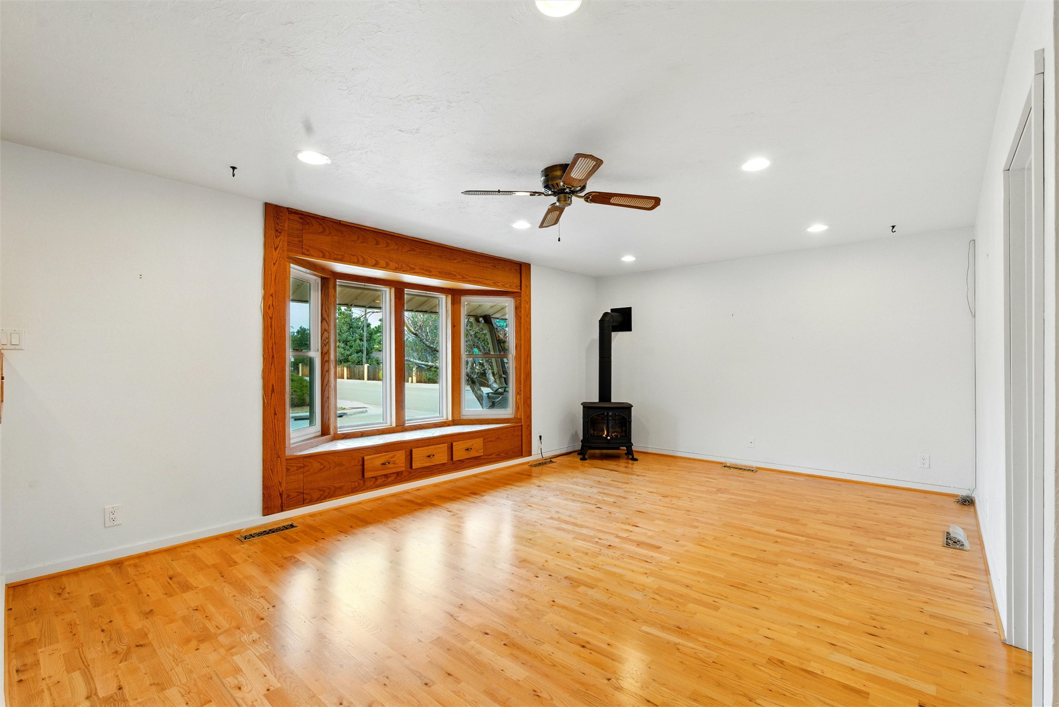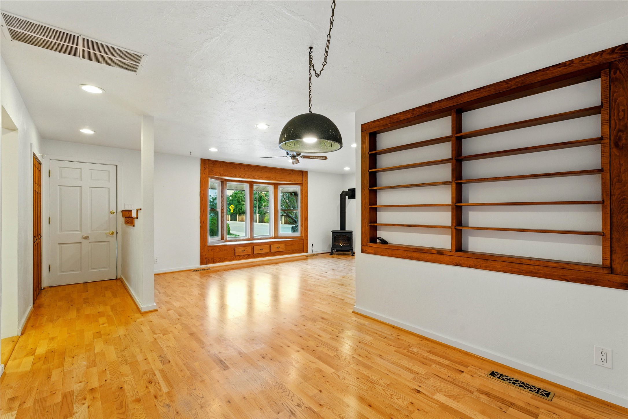 Lovingly maintained by the same owner for the past 47 years, this 3-bedroom, 2-bathroom home is a true testament to pride of ownership. Every inch of this property has been thoughtfully cared for, and it shows.Come inside to be greeted by warm hardwood floors and an inviting living room centered around a cozy wood-burning fireplace and a large bay window that floods the space with natural light. Just off the living area, a sunny bonus room offers the perfect spot for a home office, creative studio, or quiet retreat.The primary suite is generously sized and features dual closets and a spacious en suite bathroom with custom cabinetry and a walk-in shower. Down the hall, you'll find three additional bedrooms, providing plenty of room for family, guests, or hobbies.The heart of the home--its kitchen--shines with solid wood cabinets, granite countertops, and updated appliances, creating a beautiful and functional space for everyday living and entertaining.Outside, the charm continues. The home features updated stucco, a propanel roof, and newer windows, ensuring comfort and peace of mind. The lovingly landscaped yard boasts dozens perennial plantings, raised planting beds, several fruit trees, and all of it is easy to maintain with the automatic irrigation system and rain catchment barrels. In addition to the attached single-car garage, there are two additional garage/workshop spaces perfect for storage, hobbies, or projects; one of them features a mechanics pit so you can maintain your car right at home! There is a large garden shed in the backyard.Enjoy refrigerated central air, thoughtful upgrades throughout, and a prime downtown location that keeps you close to everything Los Alamos has to offer.This special home is filled with history, warmth, and care--and now it's ready to welcome its next chapter.