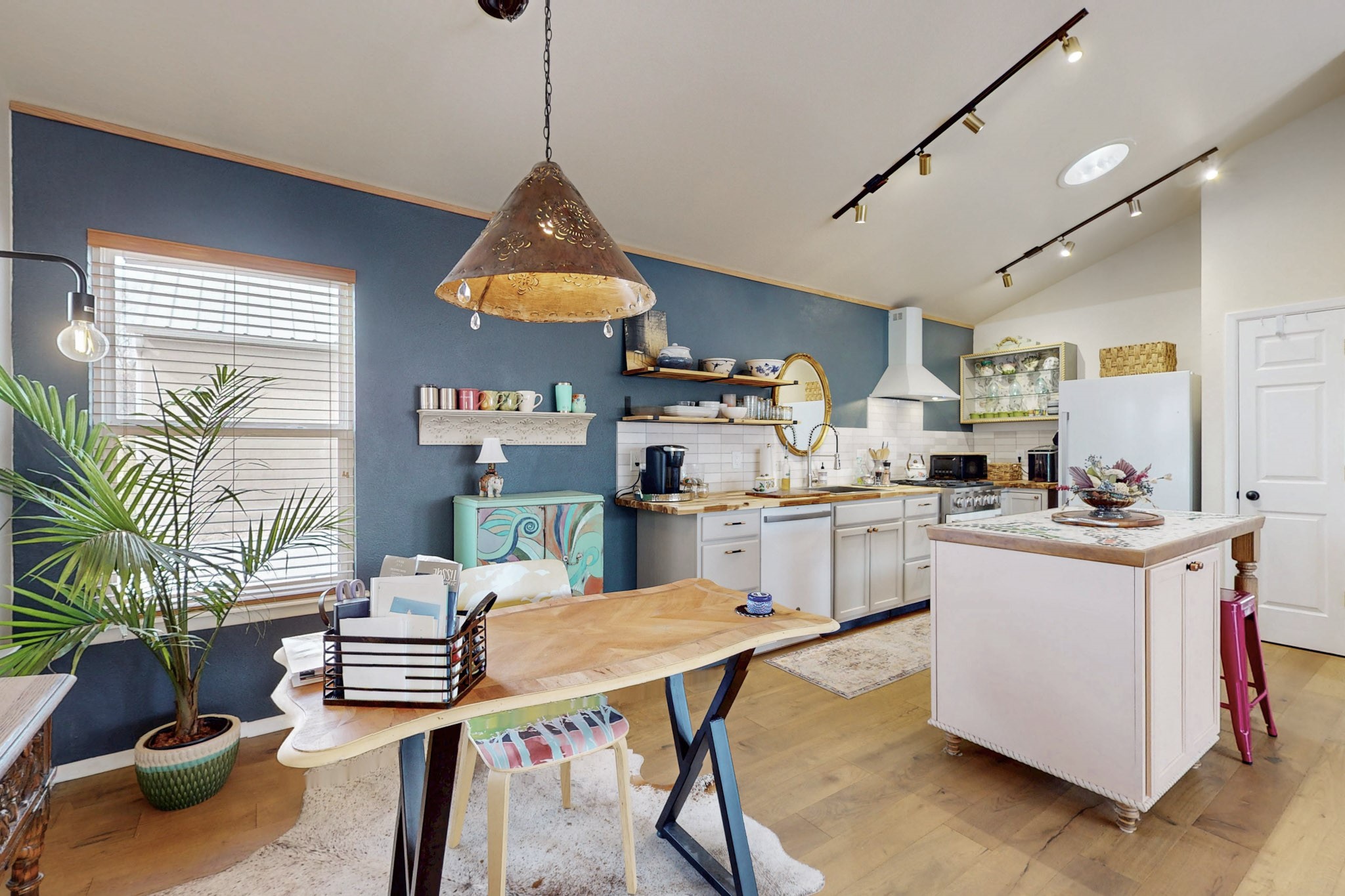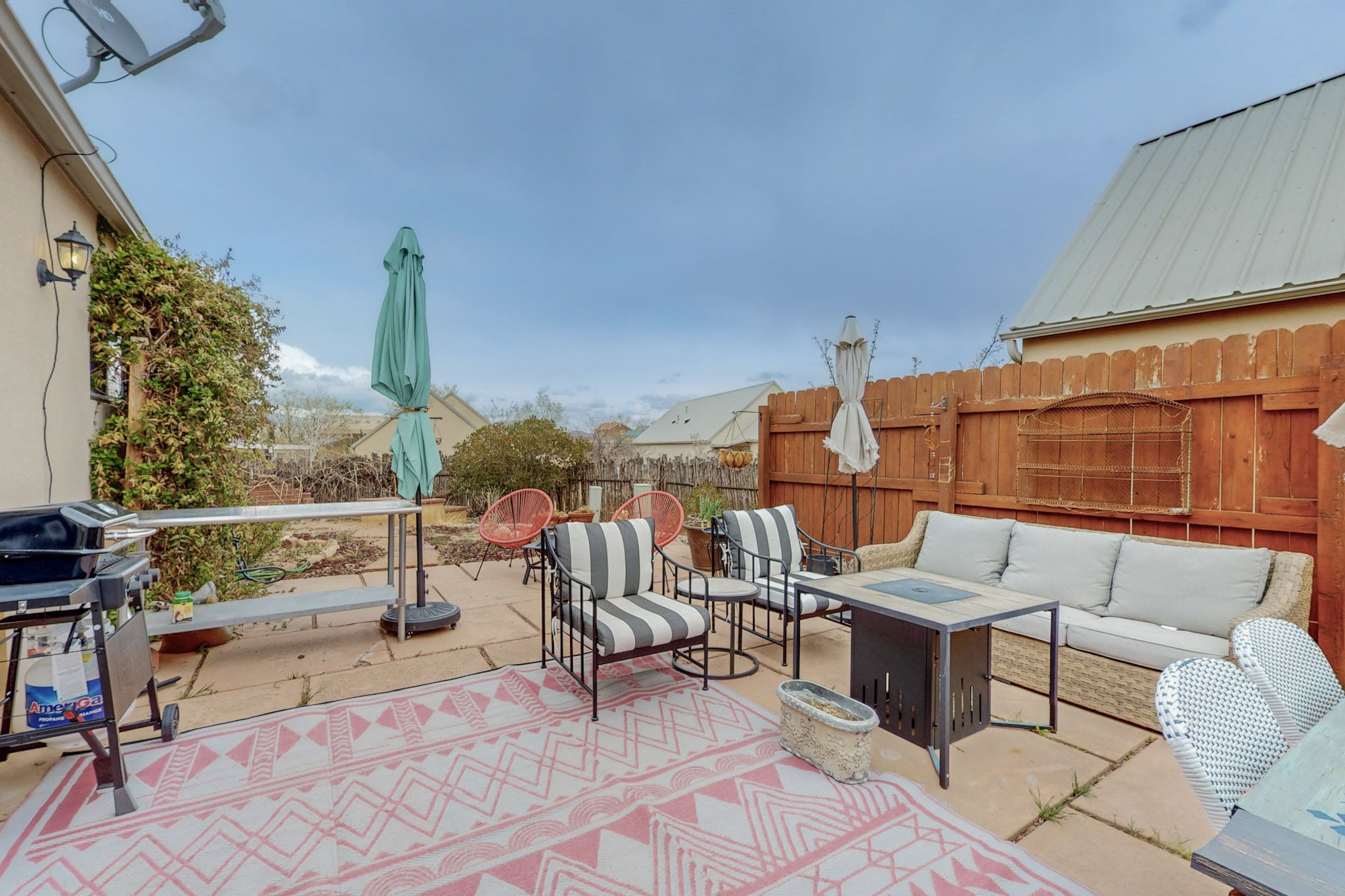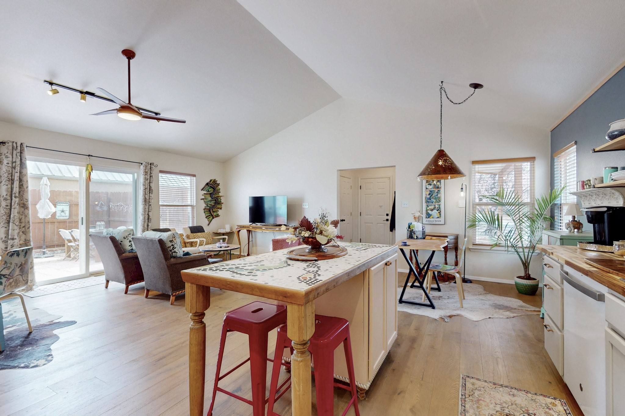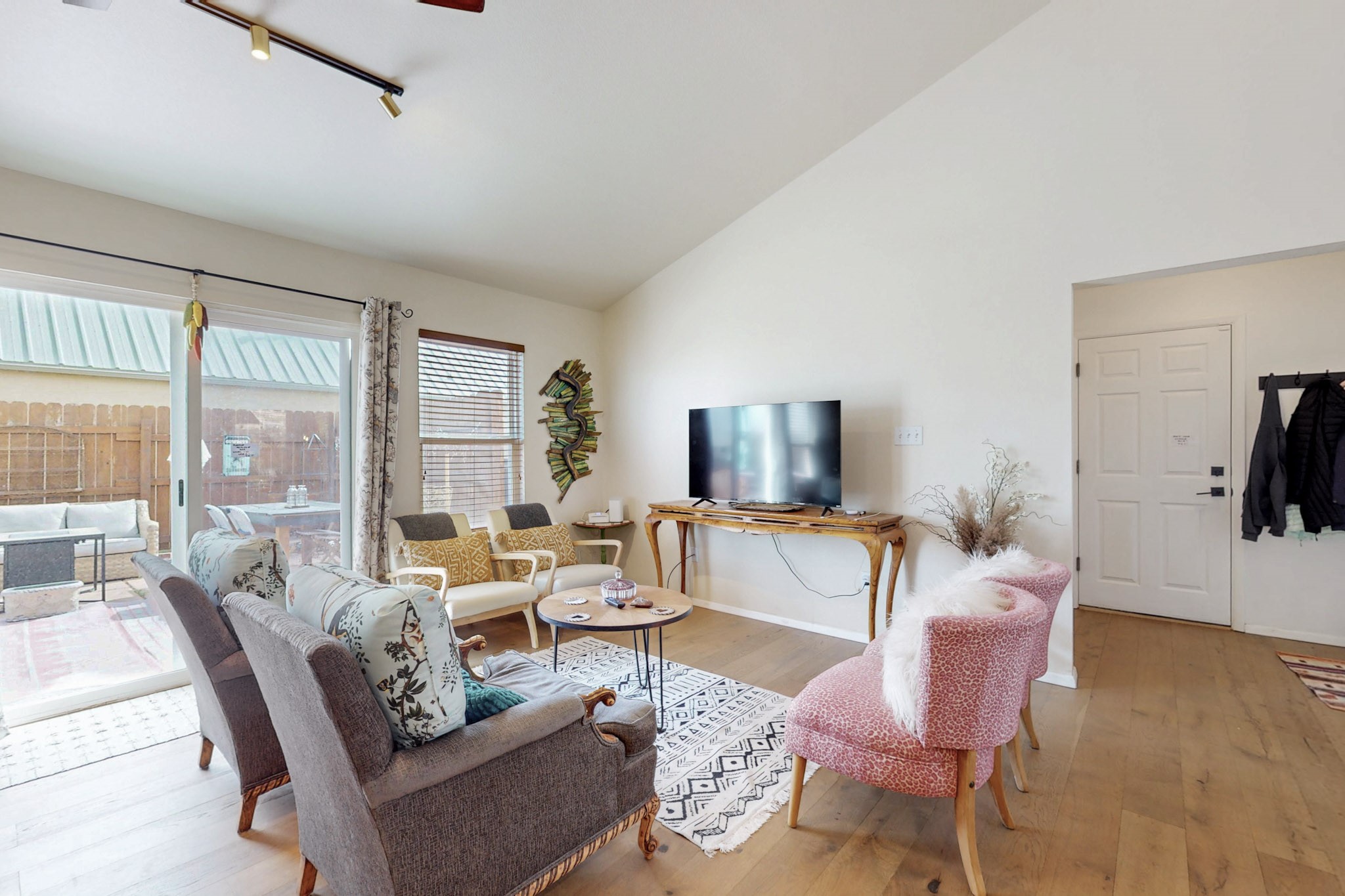 Stunning Northern New Mexico Style Home - Move-In Ready!This meticulously upgraded home blends timeless Northern New Mexico style with an eclectic southwest flair and modern amenities. Bathed in natural light, the home boasts vaulted ceilings, engineered hardwood floors, and a brand-new kitchen featuring a high-end Kucht stove. Every detail has been thoughtfully updated, from stylish light fixtures to ceiling fans, ensuring both comfort and style. The bathrooms have been tastefully updated, offering a fresh and eclectic southwest vibe.Step outside into the expansive backyard, perfect for hosting gatherings or simply relaxing. Located just minutes from schools, parks, shopping, and dining, this home combines charm with unmatched convenience.