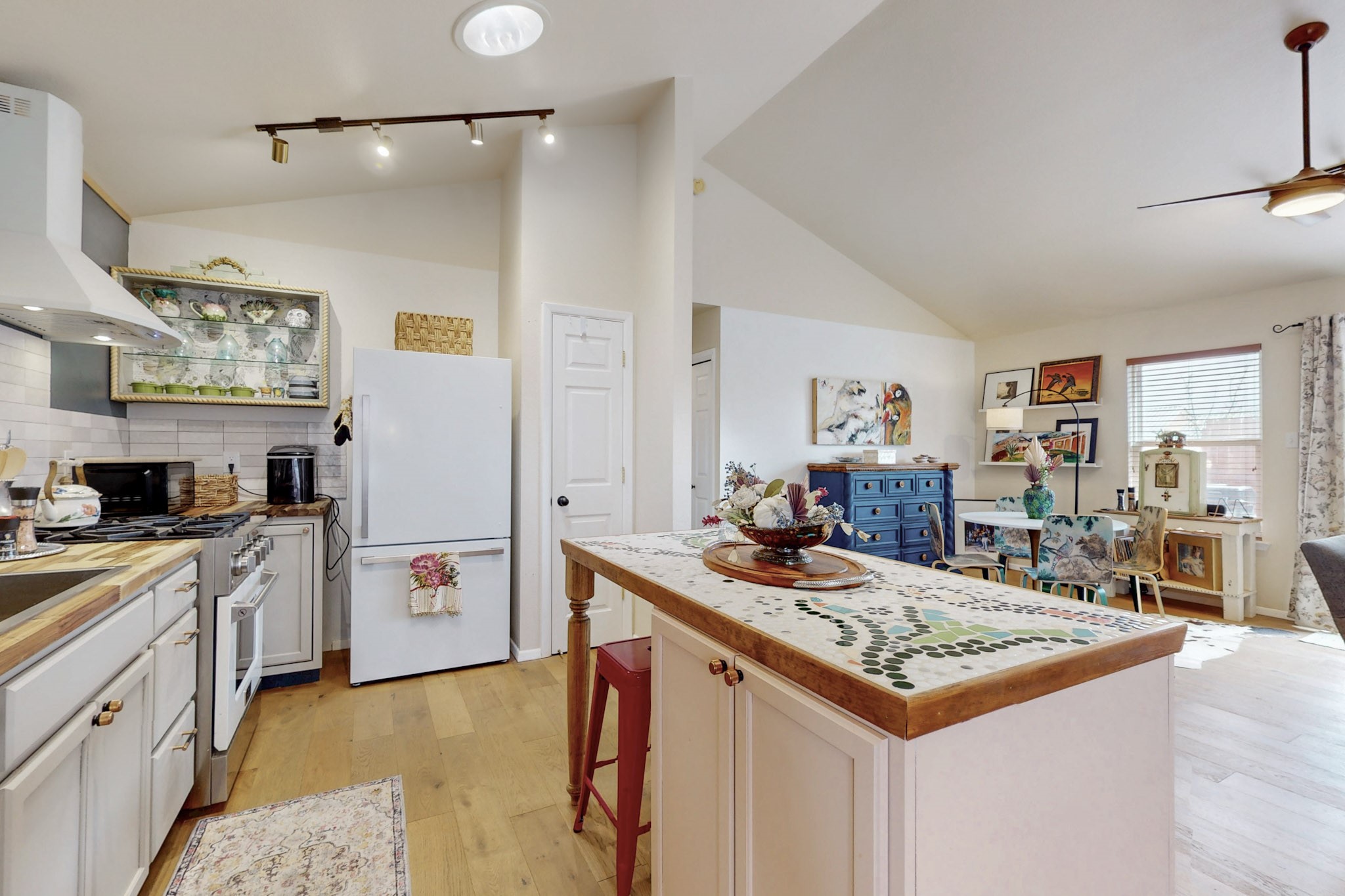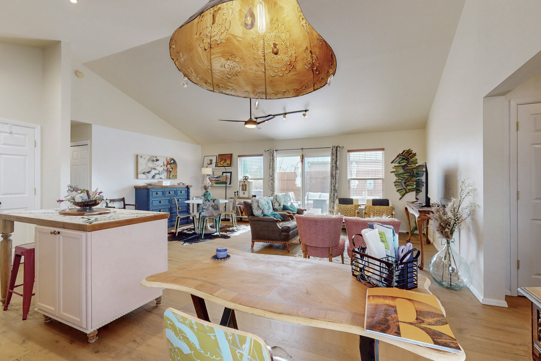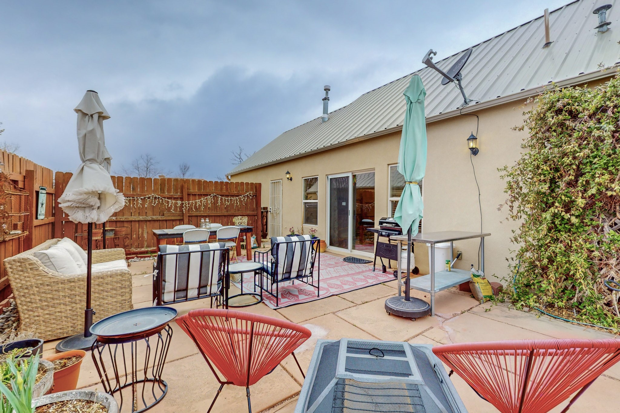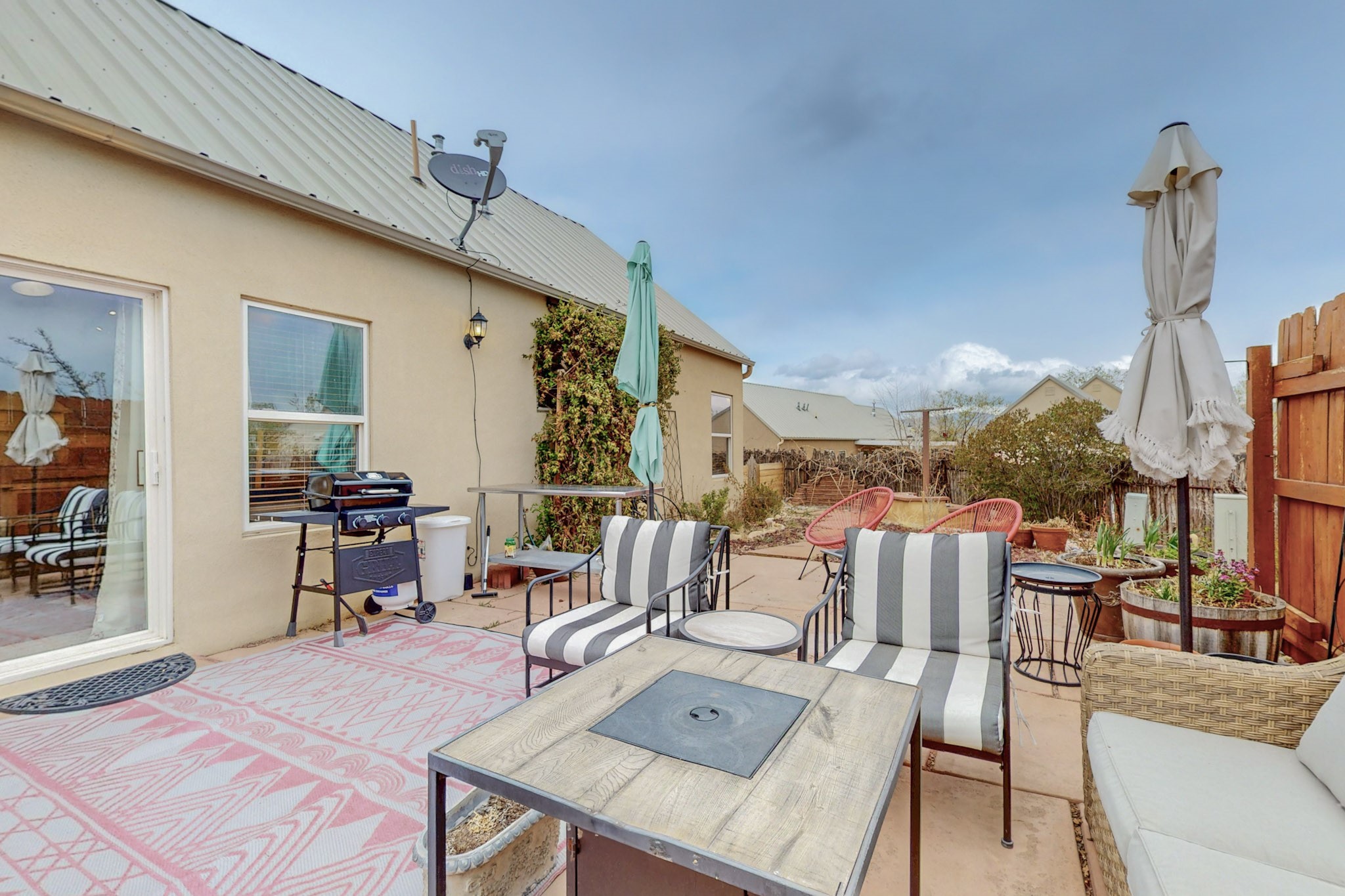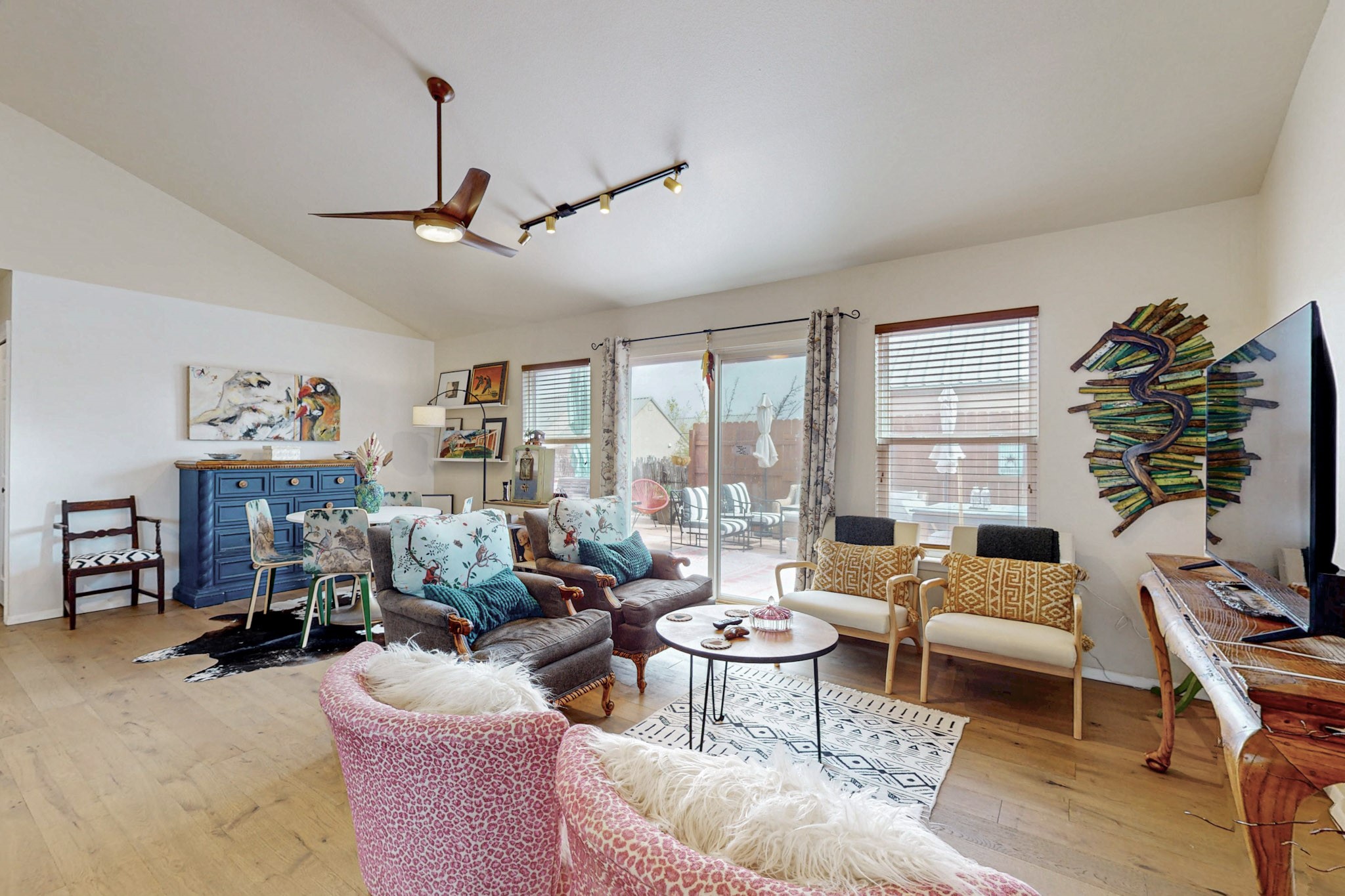 Stunning Northern New Mexico Style Home - Move-In Ready!This meticulously upgraded home blends timeless Northern New Mexico style with an eclectic southwest flair and modern amenities. Bathed in natural light, the home boasts vaulted ceilings, engineered hardwood floors, and a brand-new kitchen featuring a high-end Kucht stove. Every detail has been thoughtfully updated, from stylish light fixtures to ceiling fans, ensuring both comfort and style. The bathrooms have been tastefully updated, offering a fresh and eclectic southwest vibe.Step outside into the expansive backyard, perfect for hosting gatherings or simply relaxing. Located just minutes from schools, parks, shopping, and dining, this home combines charm with unmatched convenience.