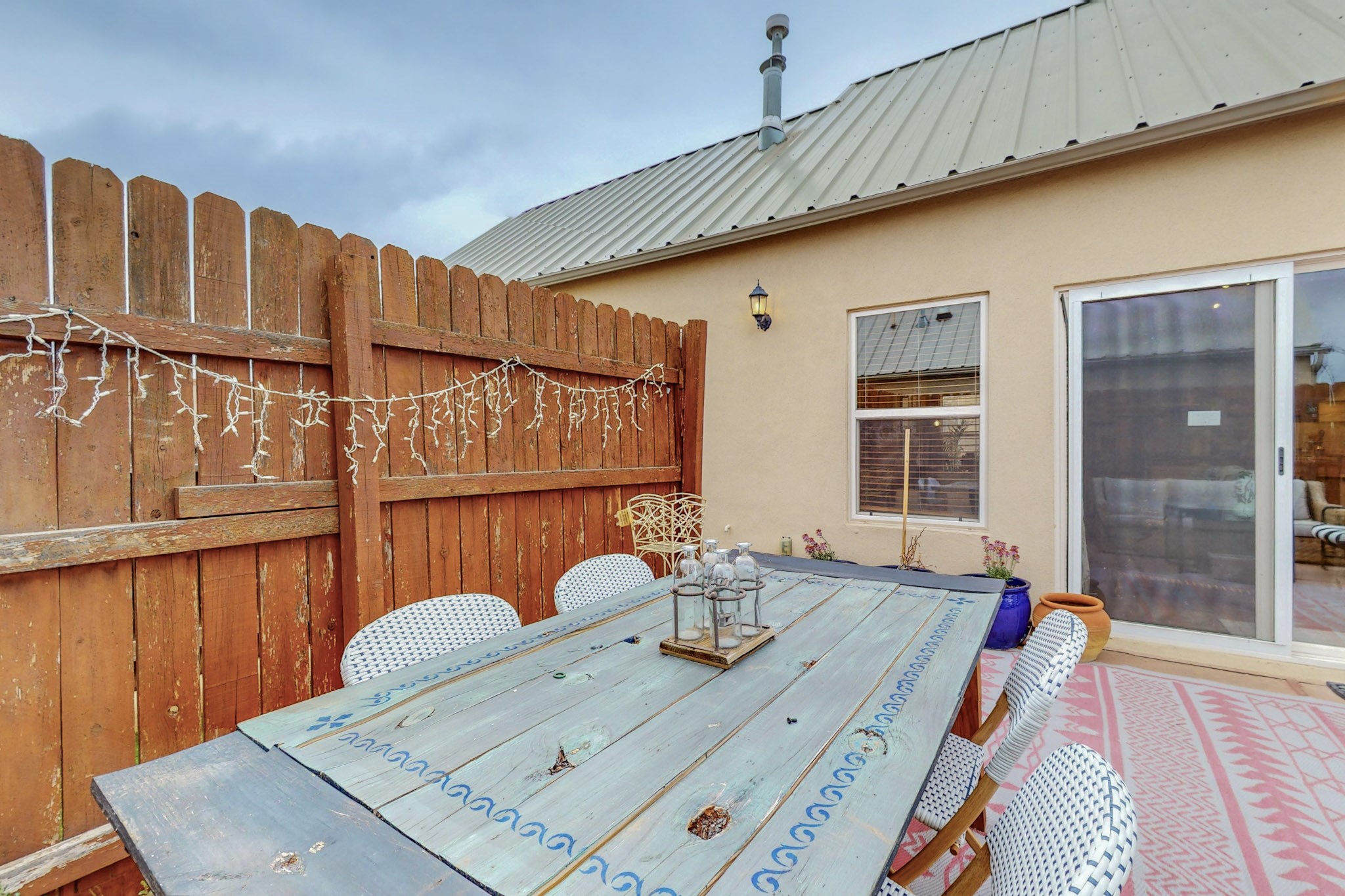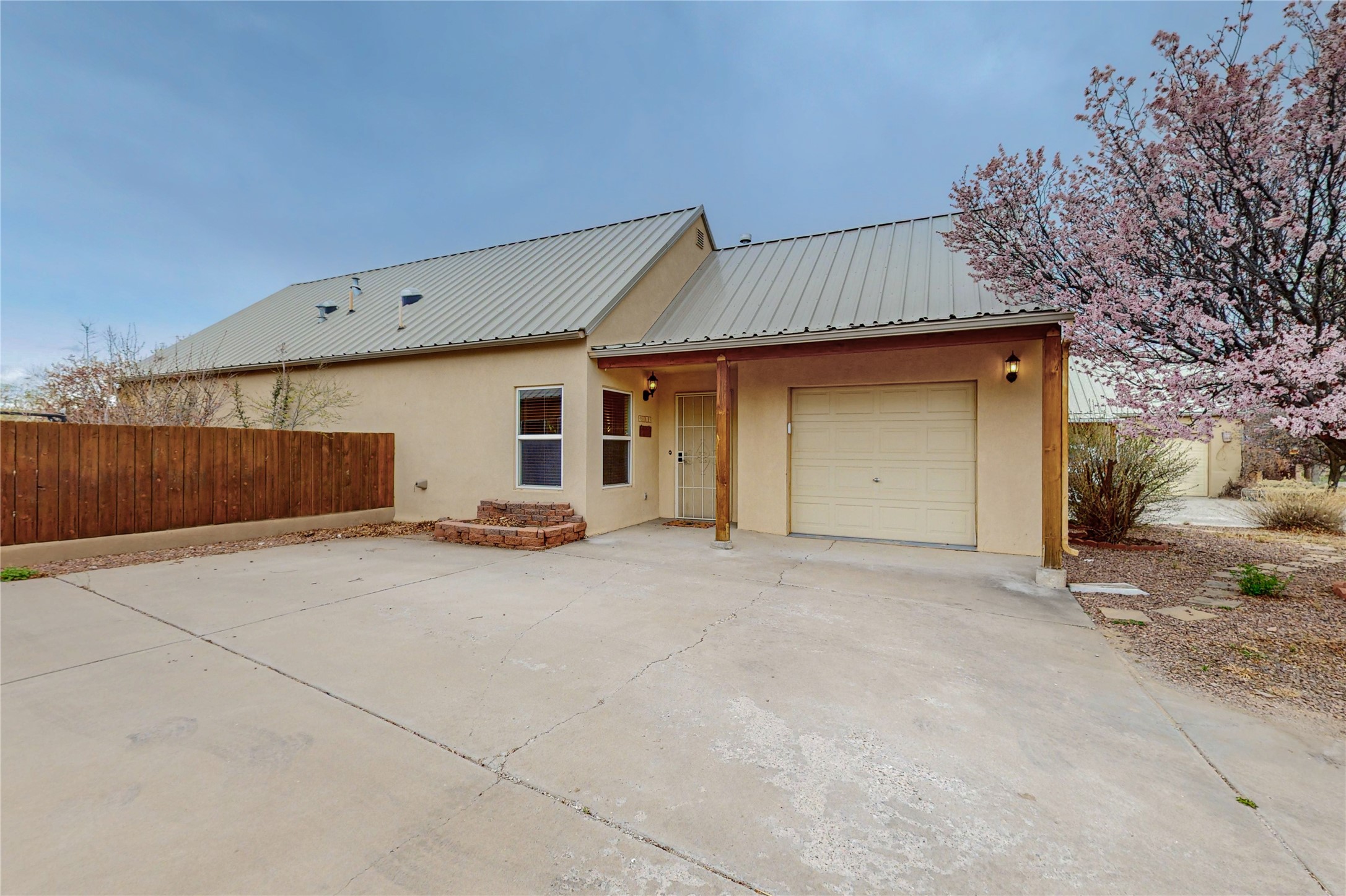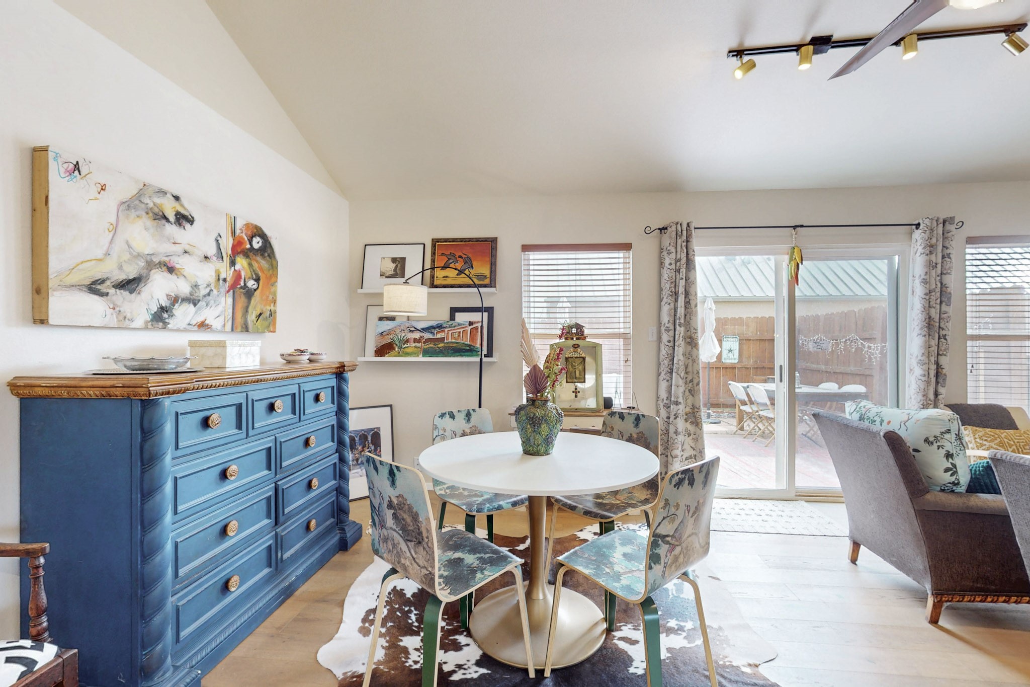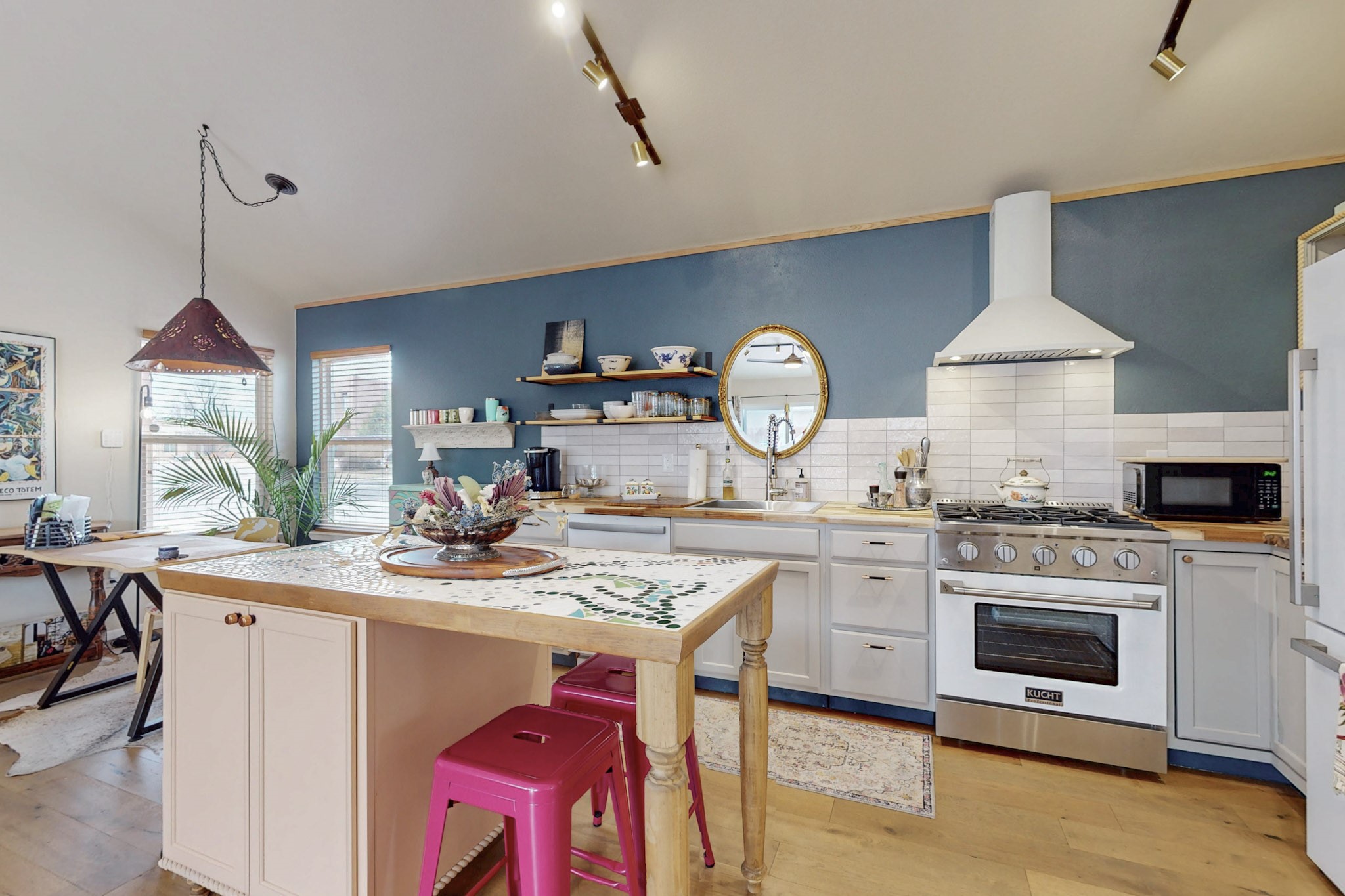 Stunning Northern New Mexico Style Home - Move-In Ready!This meticulously upgraded home blends timeless Northern New Mexico style with an eclectic southwest flair and modern amenities. Bathed in natural light, the home boasts vaulted ceilings, engineered hardwood floors, and a brand-new kitchen featuring a high-end Kucht stove. Every detail has been thoughtfully updated, from stylish light fixtures to ceiling fans, ensuring both comfort and style. The bathrooms have been tastefully updated, offering a fresh and eclectic southwest vibe.Step outside into the expansive backyard, perfect for hosting gatherings or simply relaxing. Located just minutes from schools, parks, shopping, and dining, this home combines charm with unmatched convenience.
