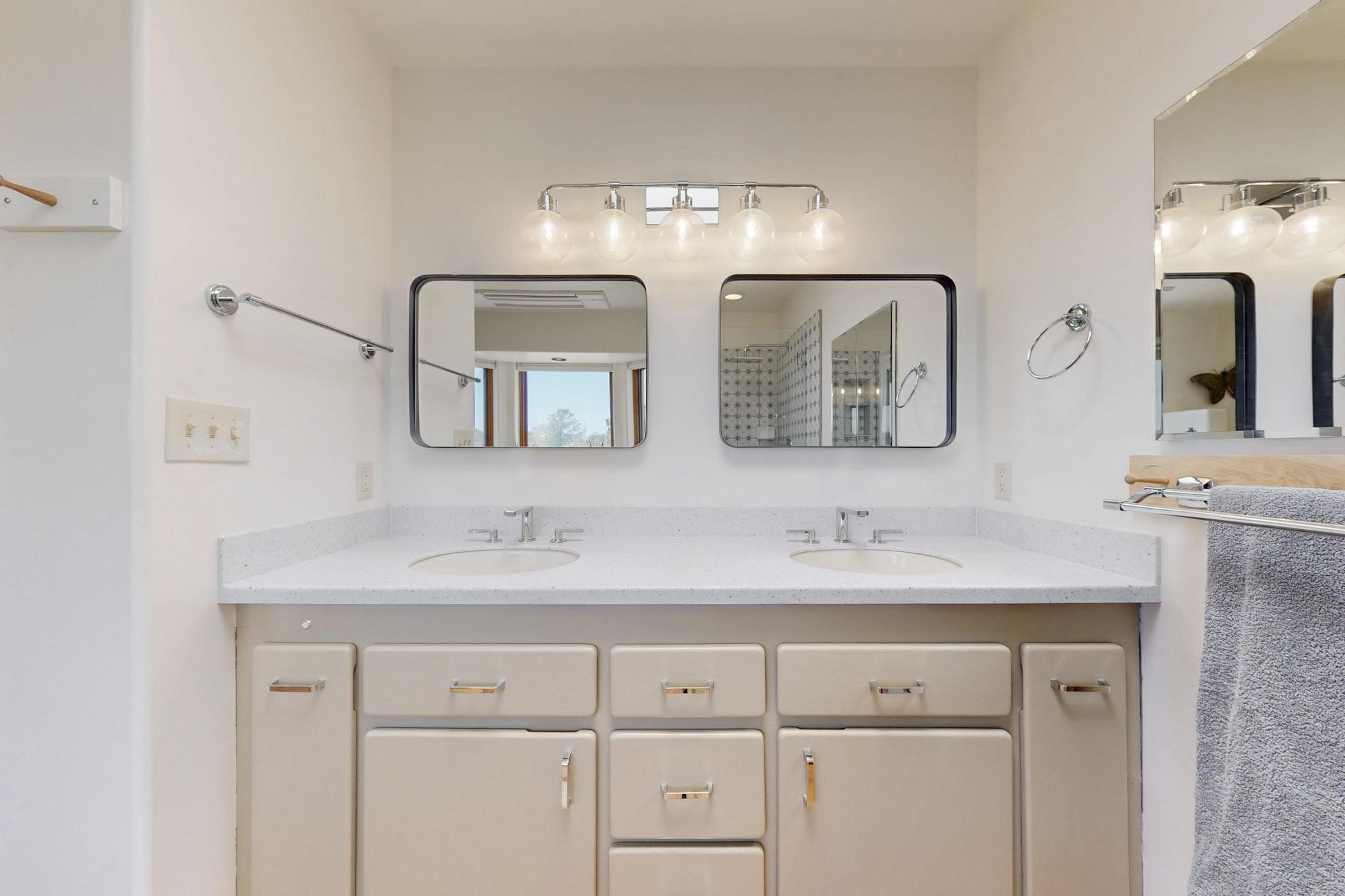 11 Chusco, is a wonderful passive solar home with paved access from Avenida Eldorado at the beginning of the subdivision. The home features living room with kiva fireplace, vigas and glass doors opening to the rear courtyard, formal dining room, Chef's kitchen, mud room, 3 bedrooms and 2 full baths. Recent upgrades include mini splits throughout, new roof in 2022, granite countertops & backsplashes in the kitchen and bathrooms, new Pella windows and appliances. The south side has thick trombe walls, creating both coolness in the summer and additional heat in the winter. The home is light and bright with clerestory windows for the rear bedrooms and large kitchen skylight in the kitchen. Both the front entry and rear have walled courtyards with extensive landscaping - fruit trees, perennial flowers, bushes as well as two storage sheds. There are Sangre de Cristo views from the front of the home and Sunset views from the back. For folks seeking a quality Eldorado home, 11 Chusco could be your place.