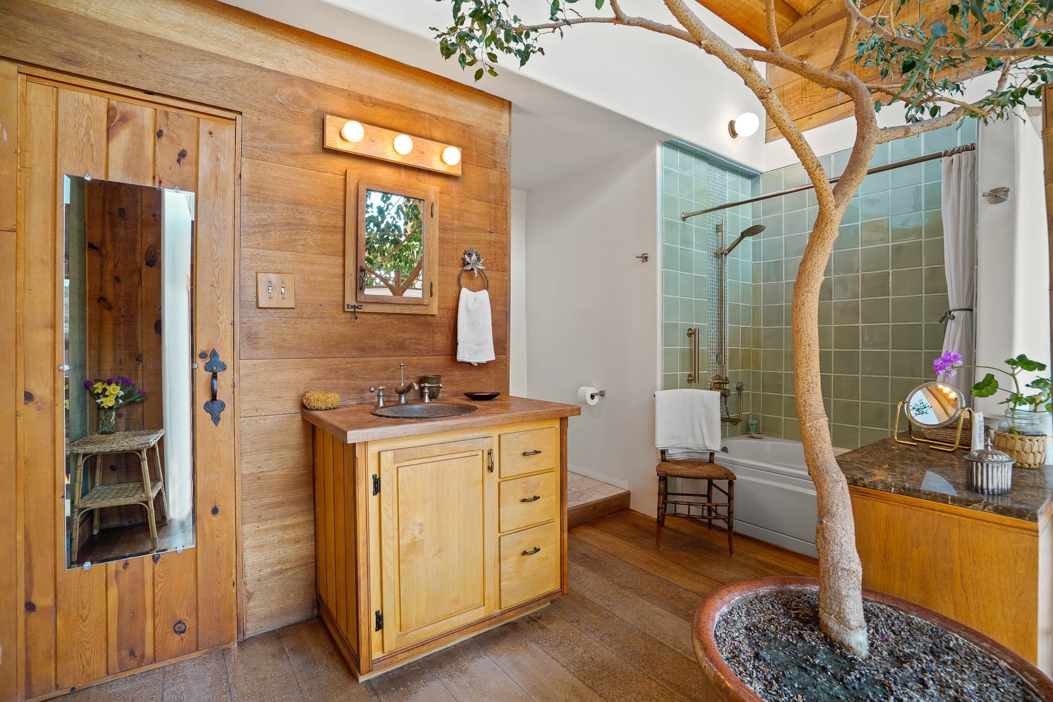 Incredible opportunity to own a super versatile getaway in the heart of La Cienega designed by notable architect Robert Zachry! Partial adobe home is an open concept 1 bed + flex space/2 bath oasis on over half an acre, surrounded by a vineyard, and ~3200sf of living. Entry foyer flows to large/wide family room & eat-in kitchen w/walk in pantry. Bright primary bedroom with large attached office/flex room, good closet space, & spa like passive solar bathroom w/brick flooring, tall ceilings, and windows/sunlight galore. Immense living room/open flex room + sunroom (with separate entrance) with concrete flooring could easily have a more traditional 2nd bedroom setup w/space for a full living room or be a separate studio/bonus space for an artist/musician/creative or roommate situation. Addt'l features include an open gated parking setup w/potential for garage or carport, chicken coop, acequia rights, regulated community system water, and separate storage outbuilding. Possible for multiple buyers from income or investment use, live/work hybrid, part time residents, artists/musicians/creatives/etc, or make your long term home for years to come