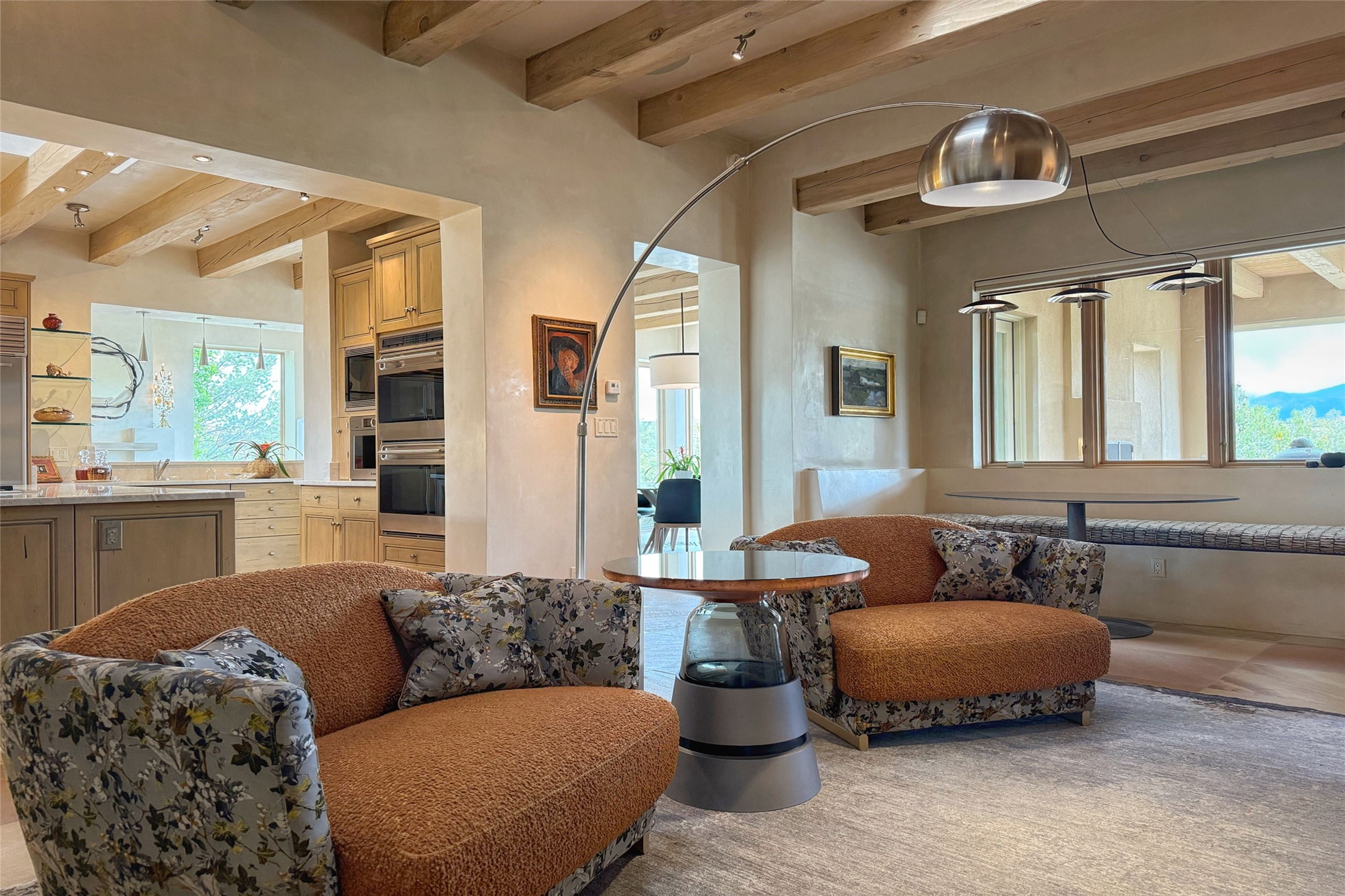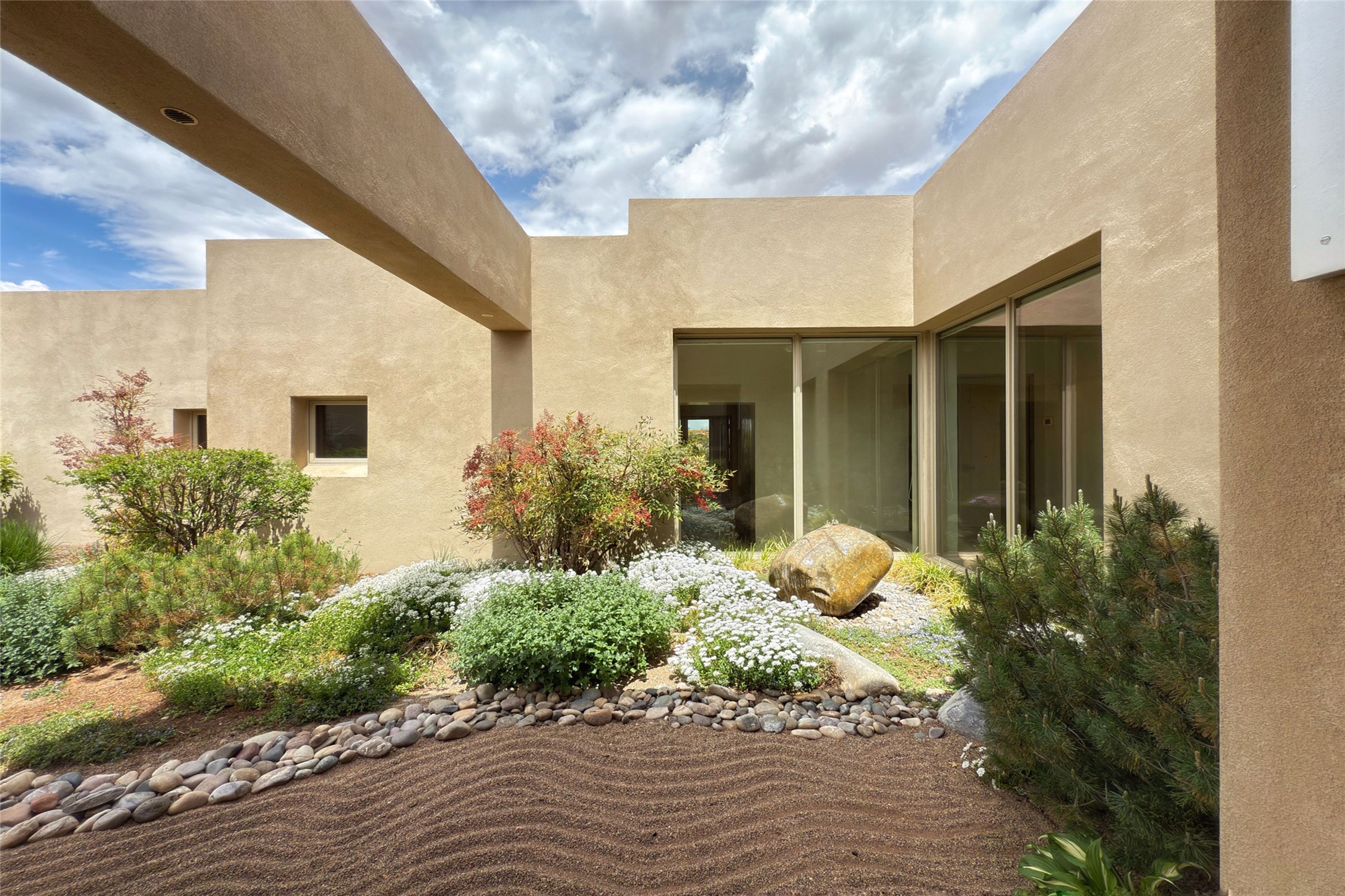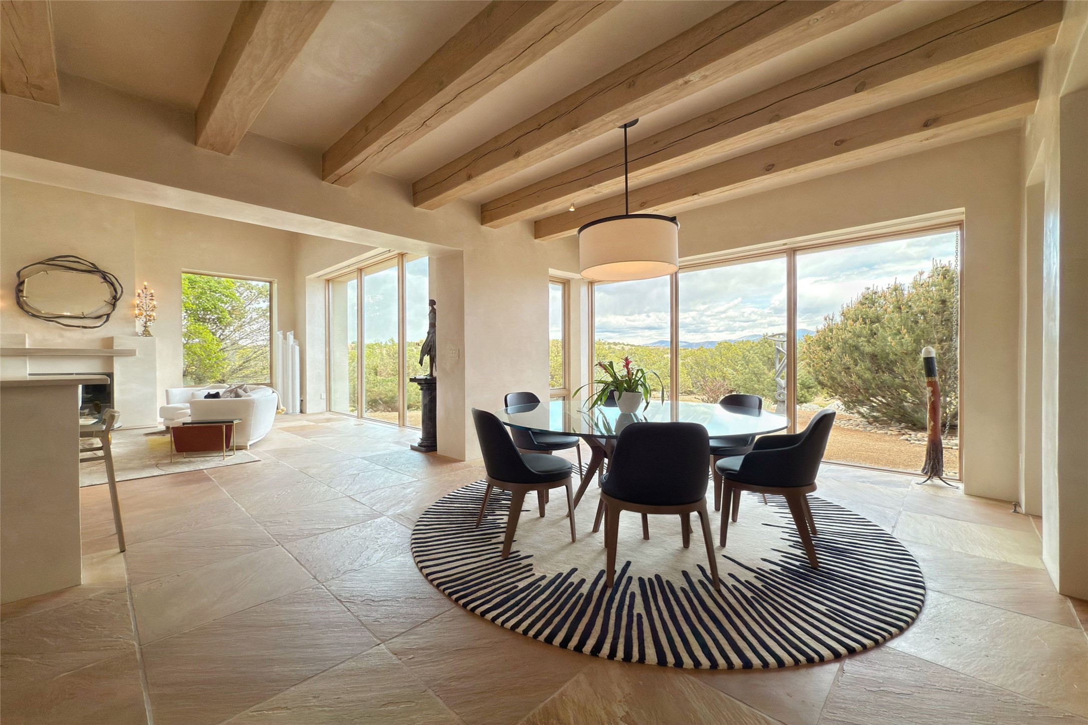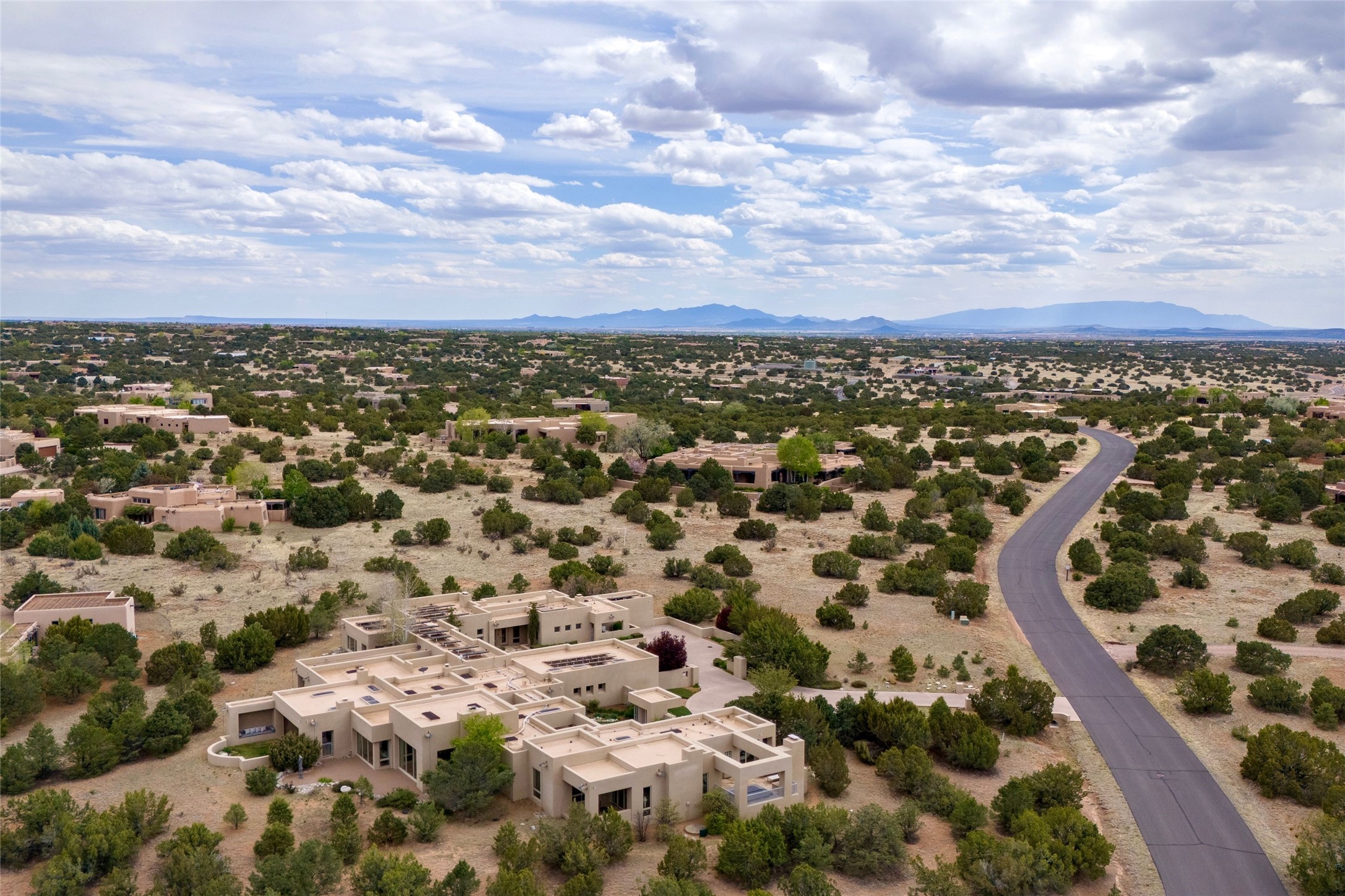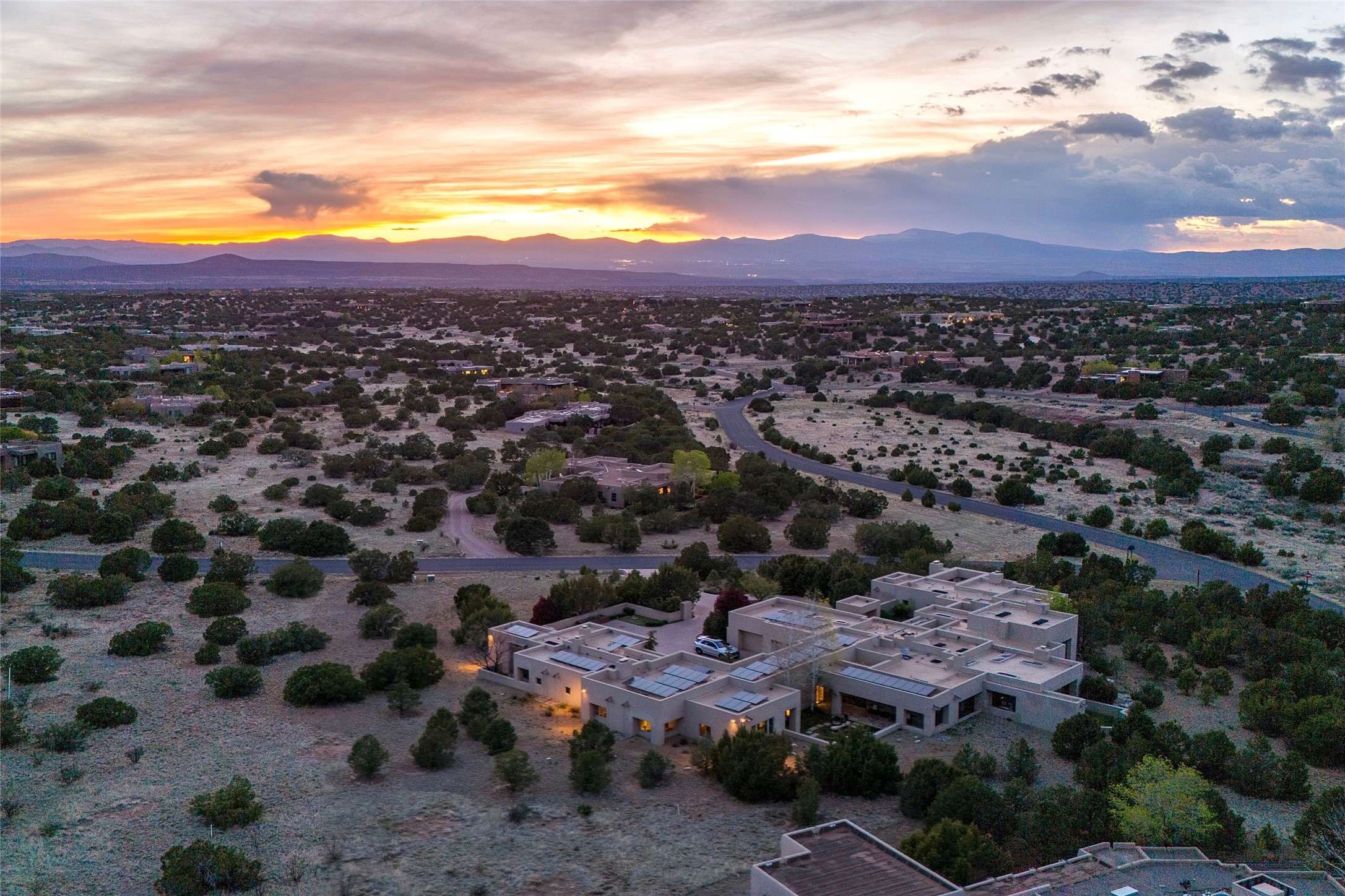 Prestigious Las Campanas Estate. Sophisticated Soft Contemporary on a Double Lot- over 3 acres for privacy.Welcome to an extraordinary estate built by Kim Dressel. Featuring a circular front drive, enclosed zen-like courtyard, and large separate motor court. With sweeping Sangre de Cristo views, this masterpiece blends elegance with tranquility and superb attention to detail. The entire residence is filled with natural light and augmented with custom lighting to showcase the art lover's collection.Interiors are graced with vigas and Desert Indian Sandstone floors. A total of 9 fireplaces (indoor and outdoor) provide warmth and charm. A generous entry hall, framed with alabaster sculptural lighting opens to the Great Room, anchored with a center fireplace and inspired by a bank of floor to ceiling windows that showcase the Sangre de Cristos. This space flaunts soaring ceilings and clerestory windows that flood the space with light. A gourmet kitchen features a large center island with Taj Mahal countertops, Sub-Zero/Wolf appliances, and opens to adjoining formal dining area and a cozy family room. A lavish primary suite offers a fireplace and an east facingportal complete with hot tub, fireplace and mountain views. Primary bath includes dual vanities, steam shower, soaking tub, dry sauna and custom closet. Adjacent home gym for convenience. Transition to the second wing through an impressive Gallery Hall designed for private art collections, exhibits and concert entertaining. A dedicated wine tasting space and sculpture garden complete the gallery.The secondary residence area includes large media room,office, two ensuite bedrooms with fireplaces and patios.Multiple outdoor spaces for indoor/outdoor living and entertaining including a deep covered portal with skylights, water feature, built-in grill and banco seating.Sparing no expense, this architectural gem delivers high-end fit and finishes throughout. The ultimate in style and serene luxury.