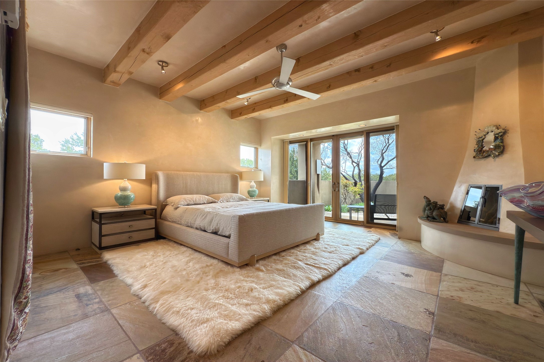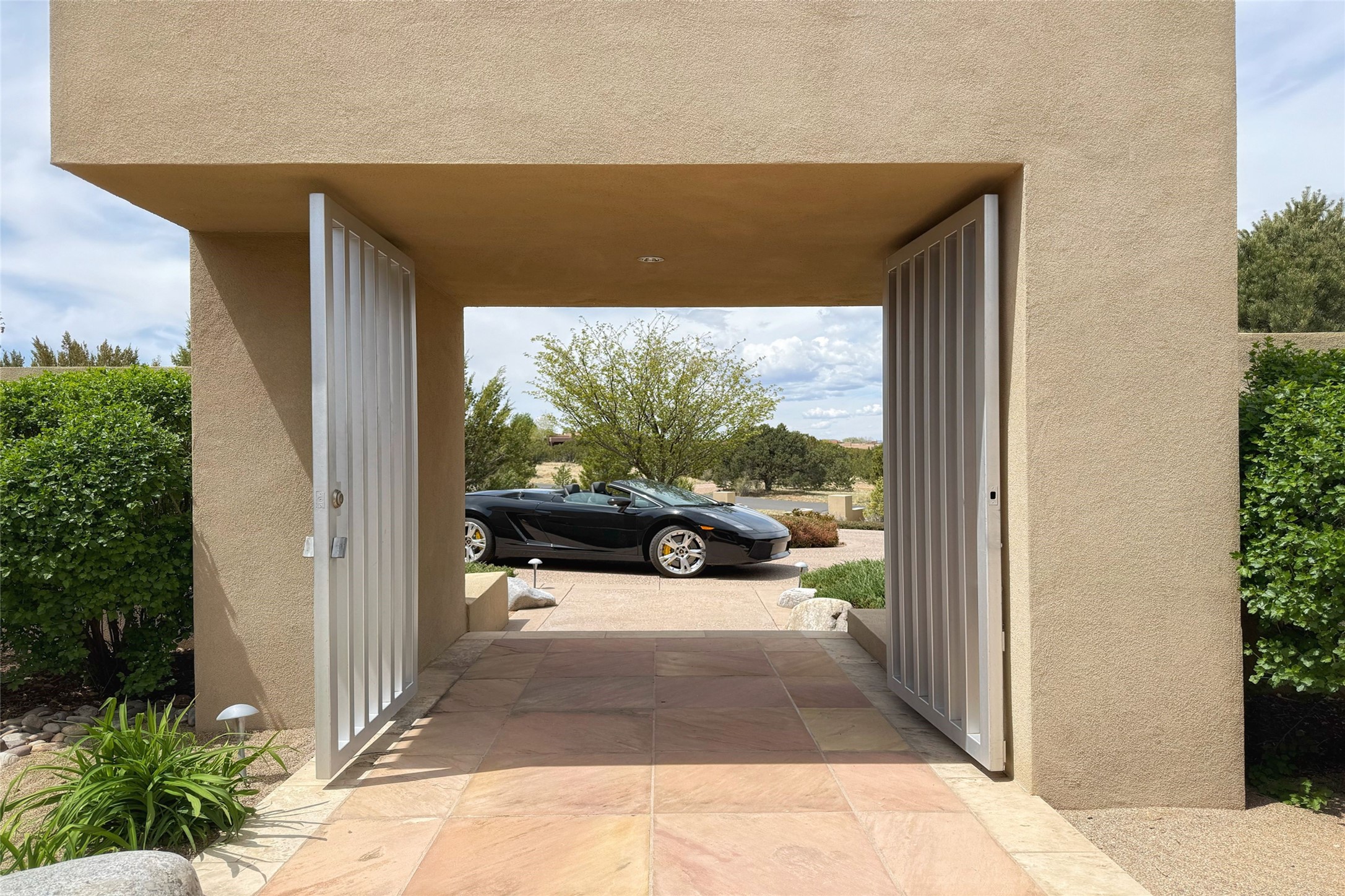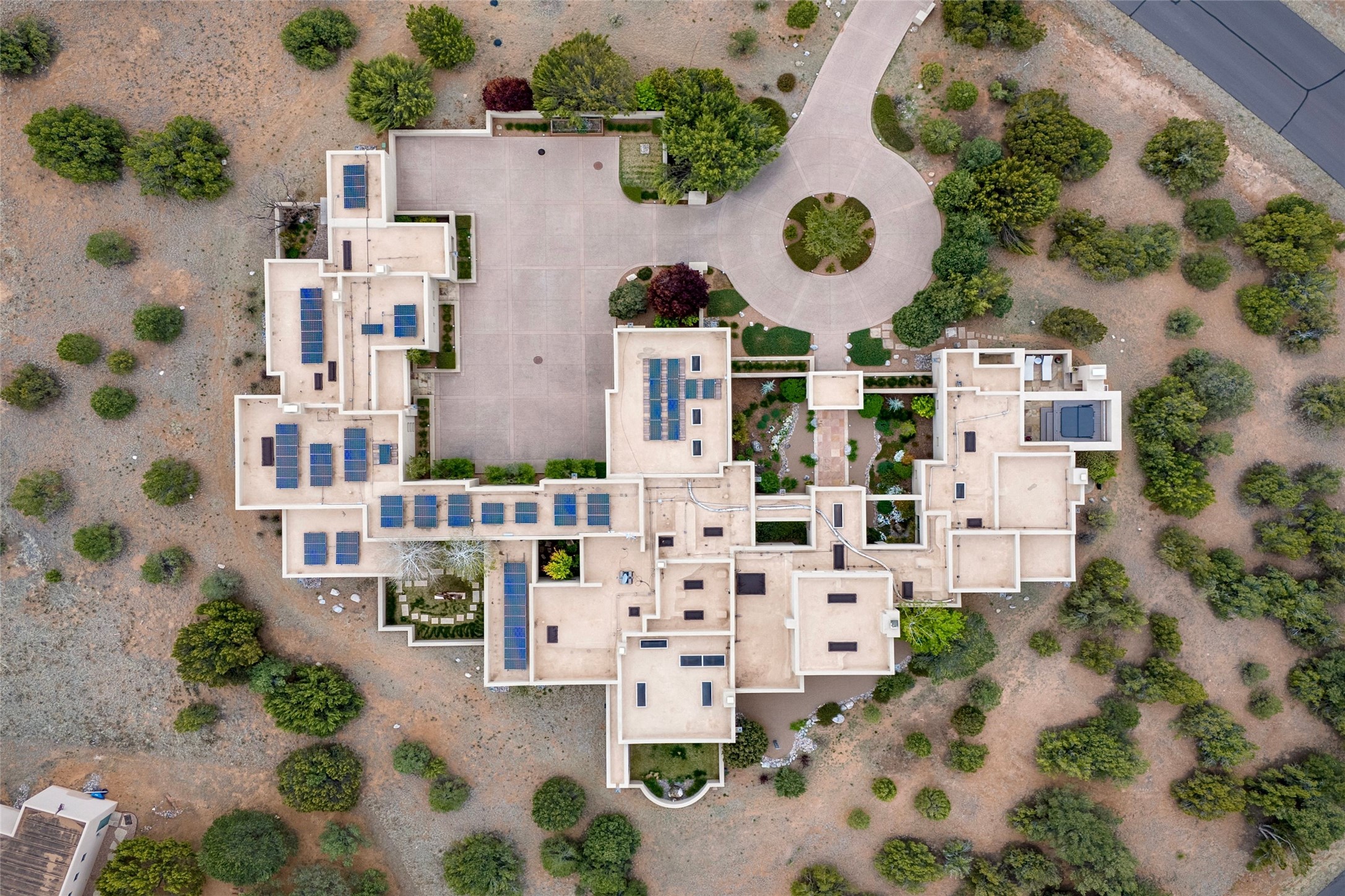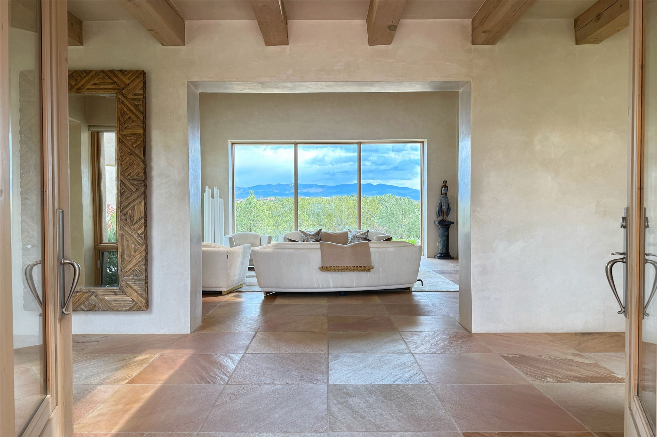 Prestigious Las Campanas Estate. Sophisticated Soft Contemporary on a Double Lot- over 3 acres for privacy.Welcome to an extraordinary estate built by Kim Dressel. Featuring a circular front drive, enclosed zen-like courtyard, and large separate motor court. With sweeping Sangre de Cristo views, this masterpiece blends elegance with tranquility and superb attention to detail. The entire residence is filled with natural light and augmented with custom lighting to showcase the art lover's collection.Interiors are graced with vigas and Desert Indian Sandstone floors. A total of 9 fireplaces (indoor and outdoor) provide warmth and charm. A generous entry hall, framed with alabaster sculptural lighting opens to the Great Room, anchored with a center fireplace and inspired by a bank of floor to ceiling windows that showcase the Sangre de Cristos. This space flaunts soaring ceilings and clerestory windows that flood the space with light. A gourmet kitchen features a large center island with Taj Mahal countertops, Sub-Zero/Wolf appliances, and opens to adjoining formal dining area and a cozy family room. A lavish primary suite offers a fireplace and an east facingportal complete with hot tub, fireplace and mountain views. Primary bath includes dual vanities, steam shower, soaking tub, dry sauna and custom closet. Adjacent home gym for convenience. Transition to the second wing through an impressive Gallery Hall designed for private art collections, exhibits and concert entertaining. A dedicated wine tasting space and sculpture garden complete the gallery.The secondary residence area includes large media room,office, two ensuite bedrooms with fireplaces and patios.Multiple outdoor spaces for indoor/outdoor living and entertaining including a deep covered portal with skylights, water feature, built-in grill and banco seating.Sparing no expense, this architectural gem delivers high-end fit and finishes throughout. The ultimate in style and serene luxury.