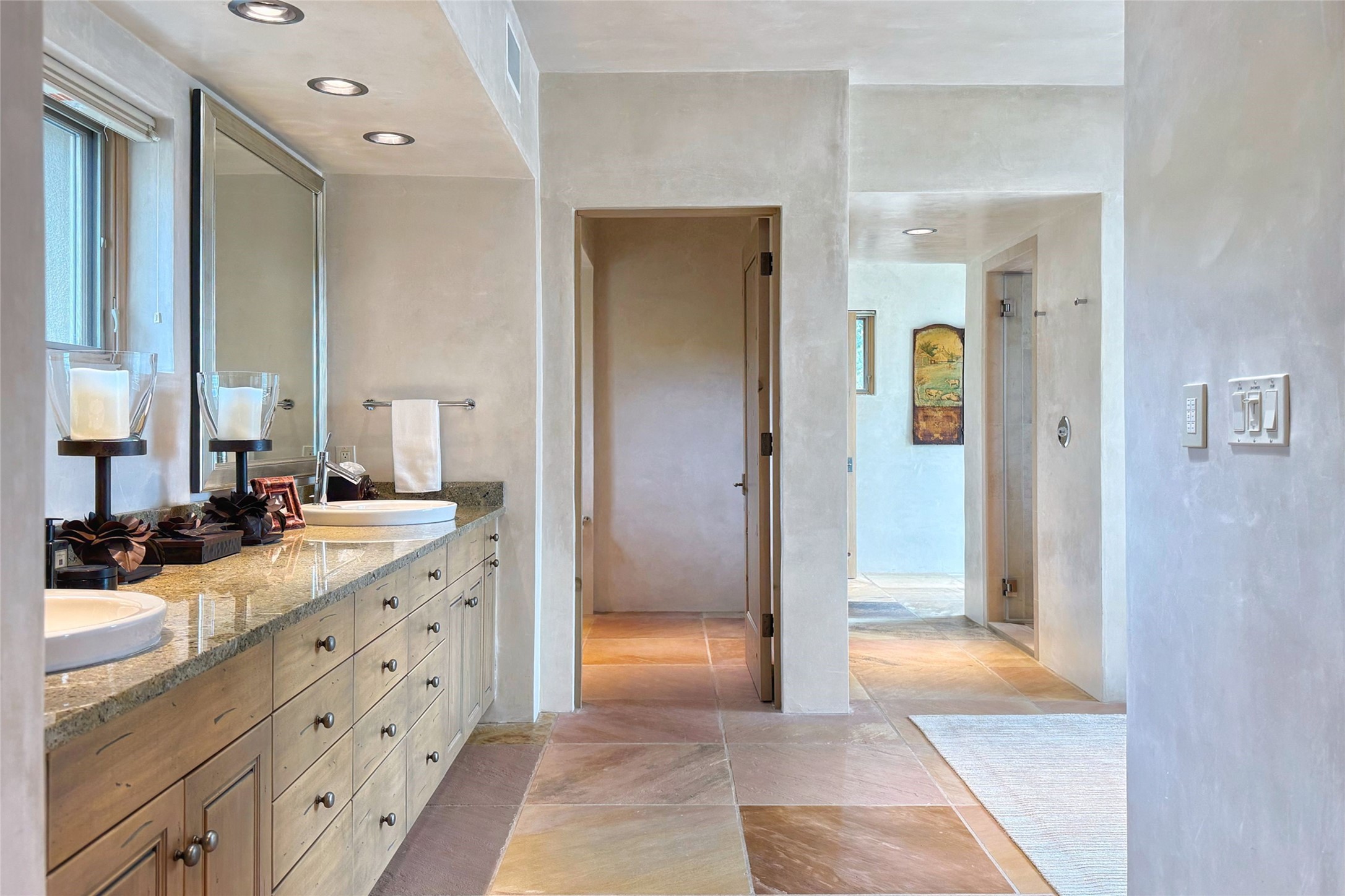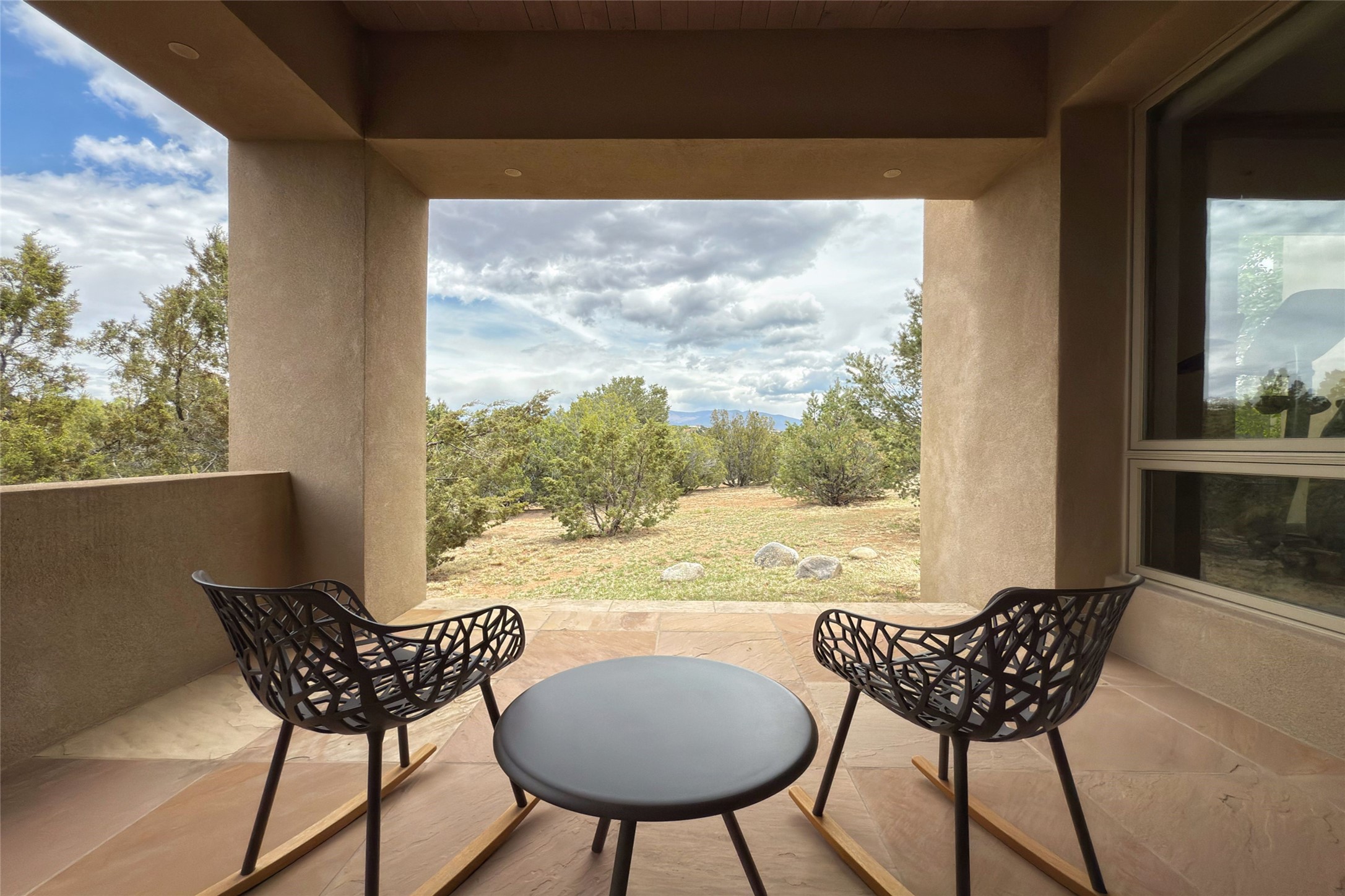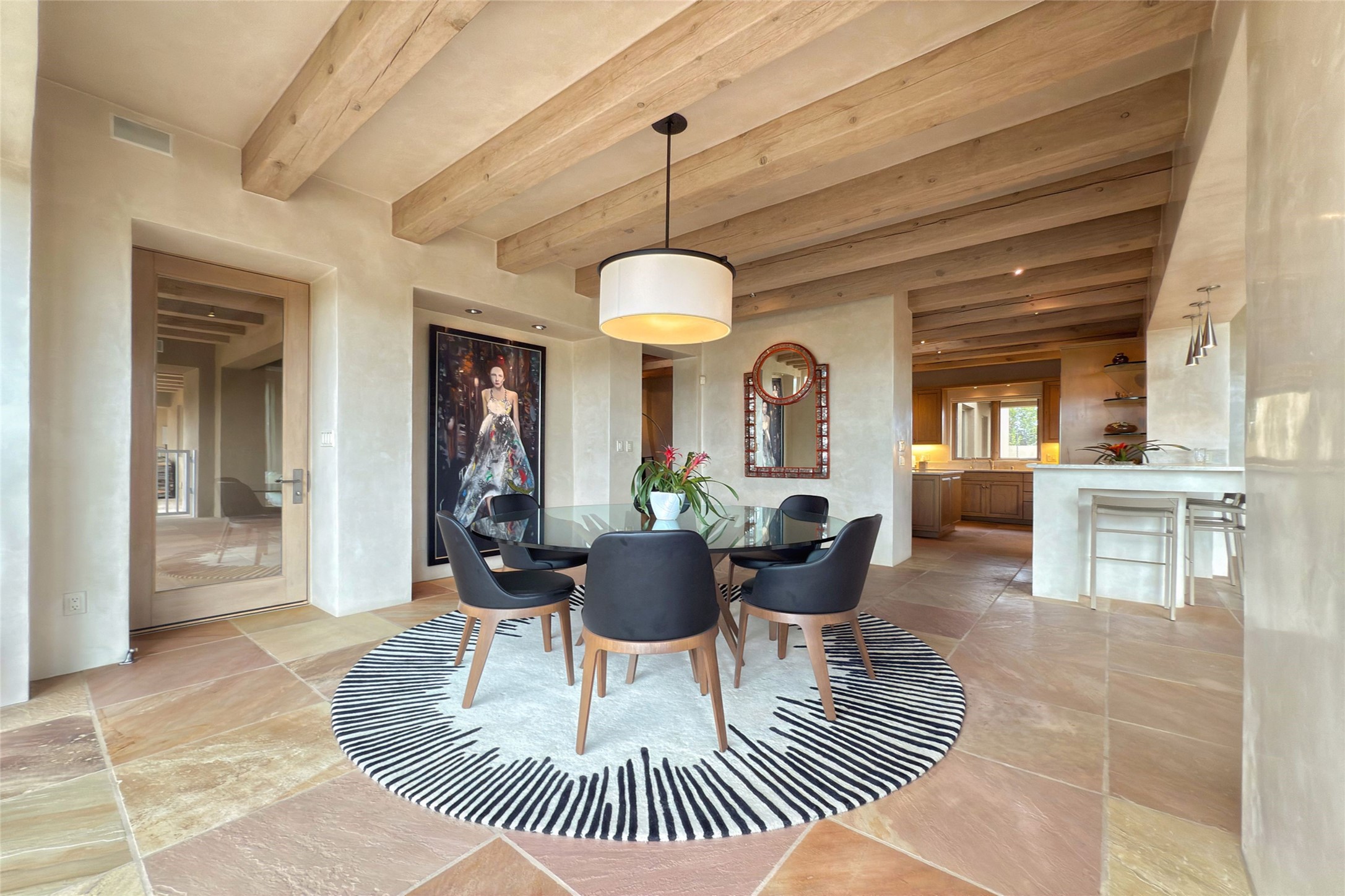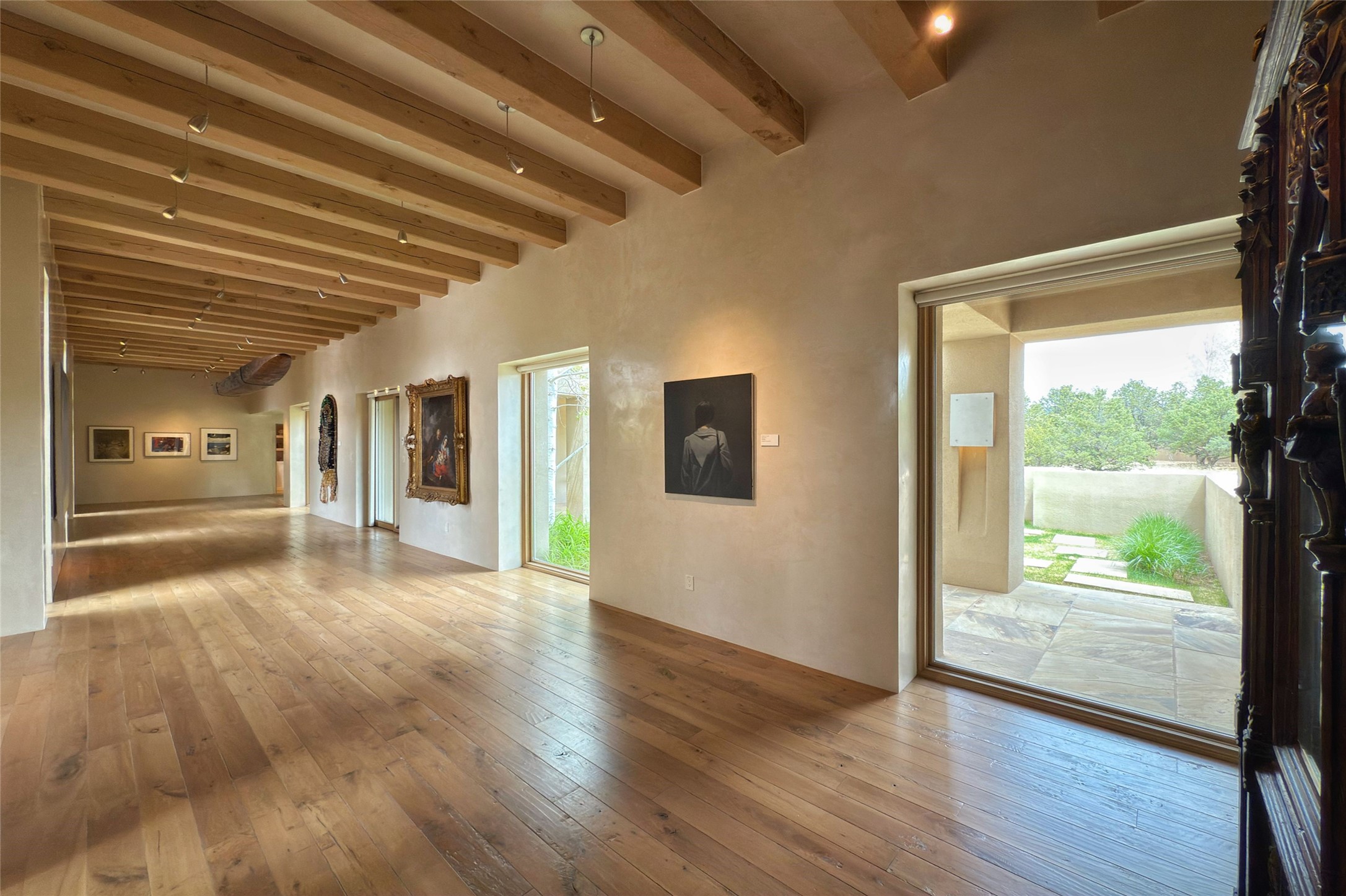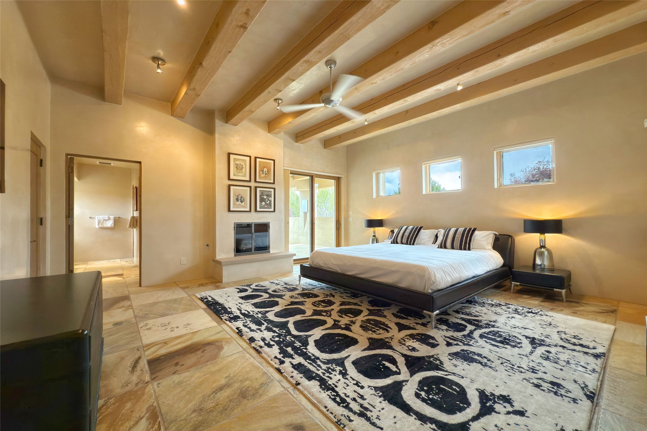 Prestigious Las Campanas Estate. Sophisticated Soft Contemporary on a Double Lot- over 3 acres for privacy.Welcome to an extraordinary estate built by Kim Dressel. Featuring a circular front drive, enclosed zen-like courtyard, and large separate motor court. With sweeping Sangre de Cristo views, this masterpiece blends elegance with tranquility and superb attention to detail. The entire residence is filled with natural light and augmented with custom lighting to showcase the art lover's collection.Interiors are graced with vigas and Desert Indian Sandstone floors. A total of 9 fireplaces (indoor and outdoor) provide warmth and charm. A generous entry hall, framed with alabaster sculptural lighting opens to the Great Room, anchored with a center fireplace and inspired by a bank of floor to ceiling windows that showcase the Sangre de Cristos. This space flaunts soaring ceilings and clerestory windows that flood the space with light. A gourmet kitchen features a large center island with Taj Mahal countertops, Sub-Zero/Wolf appliances, and opens to adjoining formal dining area and a cozy family room. A lavish primary suite offers a fireplace and an east facingportal complete with hot tub, fireplace and mountain views. Primary bath includes dual vanities, steam shower, soaking tub, dry sauna and custom closet. Adjacent home gym for convenience. Transition to the second wing through an impressive Gallery Hall designed for private art collections, exhibits and concert entertaining. A dedicated wine tasting space and sculpture garden complete the gallery.The secondary residence area includes large media room,office, two ensuite bedrooms with fireplaces and patios.Multiple outdoor spaces for indoor/outdoor living and entertaining including a deep covered portal with skylights, water feature, built-in grill and banco seating.Sparing no expense, this architectural gem delivers high-end fit and finishes throughout. The ultimate in style and serene luxury.