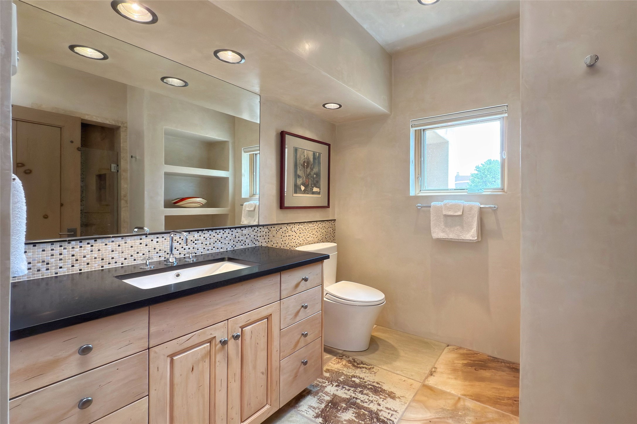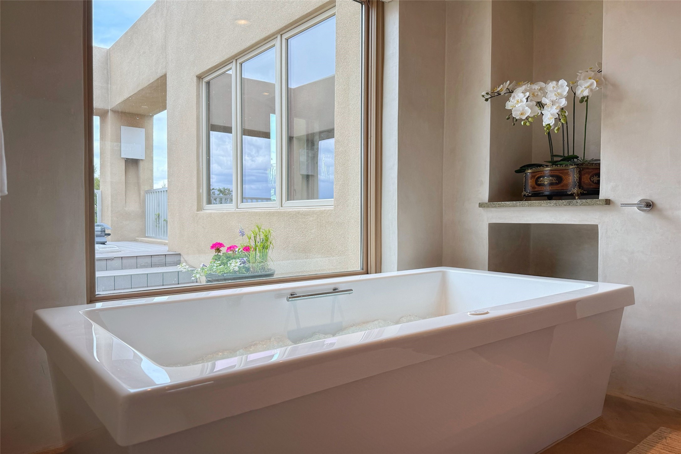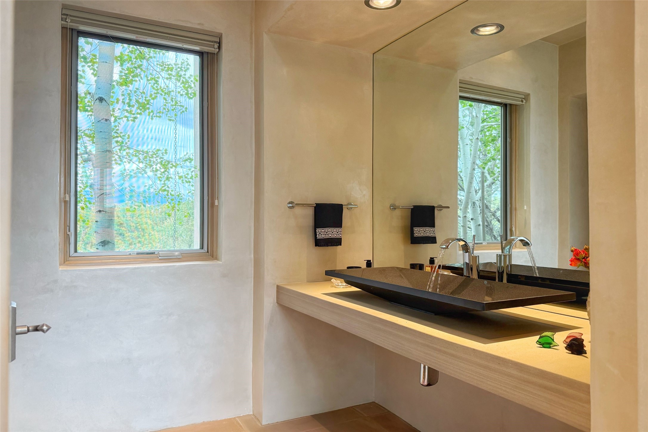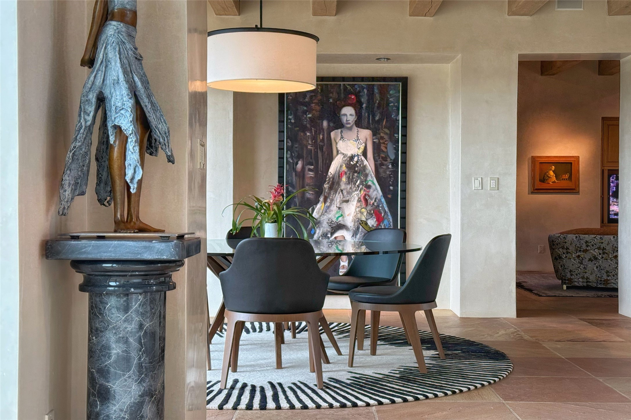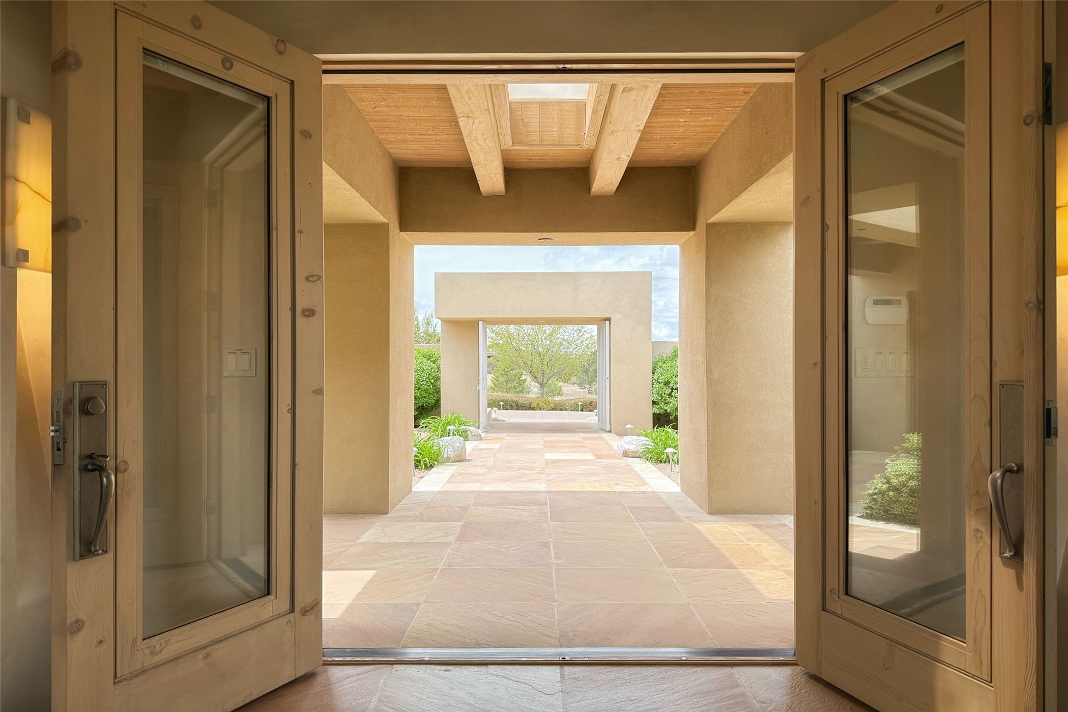 Prestigious Las Campanas Estate. Sophisticated Soft Contemporary on a Double Lot- over 3 acres for privacy.Welcome to an extraordinary estate built by Kim Dressel. Featuring a circular front drive, enclosed zen-like courtyard, and large separate motor court. With sweeping Sangre de Cristo views, this masterpiece blends elegance with tranquility and superb attention to detail. The entire residence is filled with natural light and augmented with custom lighting to showcase the art lover's collection.Interiors are graced with vigas and Desert Indian Sandstone floors. A total of 9 fireplaces (indoor and outdoor) provide warmth and charm. A generous entry hall, framed with alabaster sculptural lighting opens to the Great Room, anchored with a center fireplace and inspired by a bank of floor to ceiling windows that showcase the Sangre de Cristos. This space flaunts soaring ceilings and clerestory windows that flood the space with light. A gourmet kitchen features a large center island with Taj Mahal countertops, Sub-Zero/Wolf appliances, and opens to adjoining formal dining area and a cozy family room. A lavish primary suite offers a fireplace and an east facingportal complete with hot tub, fireplace and mountain views. Primary bath includes dual vanities, steam shower, soaking tub, dry sauna and custom closet. Adjacent home gym for convenience. Transition to the second wing through an impressive Gallery Hall designed for private art collections, exhibits and concert entertaining. A dedicated wine tasting space and sculpture garden complete the gallery.The secondary residence area includes large media room,office, two ensuite bedrooms with fireplaces and patios.Multiple outdoor spaces for indoor/outdoor living and entertaining including a deep covered portal with skylights, water feature, built-in grill and banco seating.Sparing no expense, this architectural gem delivers high-end fit and finishes throughout. The ultimate in style and serene luxury.