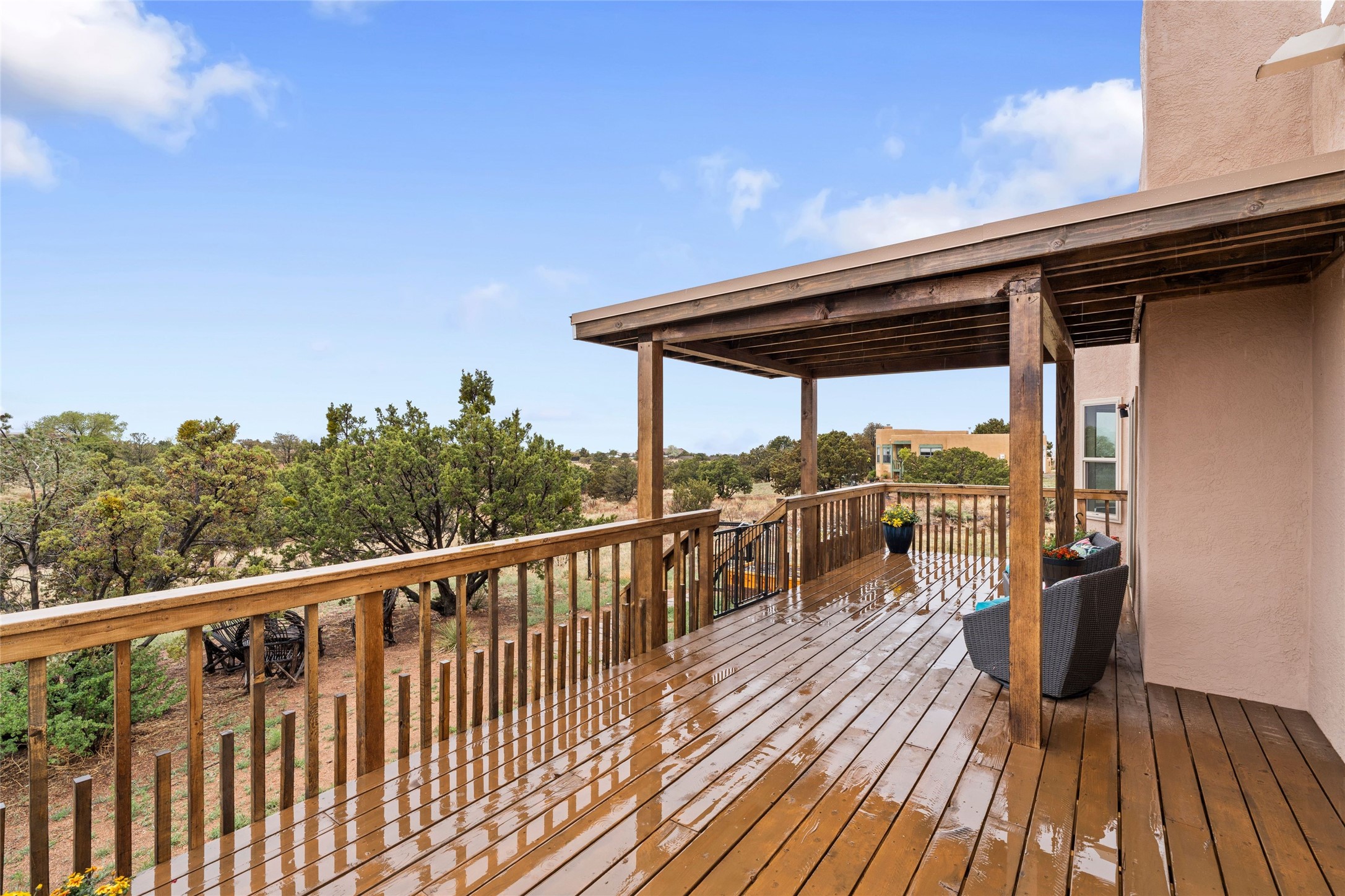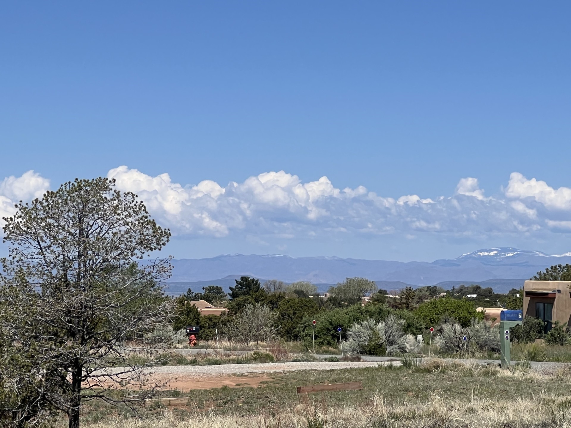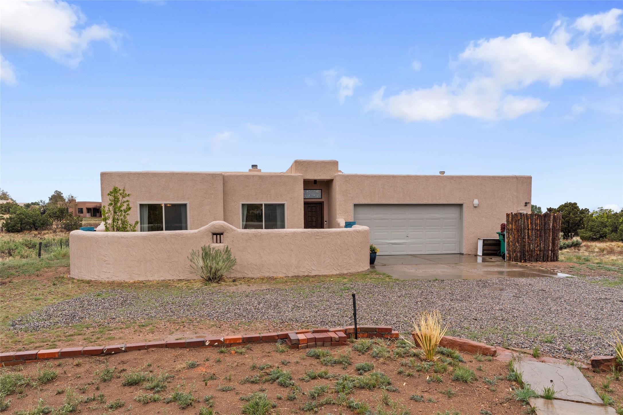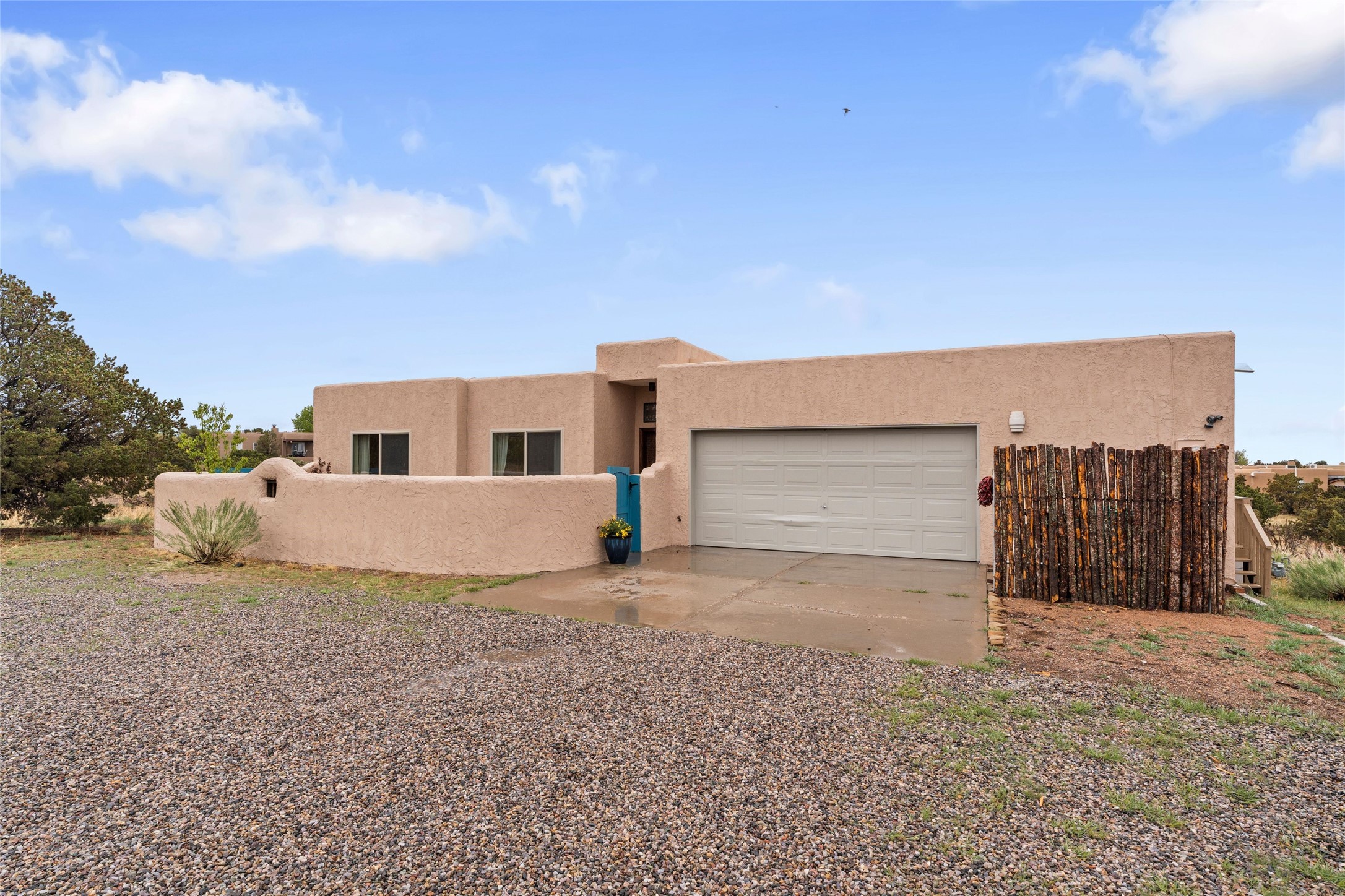 Here's a little pearl on a pretty lot with lovely views of the Sandia/Ortiz and Jemez mountains and the Sangre foothills. Updated by the current owners, this sweet home is filled with natural light, and move-in ready. Features include a six-year-old membrane roof, well-maintained stucco, new windows in 2024, new central air conditioning, new appliances, and a big finished garage with workshop area. Great location on all paved roads in the front of Eldorado, near the Agora and La Tienda shopping malls, and 15 minutes to the Plaza. Una Casa Mueca!