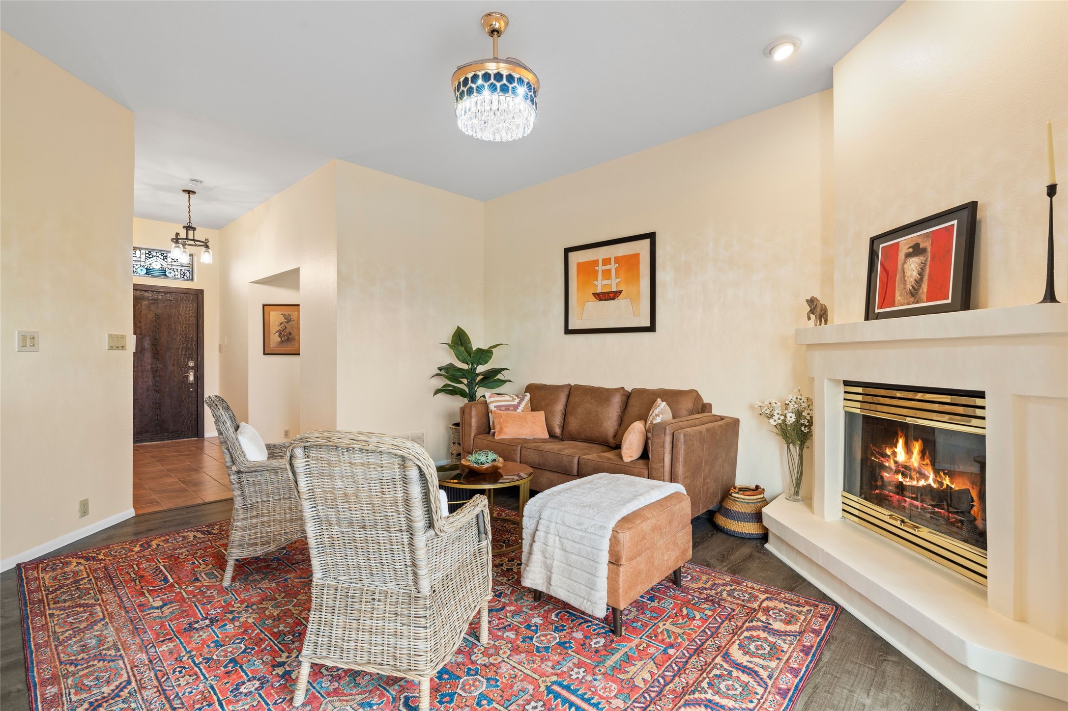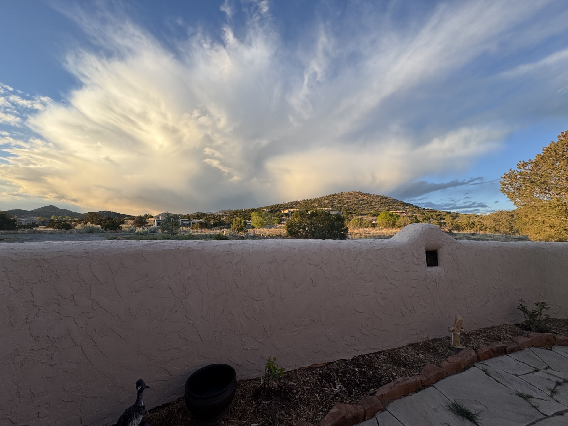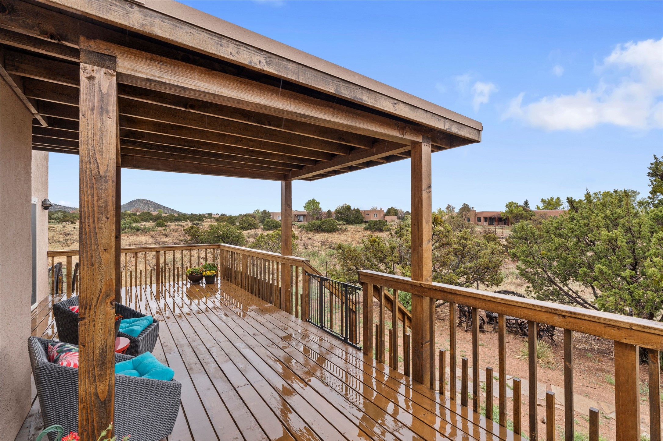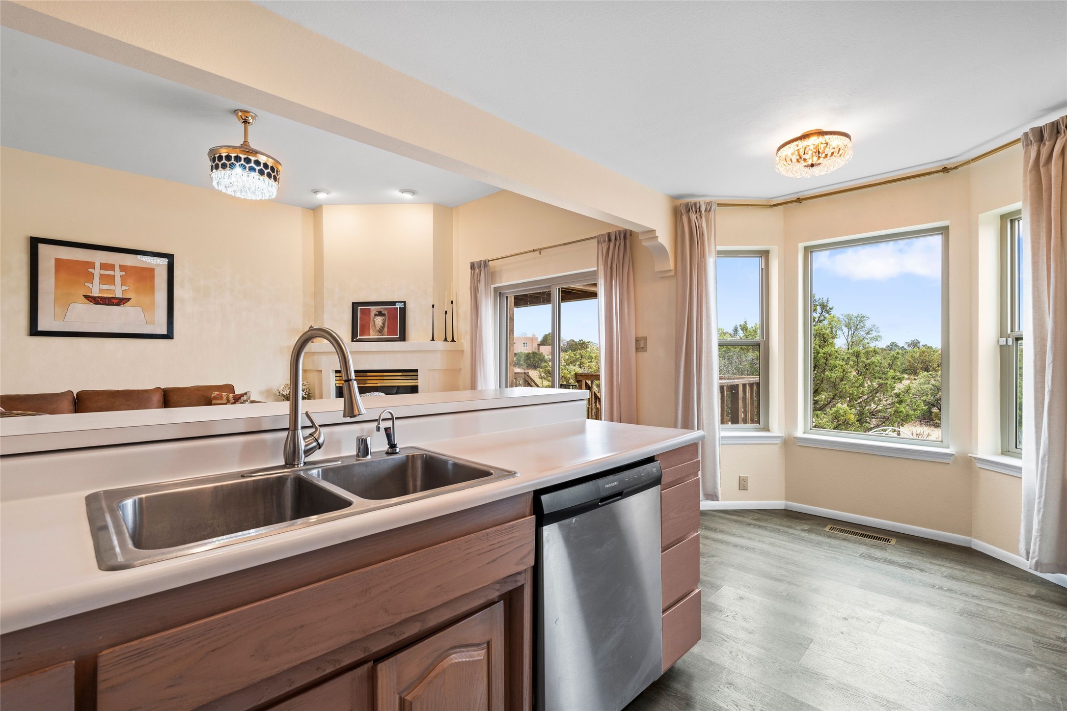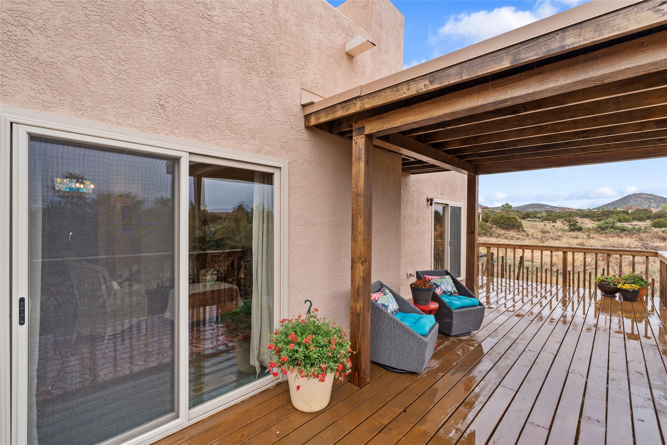 Here's a little pearl on a pretty lot with lovely views of the Sandia/Ortiz and Jemez mountains and the Sangre foothills. Updated by the current owners, this sweet home is filled with natural light, and move-in ready. Features include a six-year-old membrane roof, well-maintained stucco, new windows in 2024, new central air conditioning, new appliances, and a big finished garage with workshop area. Great location on all paved roads in the front of Eldorado, near the Agora and La Tienda shopping malls, and 15 minutes to the Plaza. Una Casa Mueca!