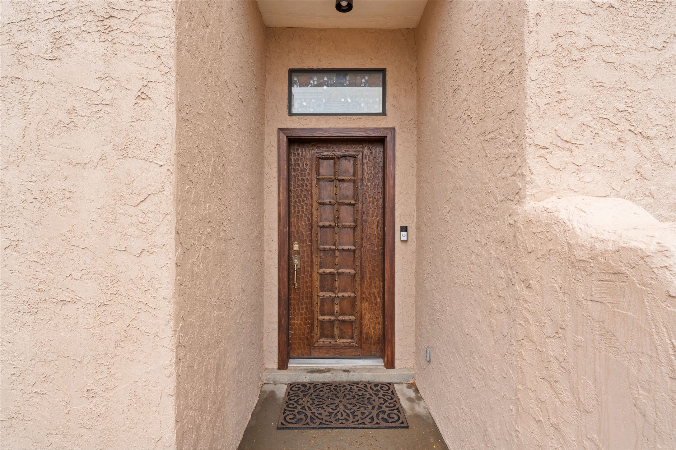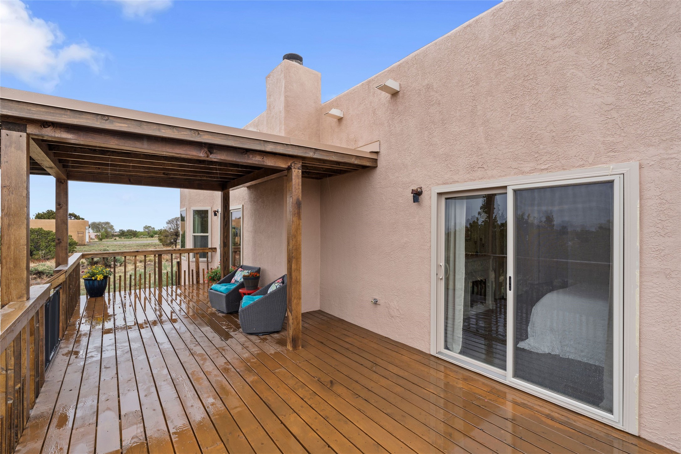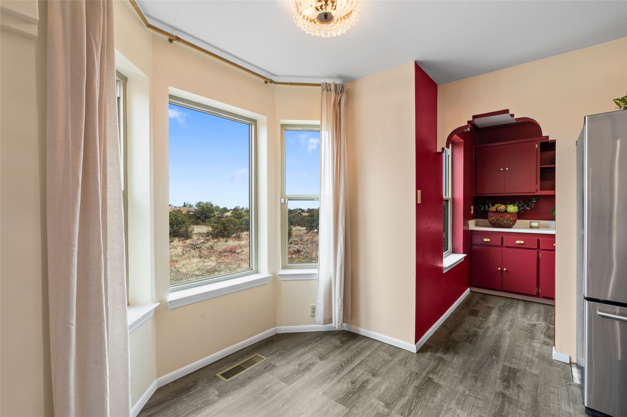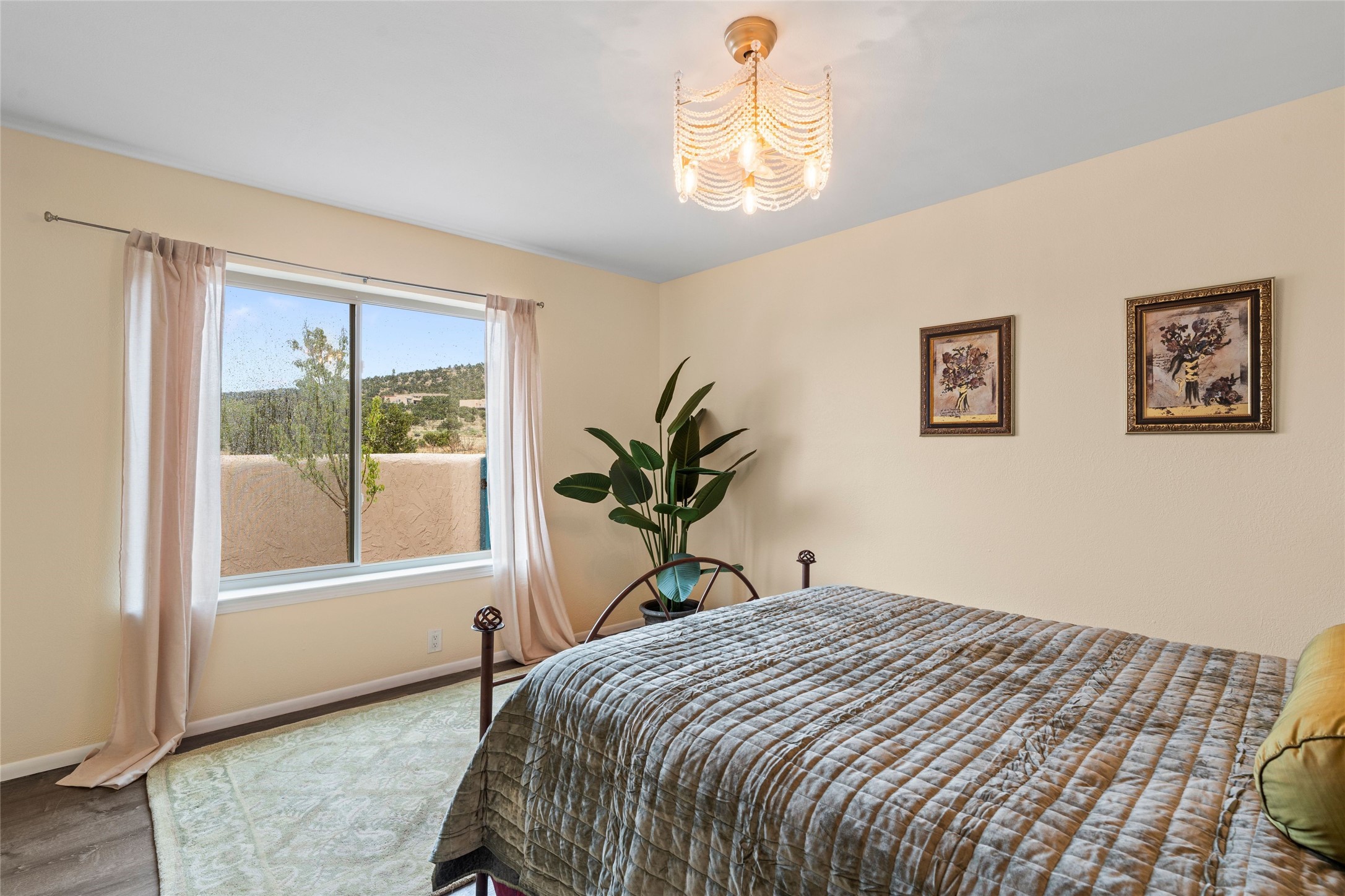 Here's a little pearl on a pretty lot with lovely views of the Sandia/Ortiz and Jemez mountains and the Sangre foothills. Updated by the current owners, this sweet home is filled with natural light, and move-in ready. Features include a six-year-old membrane roof, well-maintained stucco, new windows in 2024, new central air conditioning, new appliances, and a big finished garage with workshop area. Great location on all paved roads in the front of Eldorado, near the Agora and La Tienda shopping malls, and 15 minutes to the Plaza. Una Casa Mueca!