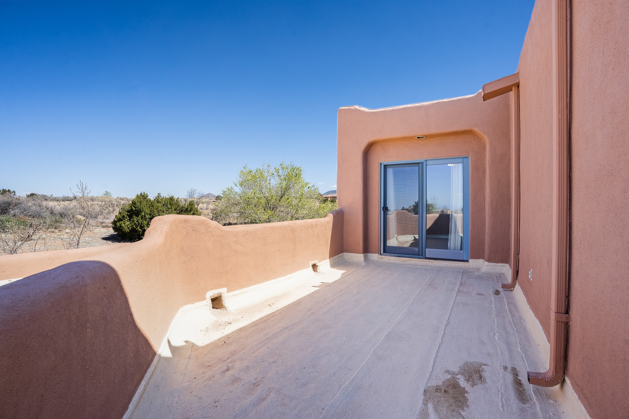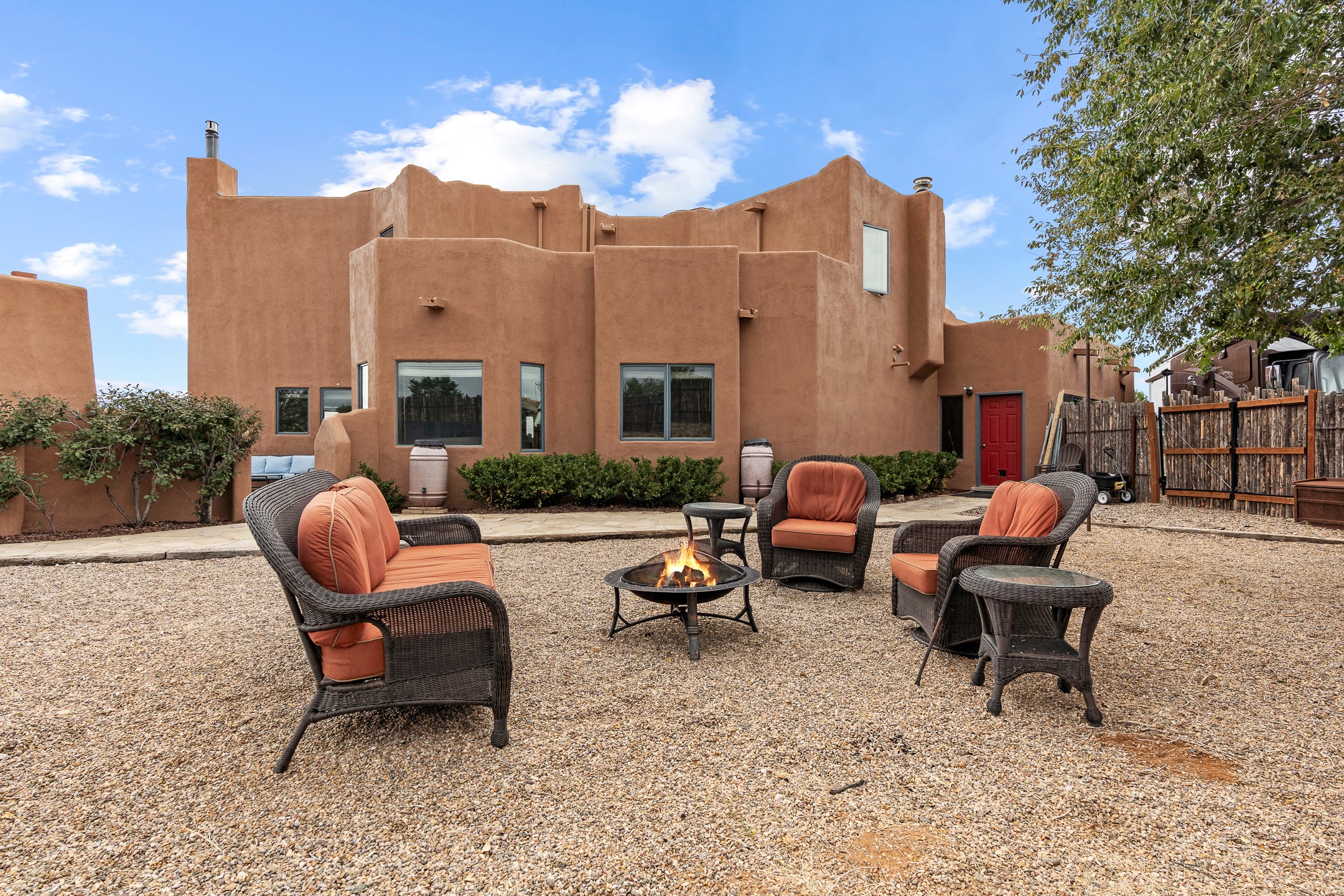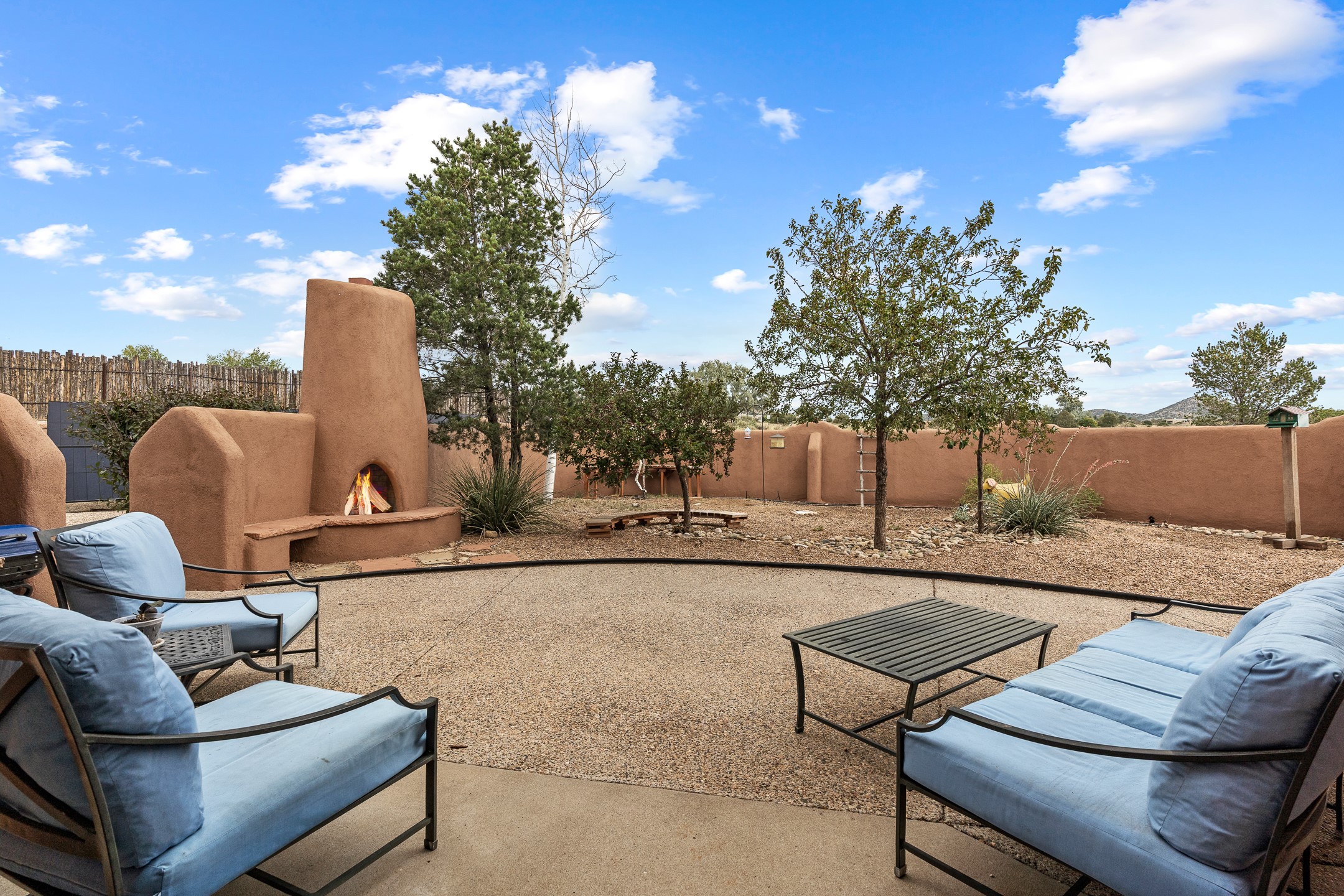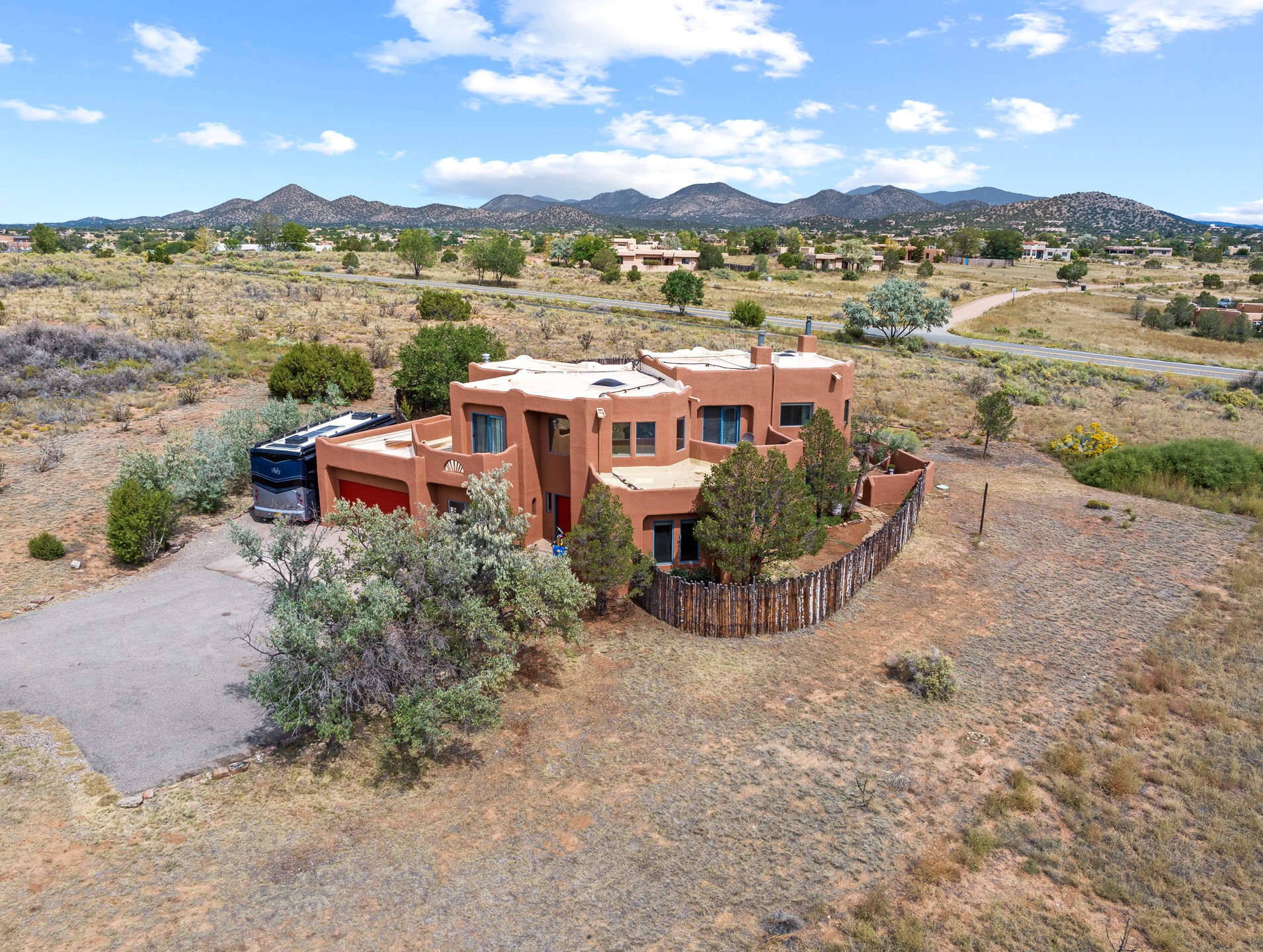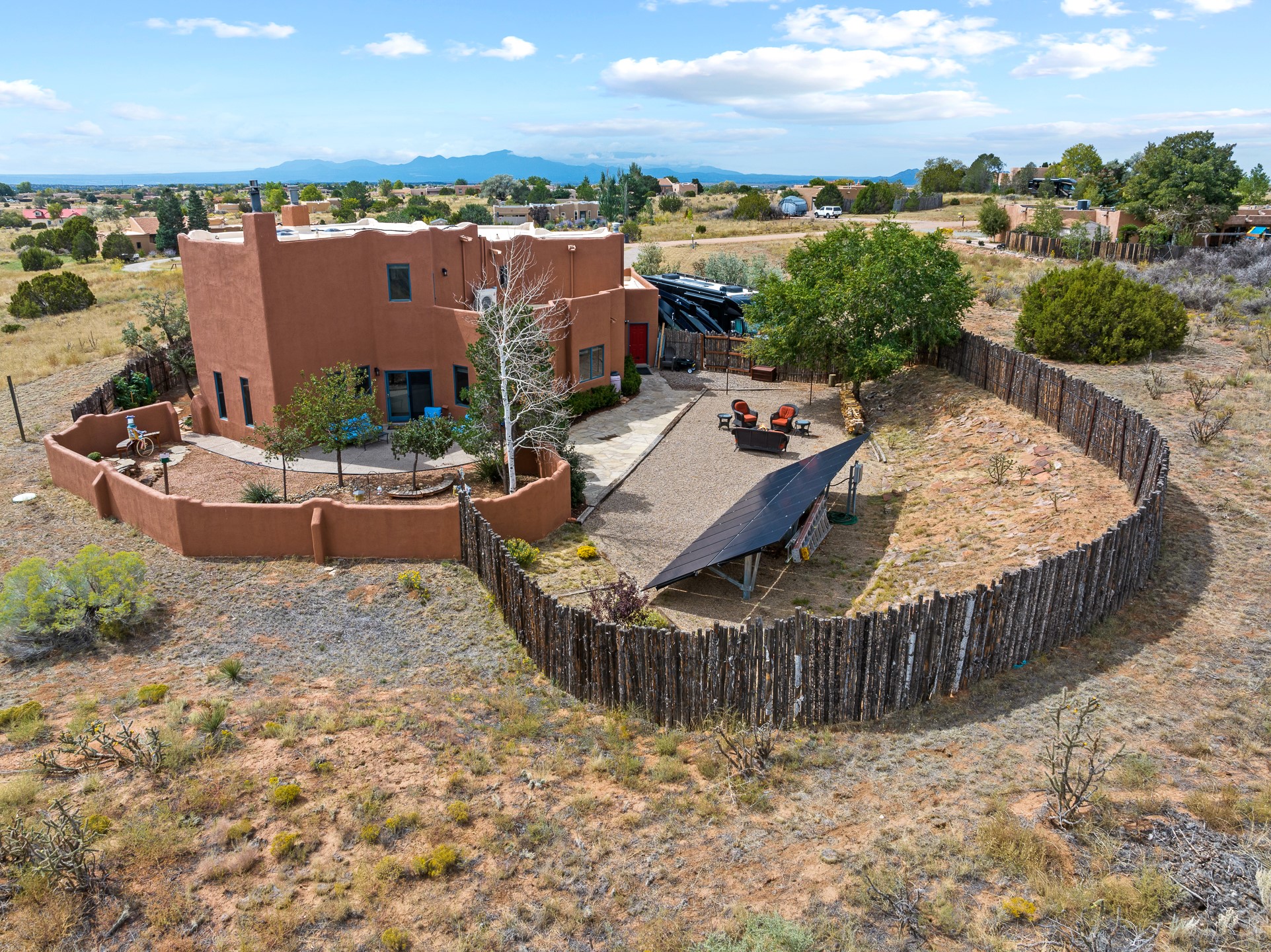 Located at the end of a quiet cul-de-sac in Eldorado, just a short walk from Eldorado Elementary and minutes from The Agora shopping center, this wonderful 4-bedroom, 3-bath home offers 3,294 square feet of comfortable living space on 2.3 acres. Nestled alongside a greenbelt, the property offers both privacy and versatility. The main level features two distinct living areas--one open to the newly renovated kitchen--along with a formal dining space and a guest bedroom currently serving as an office. The kitchen is a standout, showcasing concrete countertops with bar seating, custom tin-inlaid cabinetry, etched glass and tin lighting fixtures, and stainless steel appliances. From here, step outside to a fully fenced backyard complete with an outdoor kiva fireplace and generous space for entertaining or relaxing under the New Mexico sky.Upstairs, the expansive primary suite offers both East- and West-facing balconies, a cozy double-sided gas fireplace, deep soaking tub, glass-enclosed walk-in shower, and dual walk-in closets. Two additional guest bedrooms--each with their own private balcony--and a full guest bath complete the upper level. Recent upgrades include an 18-panel solar array, a new TPO roof with a transferable warranty, a tankless water heater, and a dedicated 30-amp service for RV power. Seamlessly blending modern updates with Southwestern charm, this home offers spacious, serene living in one of Santa Fe's most desirable communities.