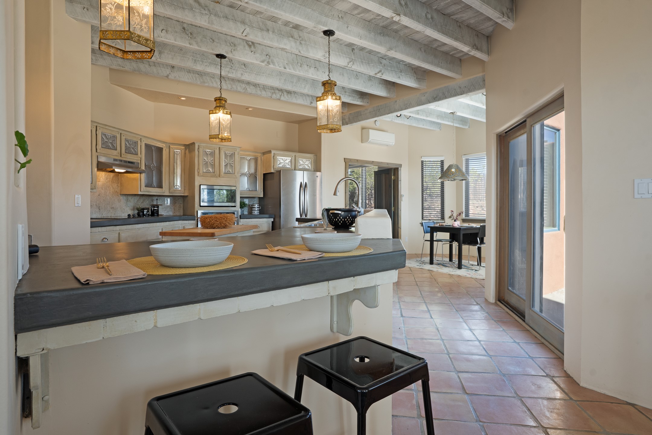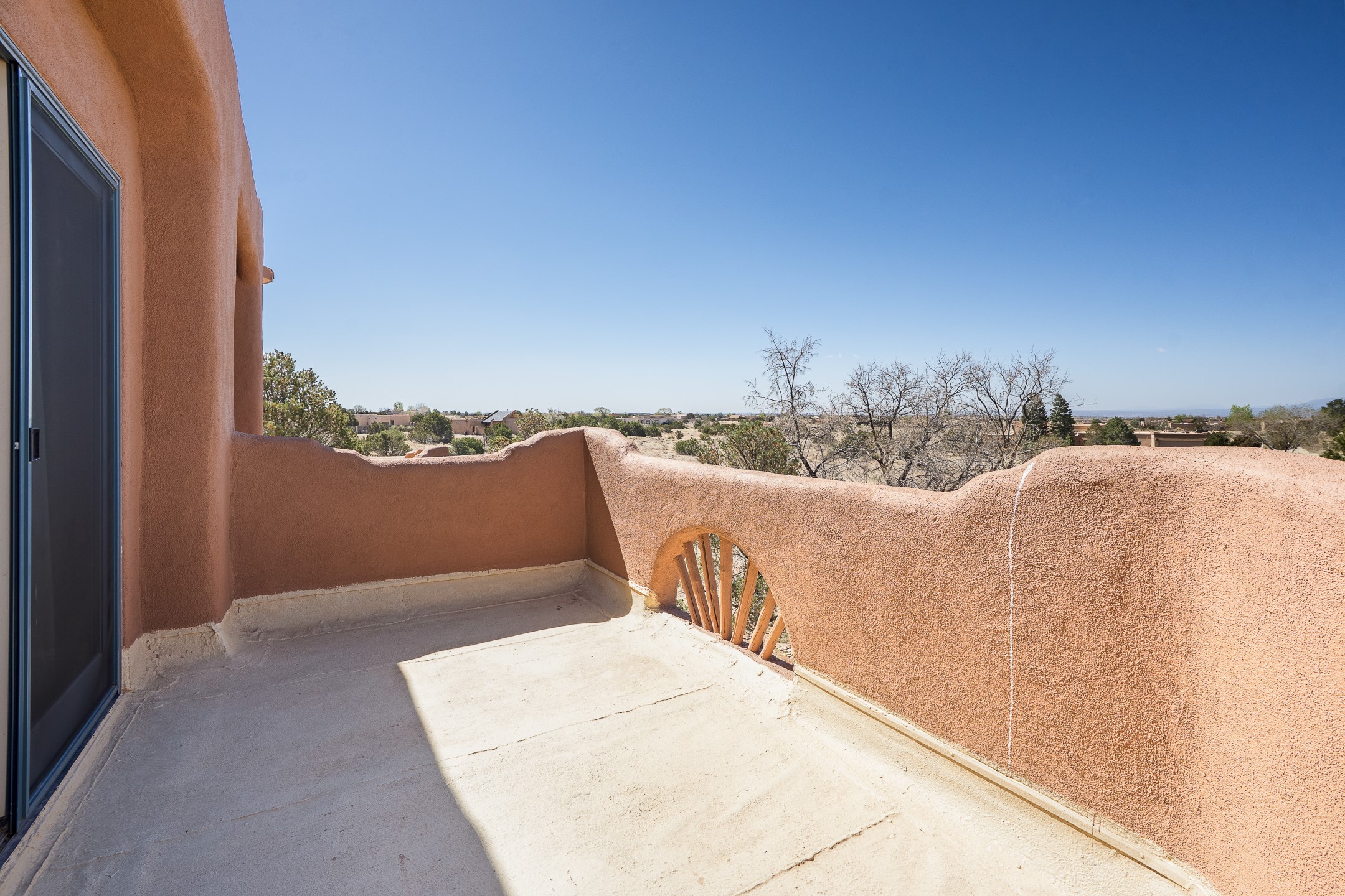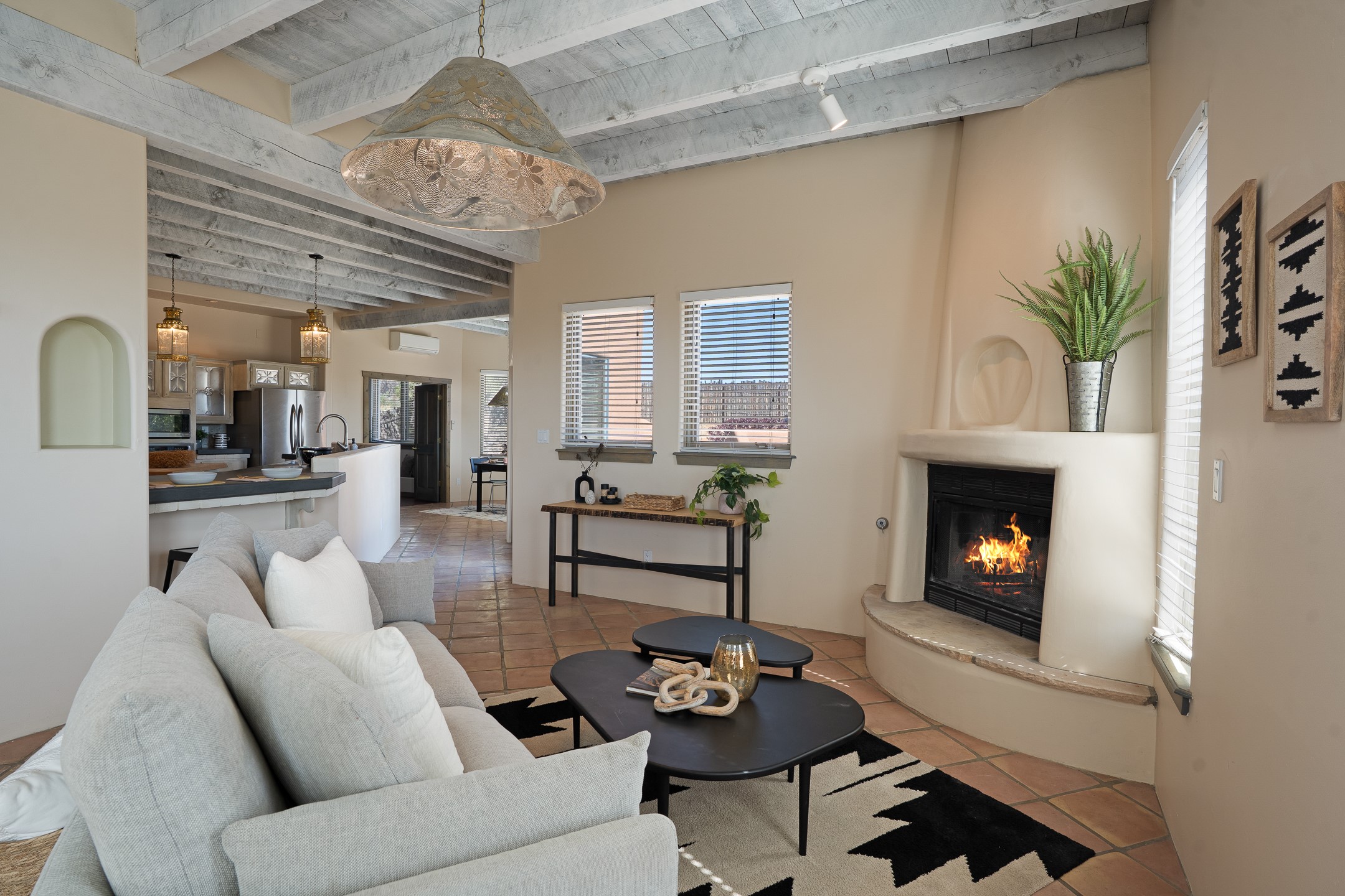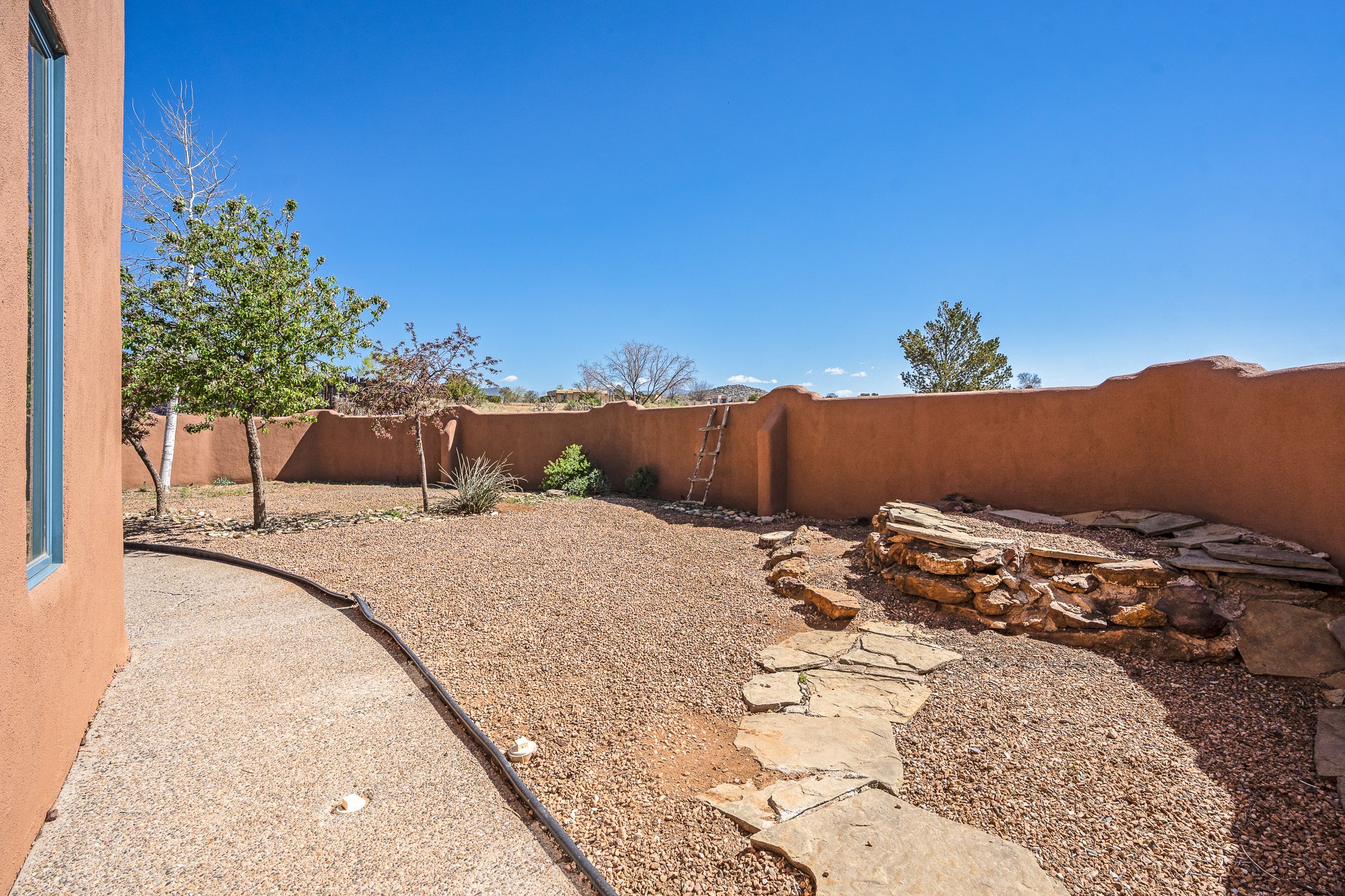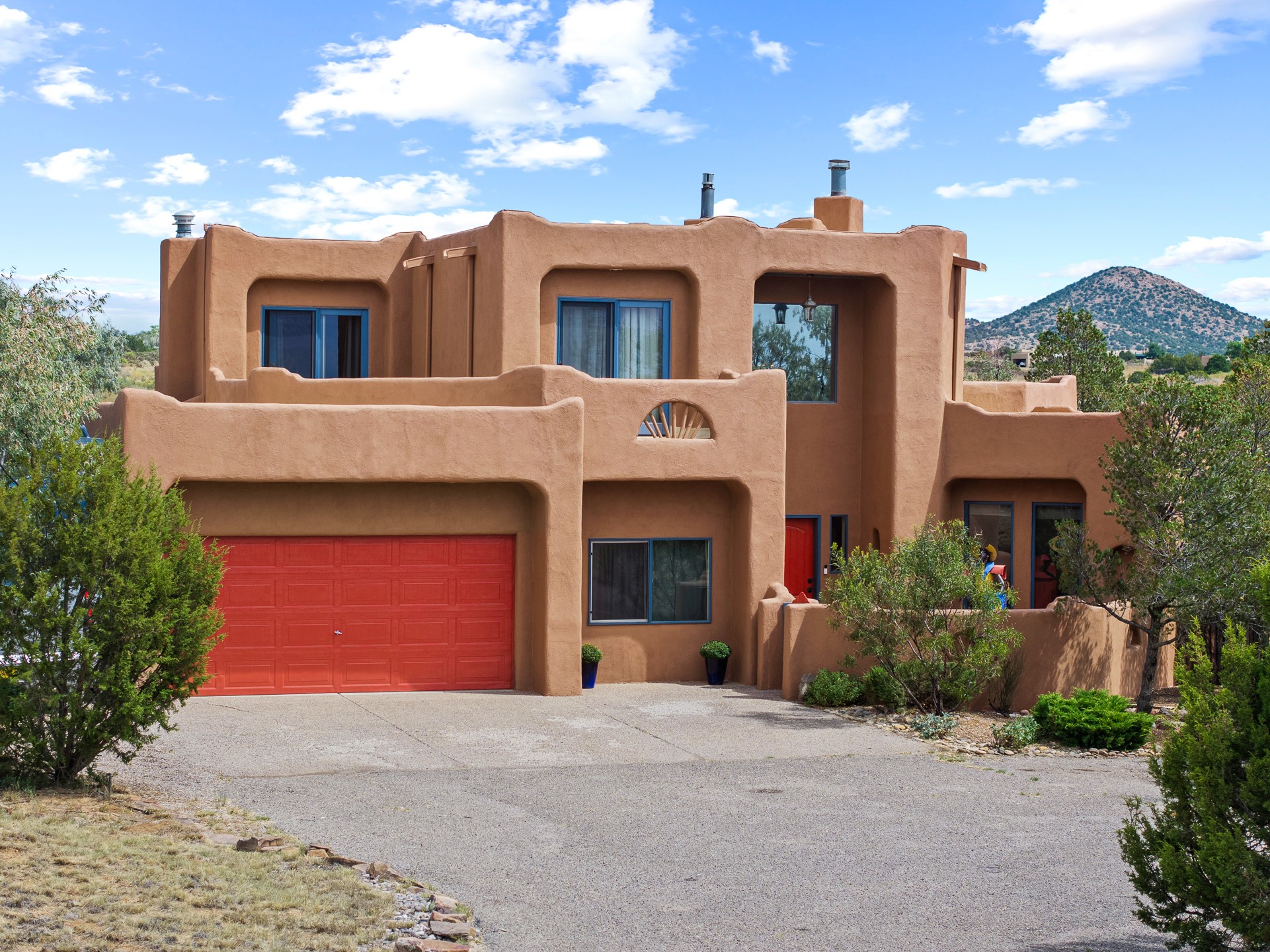 Located at the end of a quiet cul-de-sac in Eldorado, just a short walk from Eldorado Elementary and minutes from The Agora shopping center, this wonderful 4-bedroom, 3-bath home offers 3,294 square feet of comfortable living space on 2.3 acres. Nestled alongside a greenbelt, the property offers both privacy and versatility. The main level features two distinct living areas--one open to the newly renovated kitchen--along with a formal dining space and a guest bedroom currently serving as an office. The kitchen is a standout, showcasing concrete countertops with bar seating, custom tin-inlaid cabinetry, etched glass and tin lighting fixtures, and stainless steel appliances. From here, step outside to a fully fenced backyard complete with an outdoor kiva fireplace and generous space for entertaining or relaxing under the New Mexico sky.Upstairs, the expansive primary suite offers both East- and West-facing balconies, a cozy double-sided gas fireplace, deep soaking tub, glass-enclosed walk-in shower, and dual walk-in closets. Two additional guest bedrooms--each with their own private balcony--and a full guest bath complete the upper level. Recent upgrades include an 18-panel solar array, a new TPO roof with a transferable warranty, a tankless water heater, and a dedicated 30-amp service for RV power. Seamlessly blending modern updates with Southwestern charm, this home offers spacious, serene living in one of Santa Fe's most desirable communities.