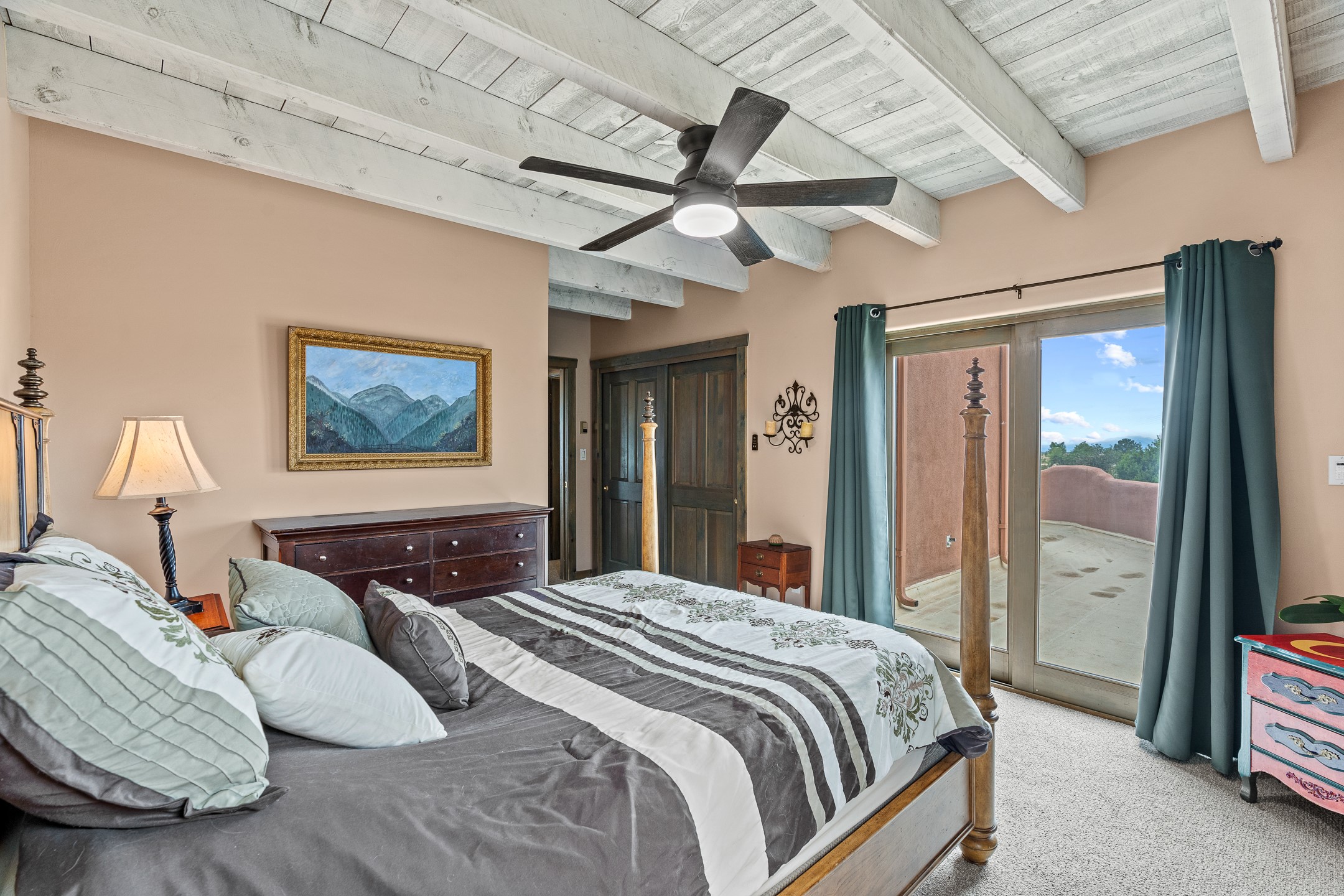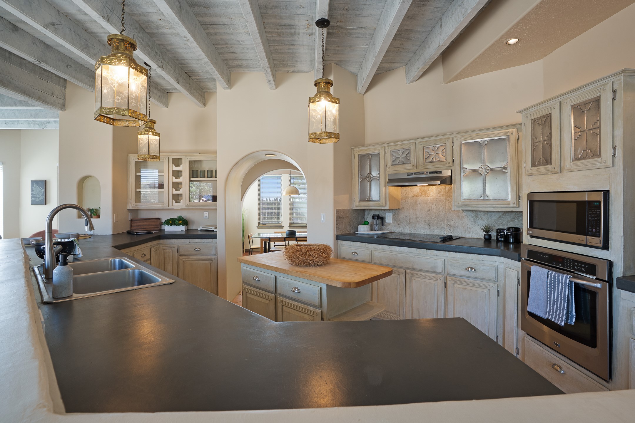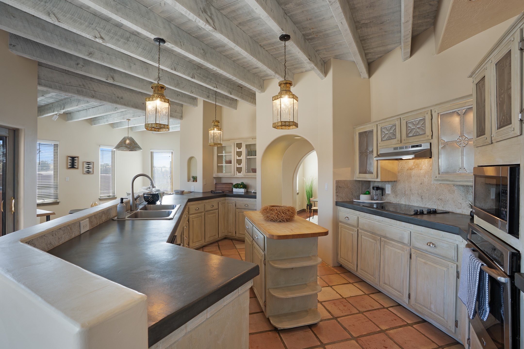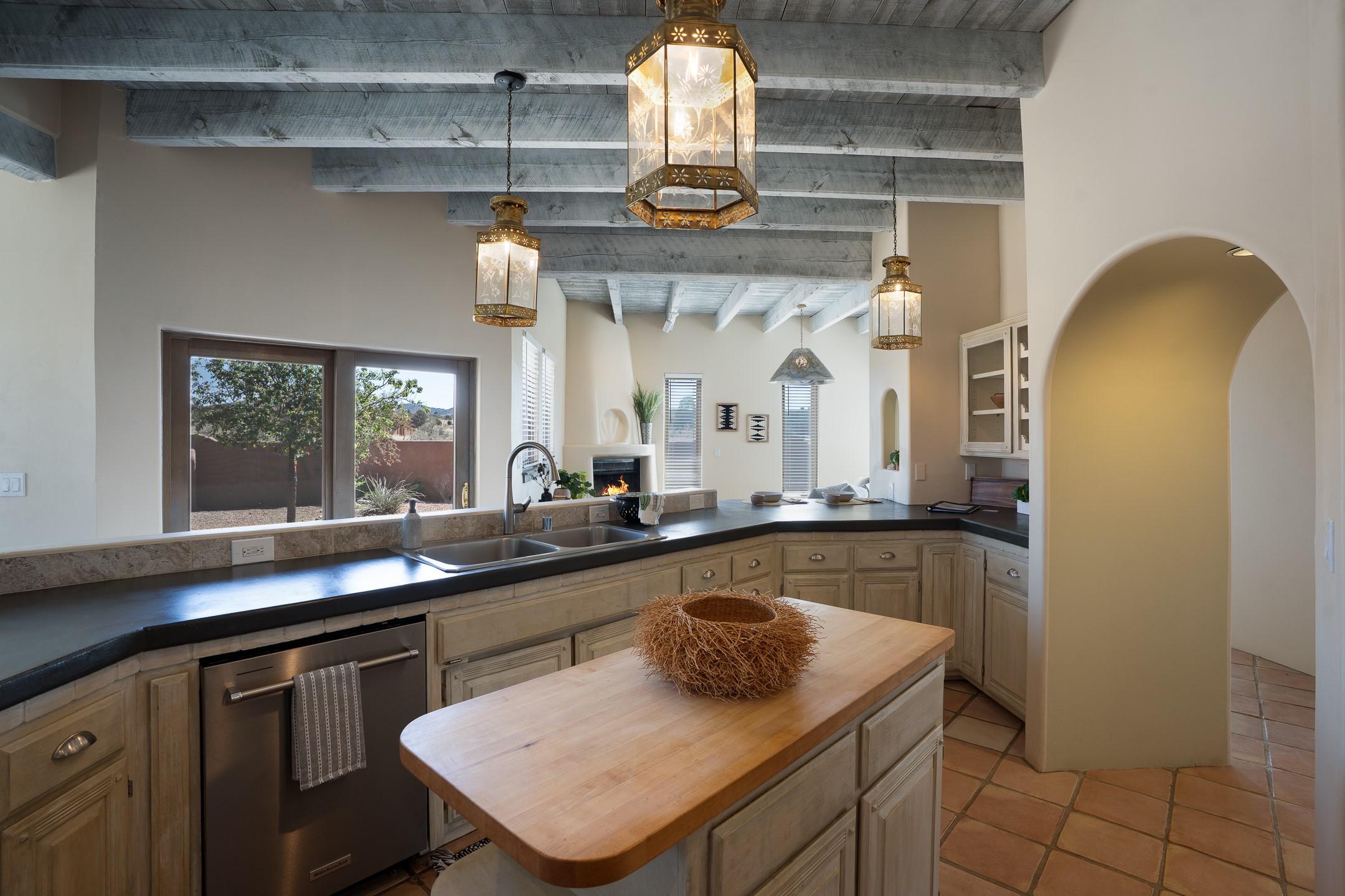 Located at the end of a quiet cul-de-sac in Eldorado, just a short walk from Eldorado Elementary and minutes from The Agora shopping center, this wonderful 4-bedroom, 3-bath home offers 3,294 square feet of comfortable living space on 2.3 acres. Nestled alongside a greenbelt, the property offers both privacy and versatility. The main level features two distinct living areas--one open to the newly renovated kitchen--along with a formal dining space and a guest bedroom currently serving as an office. The kitchen is a standout, showcasing concrete countertops with bar seating, custom tin-inlaid cabinetry, etched glass and tin lighting fixtures, and stainless steel appliances. From here, step outside to a fully fenced backyard complete with an outdoor kiva fireplace and generous space for entertaining or relaxing under the New Mexico sky.Upstairs, the expansive primary suite offers both East- and West-facing balconies, a cozy double-sided gas fireplace, deep soaking tub, glass-enclosed walk-in shower, and dual walk-in closets. Two additional guest bedrooms--each with their own private balcony--and a full guest bath complete the upper level. Recent upgrades include an 18-panel solar array, a new TPO roof with a transferable warranty, a tankless water heater, and a dedicated 30-amp service for RV power. Seamlessly blending modern updates with Southwestern charm, this home offers spacious, serene living in one of Santa Fe's most desirable communities.