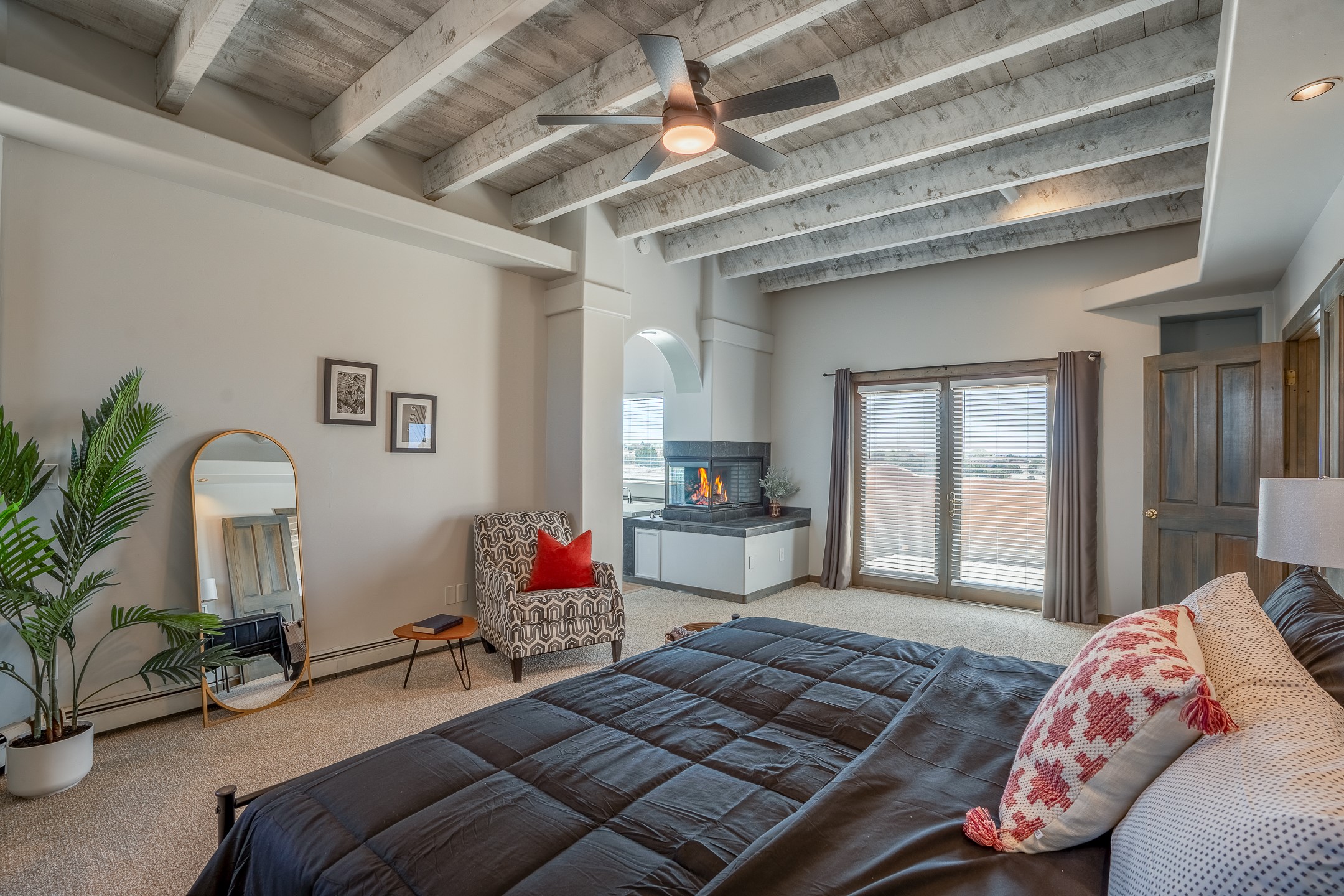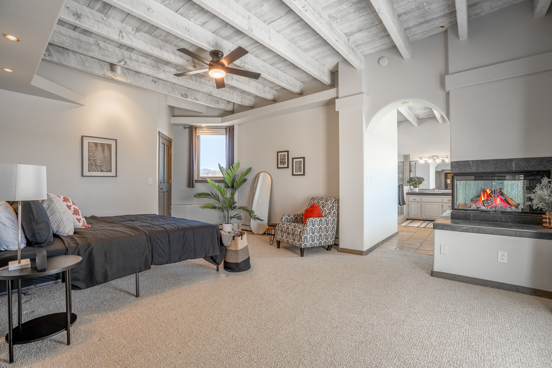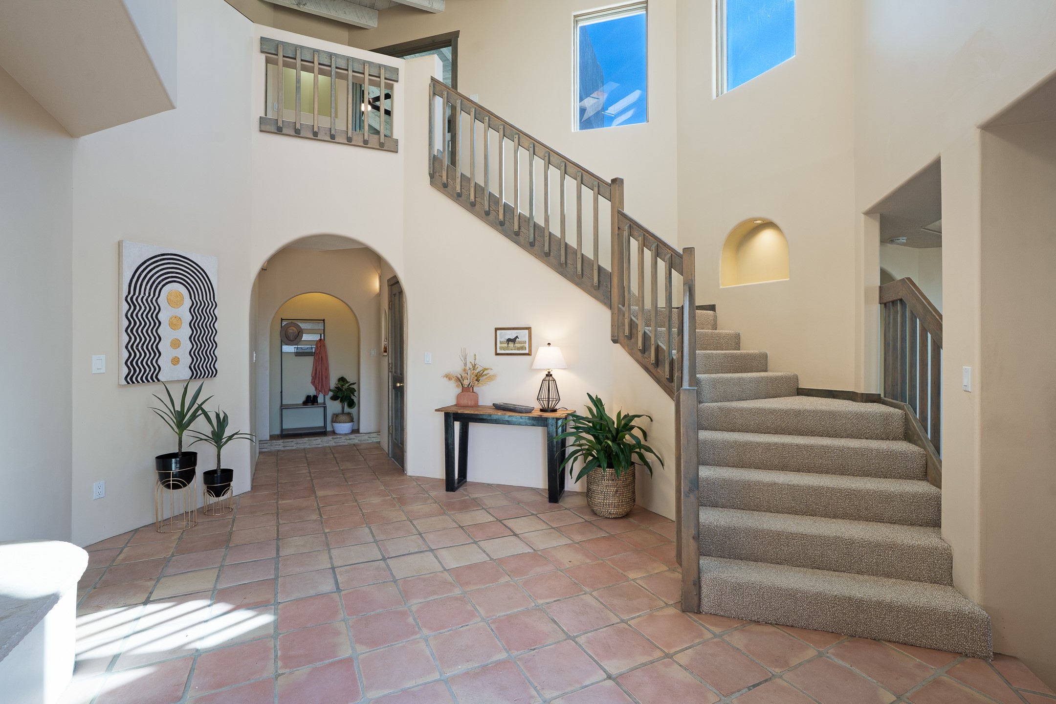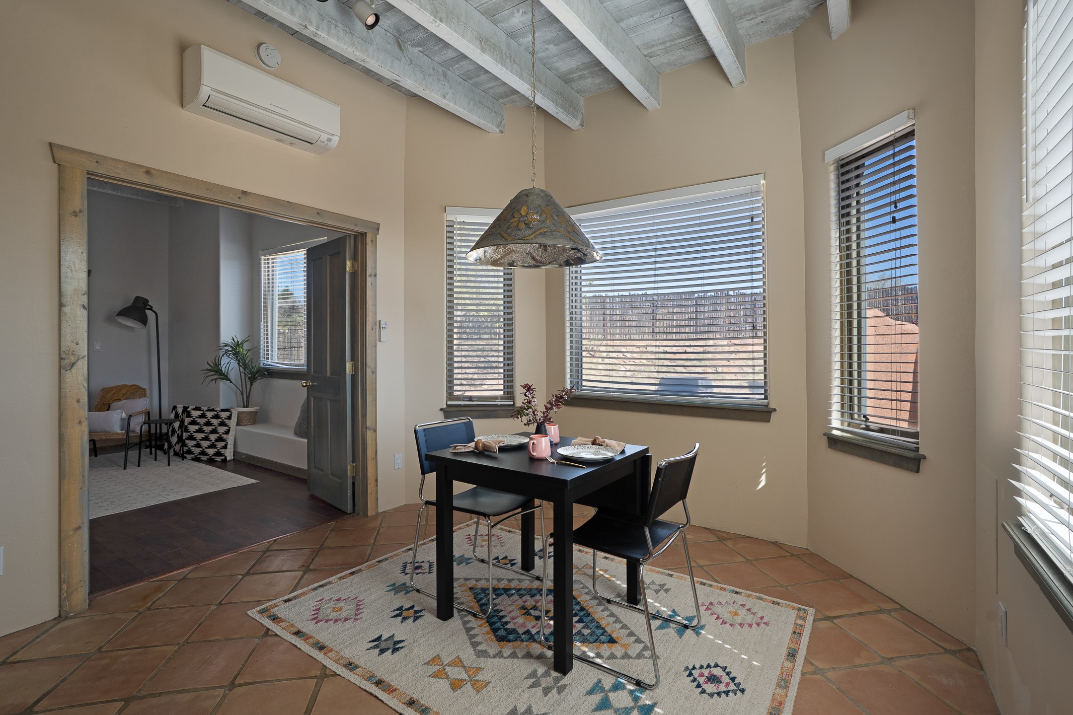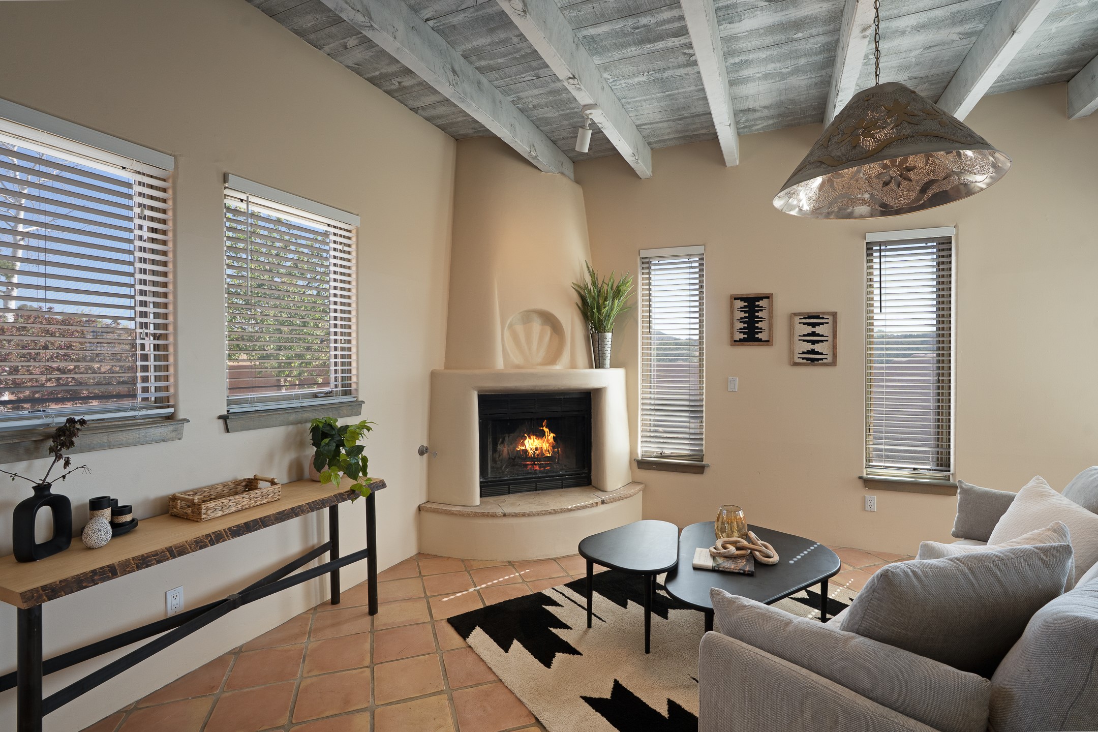 Located at the end of a quiet cul-de-sac in Eldorado, just a short walk from Eldorado Elementary and minutes from The Agora shopping center, this wonderful 4-bedroom, 3-bath home offers 3,294 square feet of comfortable living space on 2.3 acres. Nestled alongside a greenbelt, the property offers both privacy and versatility. The main level features two distinct living areas--one open to the newly renovated kitchen--along with a formal dining space and a guest bedroom currently serving as an office. The kitchen is a standout, showcasing concrete countertops with bar seating, custom tin-inlaid cabinetry, etched glass and tin lighting fixtures, and stainless steel appliances. From here, step outside to a fully fenced backyard complete with an outdoor kiva fireplace and generous space for entertaining or relaxing under the New Mexico sky.Upstairs, the expansive primary suite offers both East- and West-facing balconies, a cozy double-sided gas fireplace, deep soaking tub, glass-enclosed walk-in shower, and dual walk-in closets. Two additional guest bedrooms--each with their own private balcony--and a full guest bath complete the upper level. Recent upgrades include an 18-panel solar array, a new TPO roof with a transferable warranty, a tankless water heater, and a dedicated 30-amp service for RV power. Seamlessly blending modern updates with Southwestern charm, this home offers spacious, serene living in one of Santa Fe's most desirable communities.