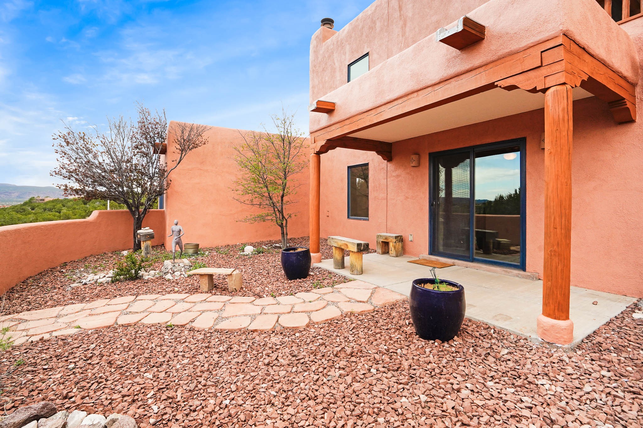 Perched near the top of Cochiti Lake, against the foothills of the Jemez Mountains, this two-story dwelling presents a fresh facade thanks to its recent exterior finish. The primary sleeping quarters reside on the entry level, offering ease of access. Inside, the lower level showcases sleek, modern surfaces underfoot. Gather around the warmth of the traditional hearth in the living space. The culinary area offers rich, cherry cabinetry complemented by gleaming stainless appliances. Experience comfortable warmth with the in-floor radiant heating system. Head upstairs to discover a versatile upper level with wood floors, perfect as a bedroom, creative workspace, or an additional private retreat. Step out onto the sheltered upper deck and be captivated by sweeping vistas encompassing the majestic Jemez range, the ancient landscape of Bandelier, and the iconic silhouette of St. Peter's Dome. A single-car garage provides sheltered parking. Enjoy the proximity to the recreational waters of Cochiti Lake, nearby links for the golf enthusiast, and trails system right out the front door. Call for your showing today!
