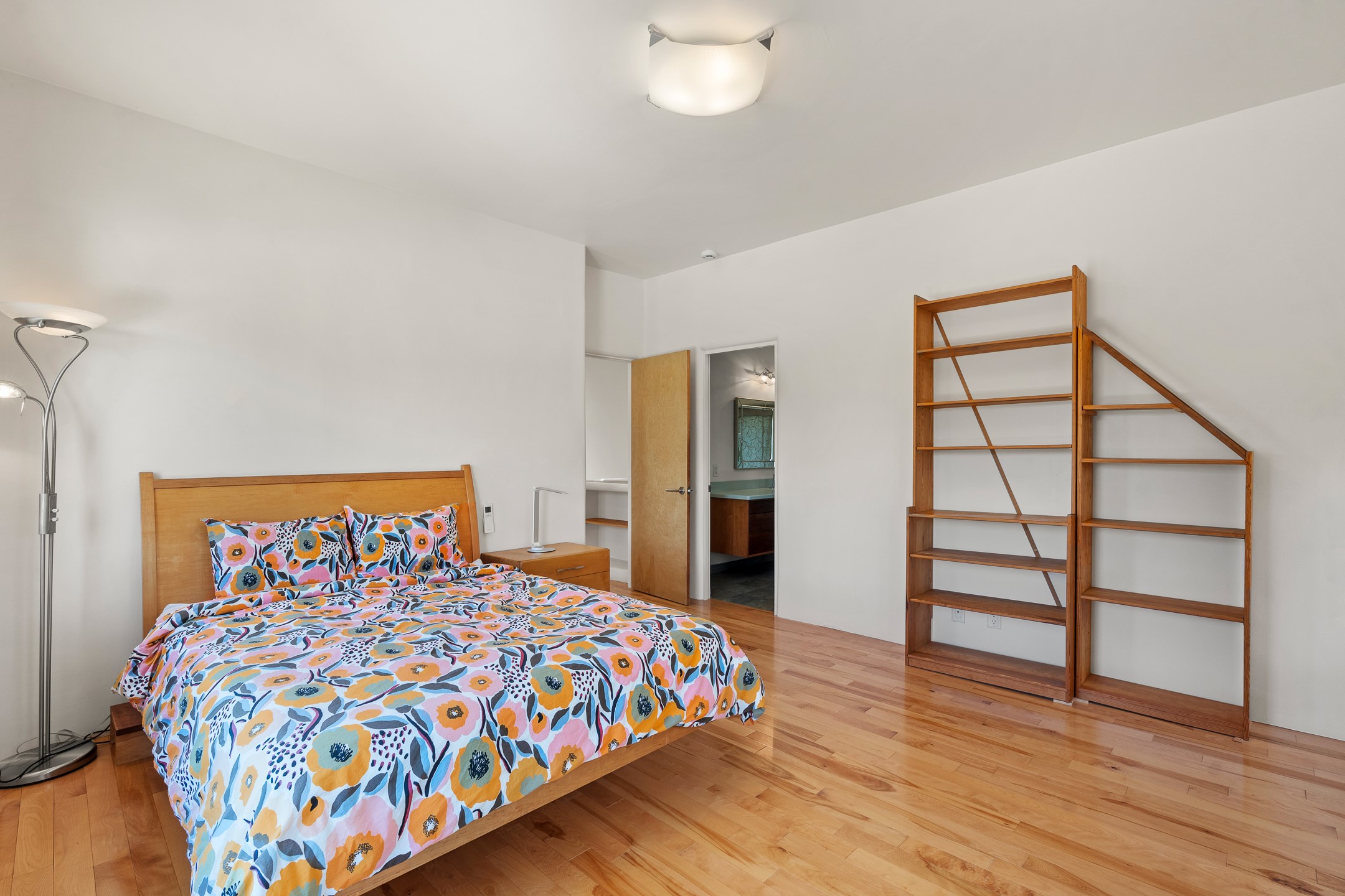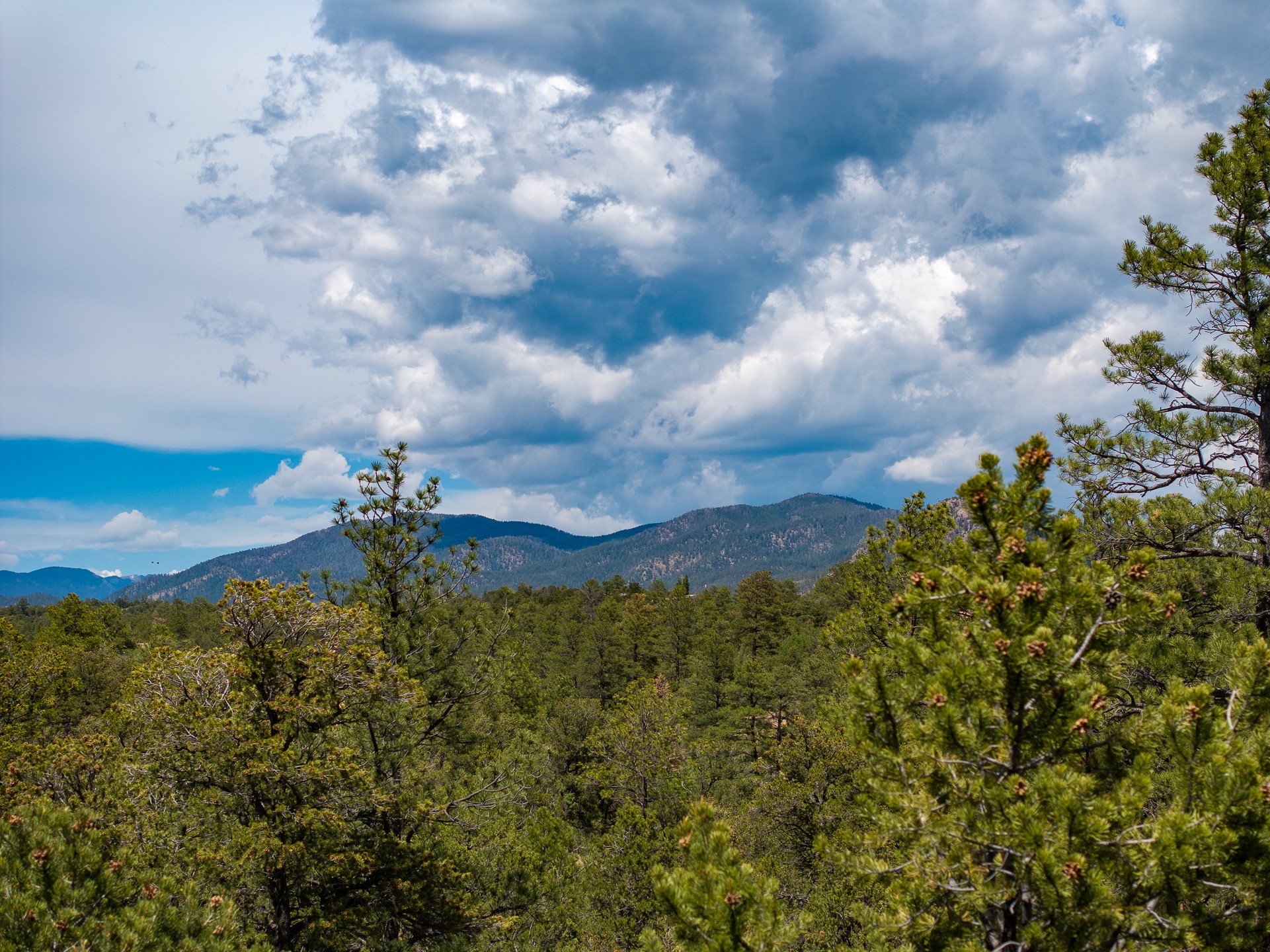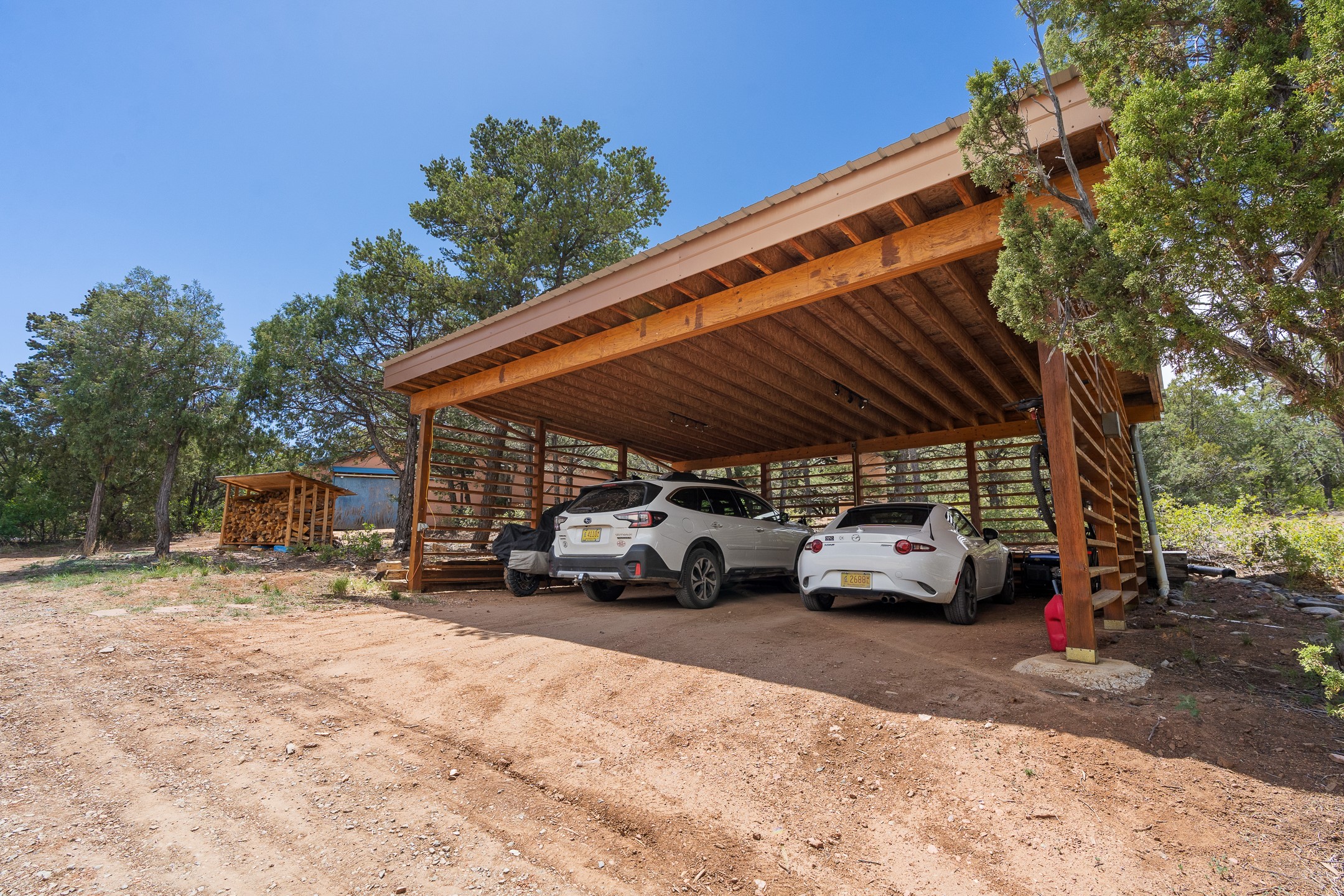 Located just over 20 minutes from downtown Santa Fe, this privately situated, passive solar contemporary home sits on 10.25 wooded acres, surrounded by mature Ponderosa and Pion pines. Designed for energy efficiency, this two-story residence offers both privacy and natural beauty, and regular sightings of native wildlife including birds, bobcats, and gray foxes. Originally built in 1998 and thoughtfully renovated and expanded in 2009, the main house features high-performance Designer Series Pella windows with triple pane, low-E glass and integrated blinds, along with durable hardwood and ceramic tile flooring. The open living and dining area is accented by viga ceilings and a Danish soapstone woodstove, which stores and radiates heat for efficient warmth. A custom-built media cabinet and wood storage add functional elegance. The modern kitchen is a chef's dream, outfitted with custom maple cabinetry, hickory and granite countertops, and premium appliances including a Wolf induction cooktop, Miele wall oven and dishwasher, and Fisher & Paykel refrigerator. A stylish powder room with custom cabinetry and an ensuite guest bedroom with sunroom complete the first floor. Upstairs, you'll find a versatile home office or media area between two spacious bedrooms, each with walk-in closets and private bathrooms featuring custom finishes. An upstairs laundry room with sink is conveniently located near the bedrooms. For added comfort, three Daikin mini-split systems provide efficient cooling in summer and supplemental heating in winter. Velux Integra roof windows, equipped with remote-controlled blinds and rain-sensor auto-close functionality, enhance ventilation and natural light. A secure Catio on the balcony provides a safe outdoor space for feline companions. Also included is a detached one bedroom and 3/4 bathroom, 900 sq ft guesthouse, ideal for guests or as a rental. This private unit offers full functionality while maintaining separation from the main home. Enjoy outdoor living on thoughtful patio spaces with sun sails and a fenced vegetable garden with raised boxes. Snow barriers, heavy-duty galvanized gutters and downspouts, and a two-car carport ensure protection from the elements year-round. The 1200 sf heated workshop on the property offers abundant space for your creative projects. Whether you're seeking a sustainable lifestyle, a quiet creative refuge, or a home with income potential, this unique Santa Fe property offers all that and more.