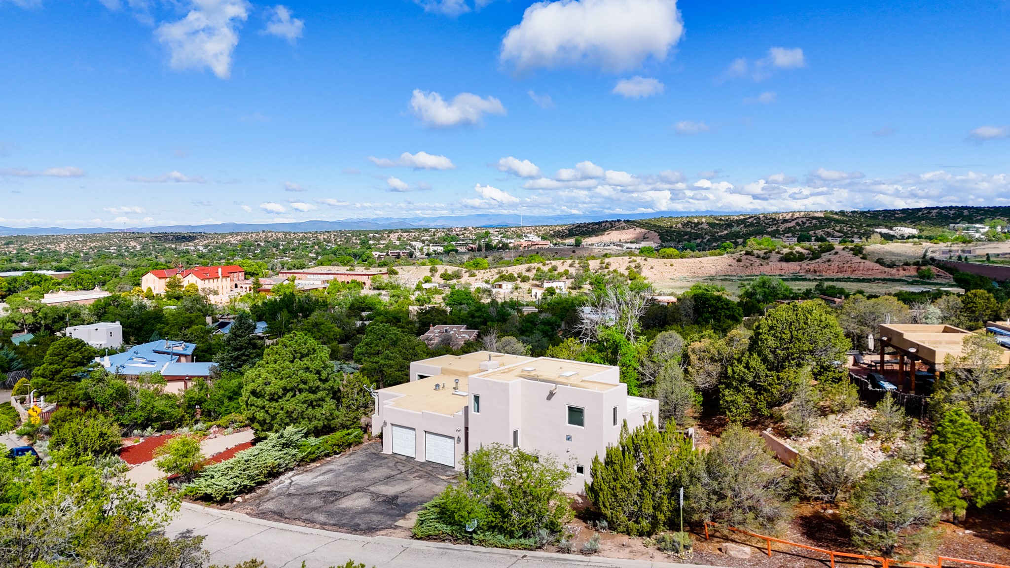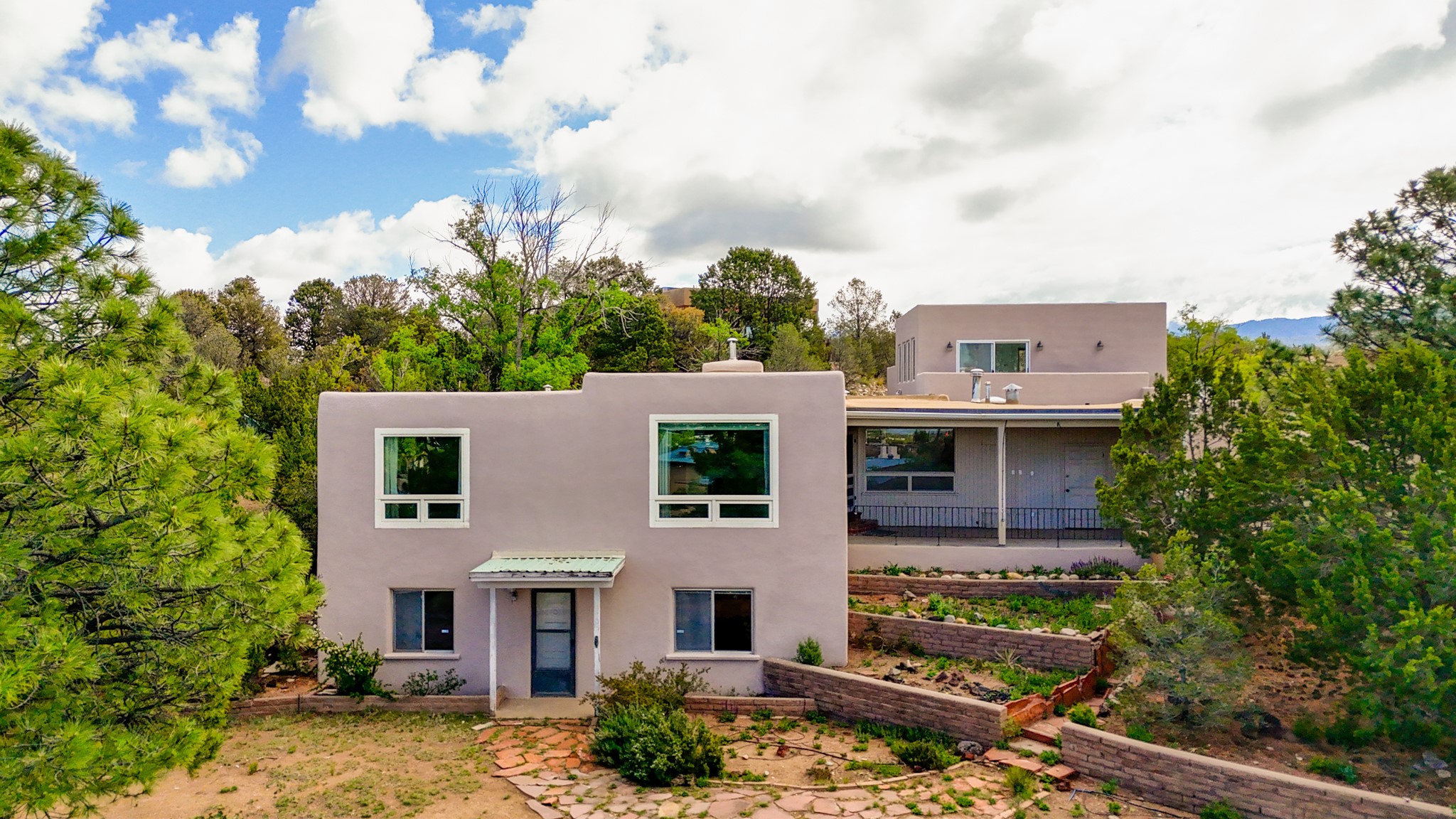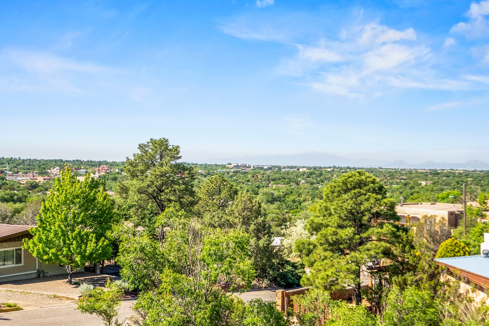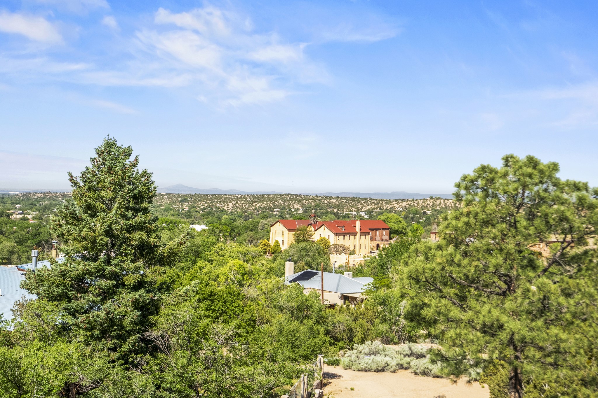 Discover the potential of this mid-century home paired with a contemporary studio, perched at the peak of the desirable Rosario Hill neighborhood and offering sweeping western views. The main house features potential mid-century charm, ready for a visionary owner to restore and personalize. The upper level includes a spacious living room with a cozy fireplace and expansive views, a formal dining area, a functional kitchen, two bedrooms, and a full bath. The lower level offers incredible versatility with two additional bedrooms, a full bath, a large family/living area with a fireplace, a private entrance, and dedicated parking--ideal for use as a rental unit or guest suite. Adding even more value is a separate studio building, offering two distinct studio spaces (approximately 600 sq. ft. each). The upper studio is bright and airy, with lovely views, while the lower studio includes a bath--perfect as an artist's retreat or as rental income from creative tenants.This unique property offers multiple income streams, artistic flexibility, and the opportunity to craft a dream home in one of the area's scenic neighborhoods 5 minutes from the Santa Fe Plaza.